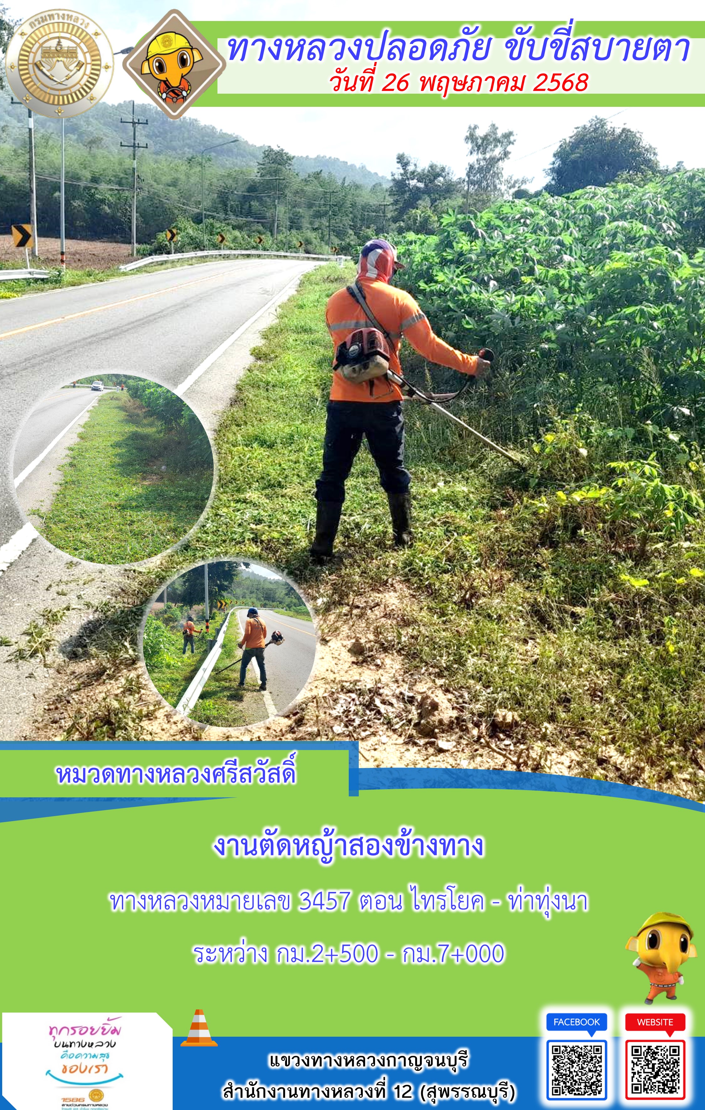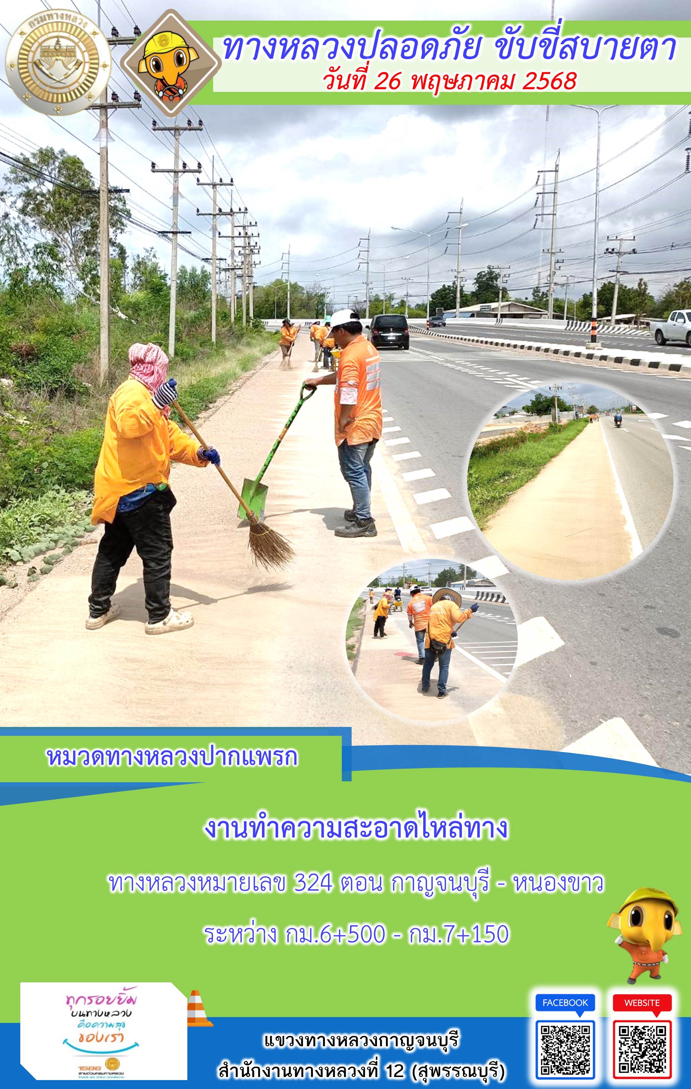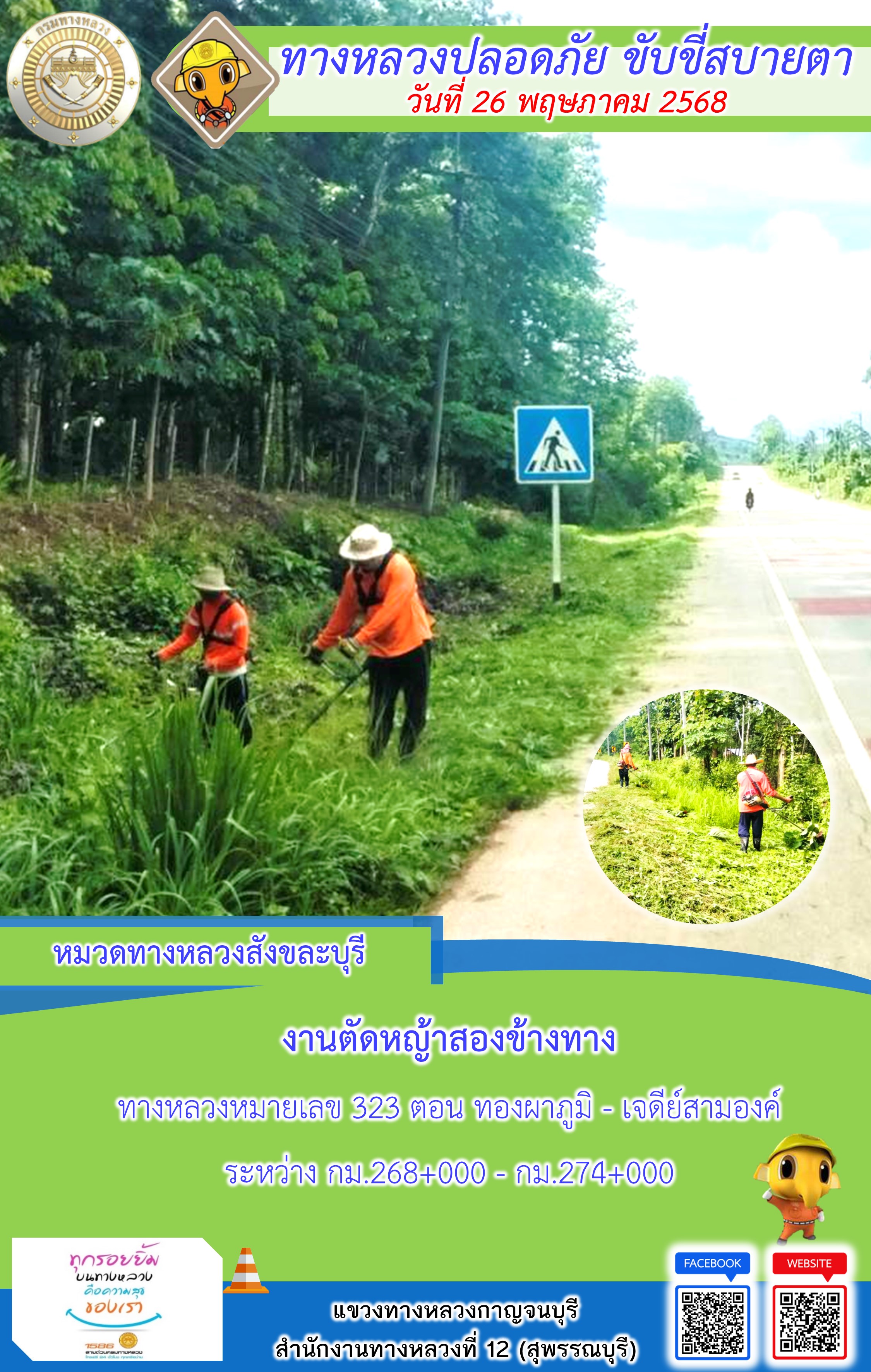 แขวงทางหลวงกาญจนบุรี โดยหมวดทางหลวงในสังกัด และงานอำนวยความปลอดภัยปฏิบัติงาน ประจำวันที่ 26 พ.ค. 68