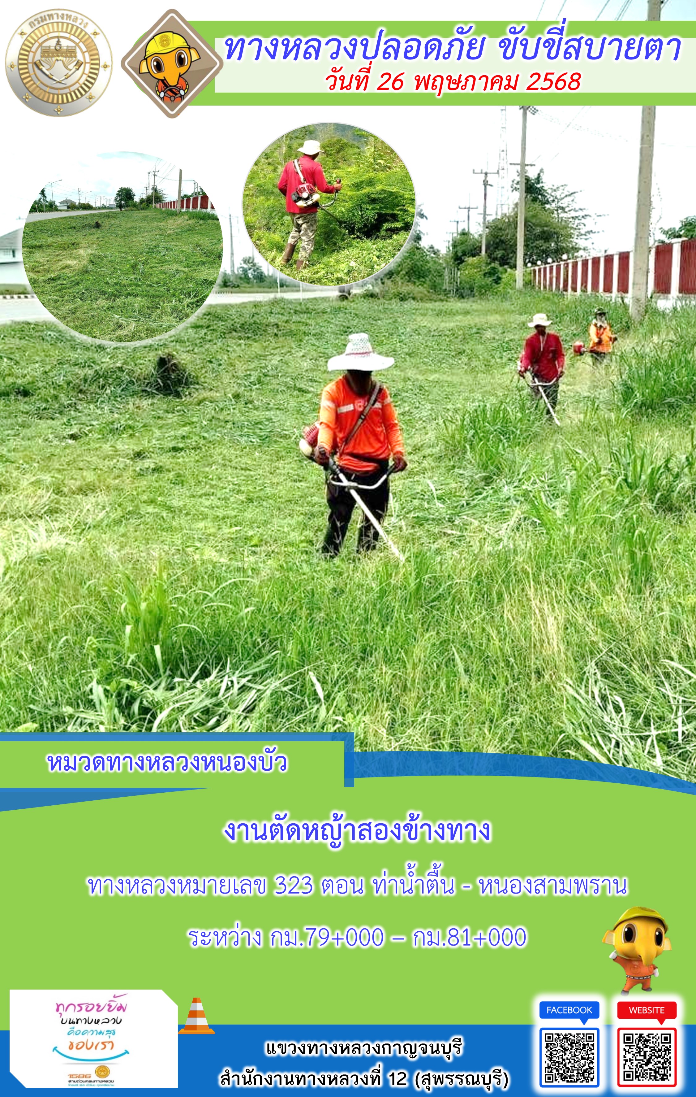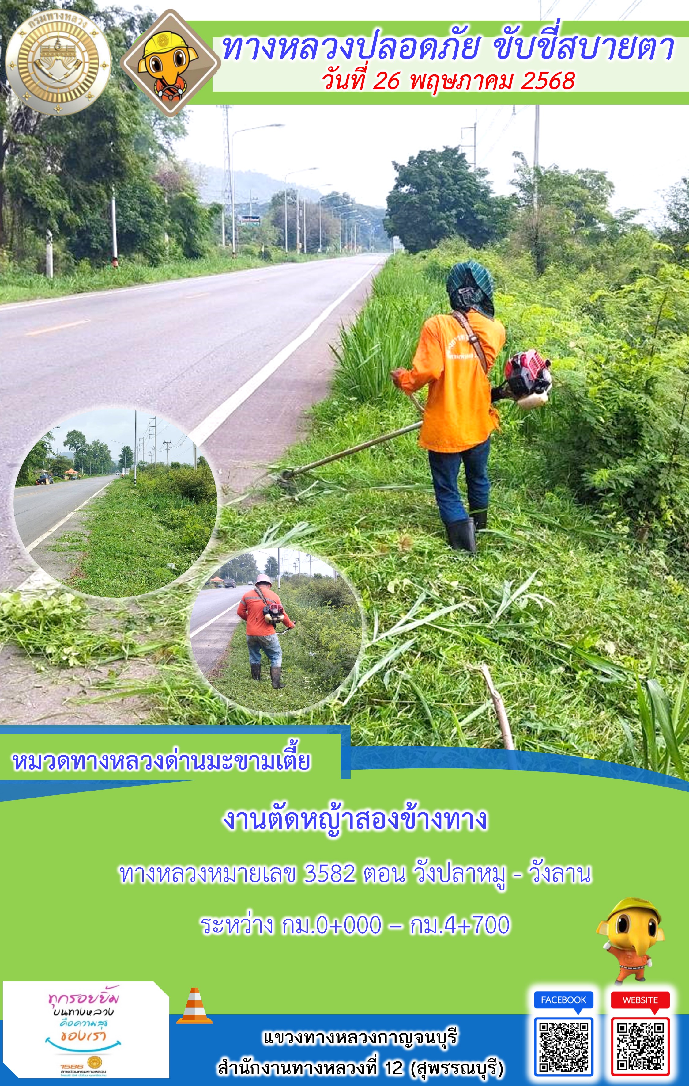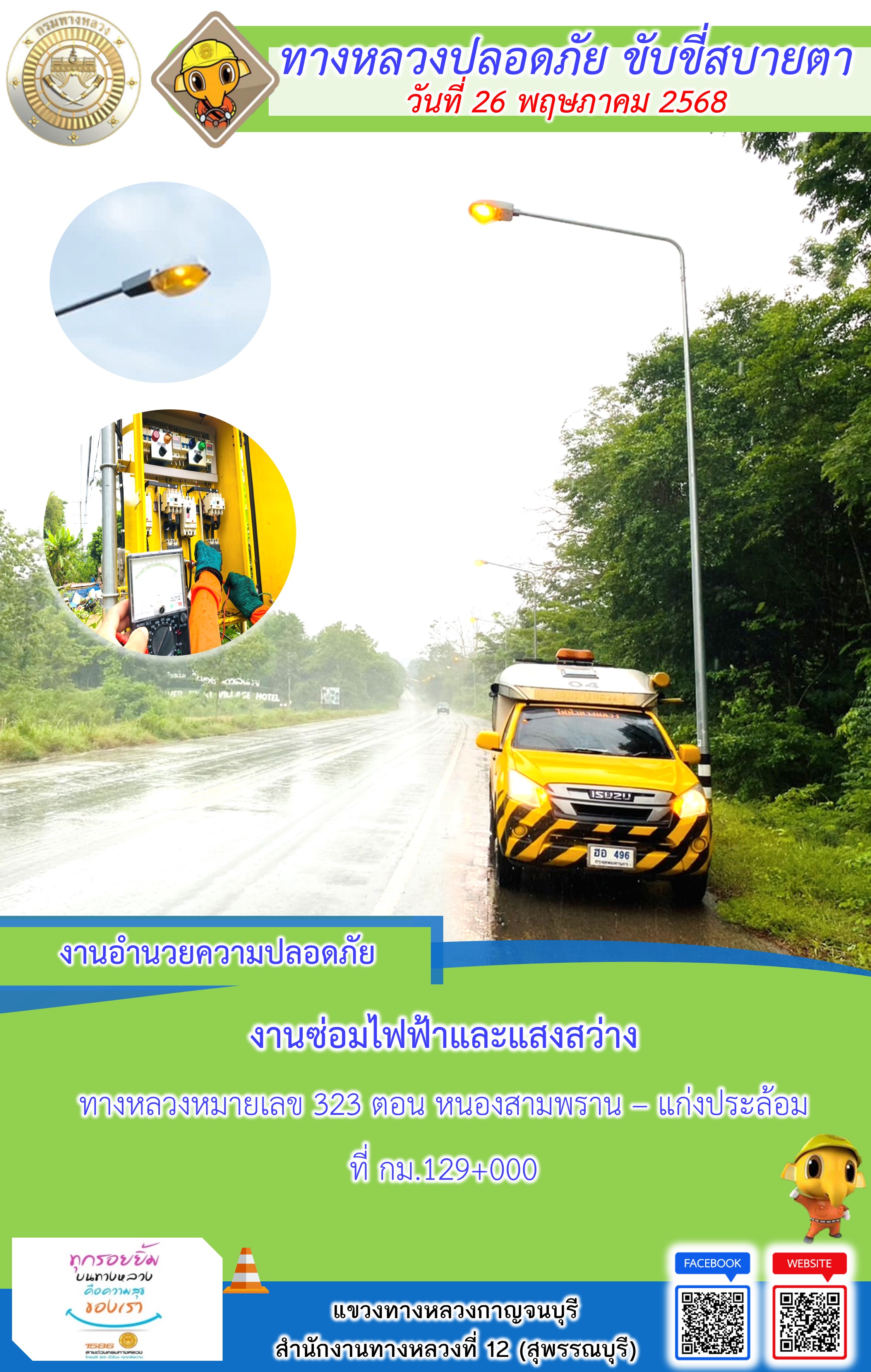 แขวงทางหลวงกาญจนบุรี โดยหมวดทางหลวงในสังกัด และงานอำนวยความปลอดภัยปฏิบัติงาน ประจำวันที่ 26 พ.ค. 68