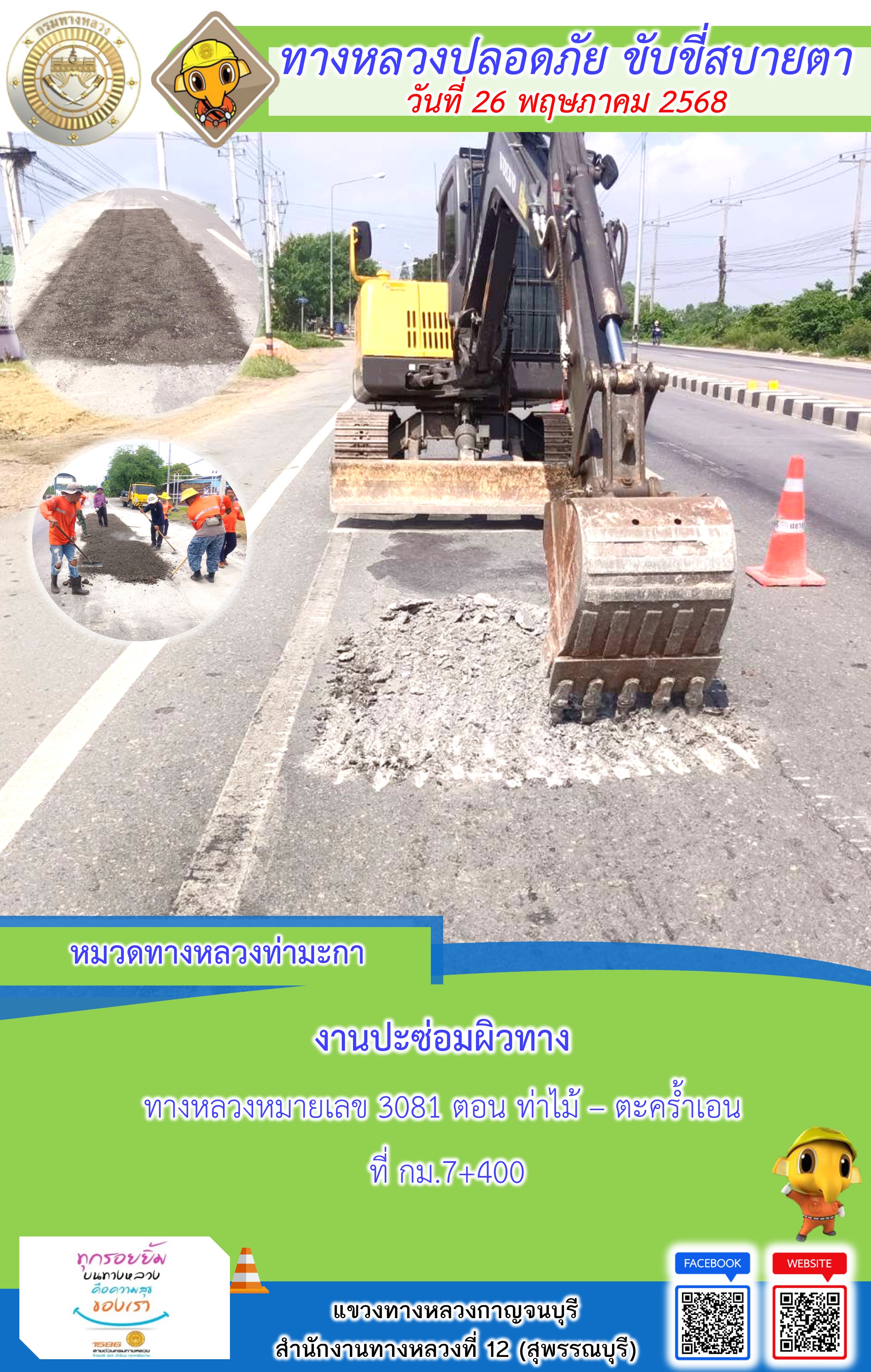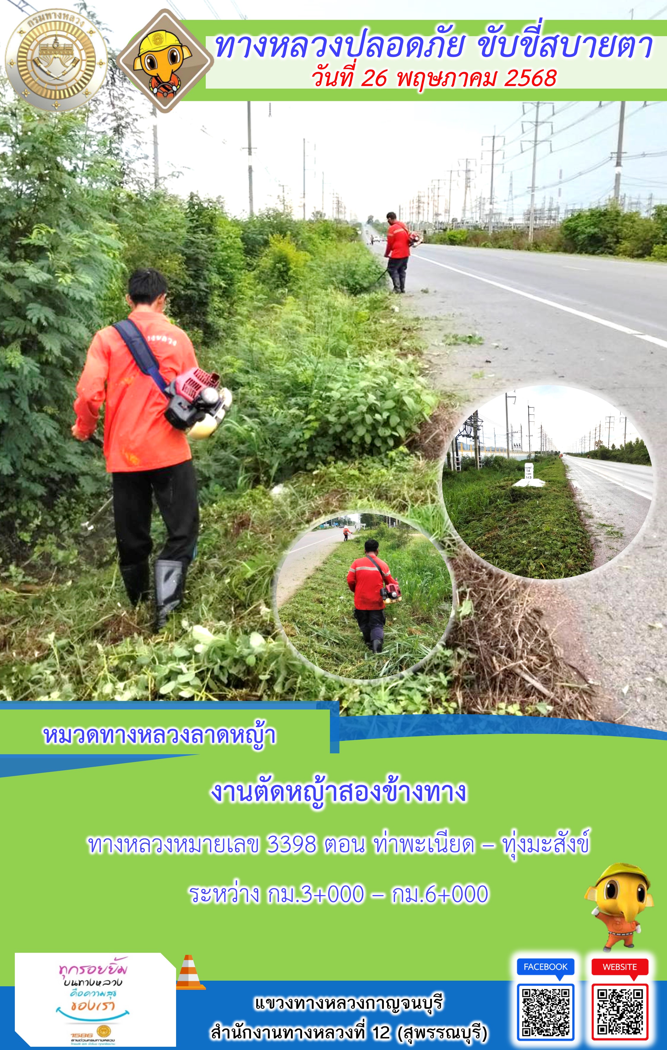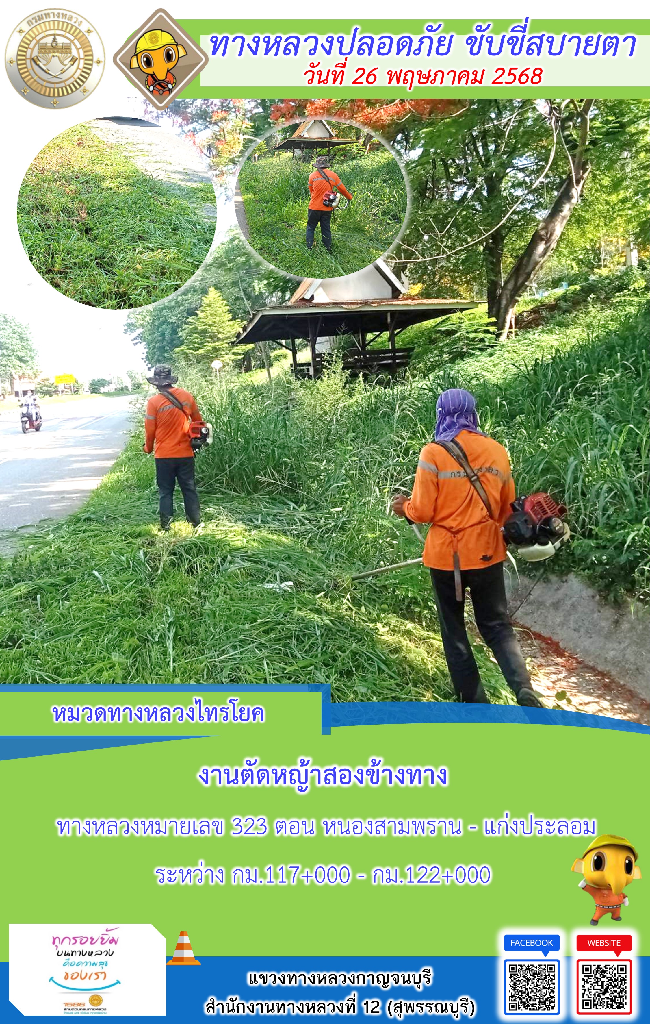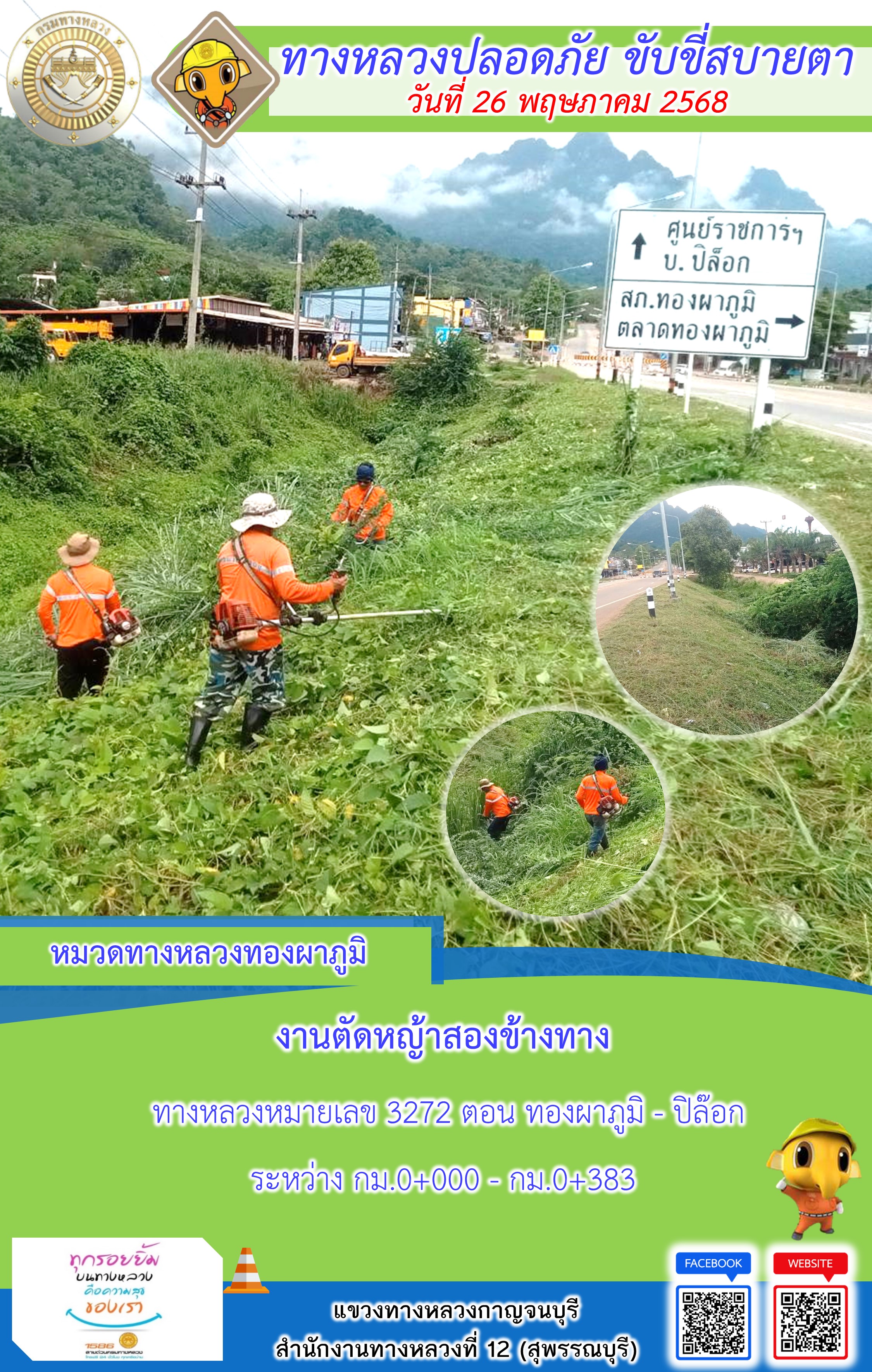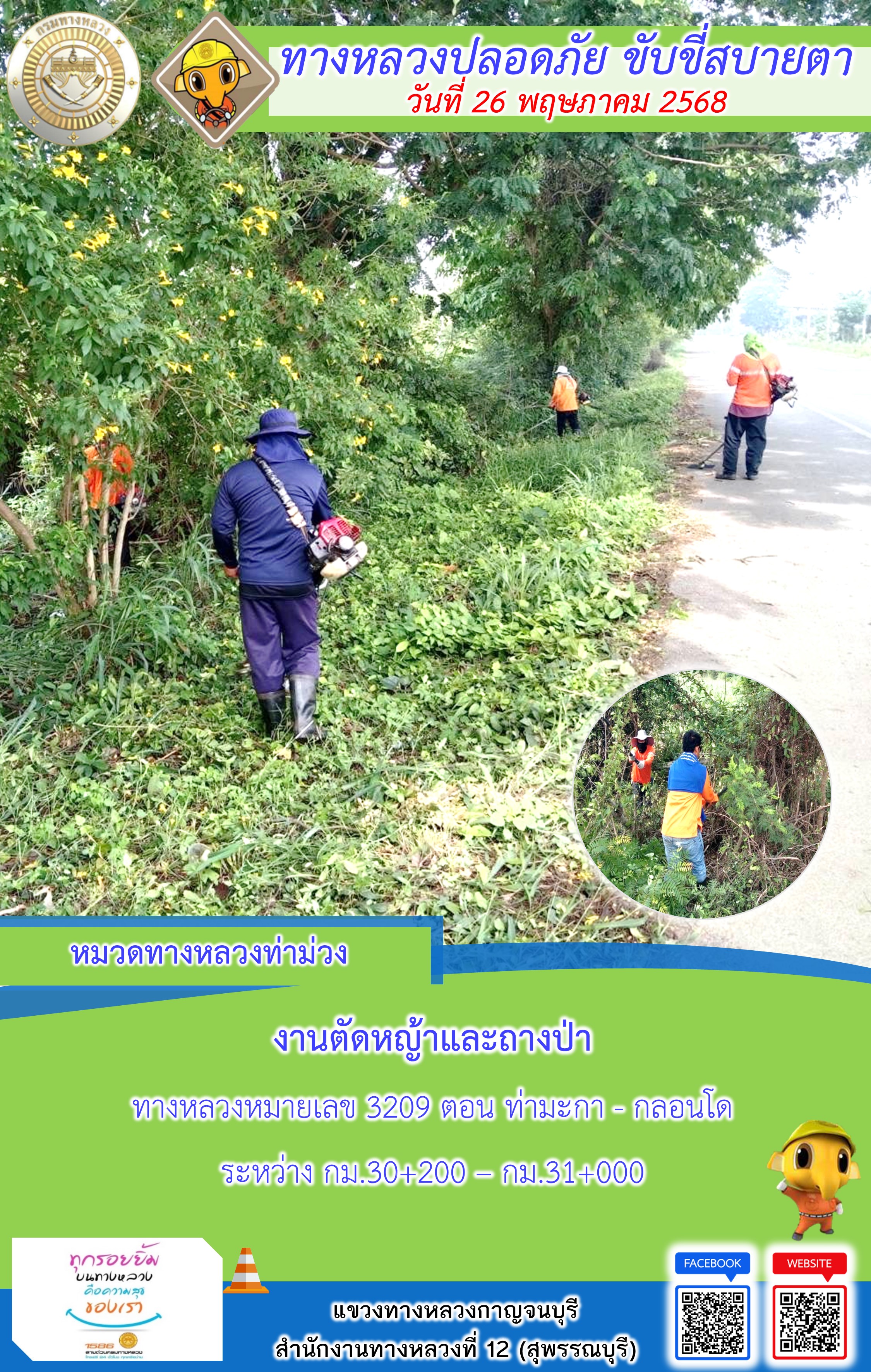 ข้อมูลภาพกิจกรรม : แขวงทางหลวงกาญจนบุรี โดยหมวดทางหลวงในสังกัด และงานอำนวยความปลอดภัยปฏิบัติงาน ประจำวันที่ 26 พ.ค. 68