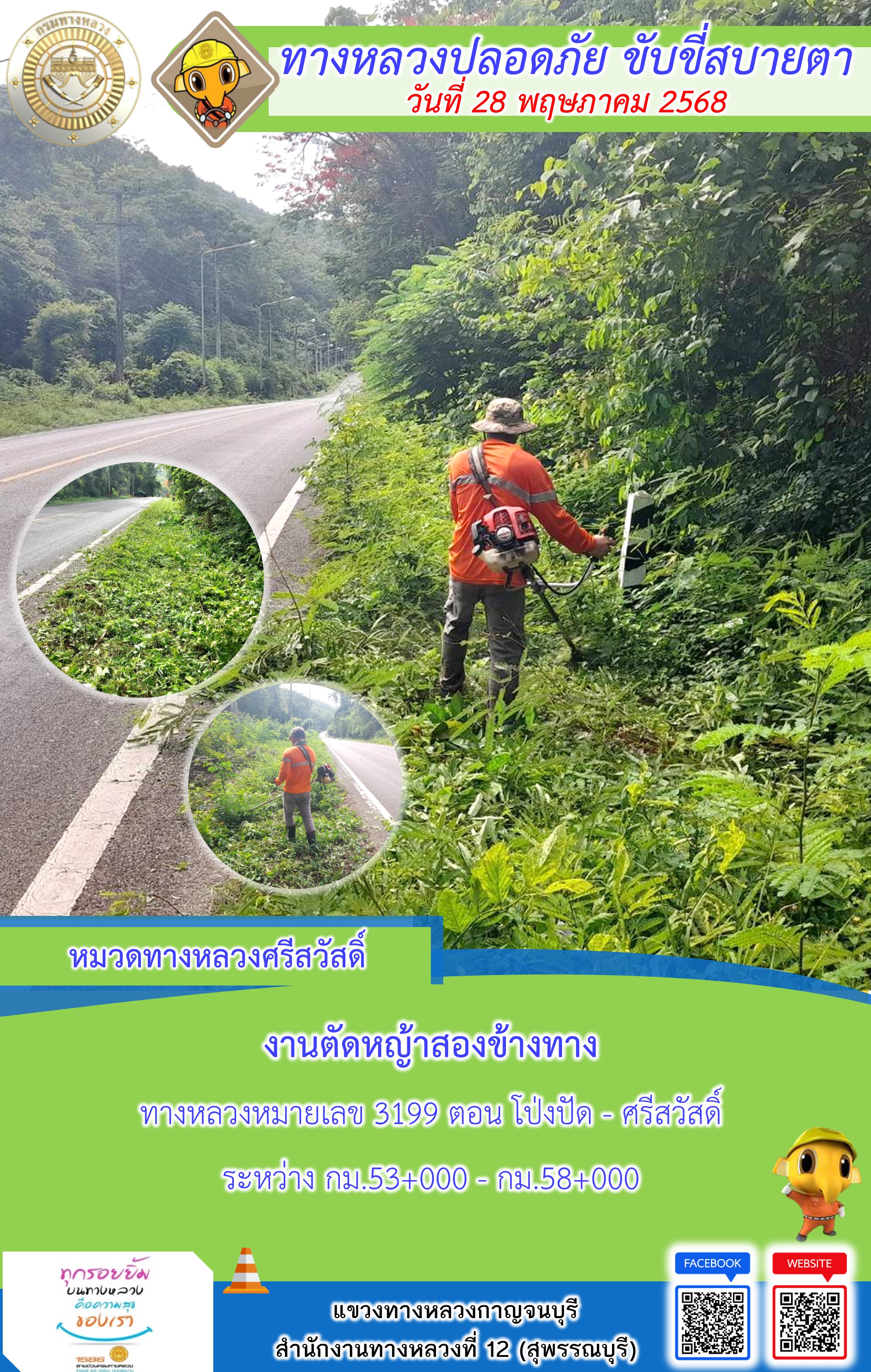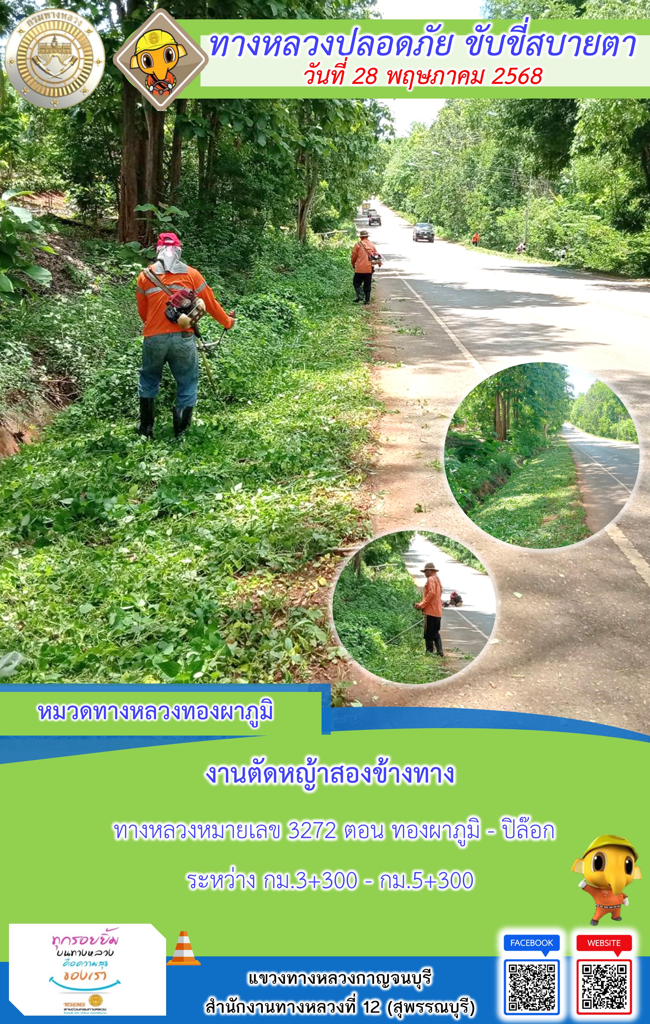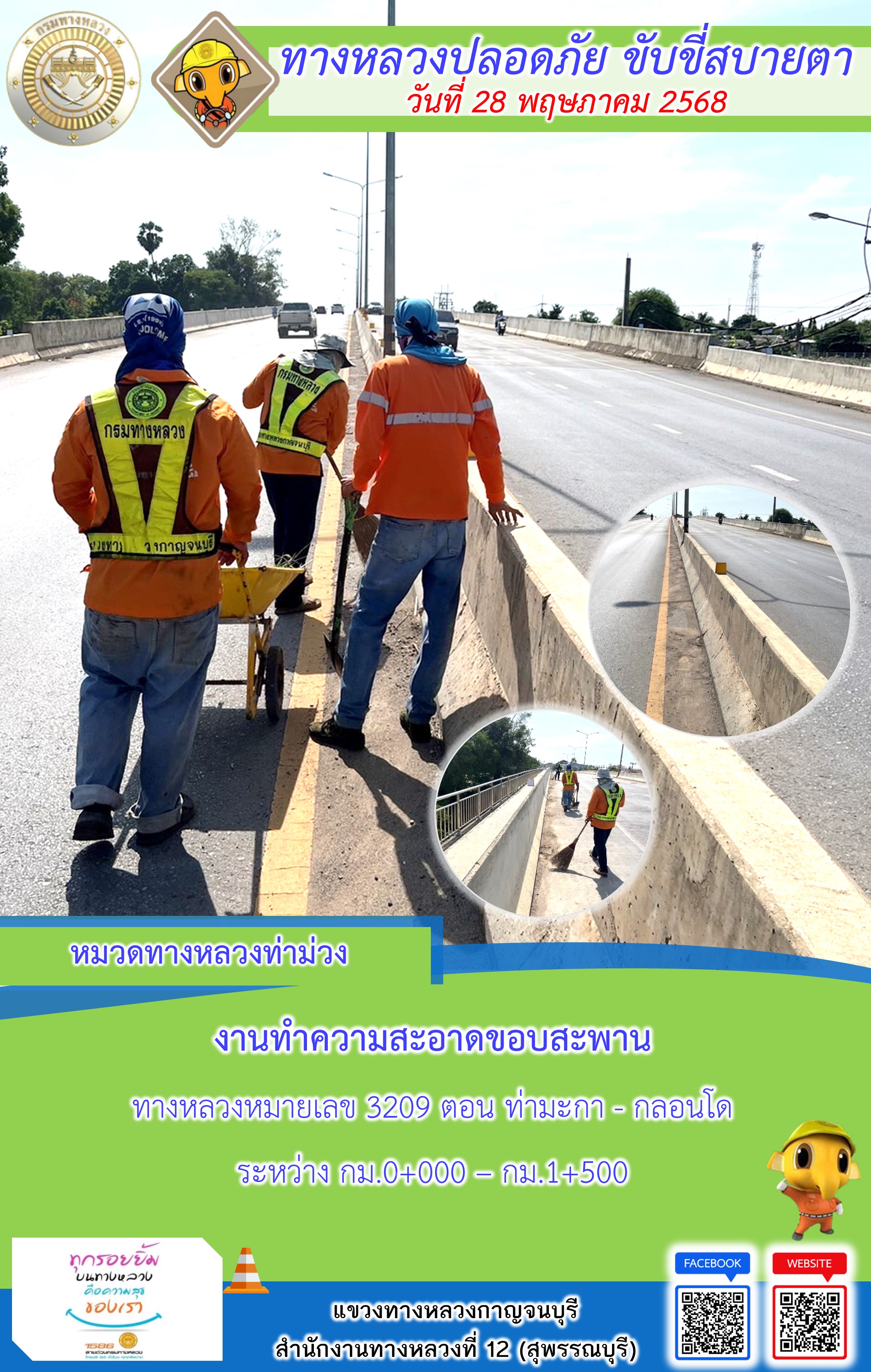 แขวงทางหลวงกาญจนบุรี โดยหมวดทางหลวงในสังกัด และงานอำนวยความปลอดภัยปฏิบัติงาน ประจำวันที่ 28 พ.ค. 68