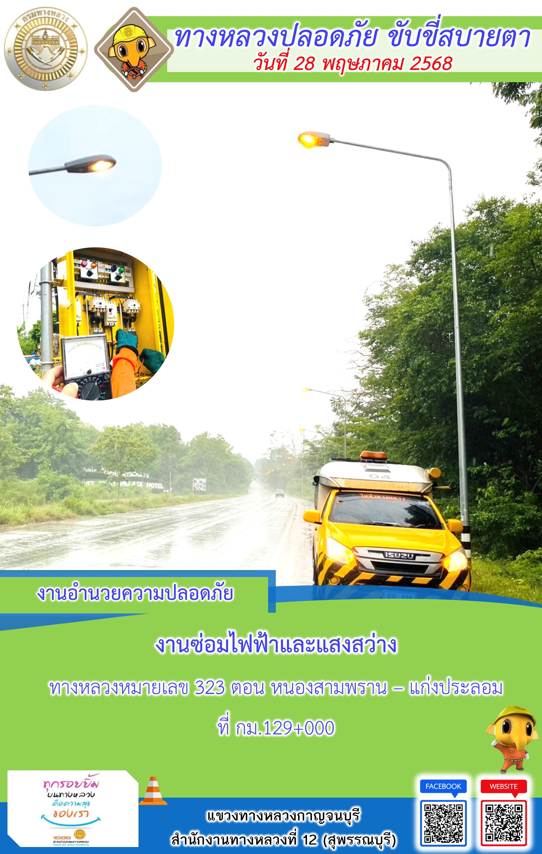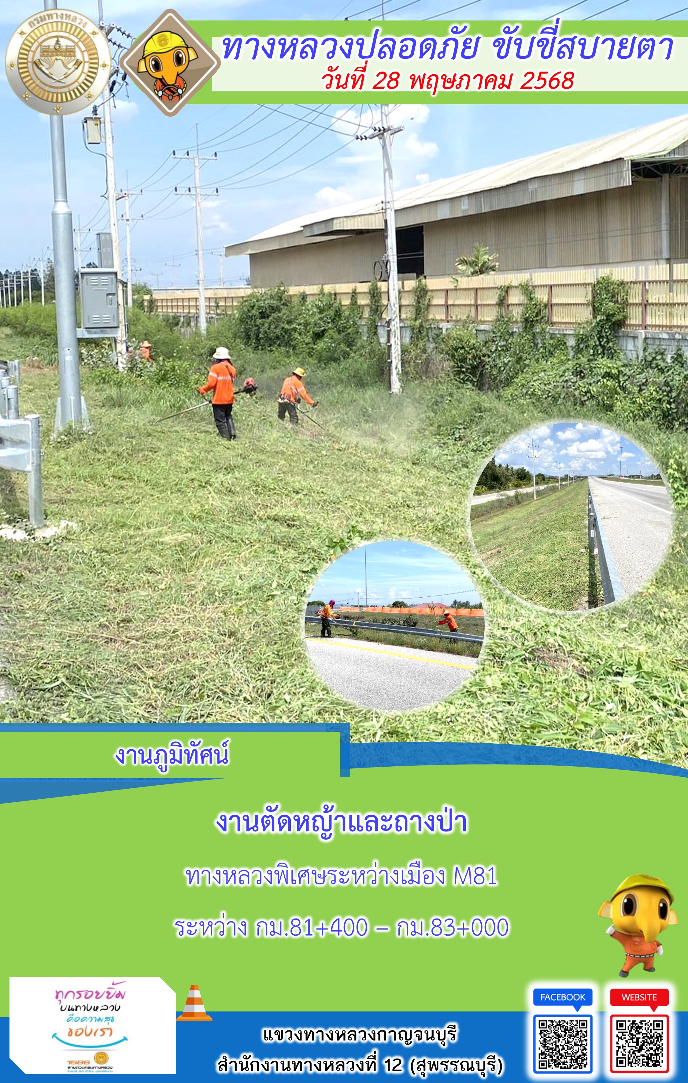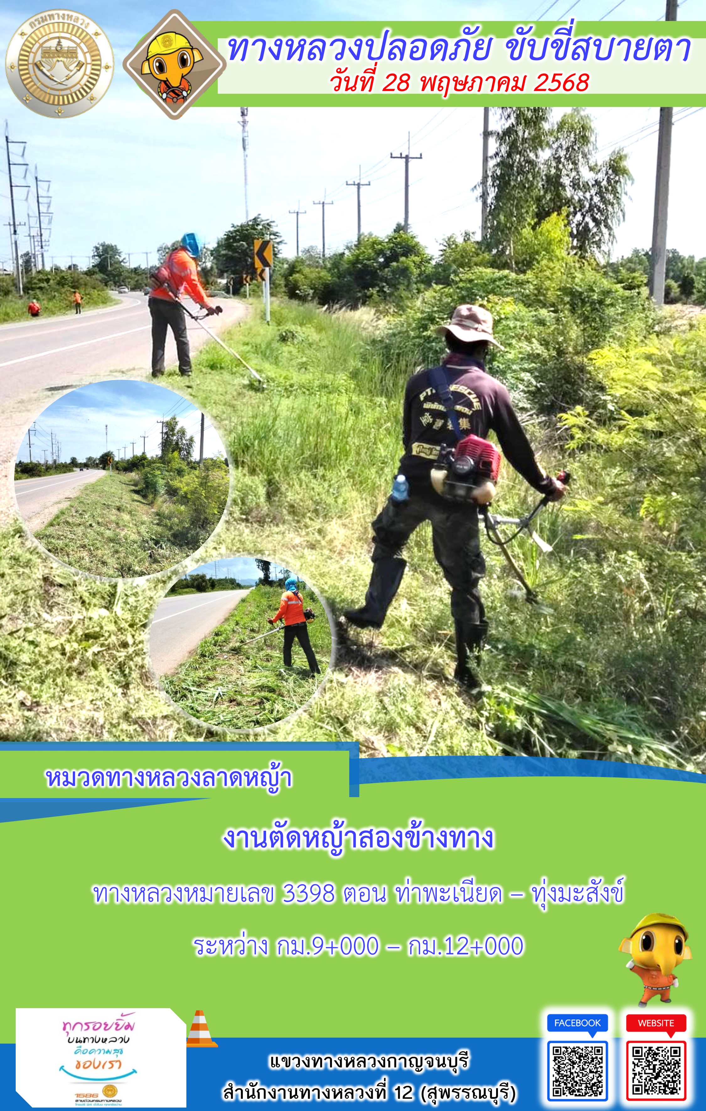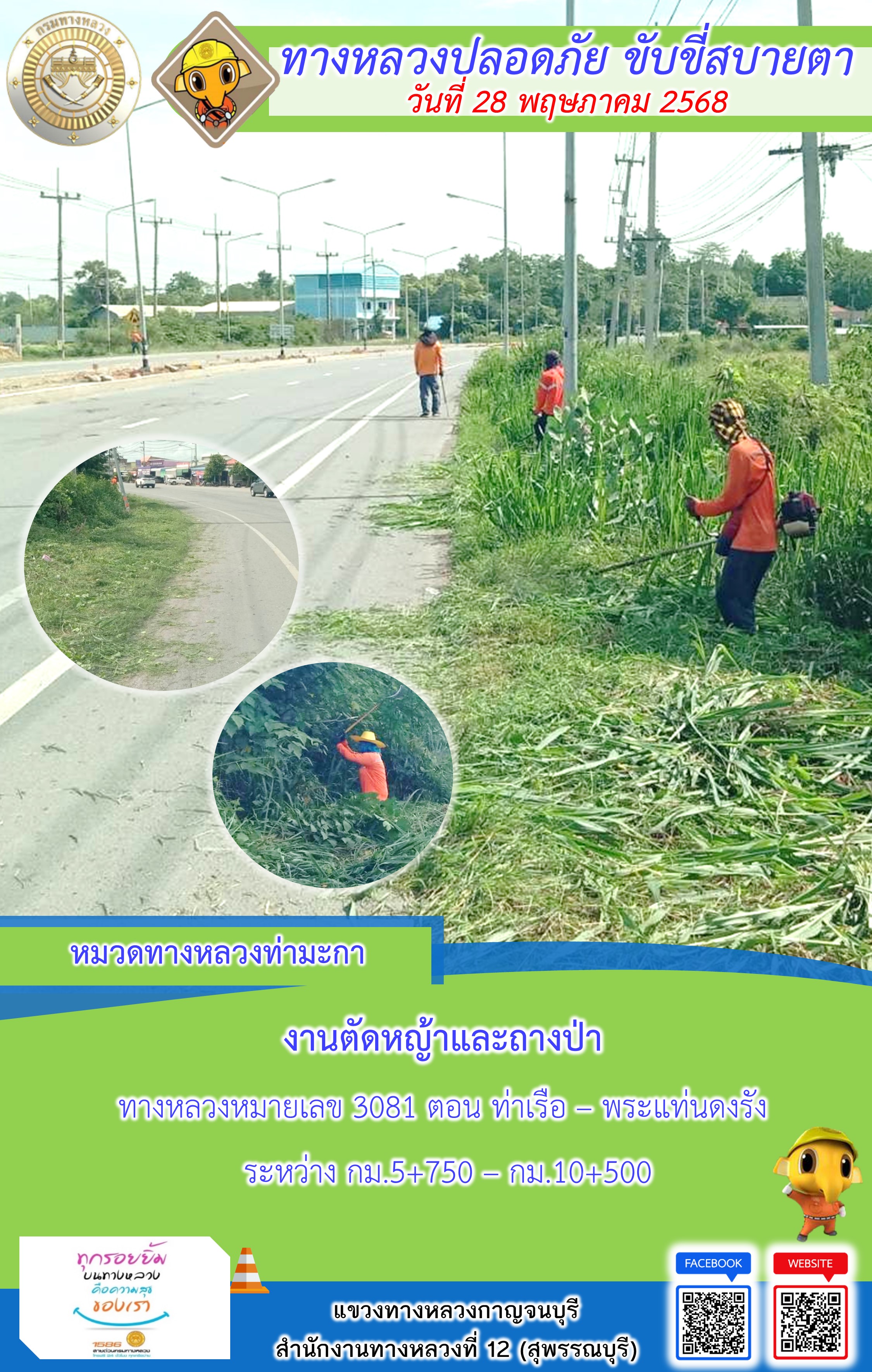 แขวงทางหลวงกาญจนบุรี โดยหมวดทางหลวงในสังกัด และงานอำนวยความปลอดภัยปฏิบัติงาน ประจำวันที่ 28 พ.ค. 68