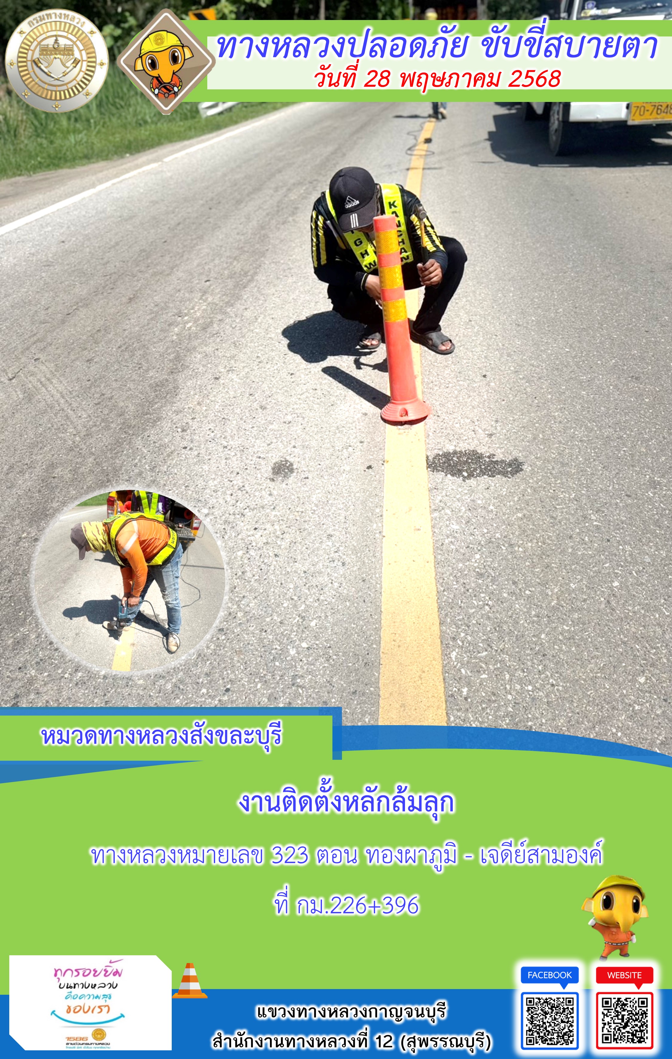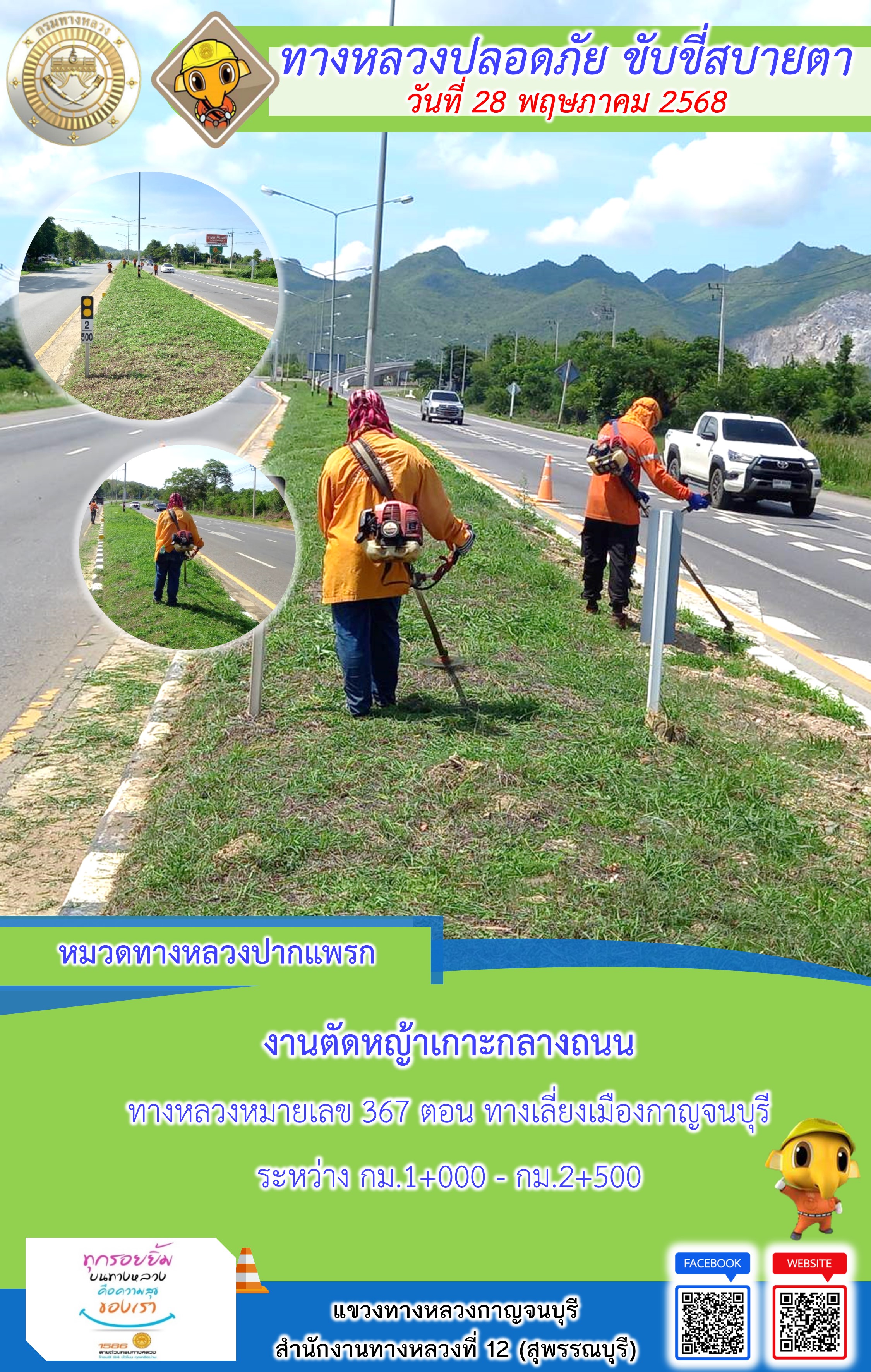 ข้อมูลภาพกิจกรรม : แขวงทางหลวงกาญจนบุรี โดยหมวดทางหลวงในสังกัด และงานอำนวยความปลอดภัยปฏิบัติงาน ประจำวันที่ 28 พ.ค. 68