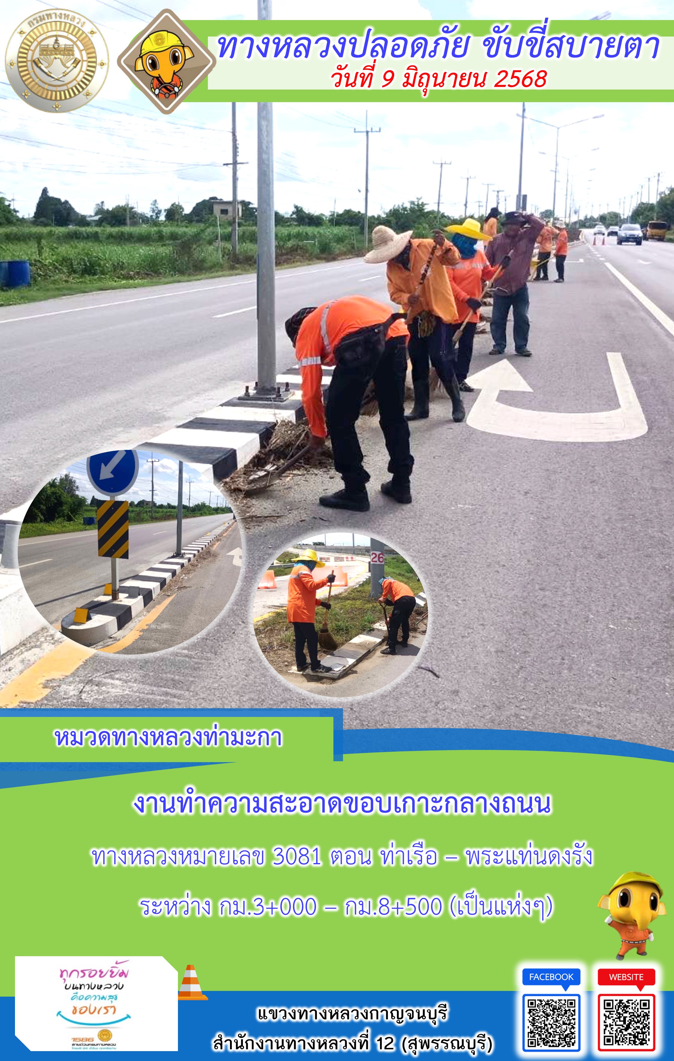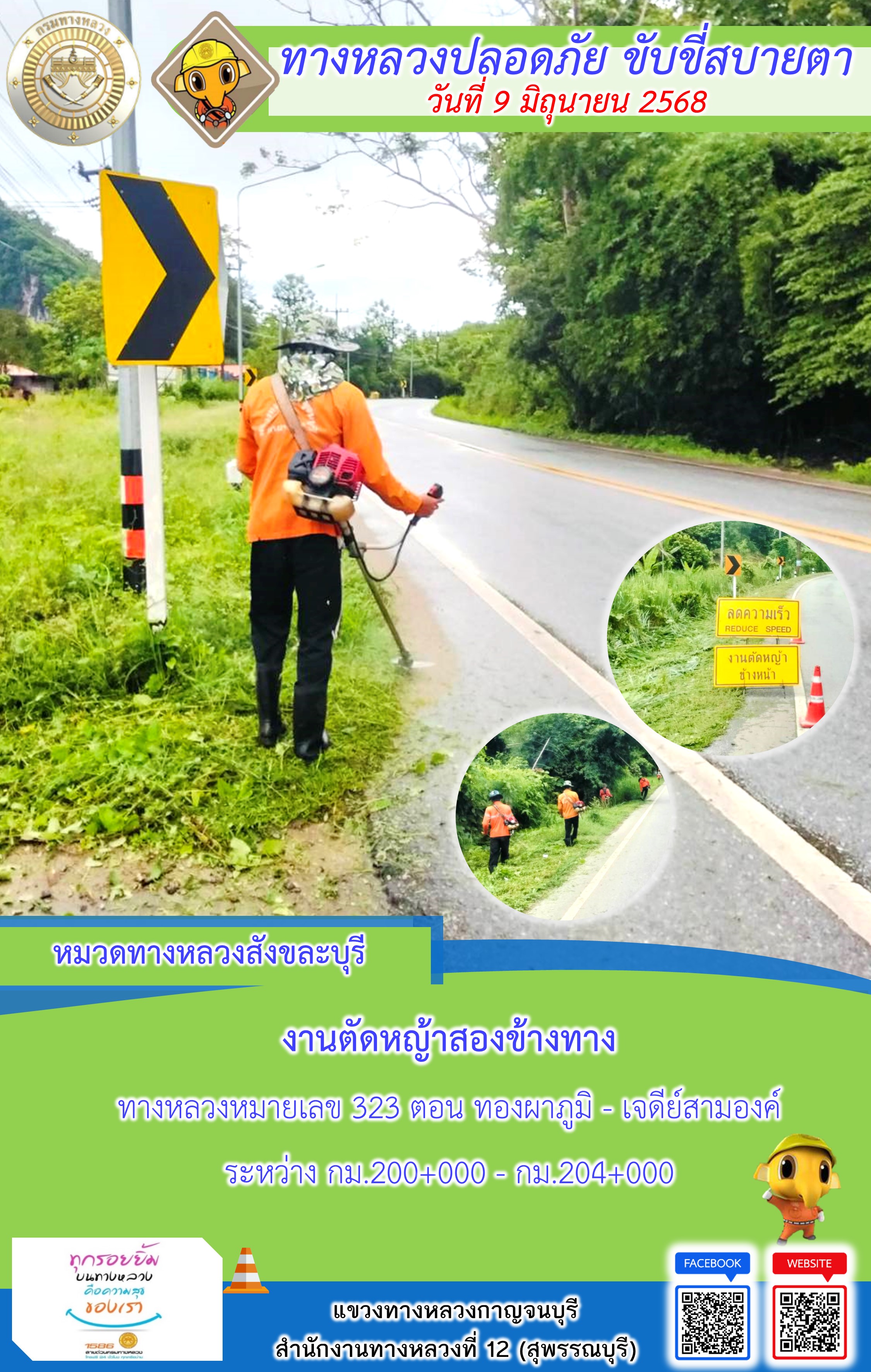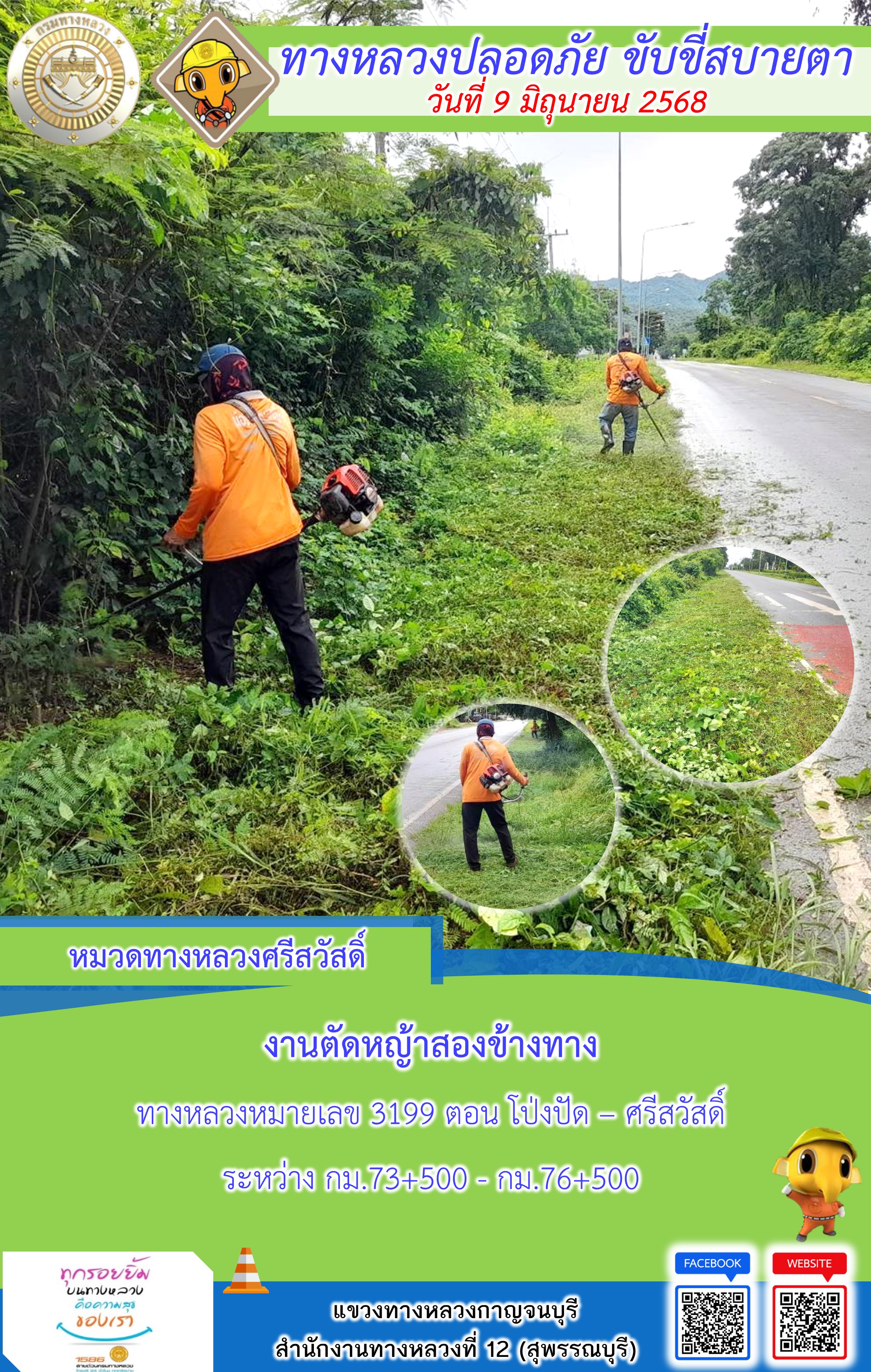 แขวงทางหลวงกาญจนบุรี โดยหมวดทางหลวงในสังกัด และงานอำนวยความปลอดภัยปฏิบัติงาน ประจำวันที่ 9 มิ.ย. 68