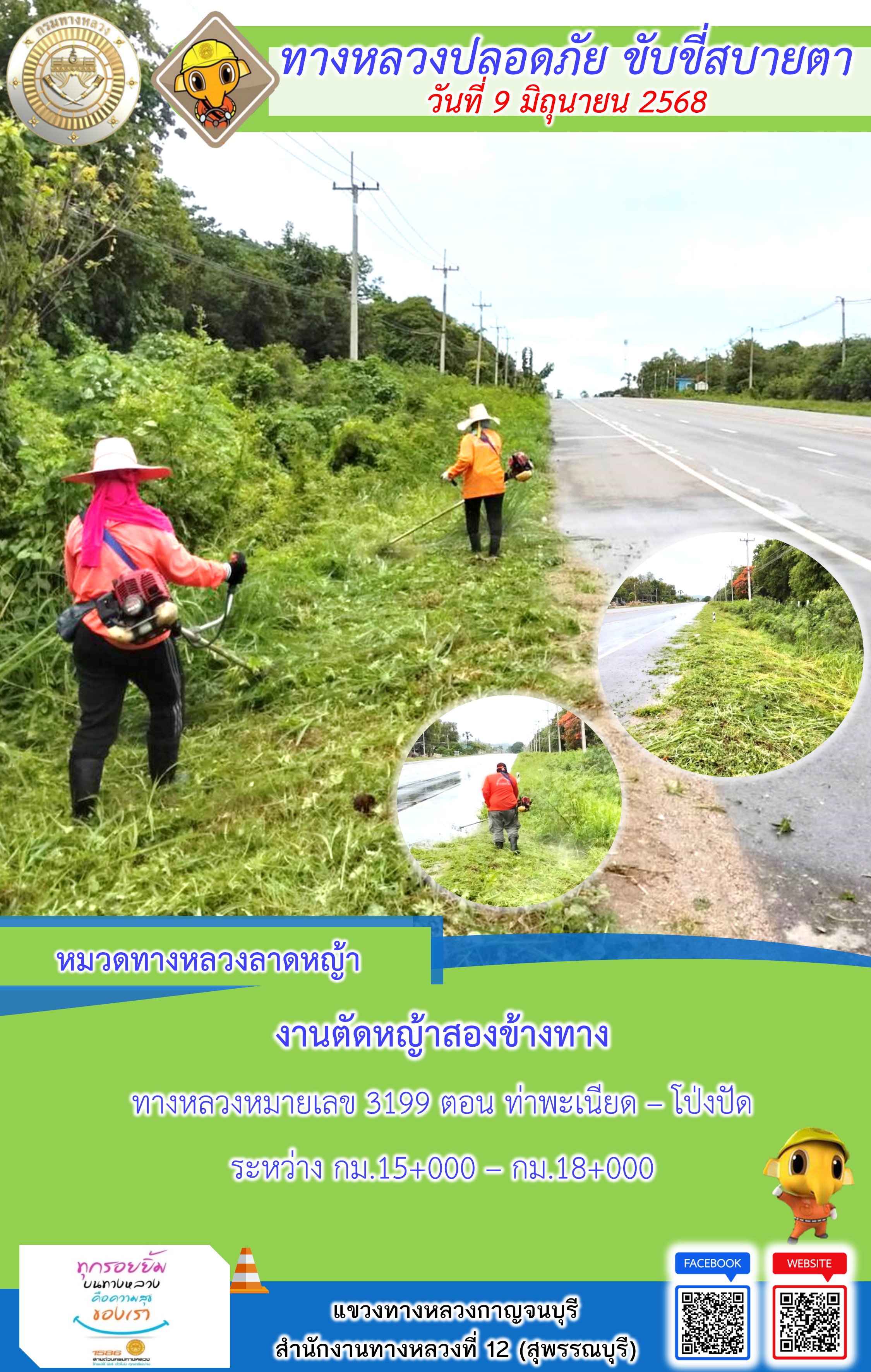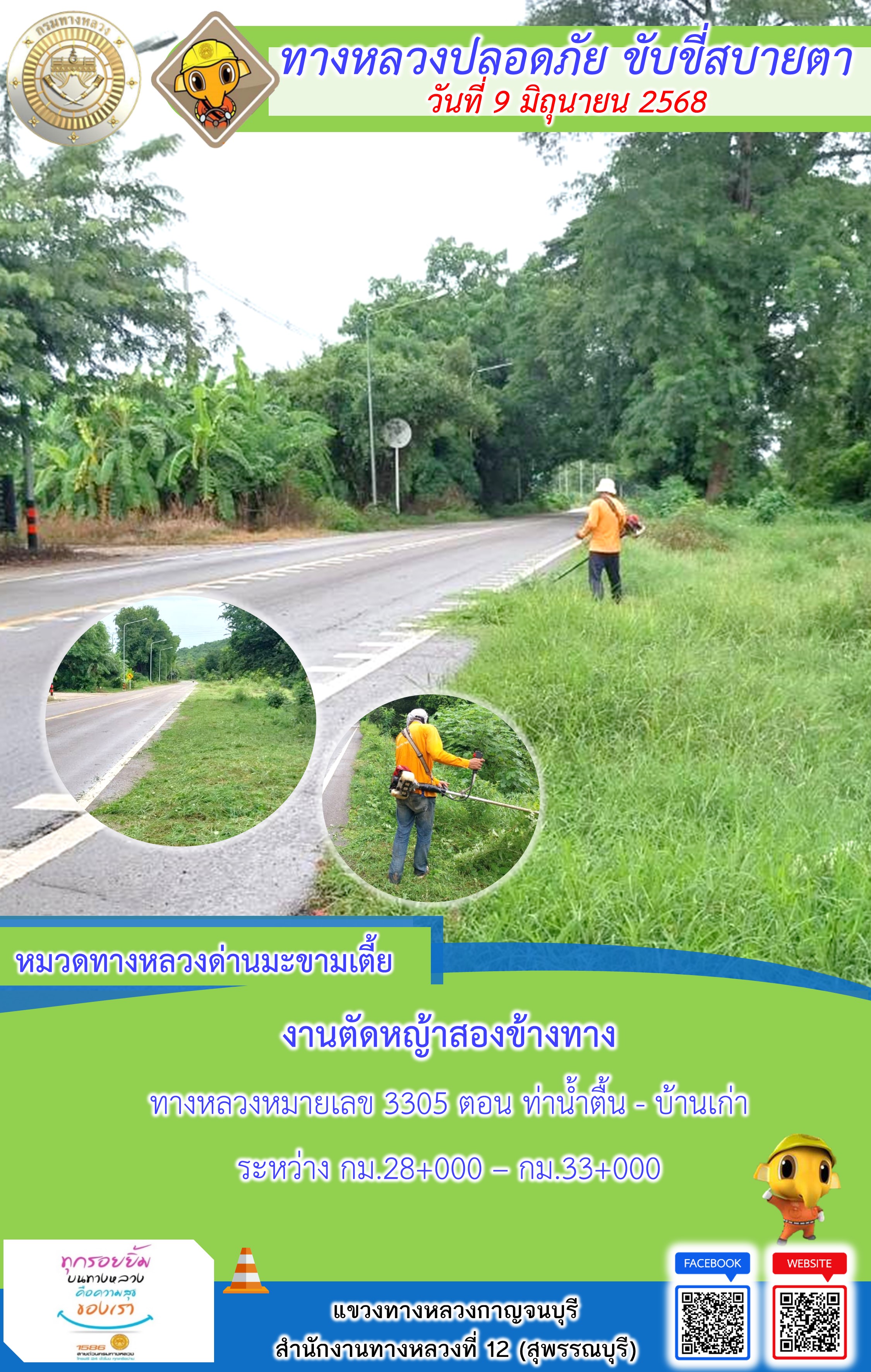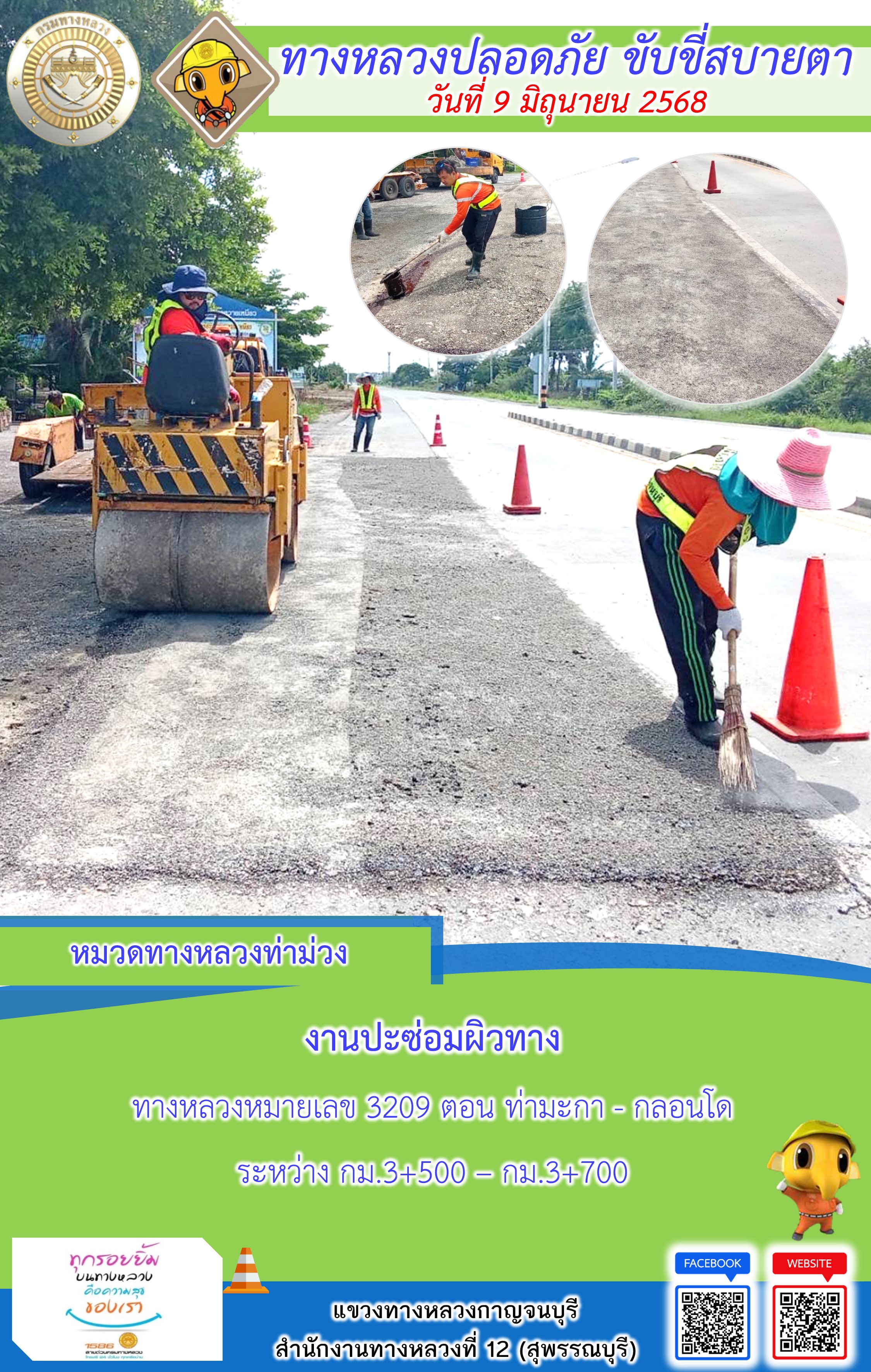 แขวงทางหลวงกาญจนบุรี โดยหมวดทางหลวงในสังกัด และงานอำนวยความปลอดภัยปฏิบัติงาน ประจำวันที่ 9 มิ.ย. 68