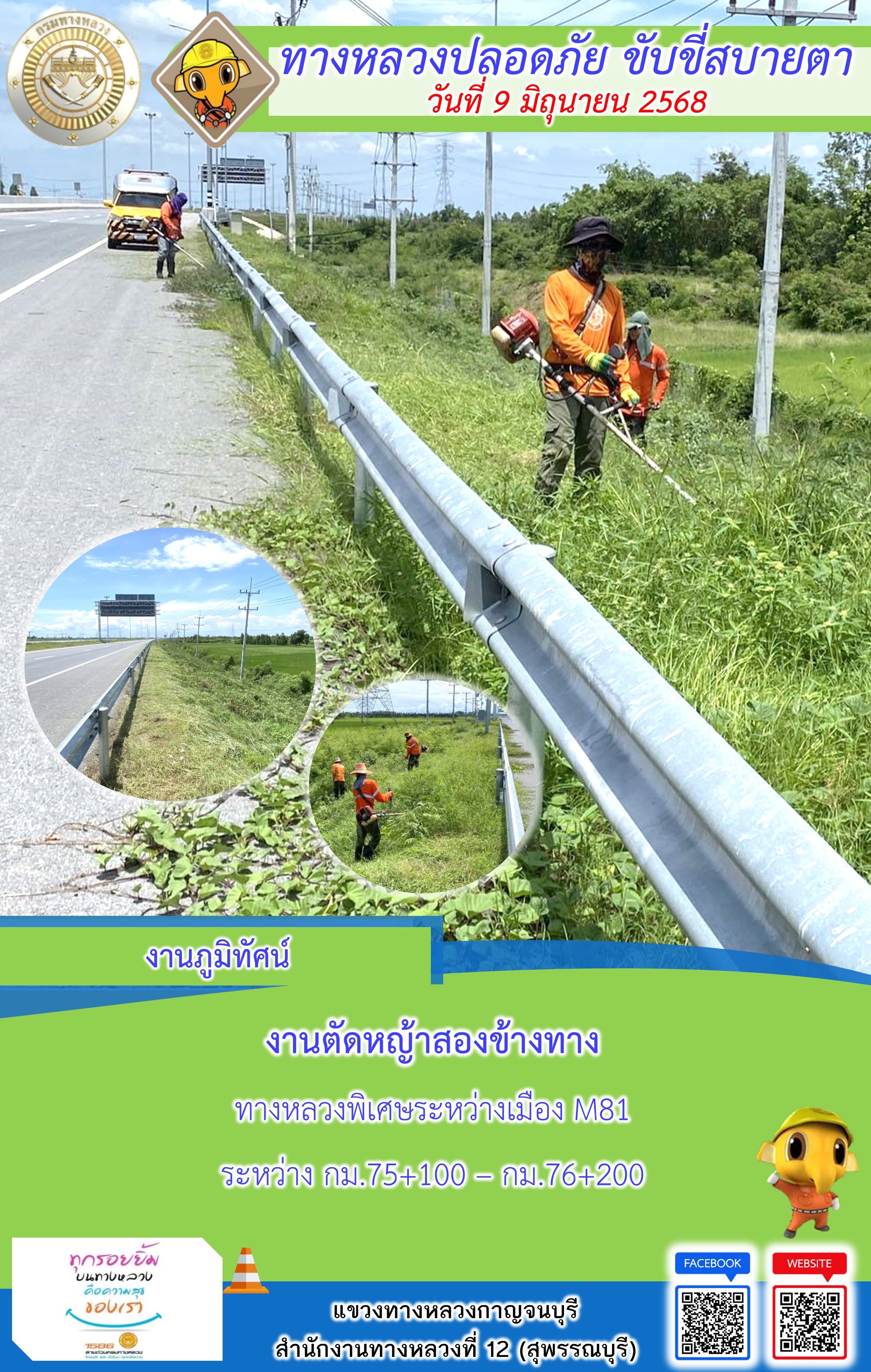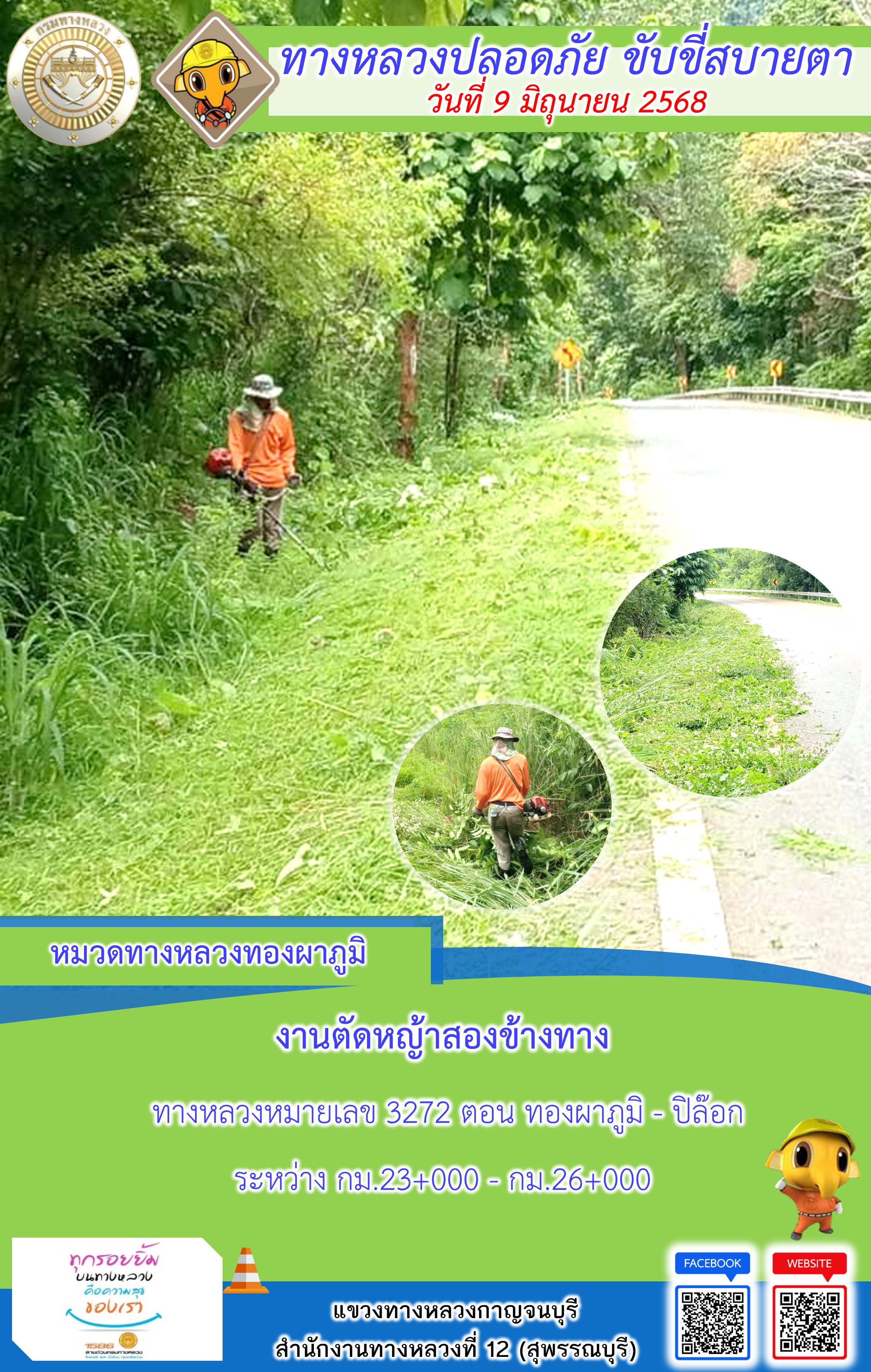 ข้อมูลภาพกิจกรรม : แขวงทางหลวงกาญจนบุรี โดยหมวดทางหลวงในสังกัด และงานอำนวยความปลอดภัยปฏิบัติงาน ประจำวันที่ 9 มิ.ย. 68