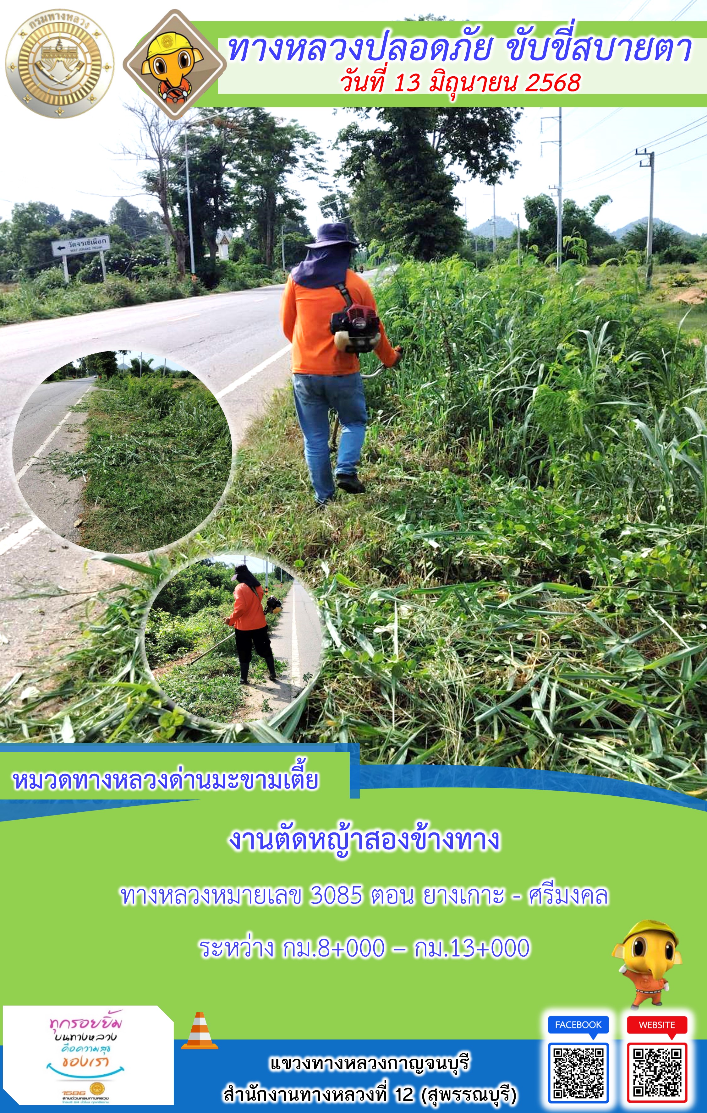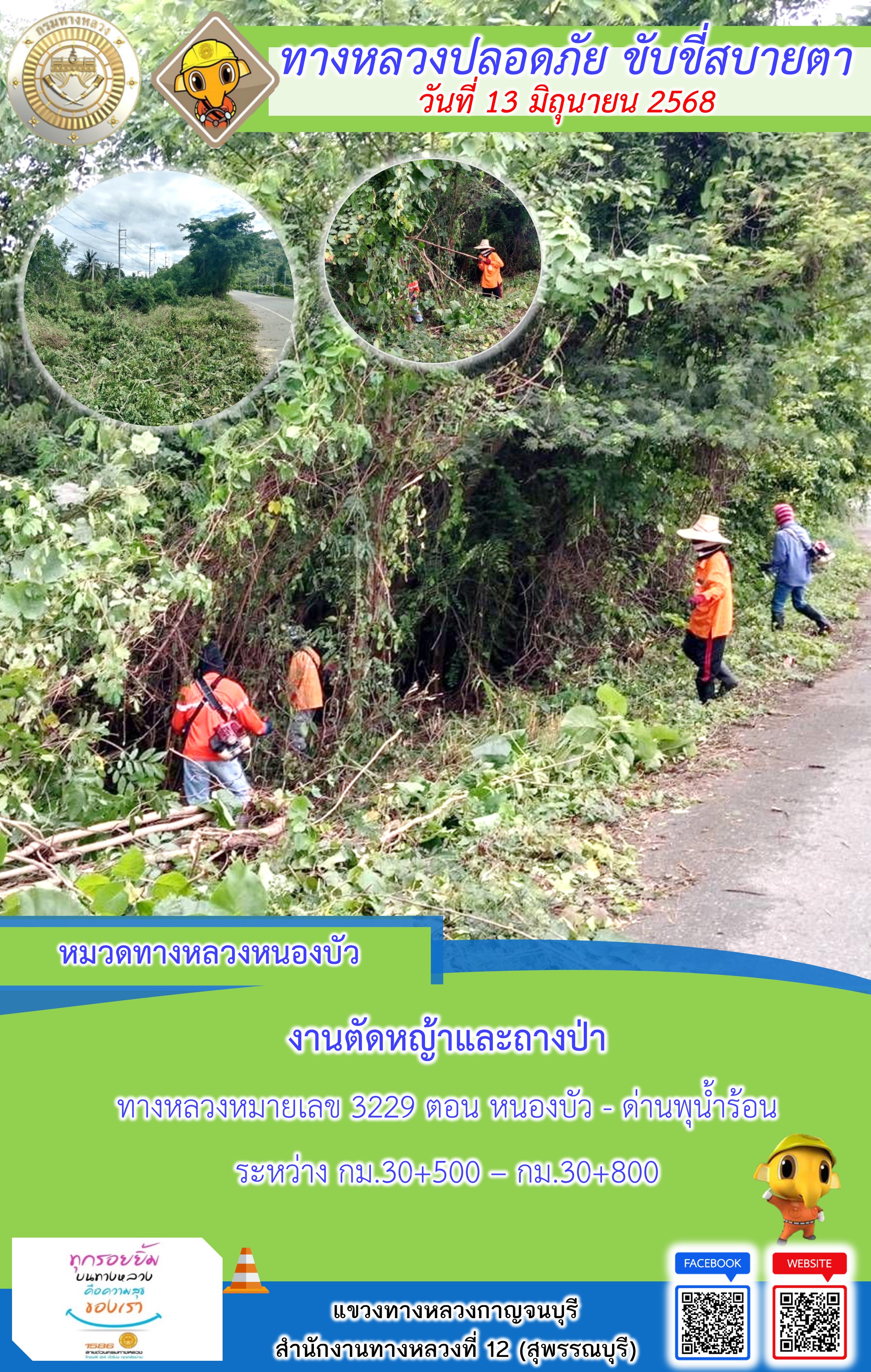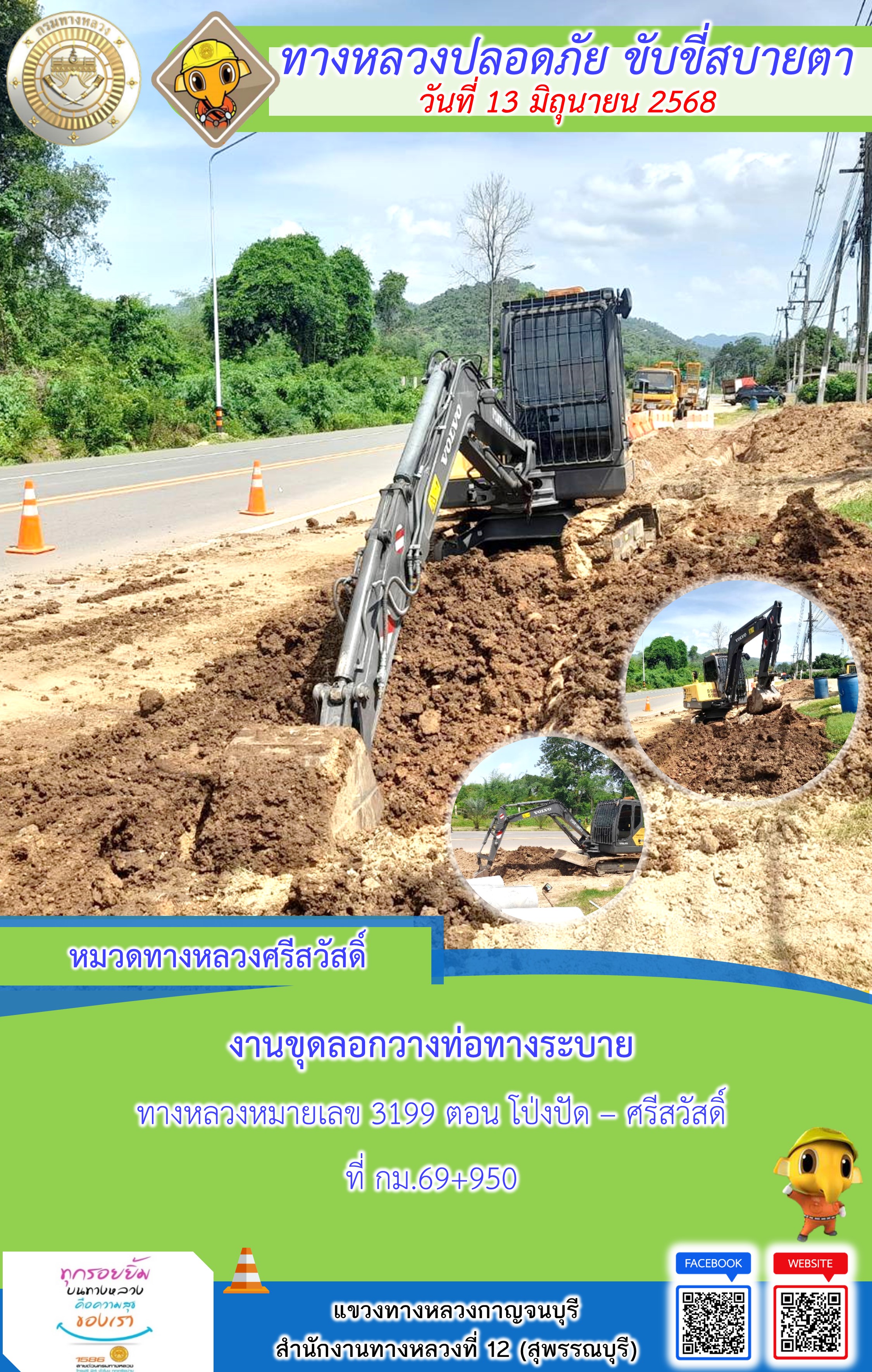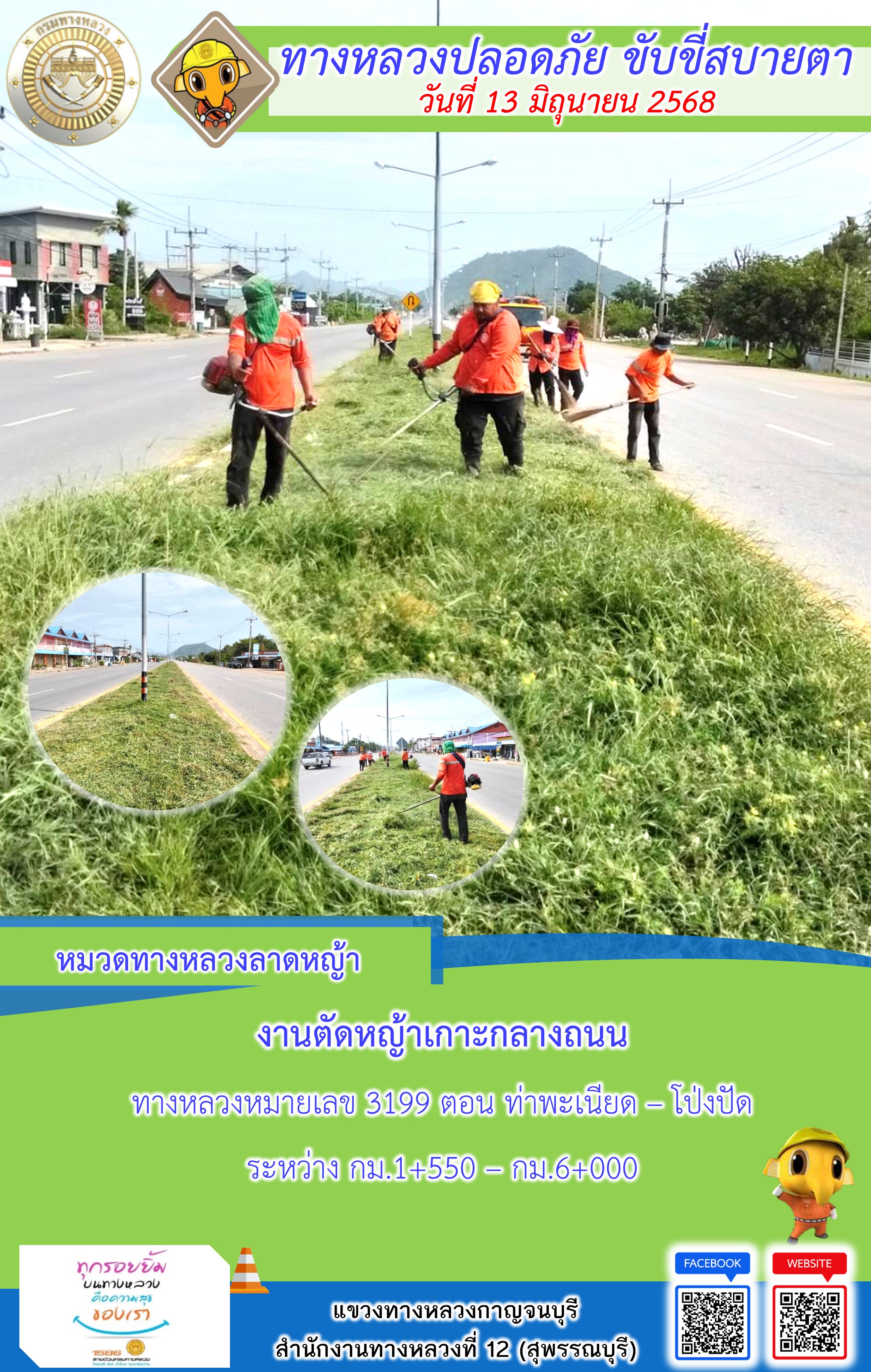 แขวงทางหลวงกาญจนบุรี โดยหมวดทางหลวงในสังกัด และงานอำนวยความปลอดภัยปฏิบัติงาน ประจำวันที่ 13 มิ.ย. 68