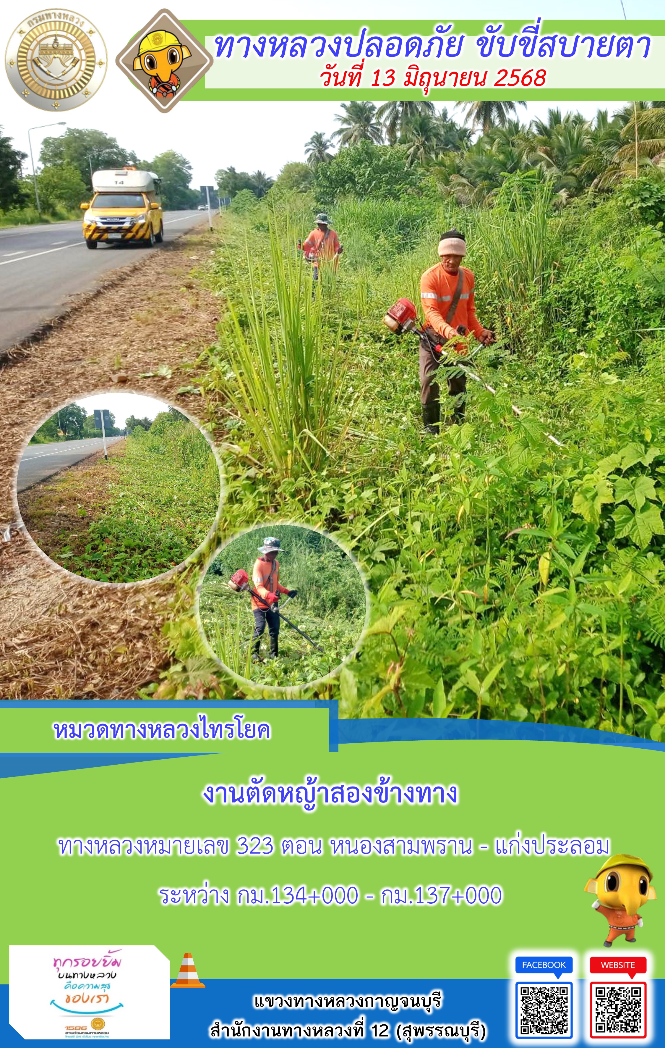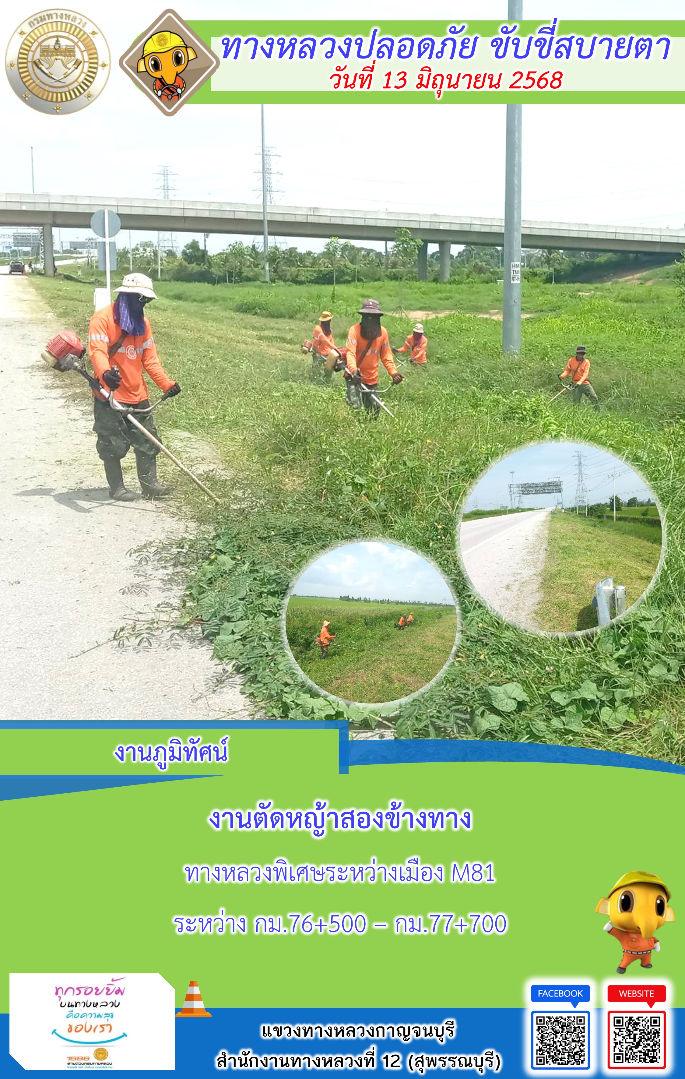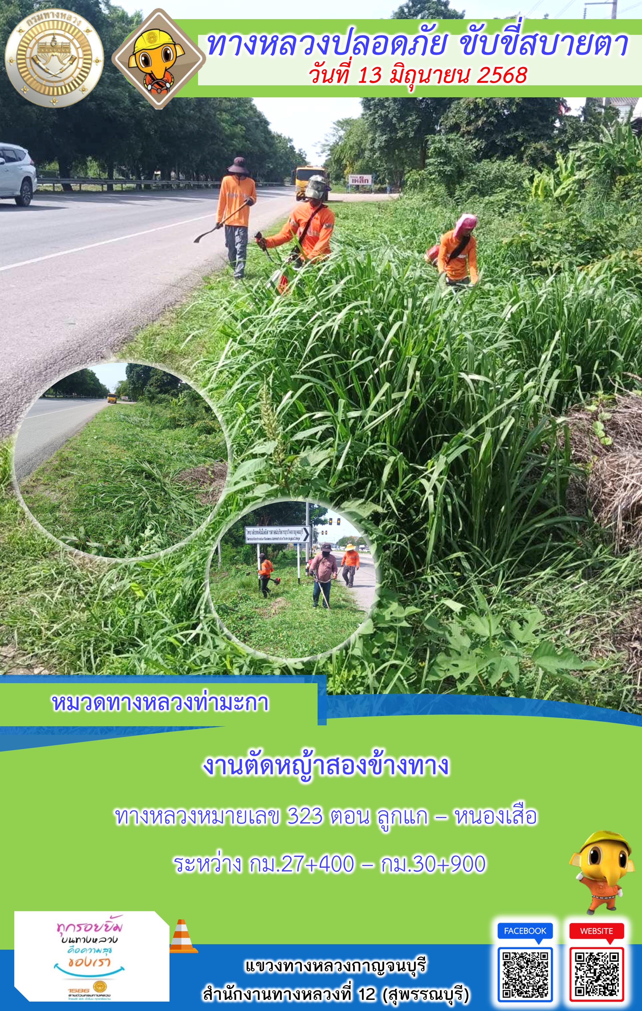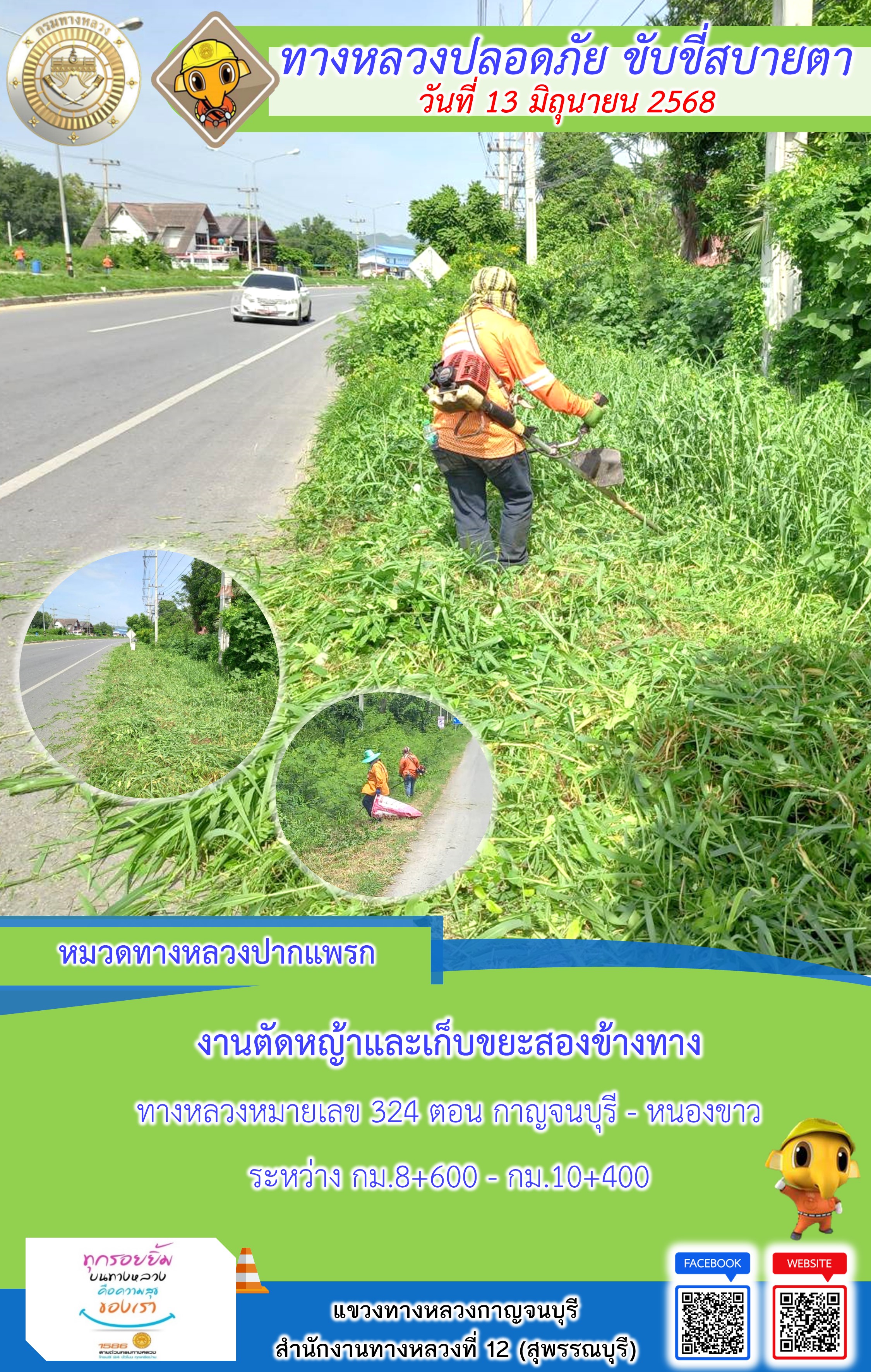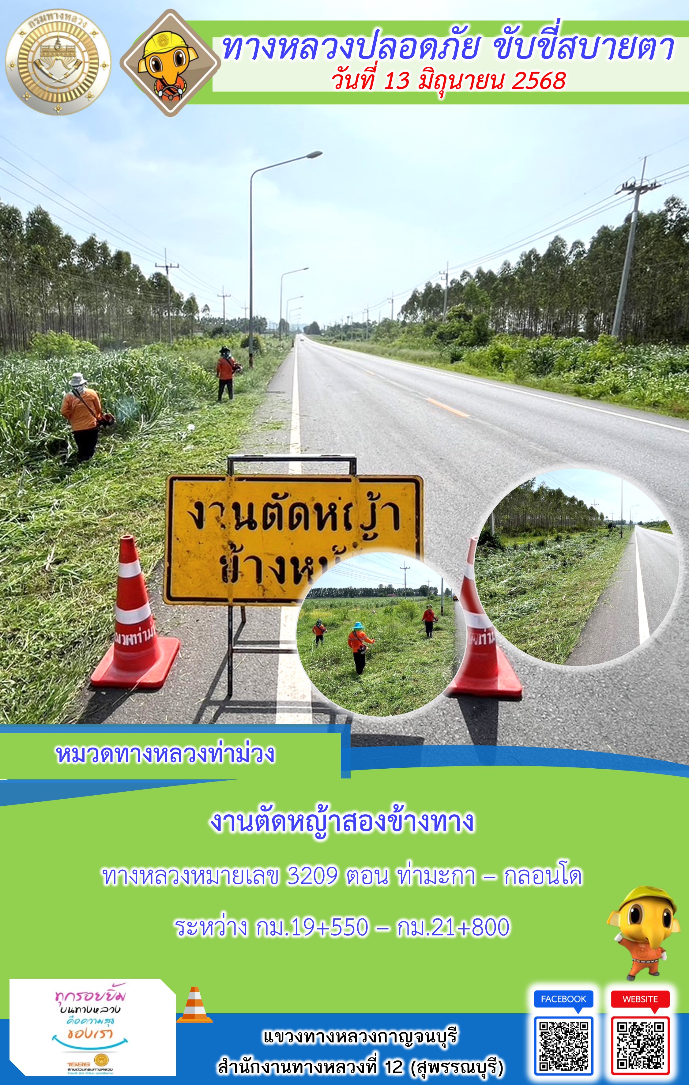 ข้อมูลภาพกิจกรรม : แขวงทางหลวงกาญจนบุรี โดยหมวดทางหลวงในสังกัด และงานอำนวยความปลอดภัยปฏิบัติงาน ประจำวันที่ 13 มิ.ย. 68