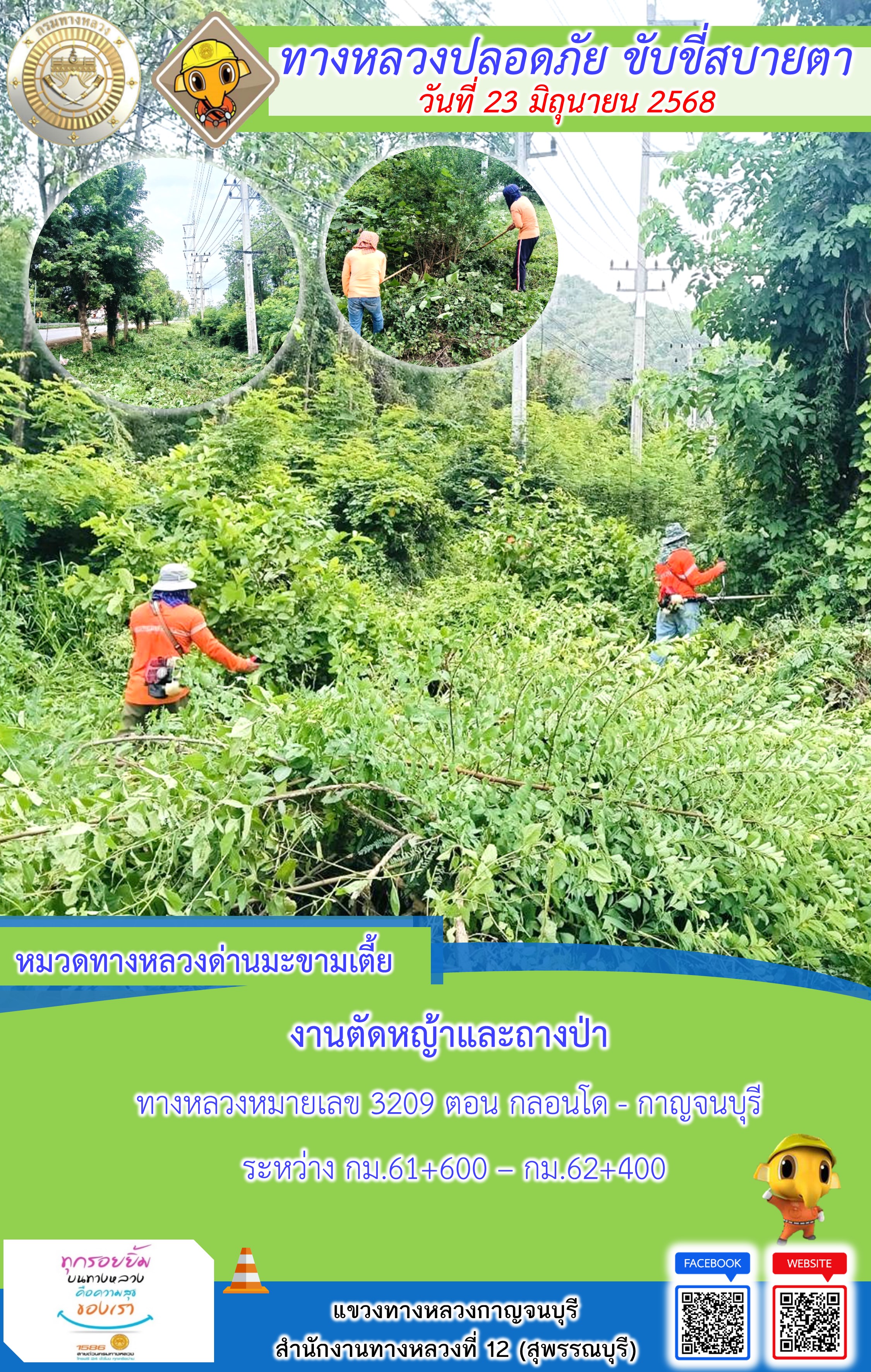 แขวงทางหลวงกาญจนบุรี โดยหมวดทางหลวงในสังกัด และงานอำนวยความปลอดภัยปฏิบัติงาน ประจำวันที่ 23 มิ.ย. 68