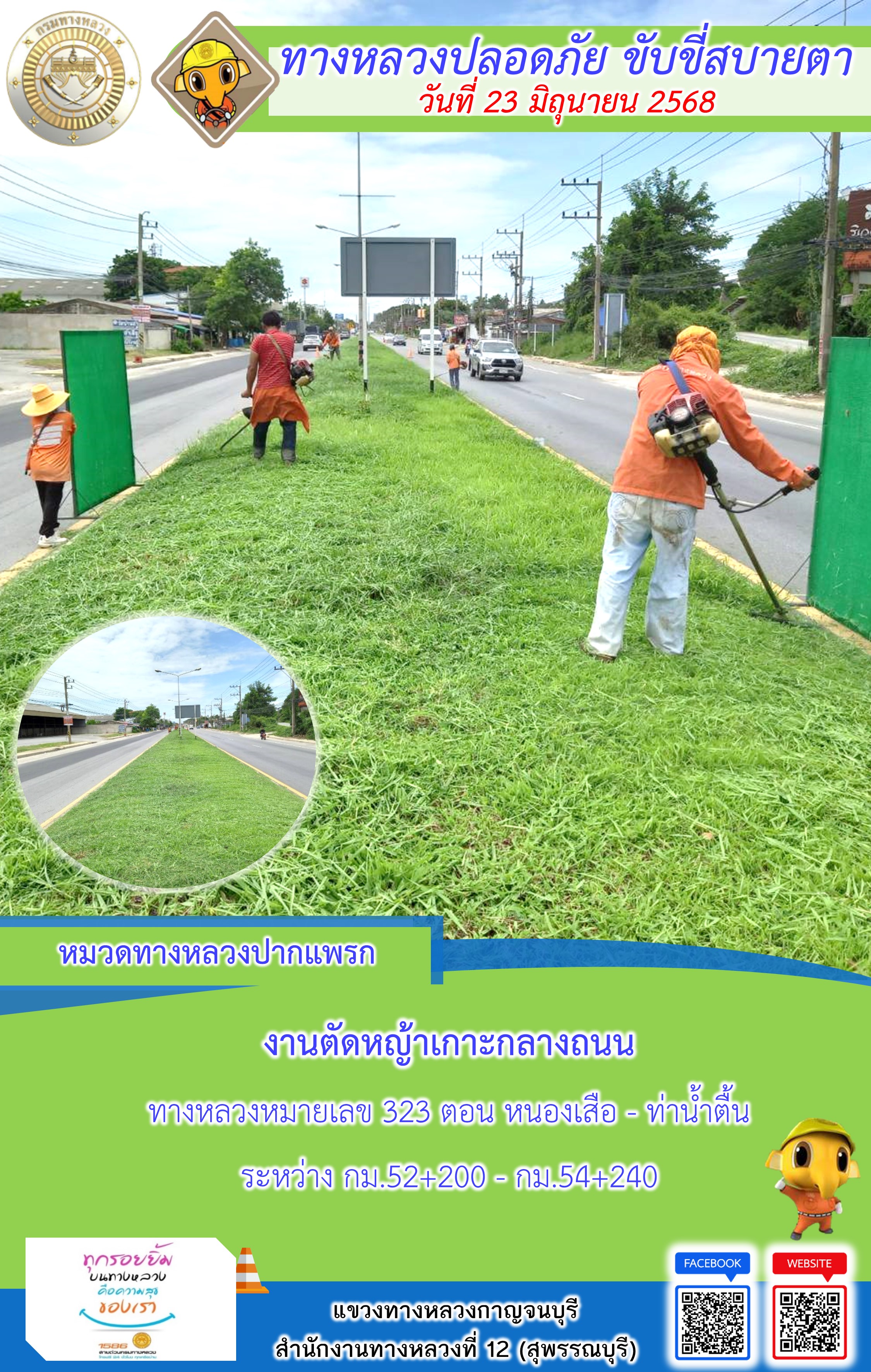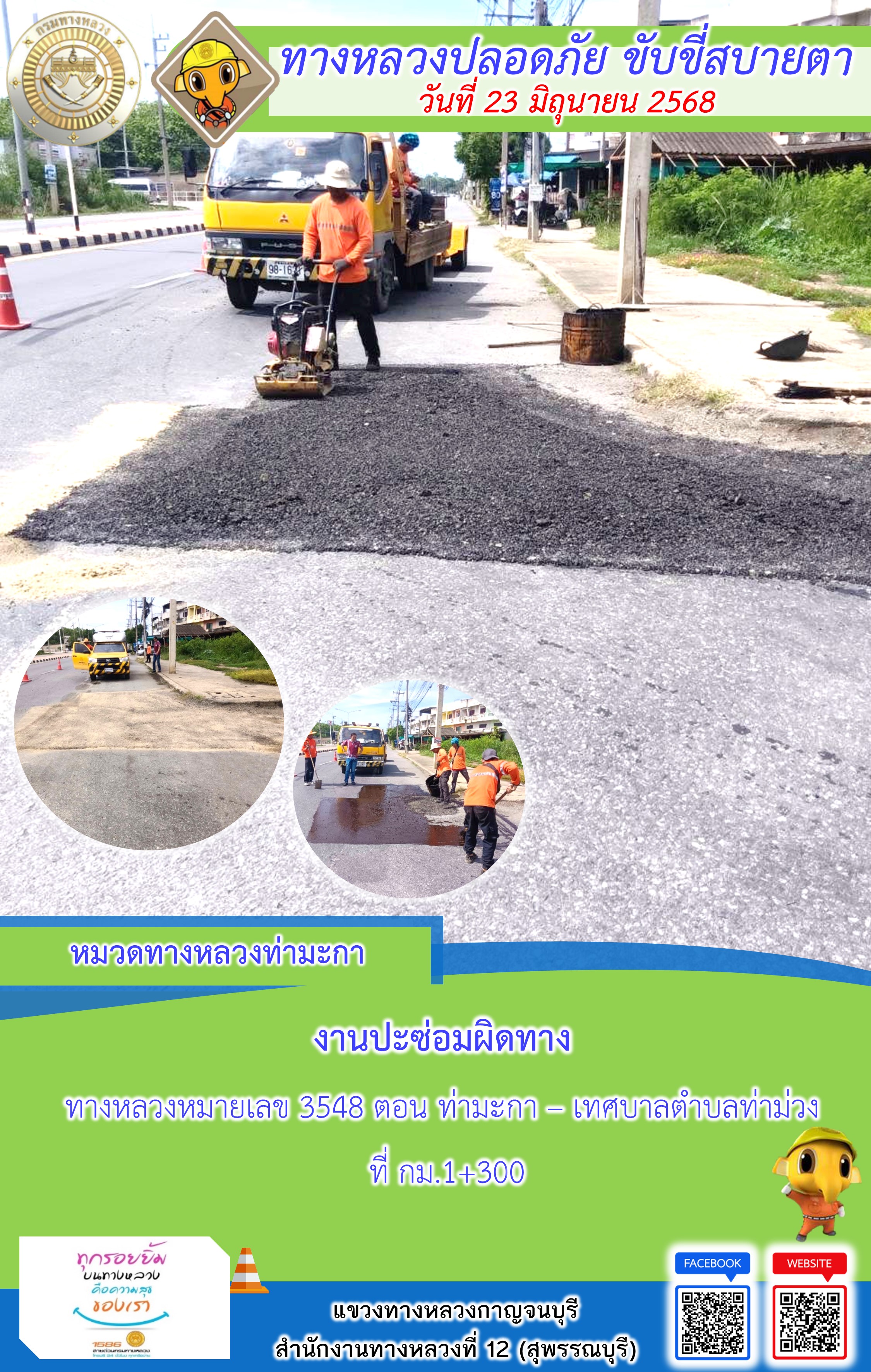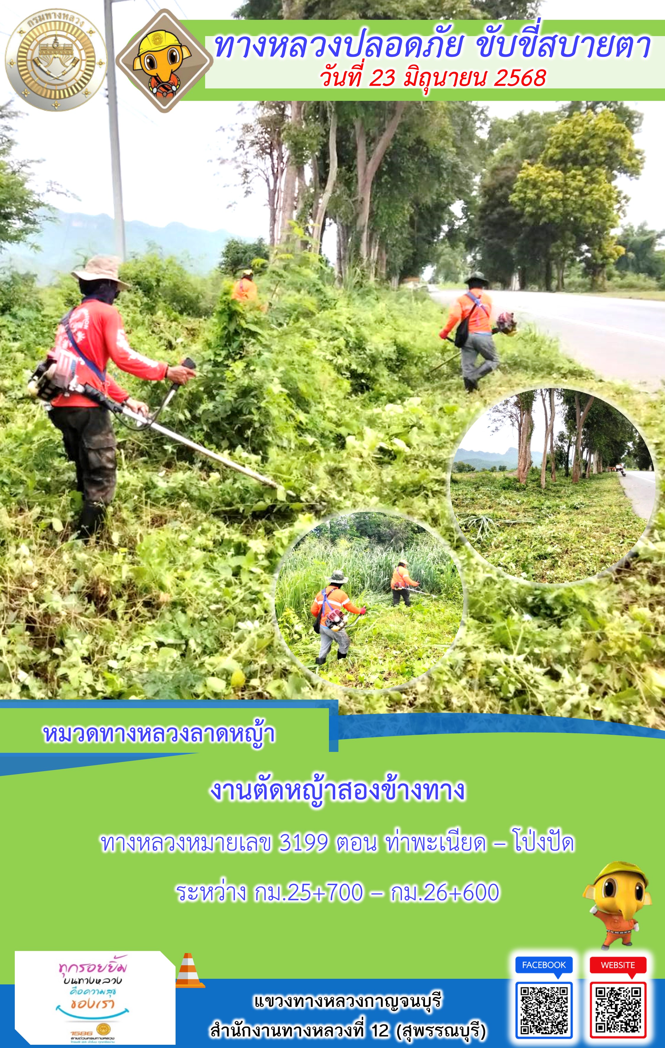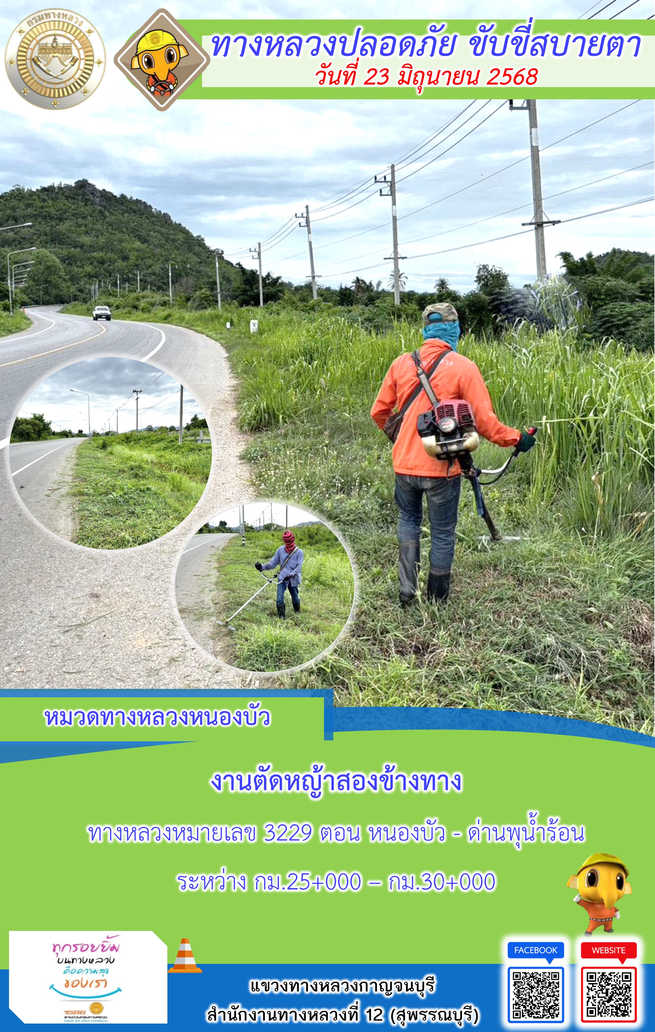 ข้อมูลภาพกิจกรรม : แขวงทางหลวงกาญจนบุรี โดยหมวดทางหลวงในสังกัด และงานอำนวยความปลอดภัยปฏิบัติงาน ประจำวันที่ 23 มิ.ย. 68