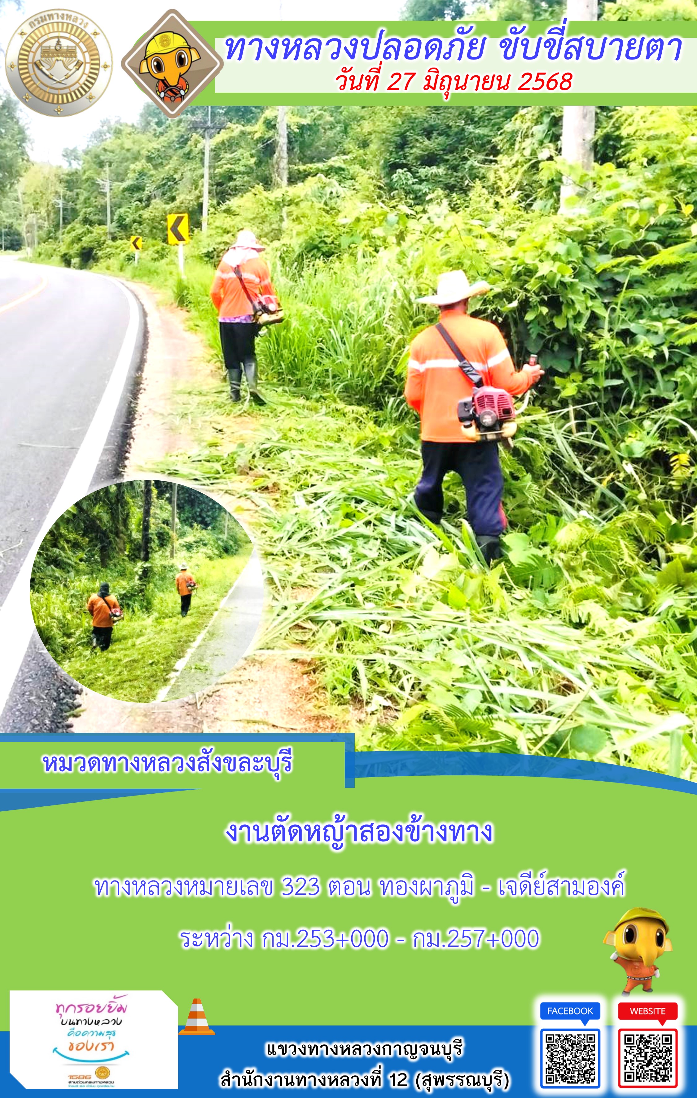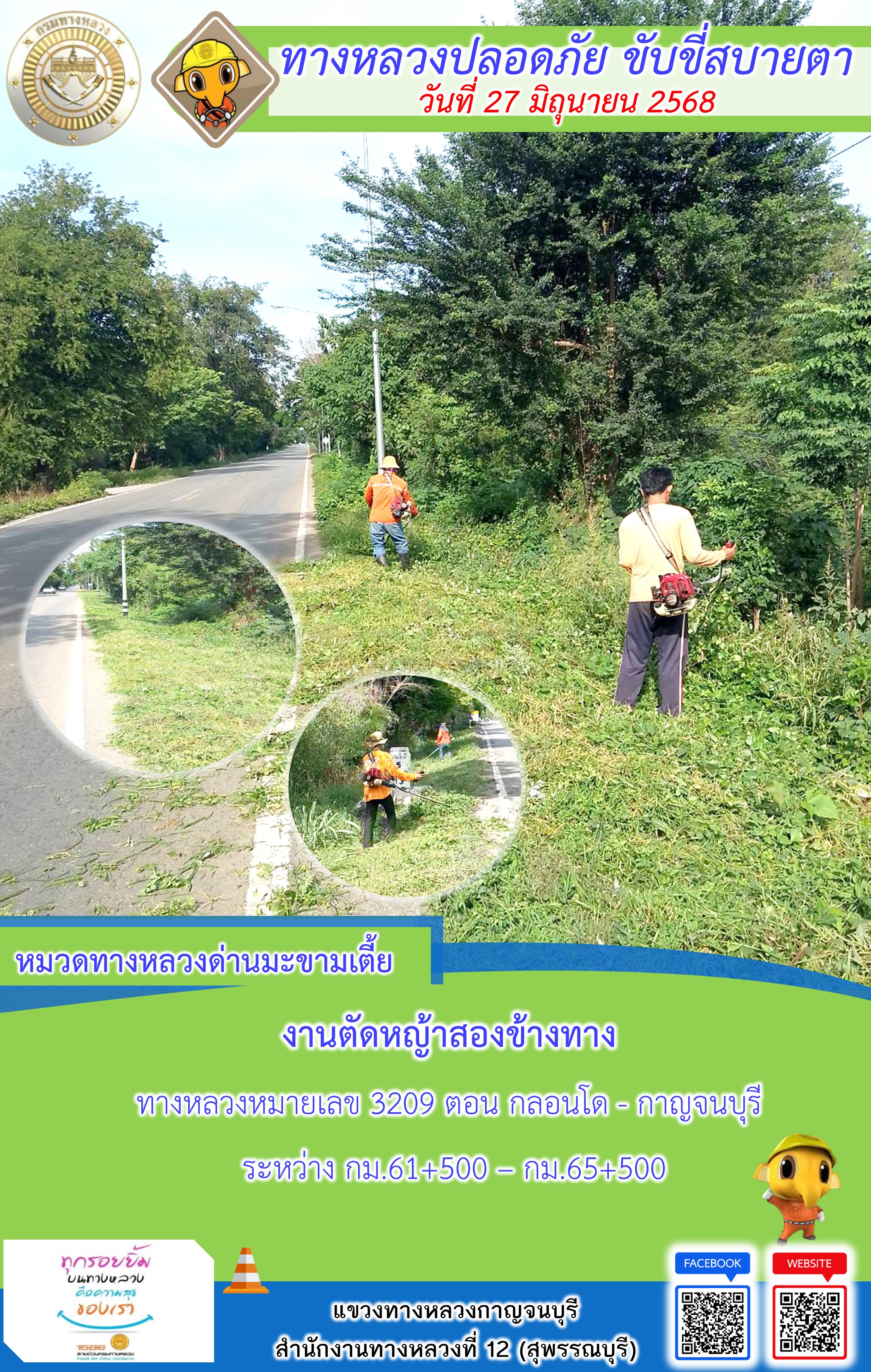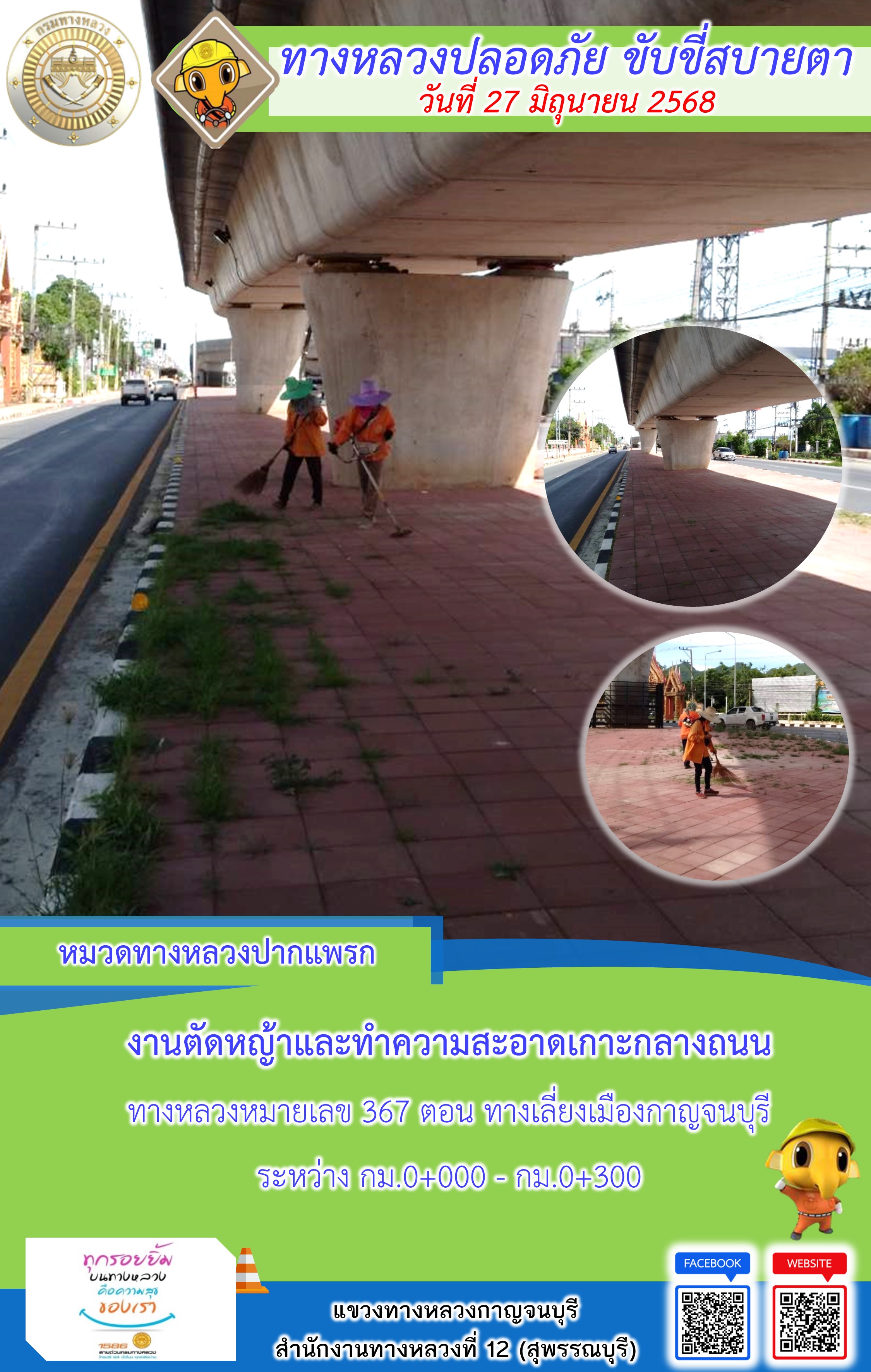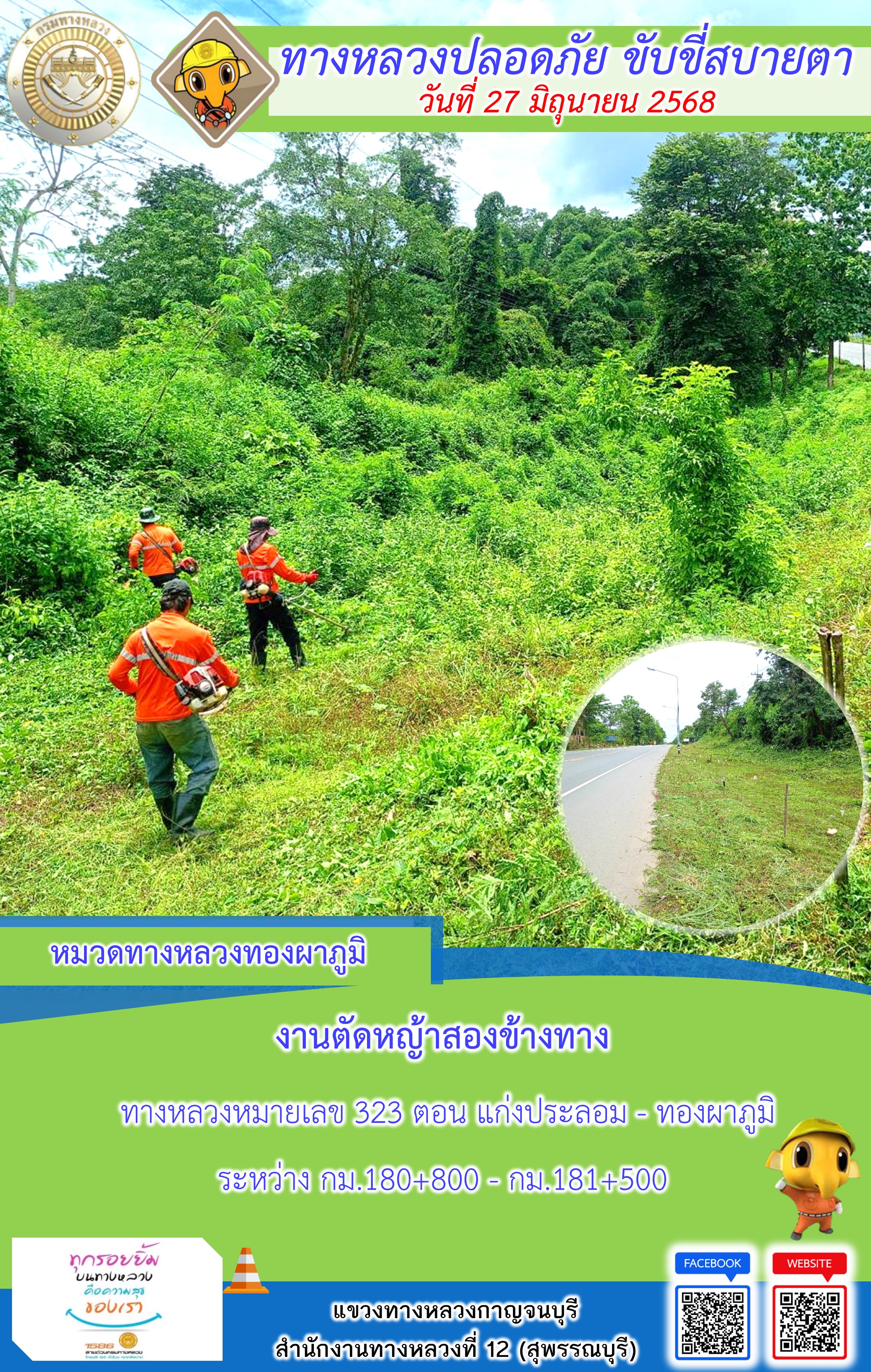 แขวงทางหลวงกาญจนบุรี โดยหมวดทางหลวงในสังกัด และงานอำนวยความปลอดภัยปฏิบัติงาน ประจำวันที่ 27 มิ.ย. 68