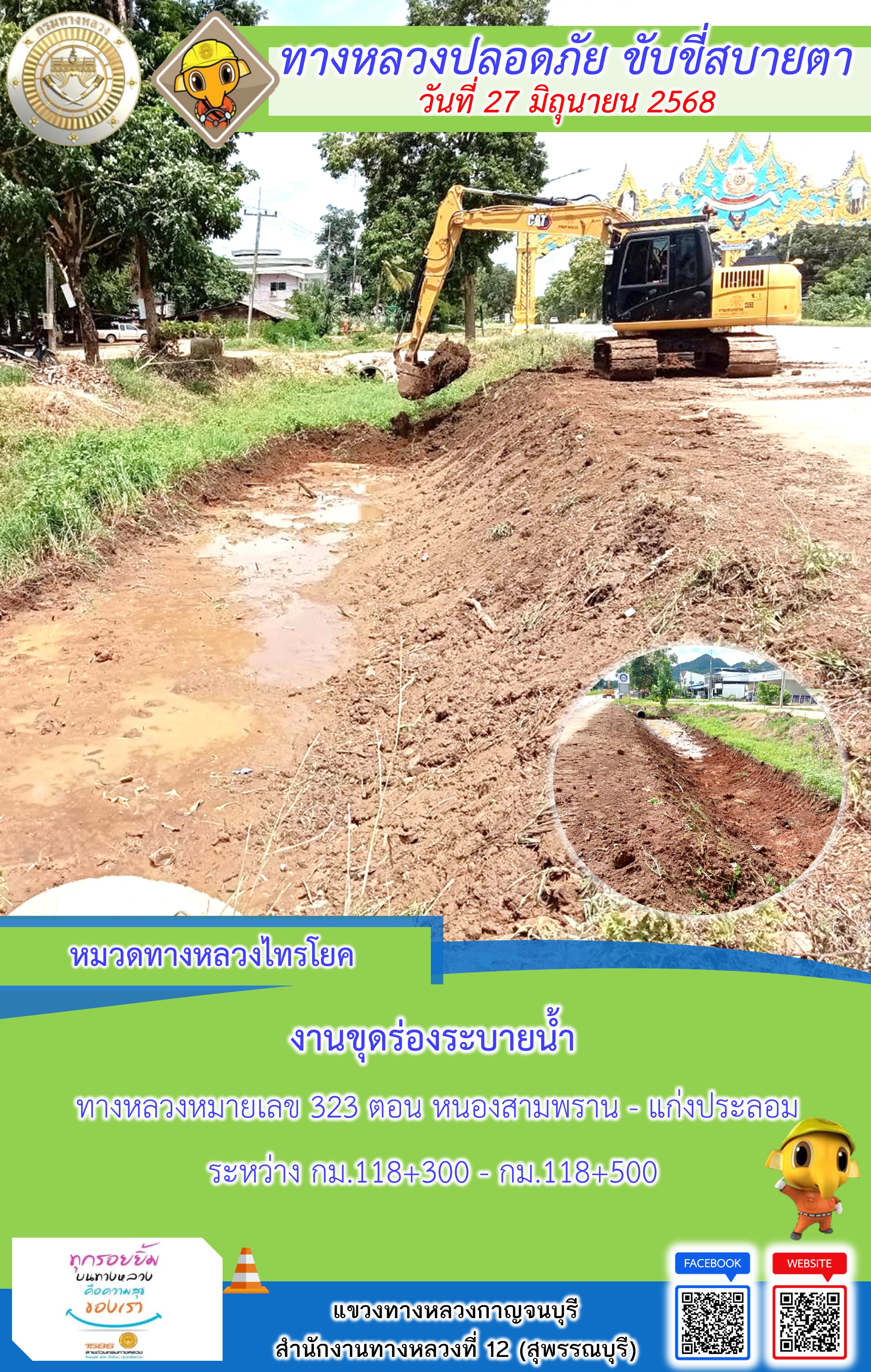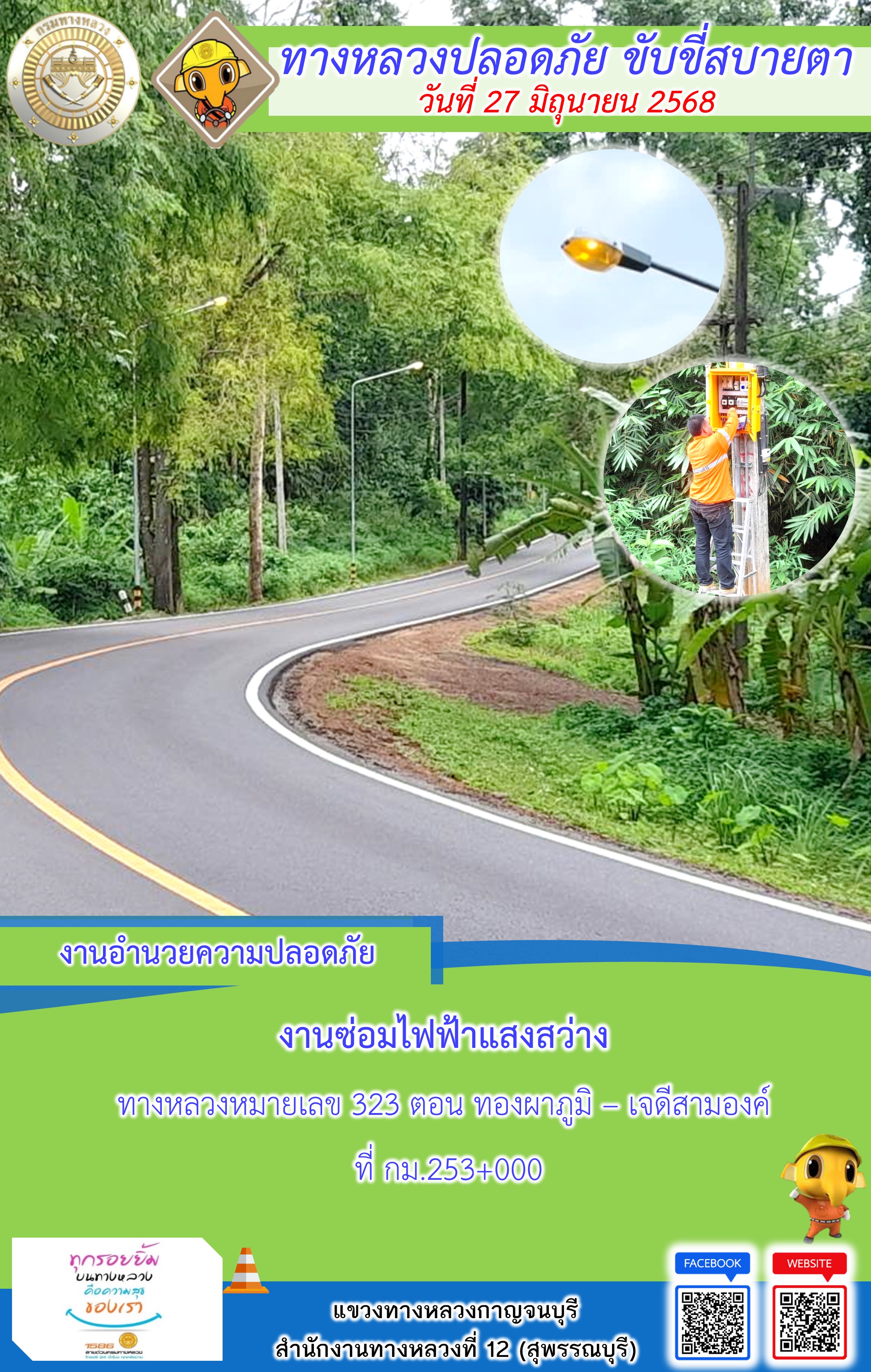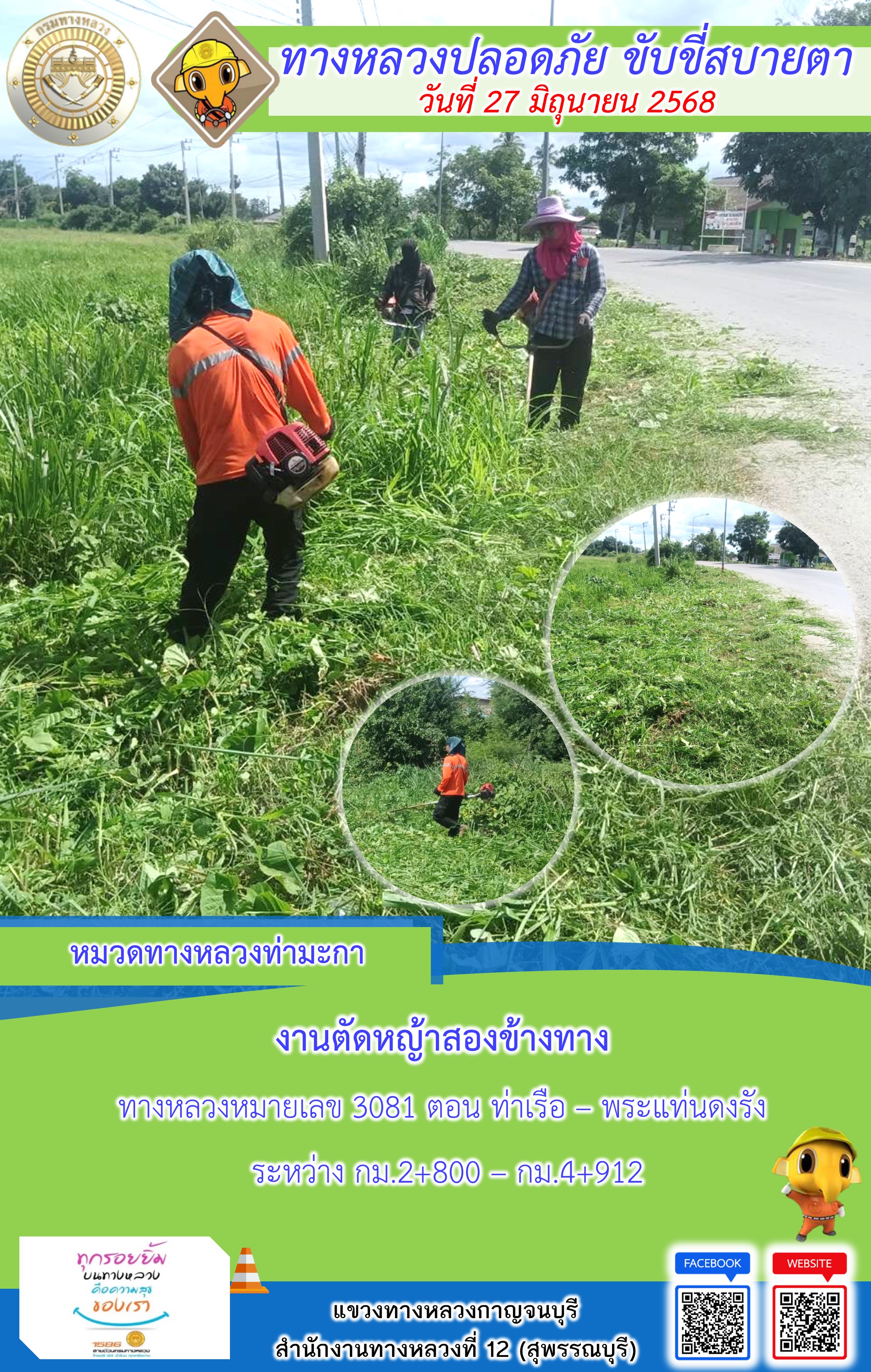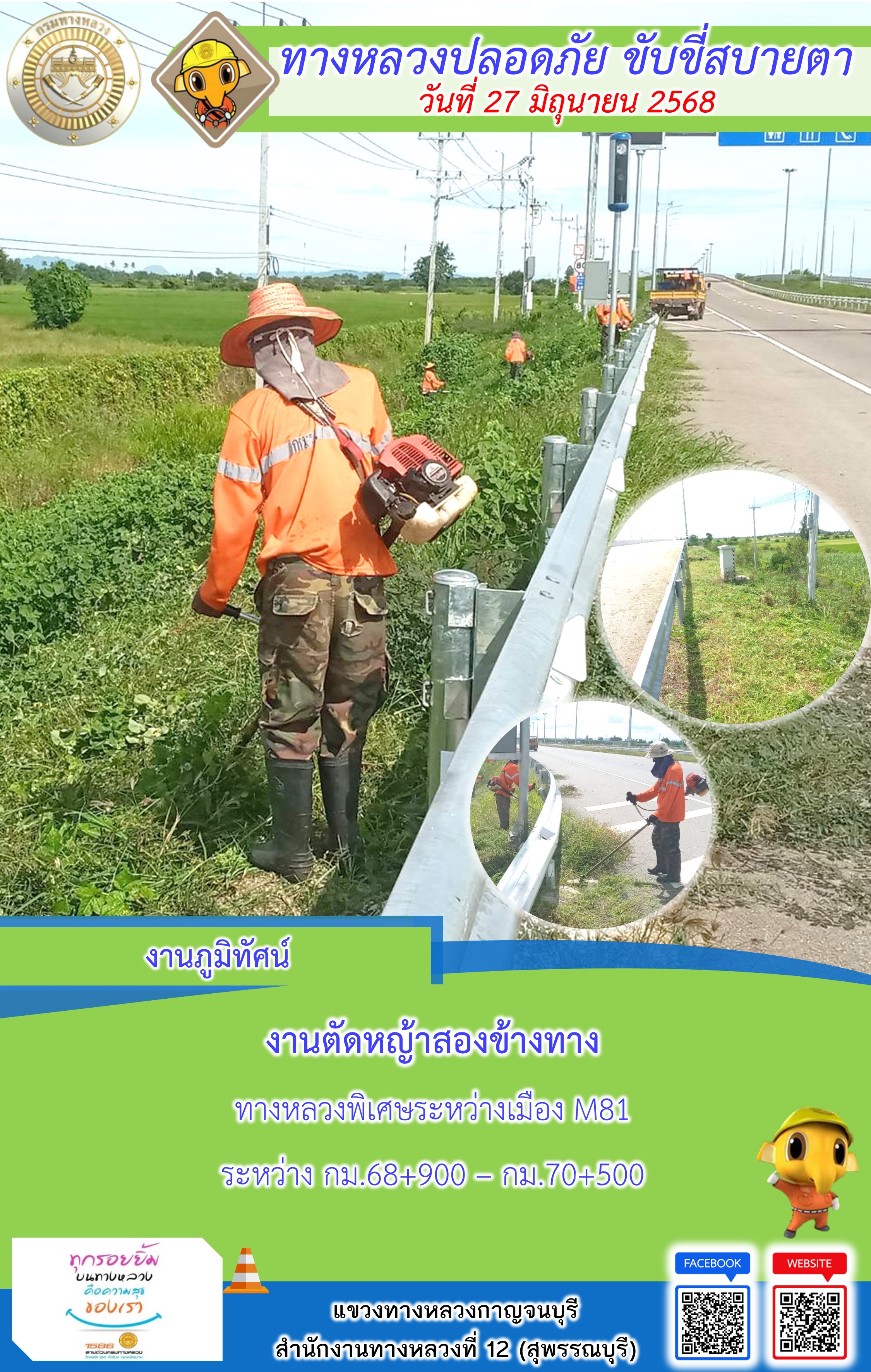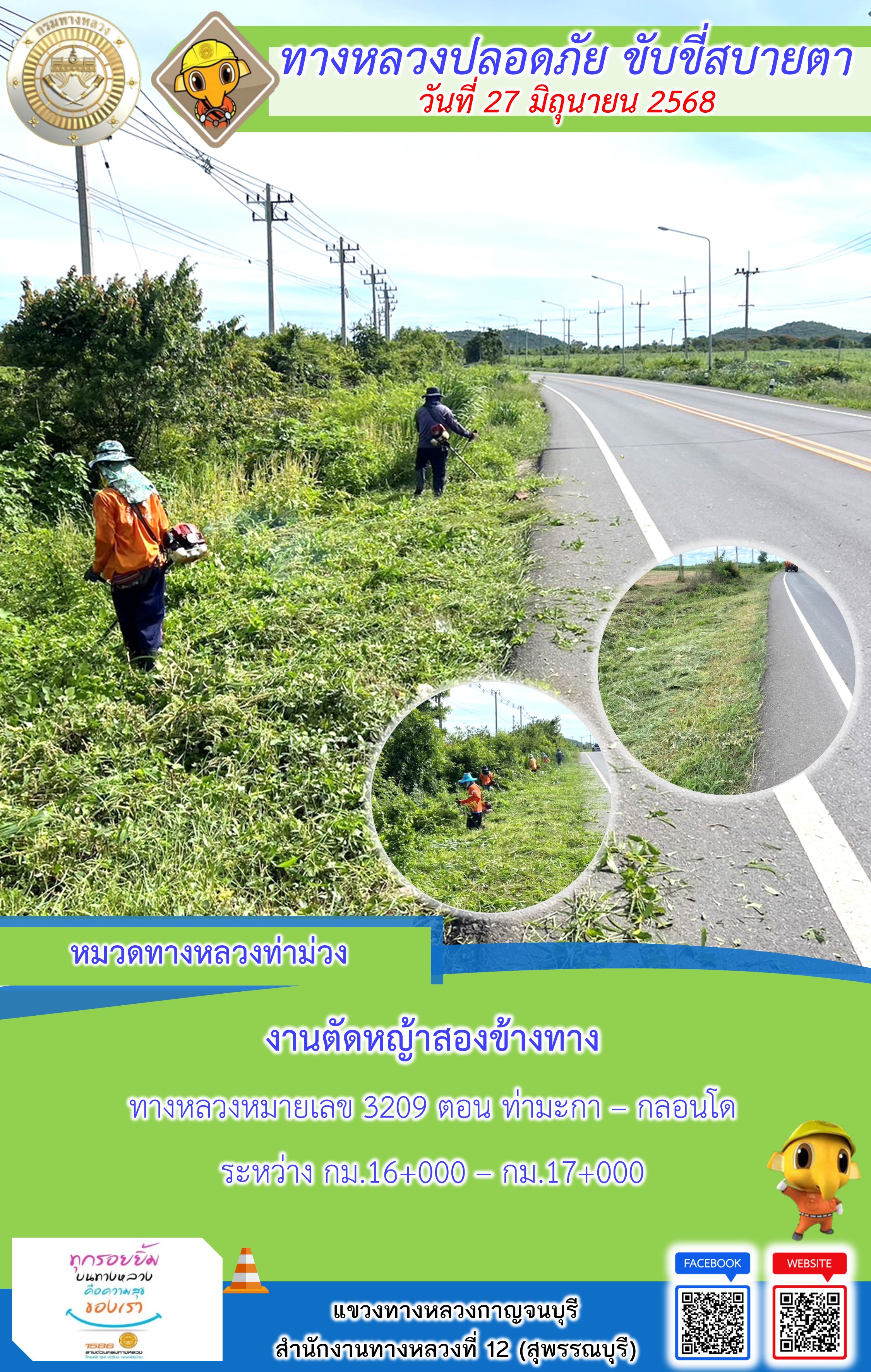 แขวงทางหลวงกาญจนบุรี โดยหมวดทางหลวงในสังกัด และงานอำนวยความปลอดภัยปฏิบัติงาน ประจำวันที่ 27 มิ.ย. 68