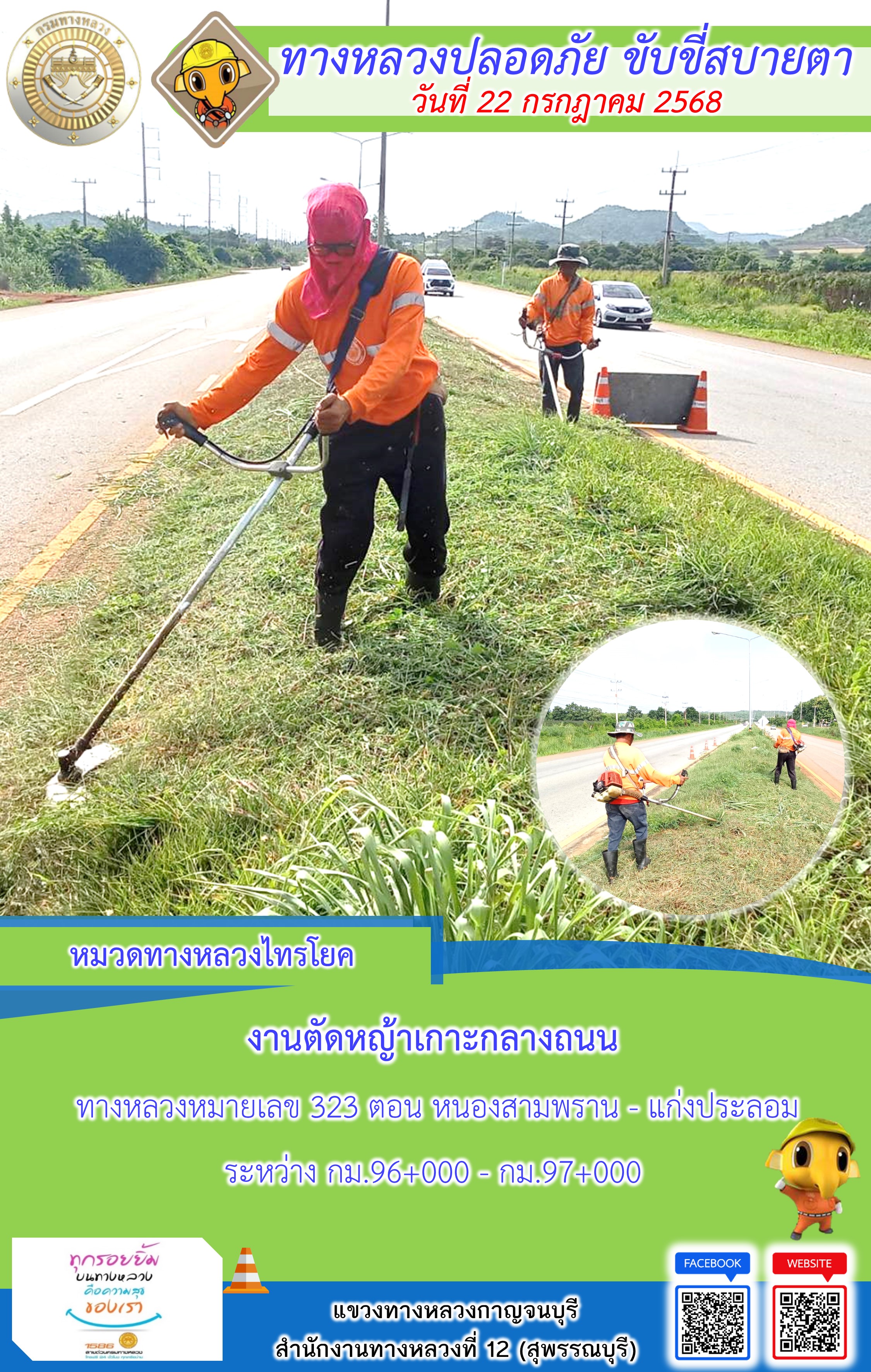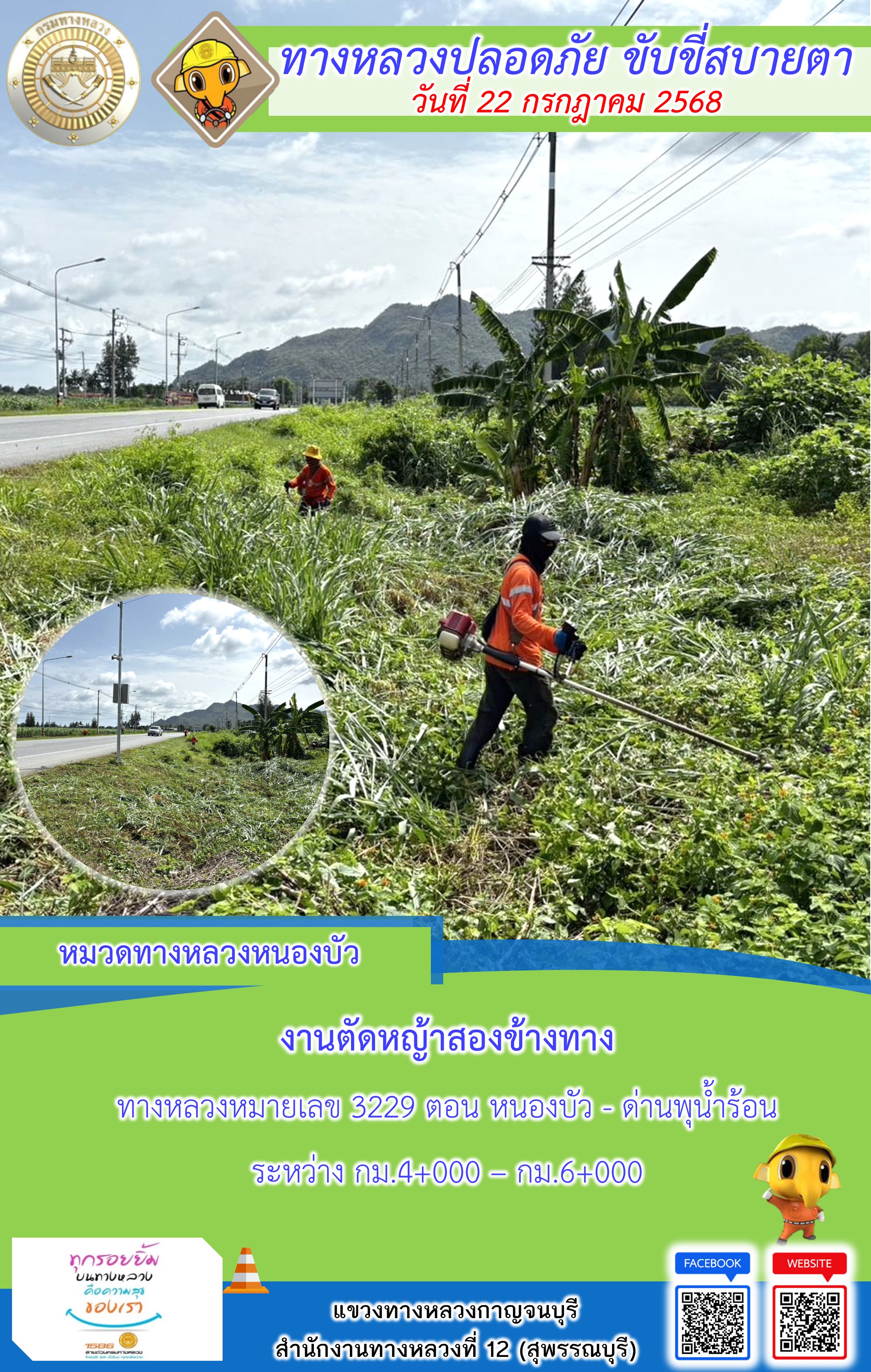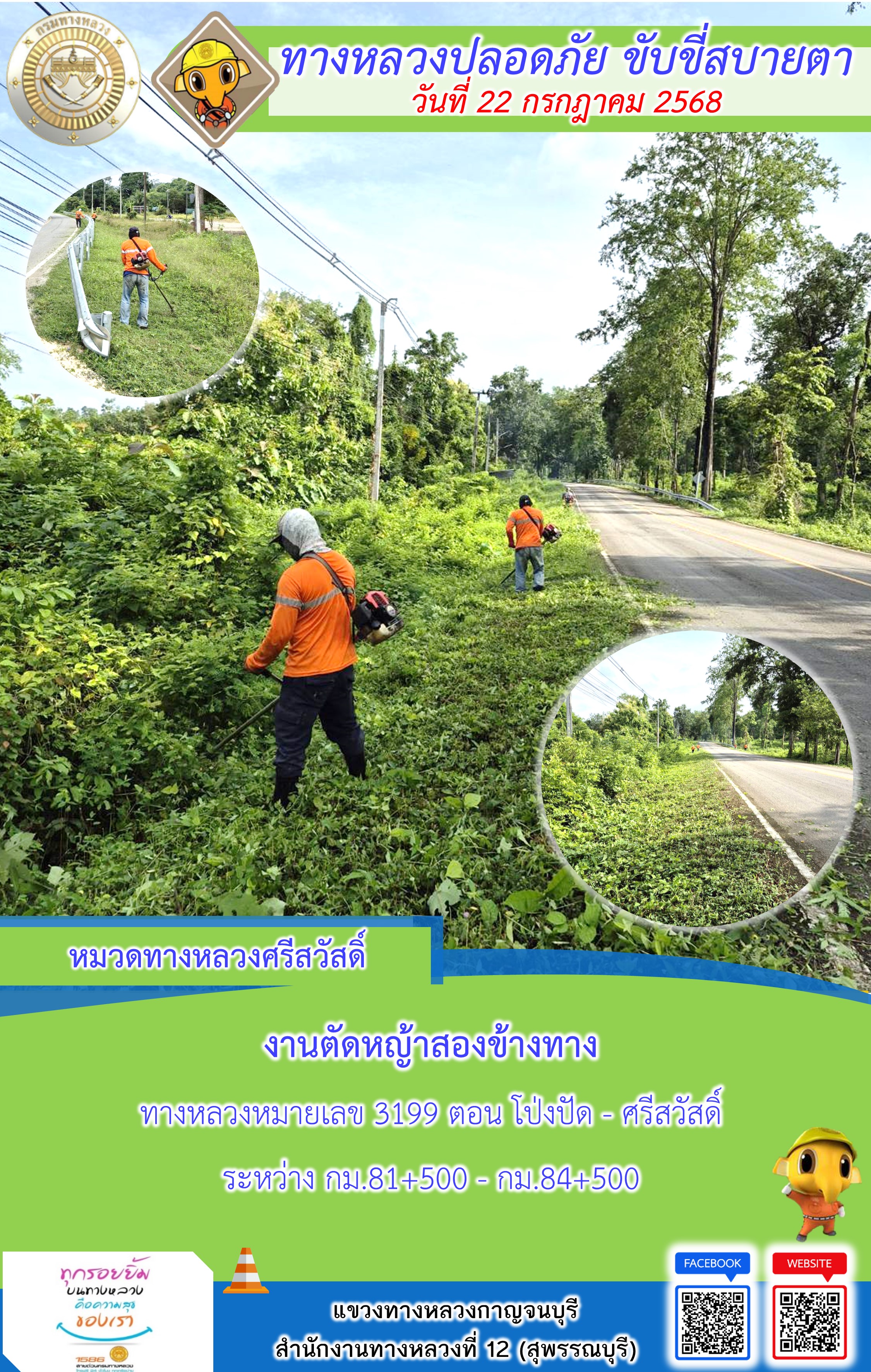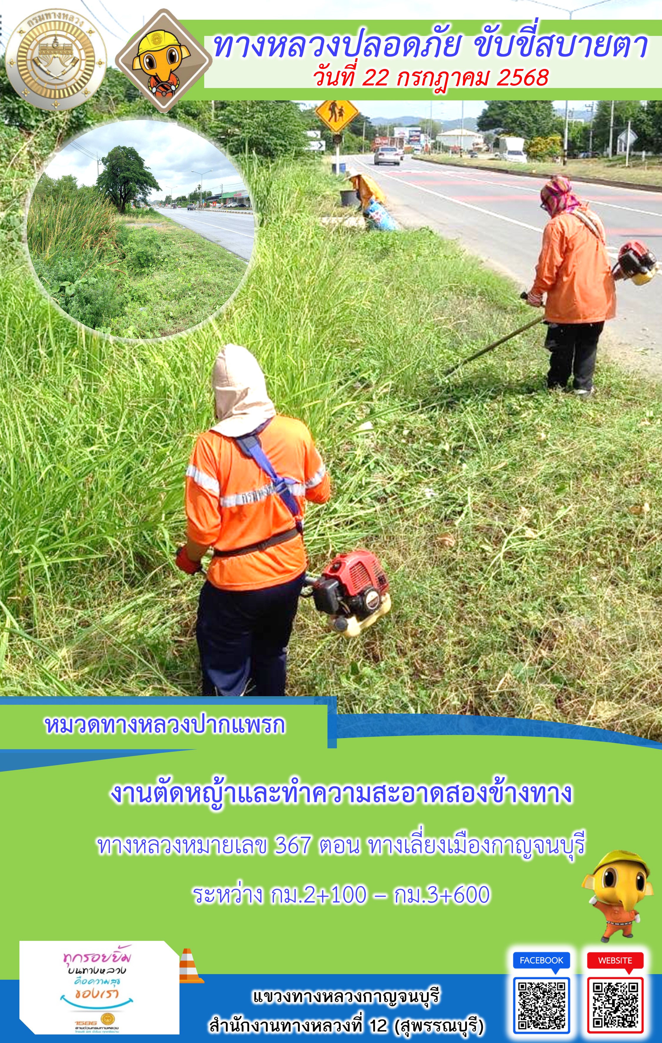 ข้อมูลภาพกิจกรรม : แขวงทางหลวงกาญจนบุรี โดยหมวดทางหลวงในสังกัด และงานอำนวยความปลอดภัยปฏิบัติงาน ประจำวันที่ 22 ก.ค. 68