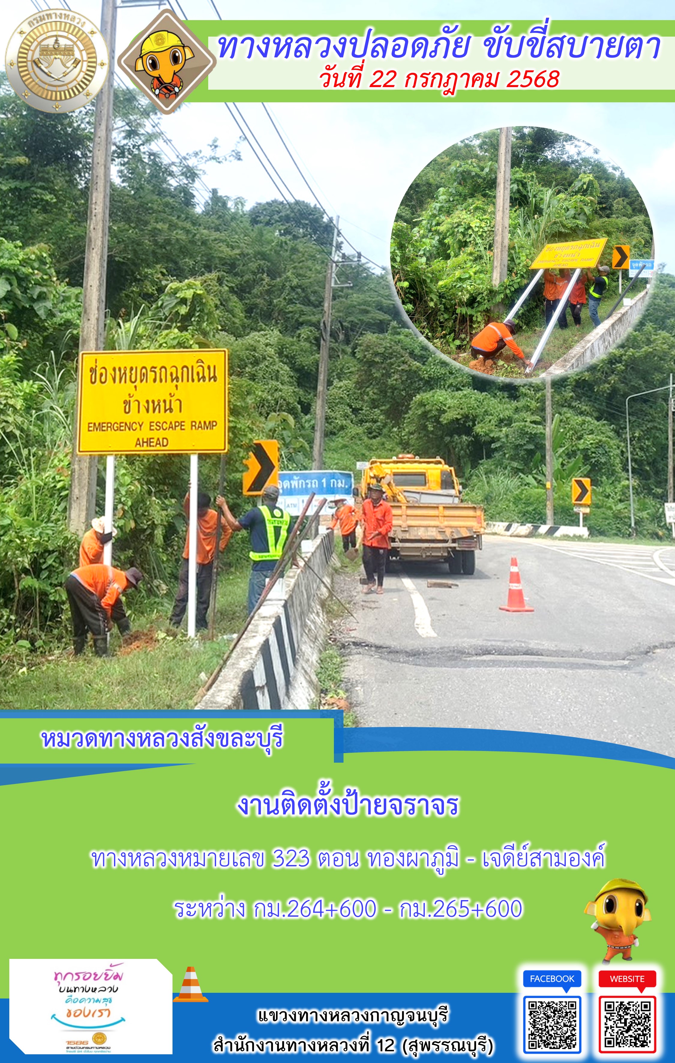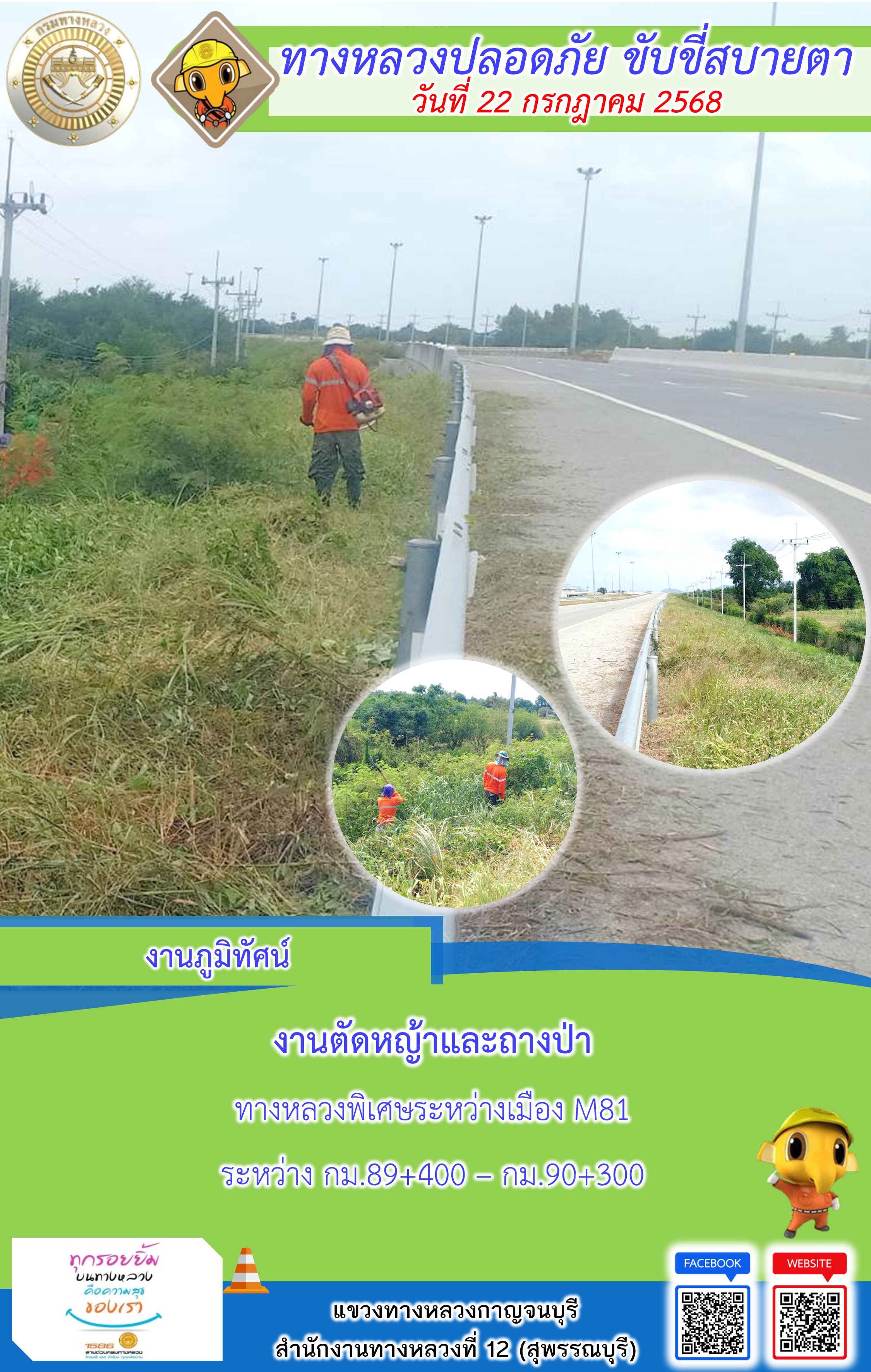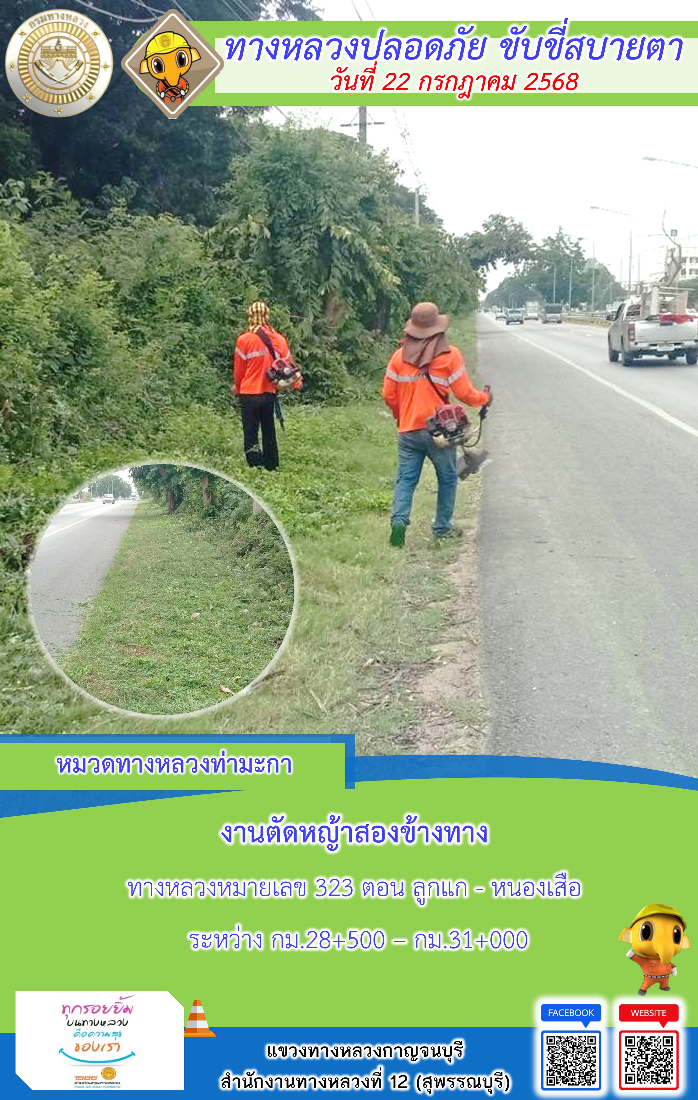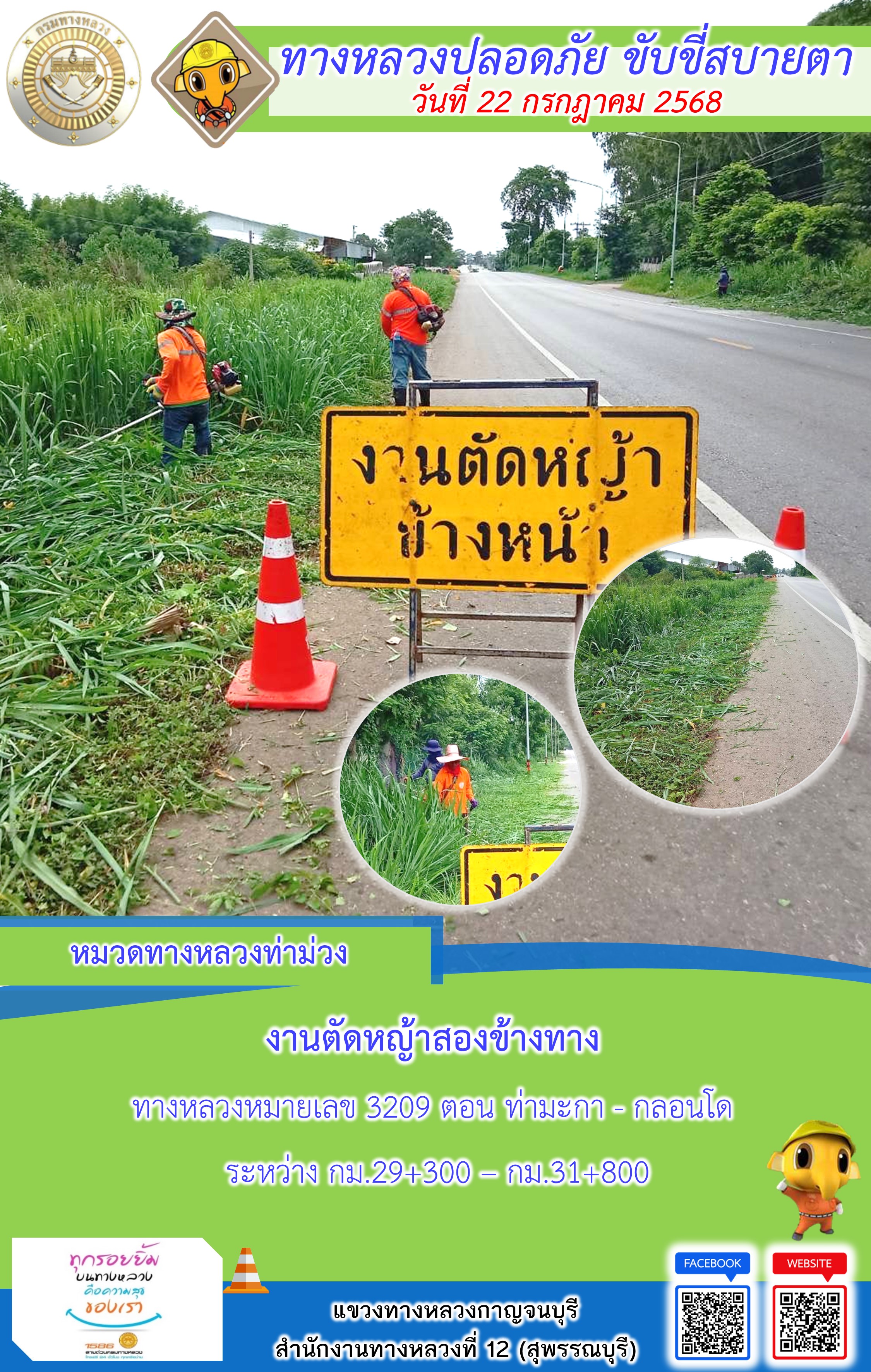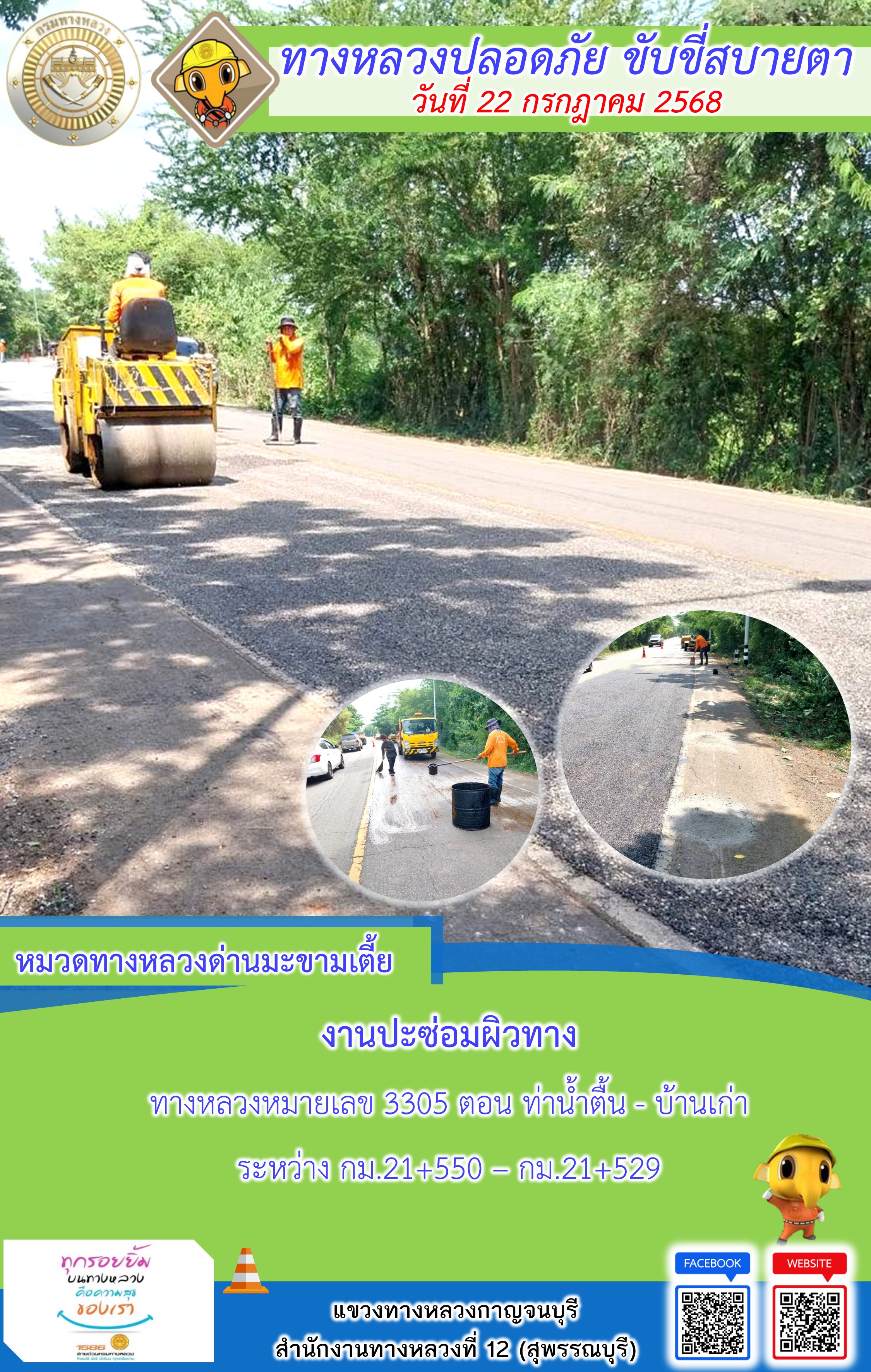 ข้อมูลภาพกิจกรรม : แขวงทางหลวงกาญจนบุรี โดยหมวดทางหลวงในสังกัด และงานอำนวยความปลอดภัยปฏิบัติงาน ประจำวันที่ 22 ก.ค. 68