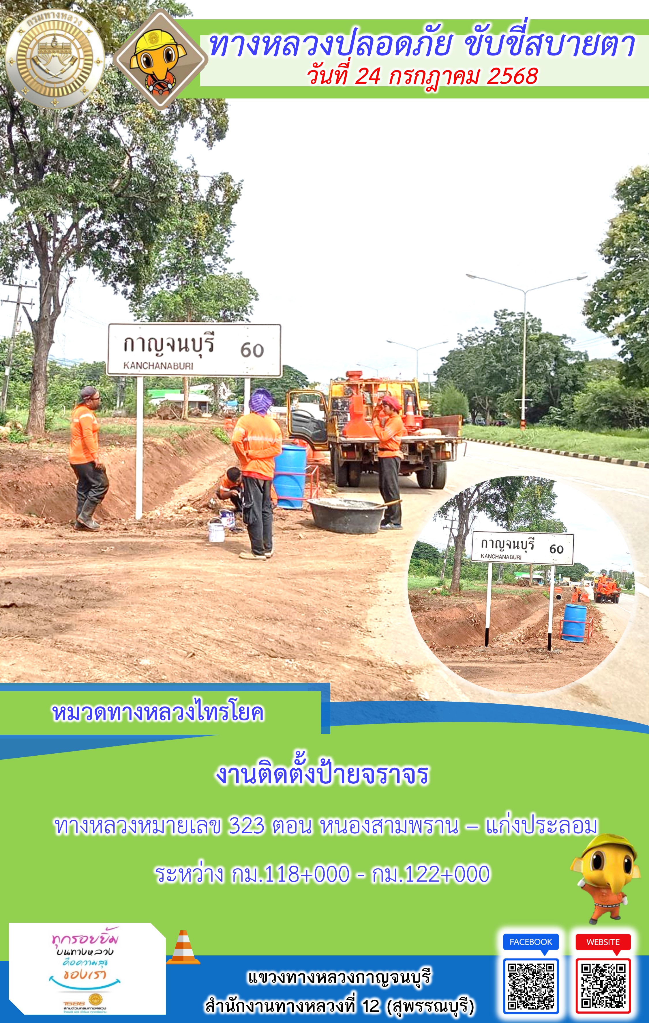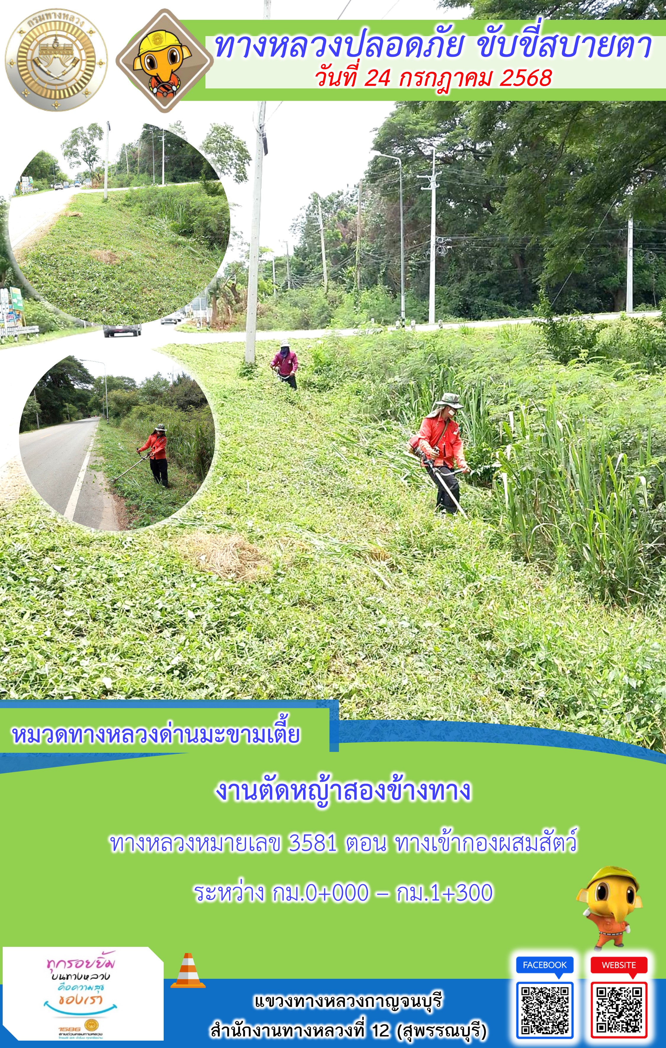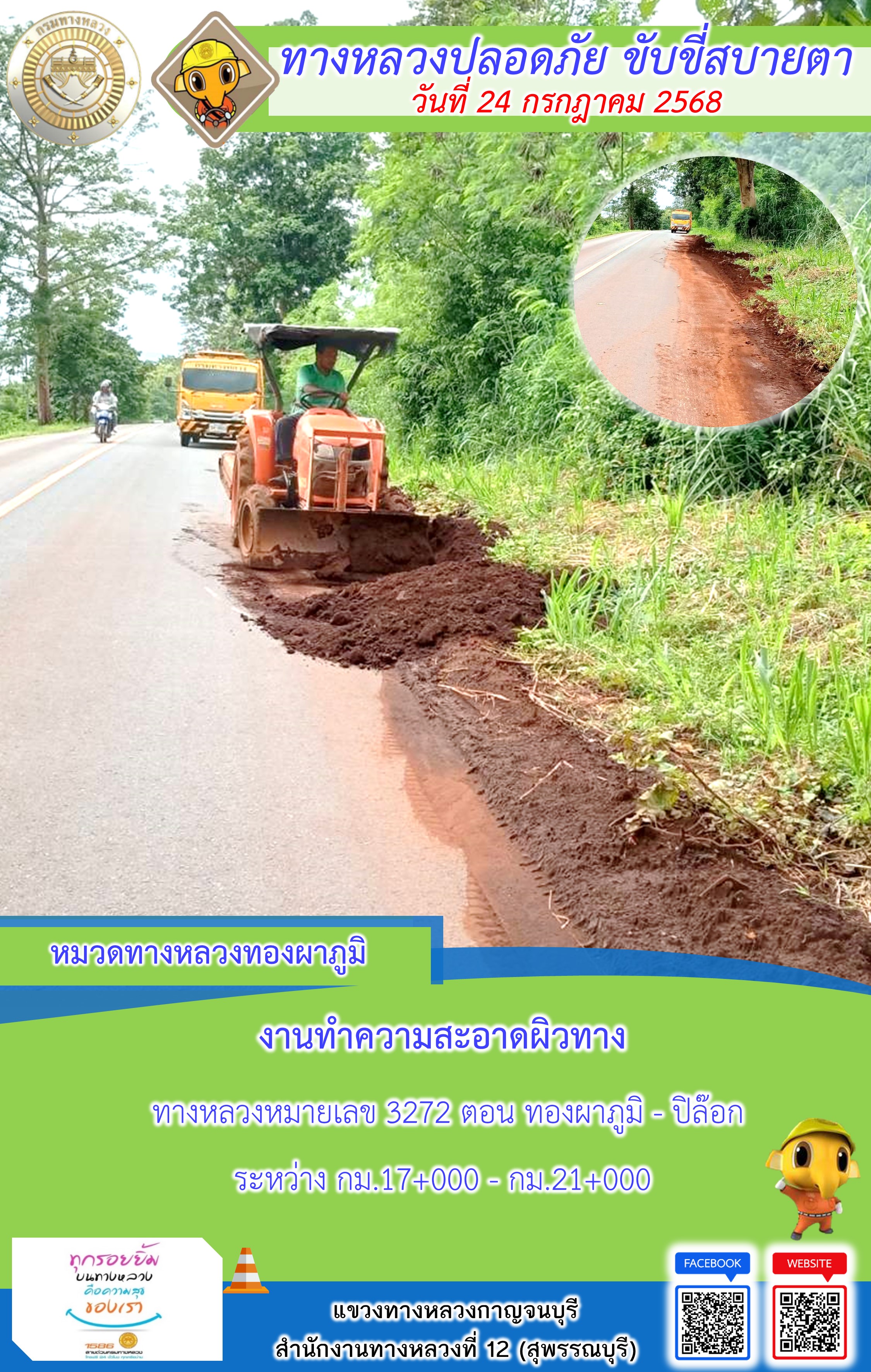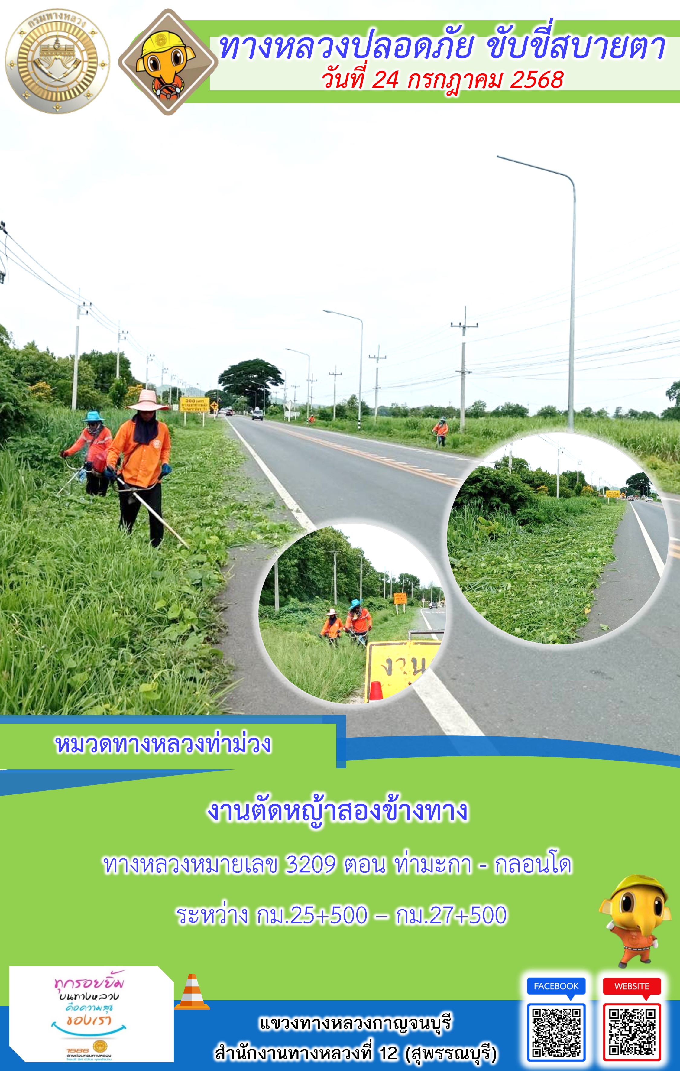 แขวงทางหลวงกาญจนบุรี โดยหมวดทางหลวงในสังกัด และงานอำนวยความปลอดภัยปฏิบัติงาน ประจำวันที่ 24 ก.ค. 68