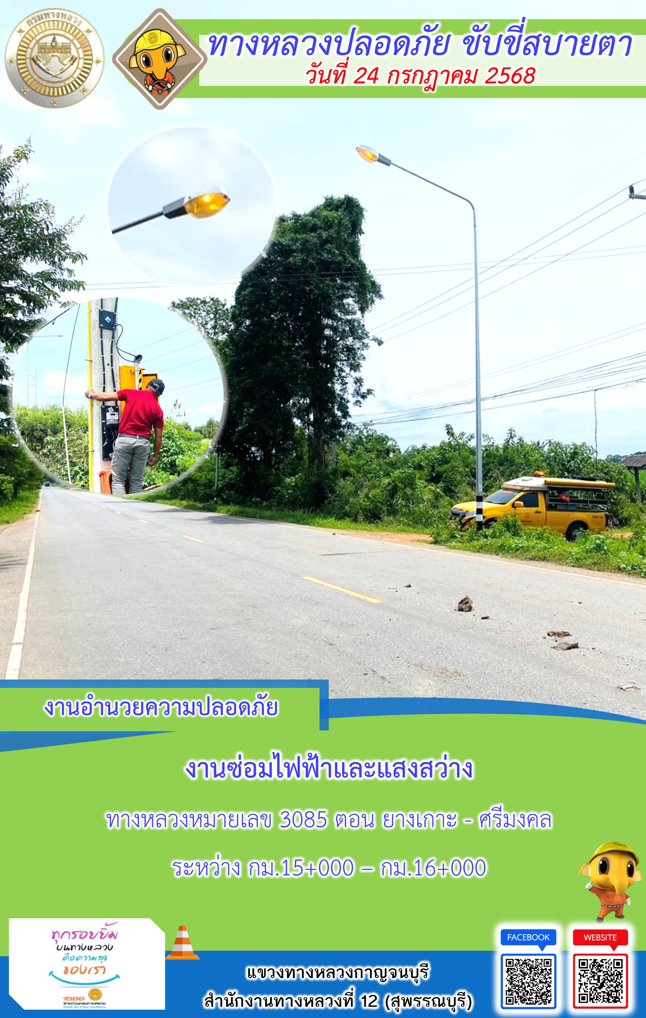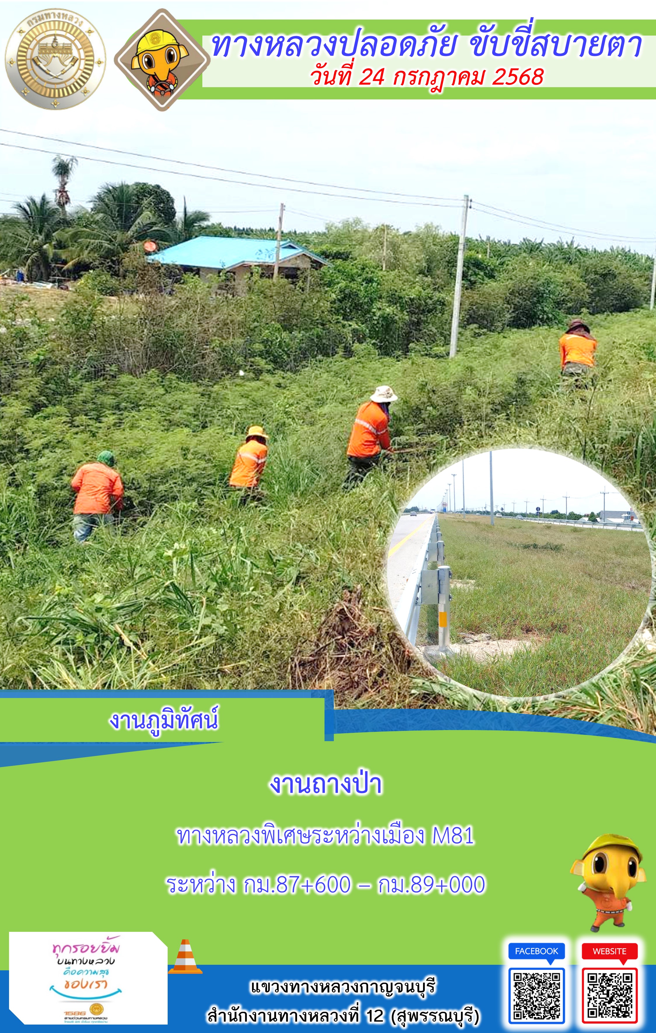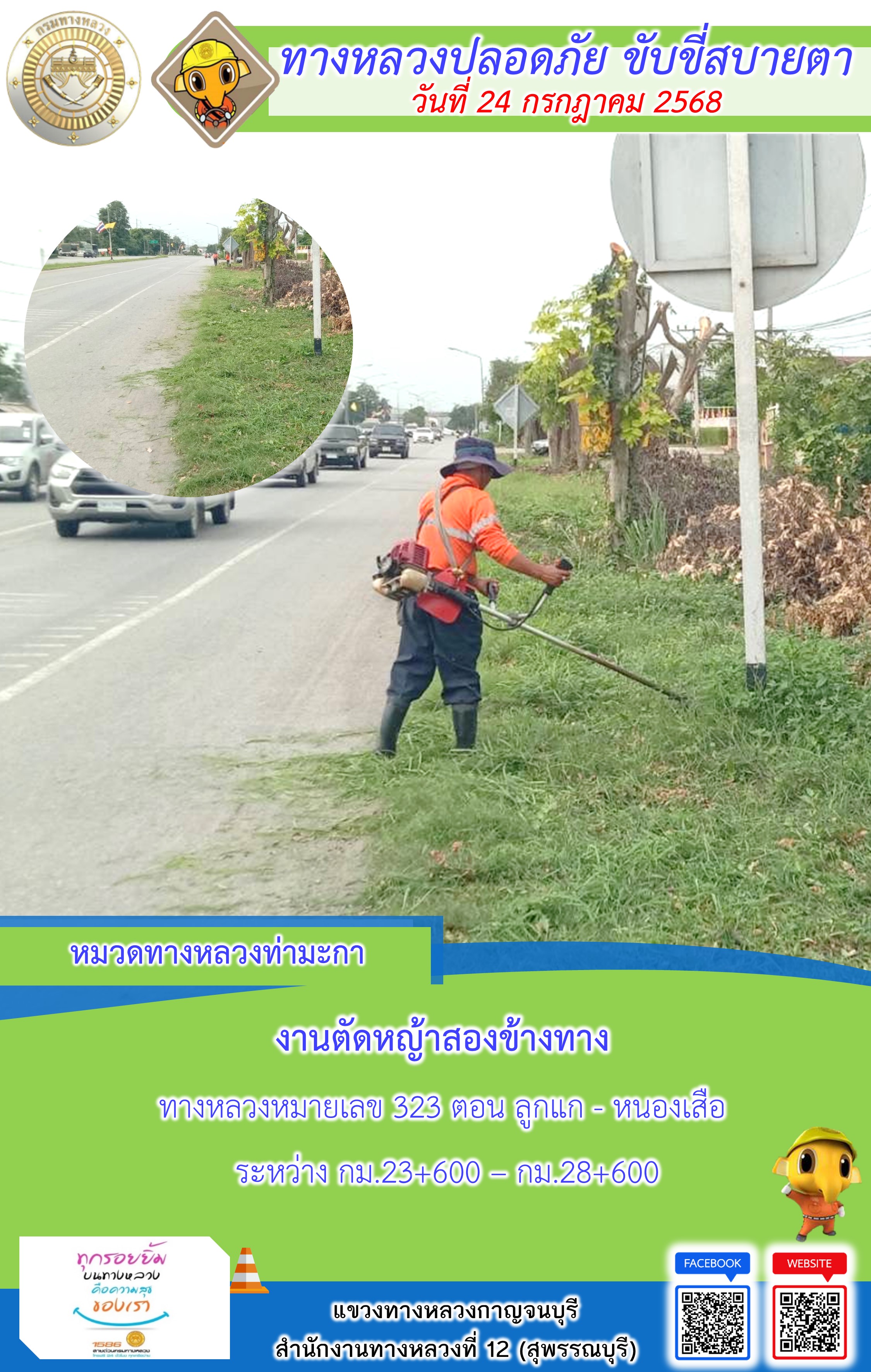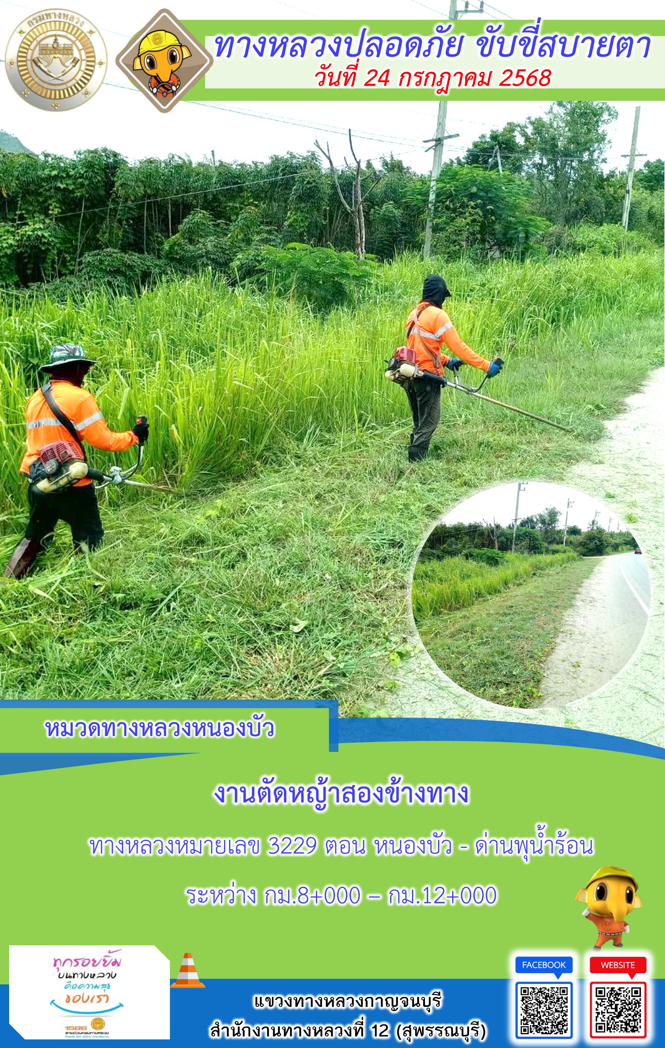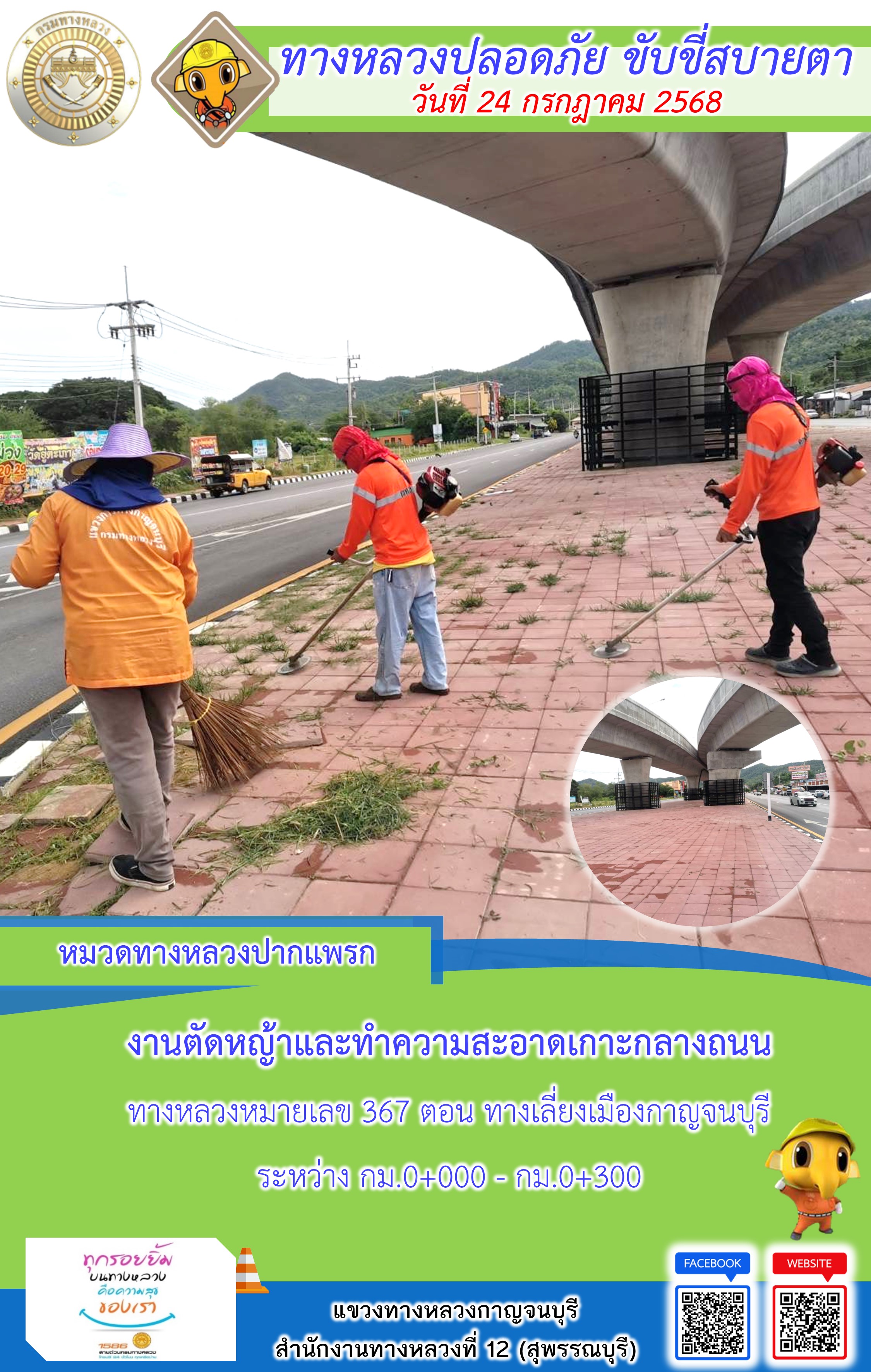 ข้อมูลภาพกิจกรรม : แขวงทางหลวงกาญจนบุรี โดยหมวดทางหลวงในสังกัด และงานอำนวยความปลอดภัยปฏิบัติงาน ประจำวันที่ 24 ก.ค. 68