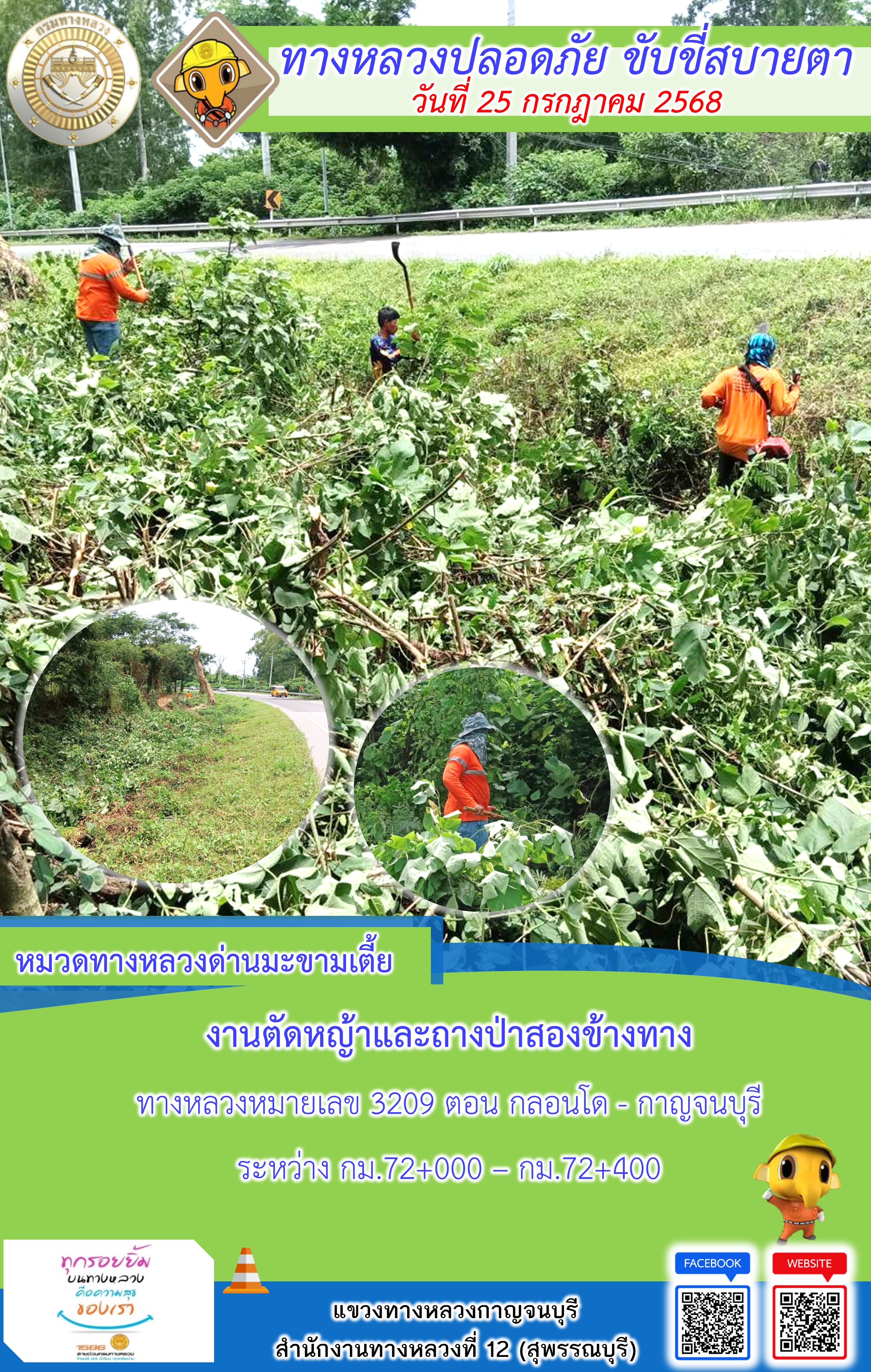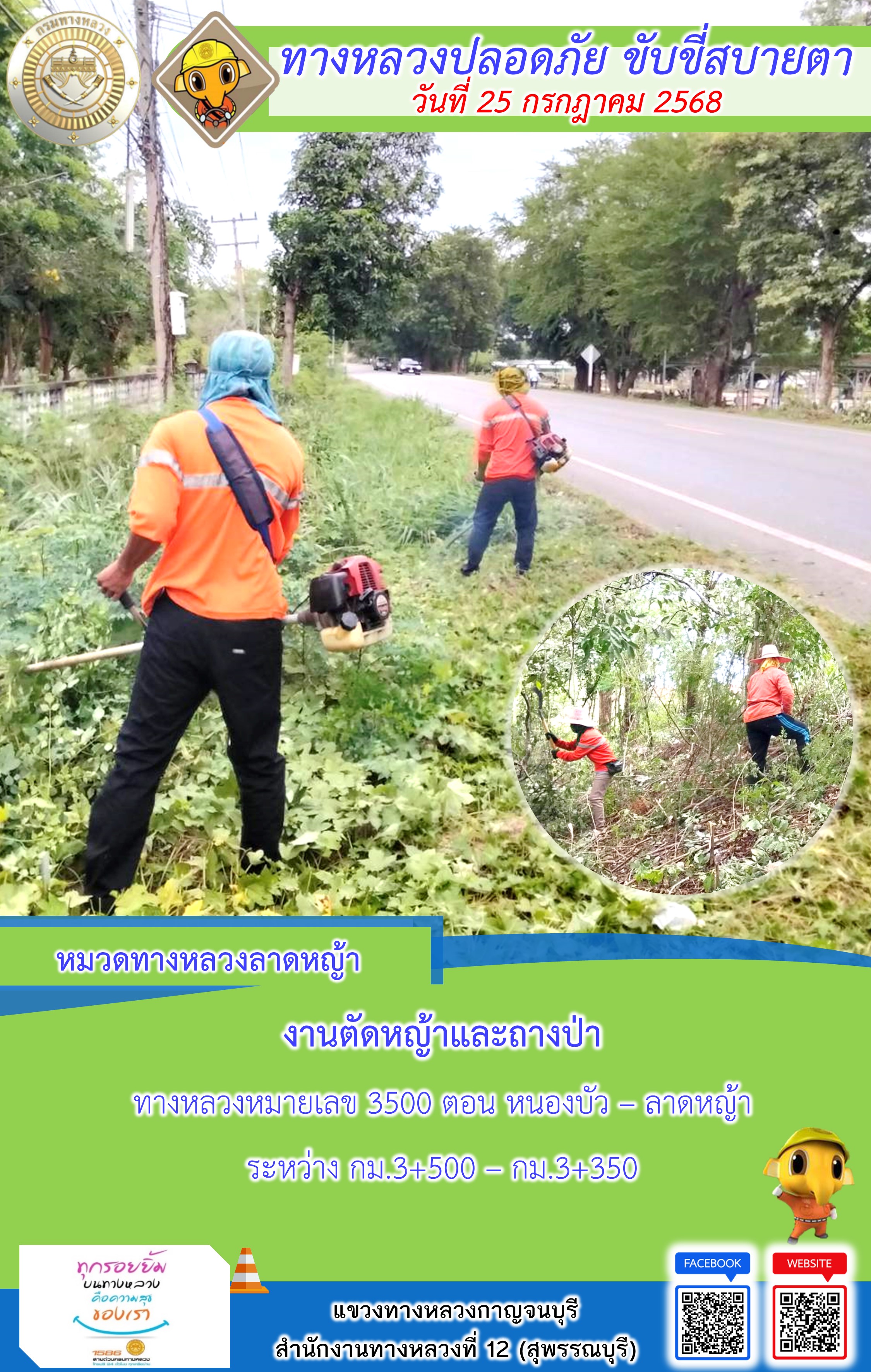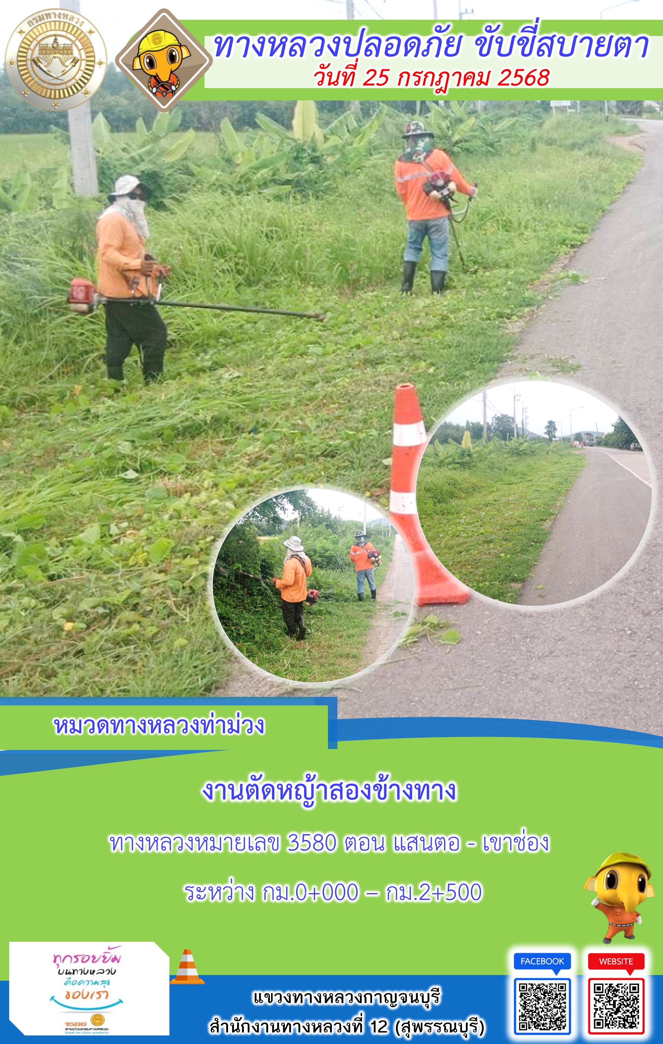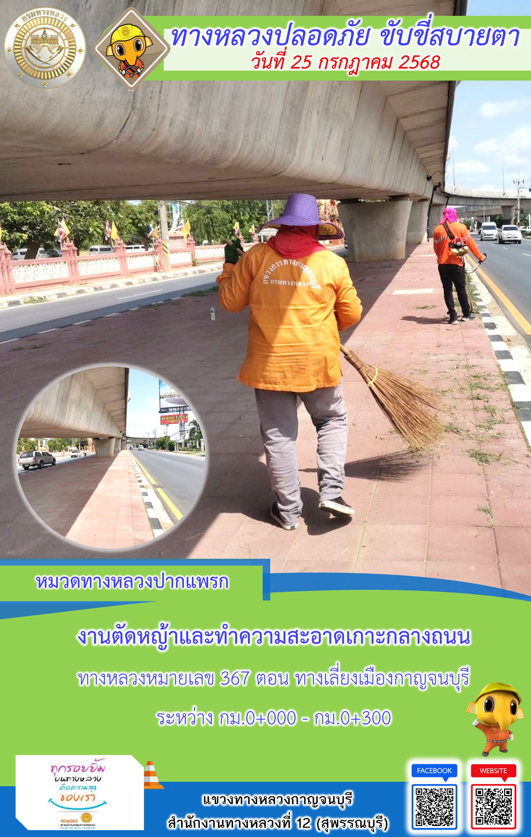ข้อมูลภาพกิจกรรม : แขวงทางหลวงกาญจนบุรี โดยหมวดทางหลวงในสังกัด และงานอำนวยความปลอดภัยปฏิบัติงาน ประจำวันที่ 25 ก.ค. 68