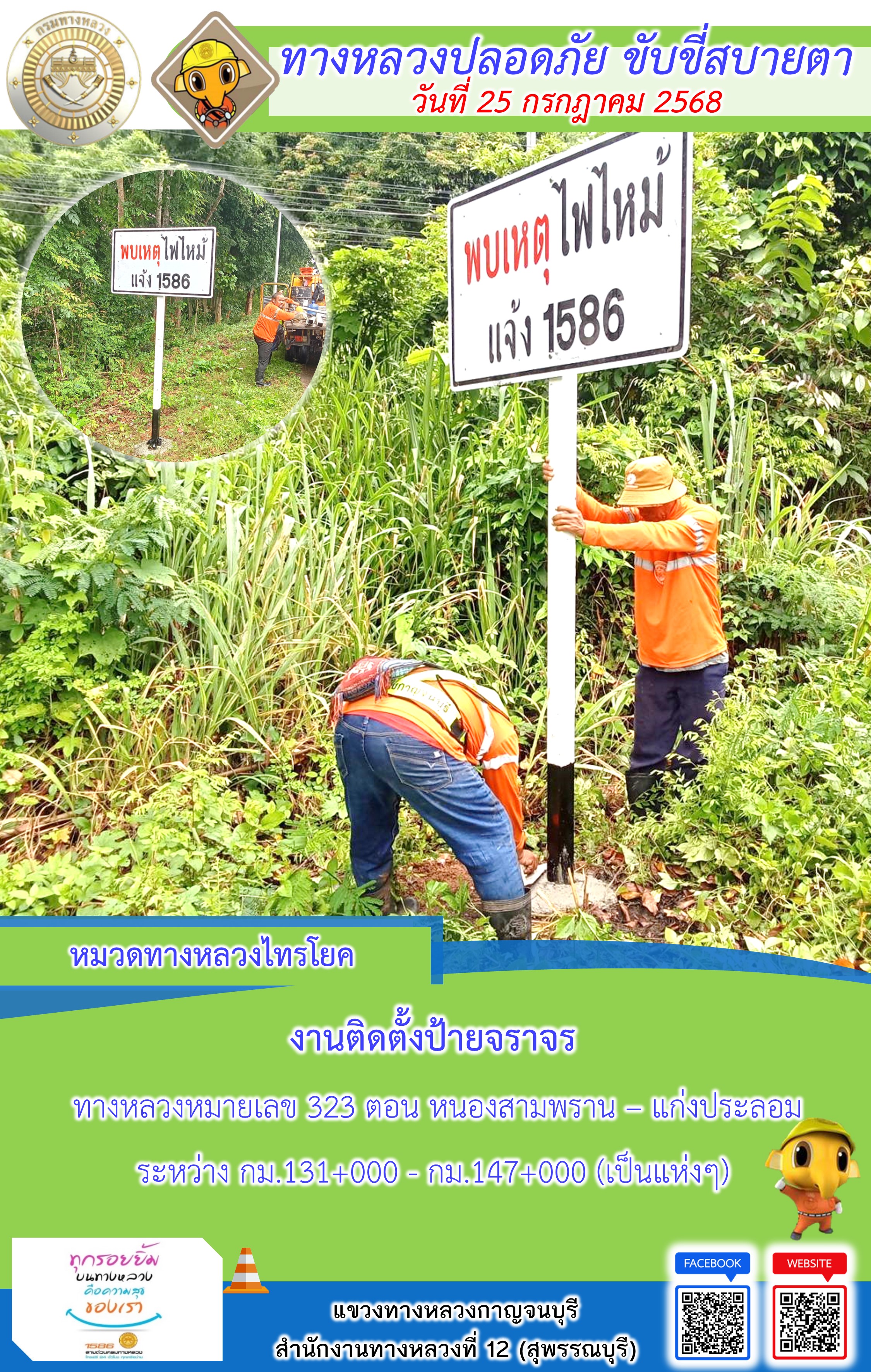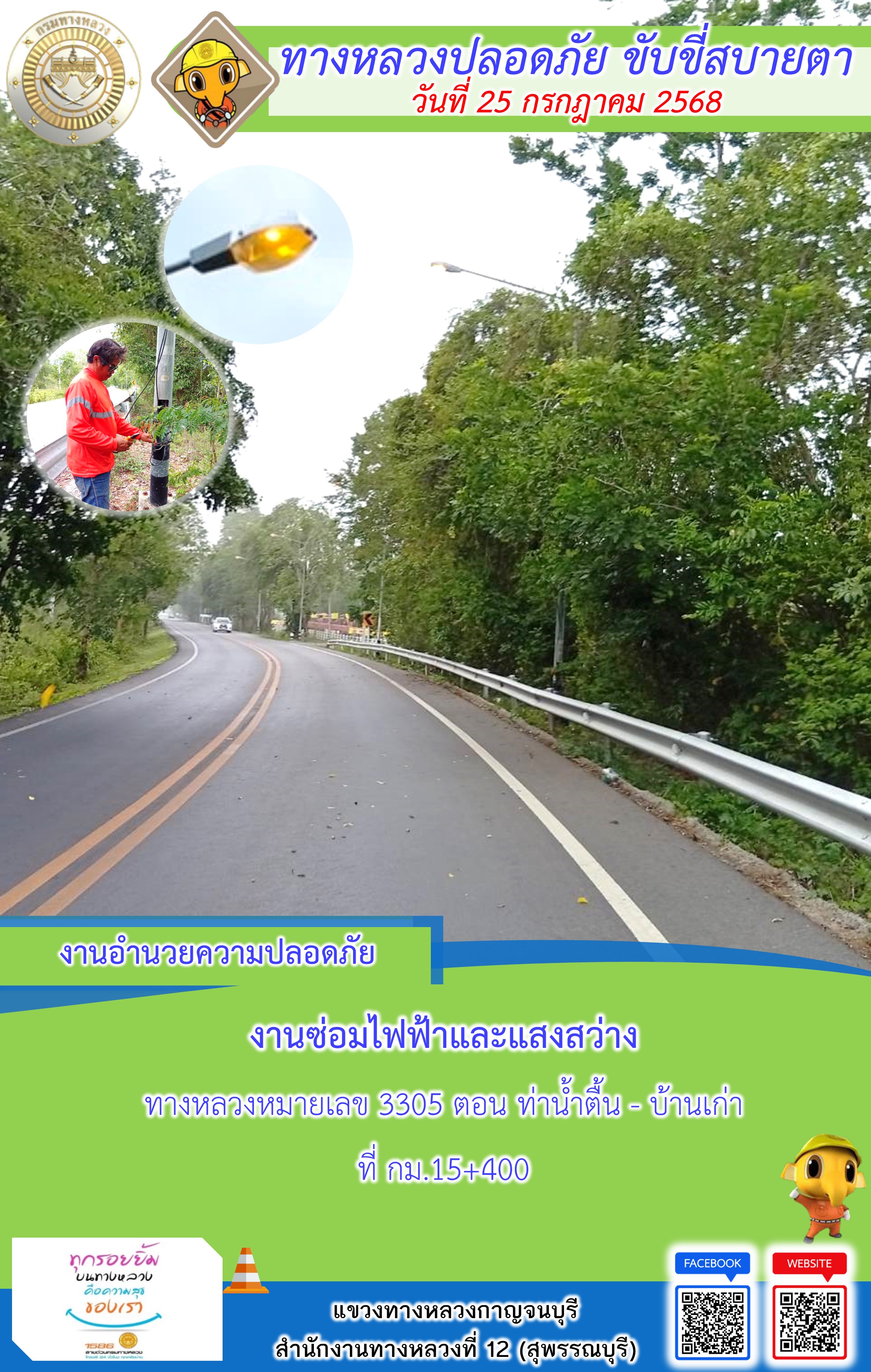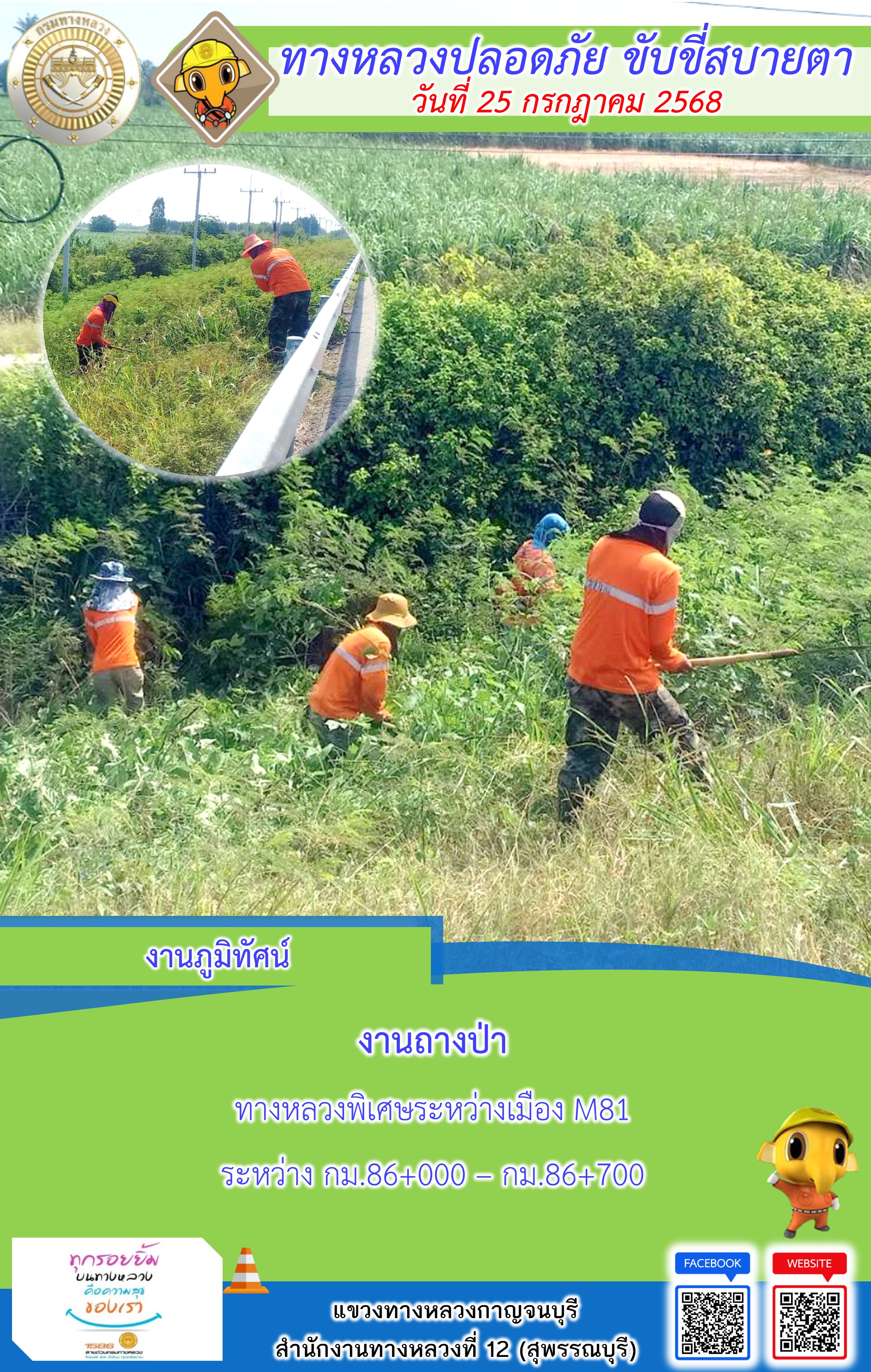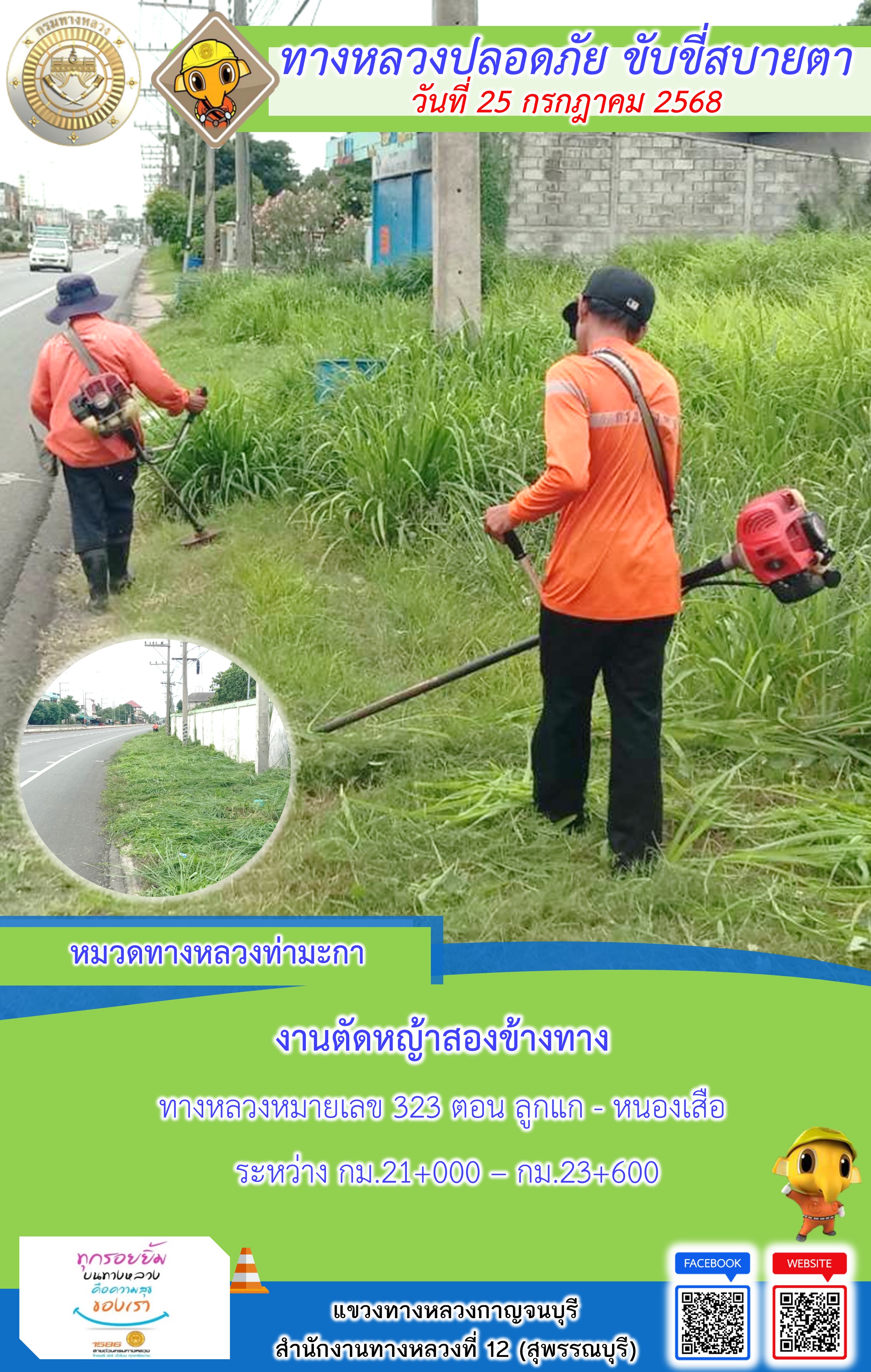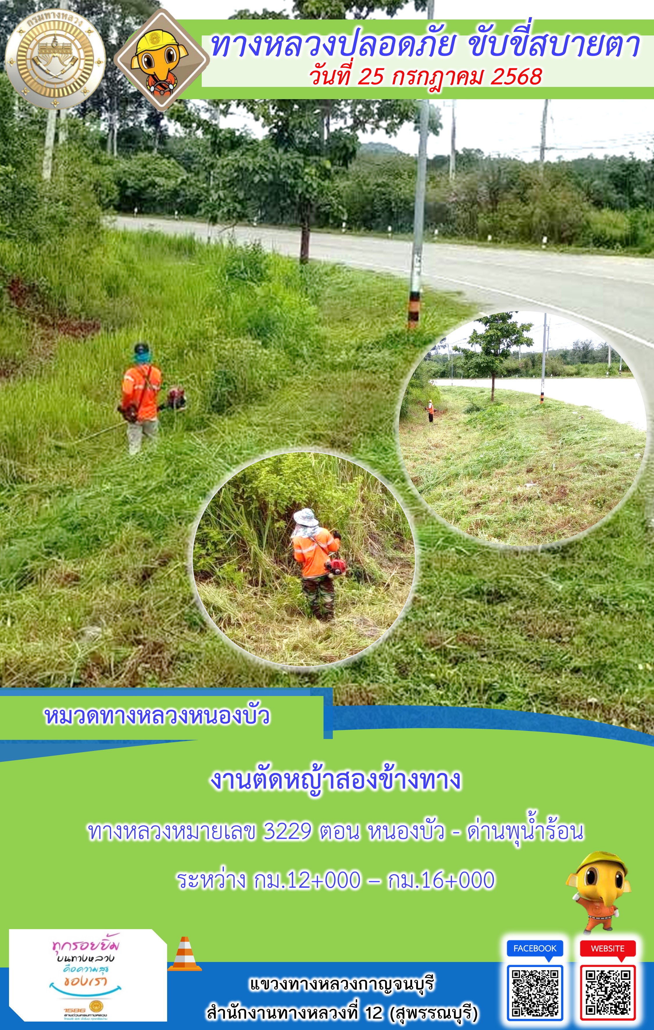 ข้อมูลภาพกิจกรรม : แขวงทางหลวงกาญจนบุรี โดยหมวดทางหลวงในสังกัด และงานอำนวยความปลอดภัยปฏิบัติงาน ประจำวันที่ 25 ก.ค. 68