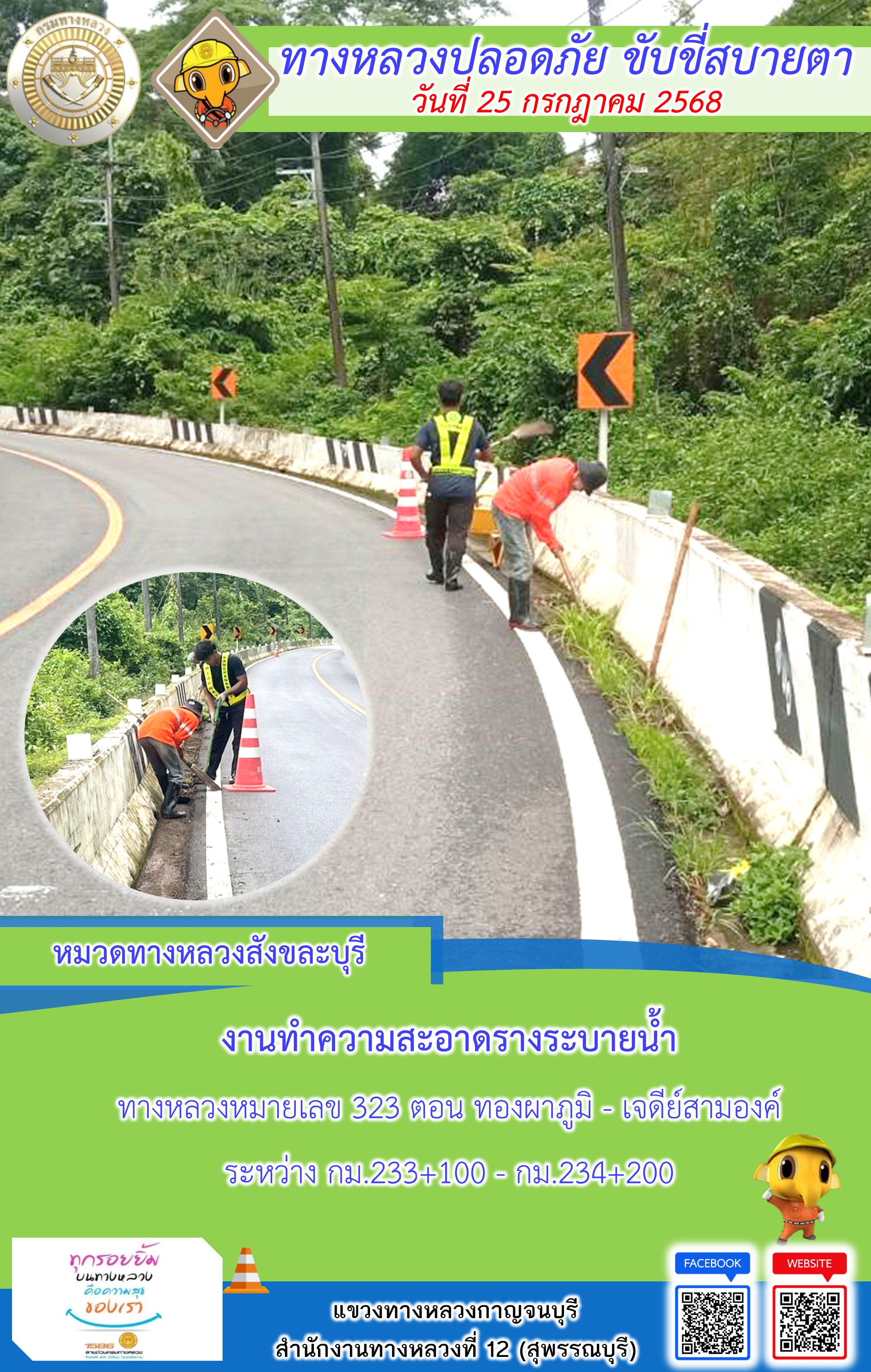 แขวงทางหลวงกาญจนบุรี โดยหมวดทางหลวงในสังกัด และงานอำนวยความปลอดภัยปฏิบัติงาน ประจำวันที่ 25 ก.ค. 68