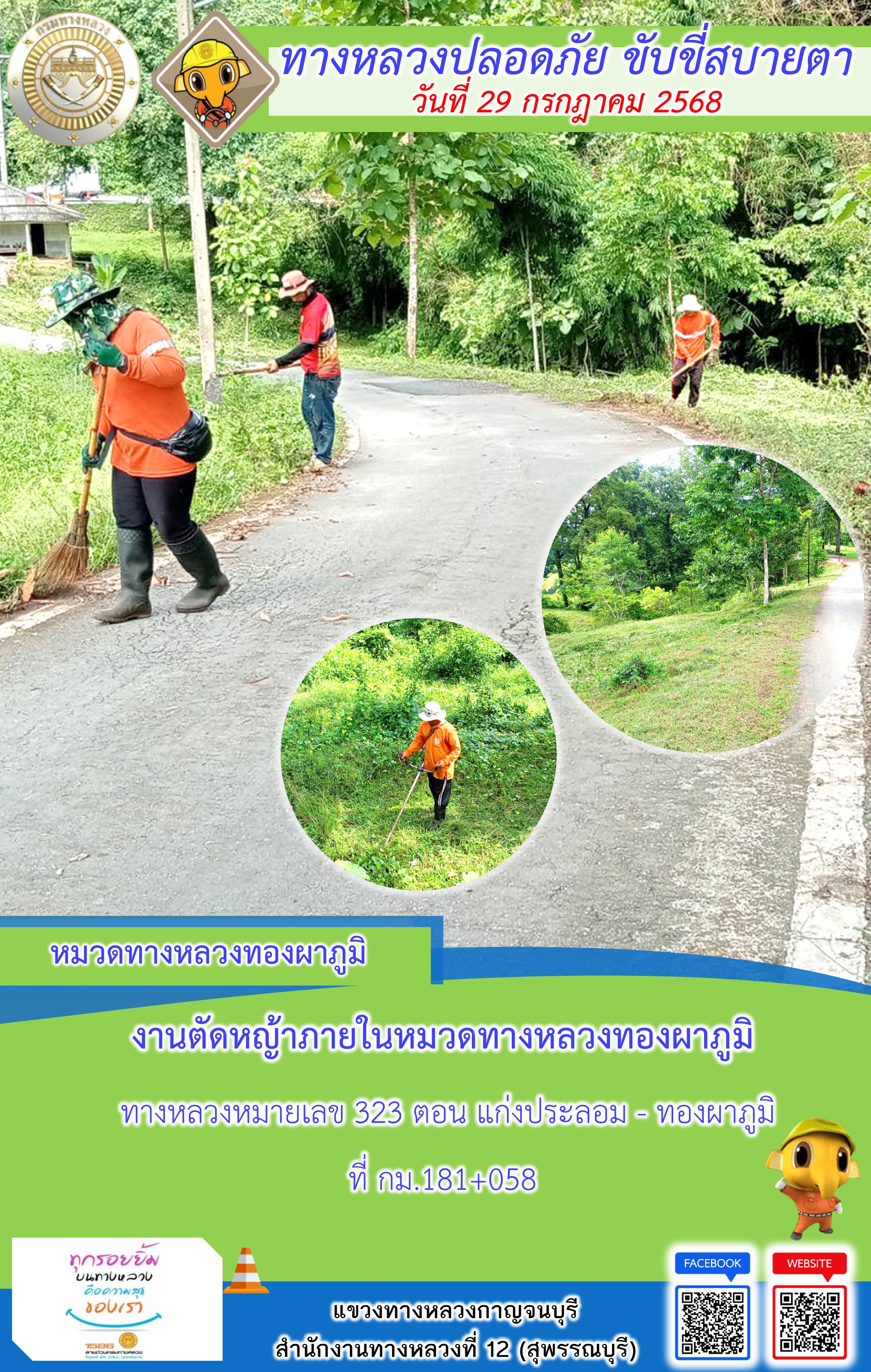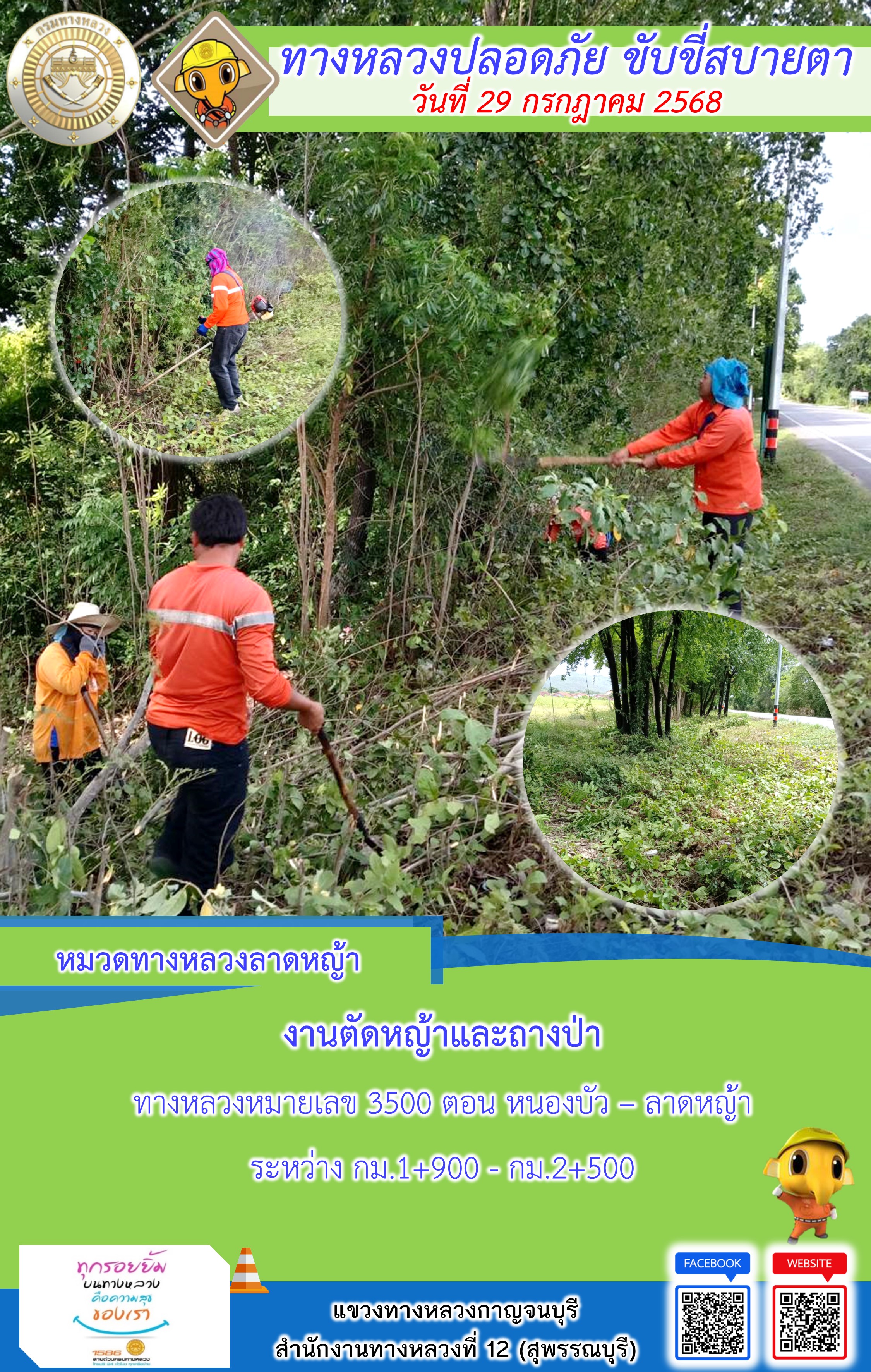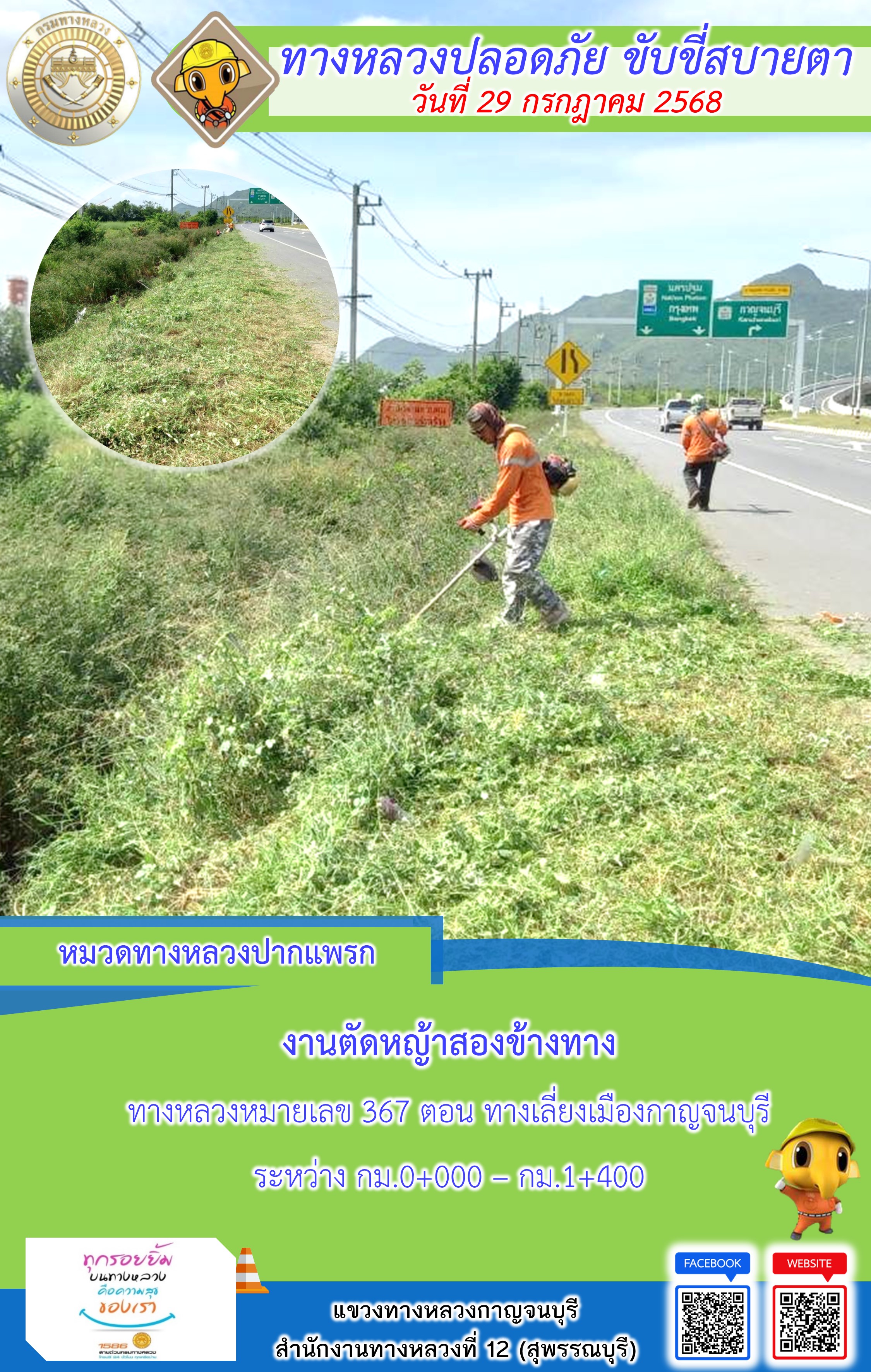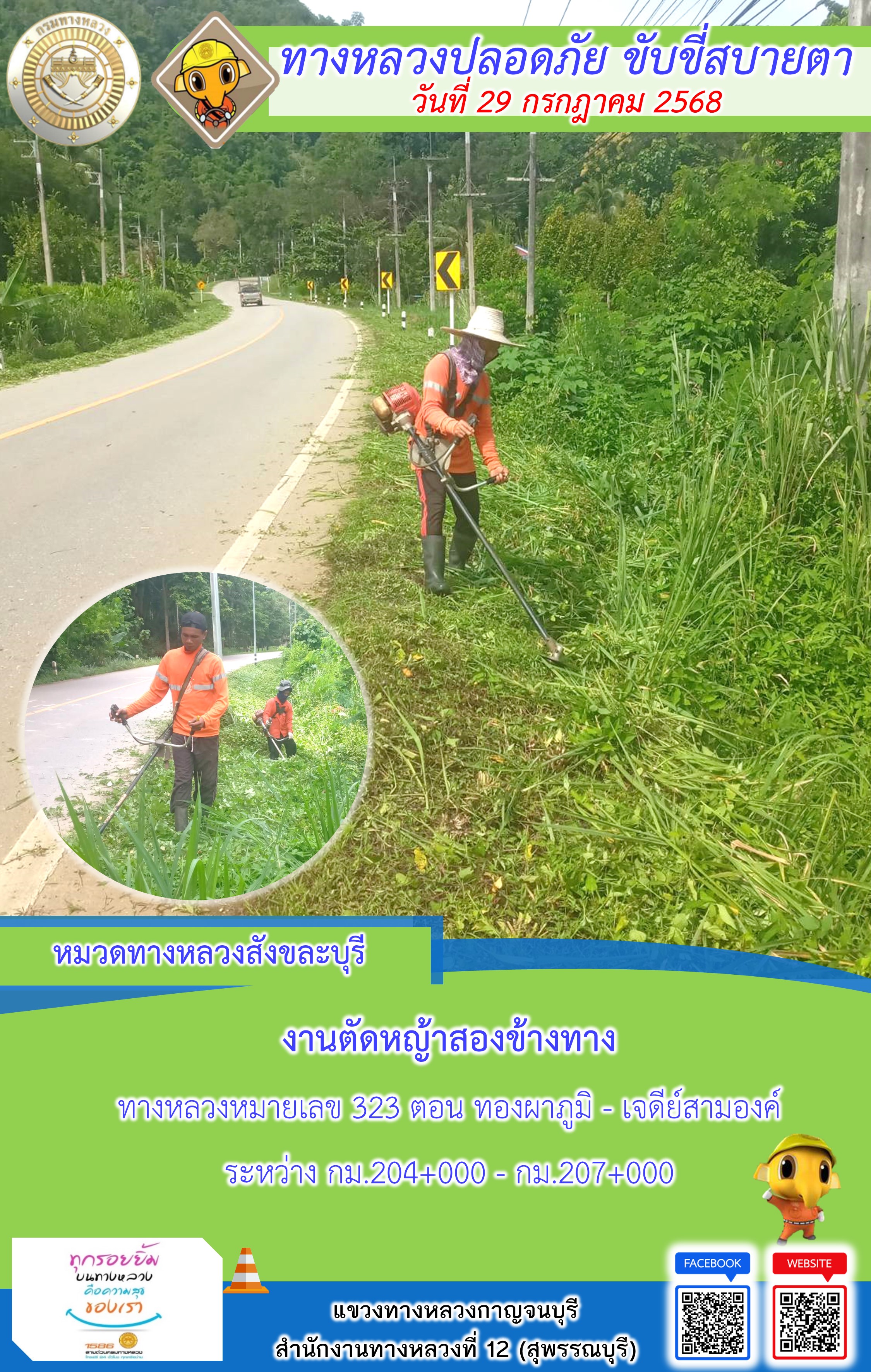 ข้อมูลภาพกิจกรรม : แขวงทางหลวงกาญจนบุรี โดยหมวดทางหลวงในสังกัด และงานอำนวยความปลอดภัยปฏิบัติงาน ประจำวันที่ 29 ก.ค. 68