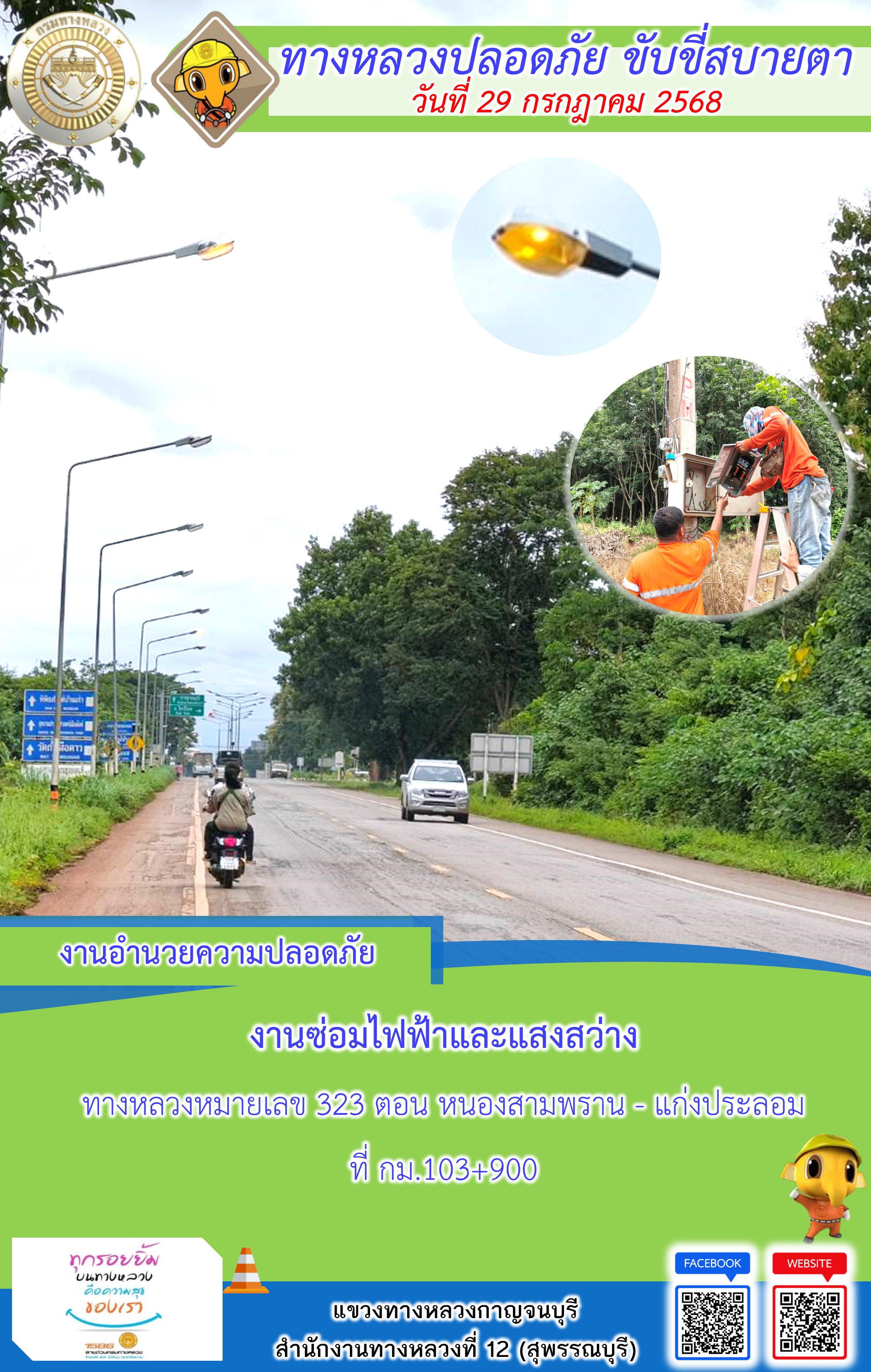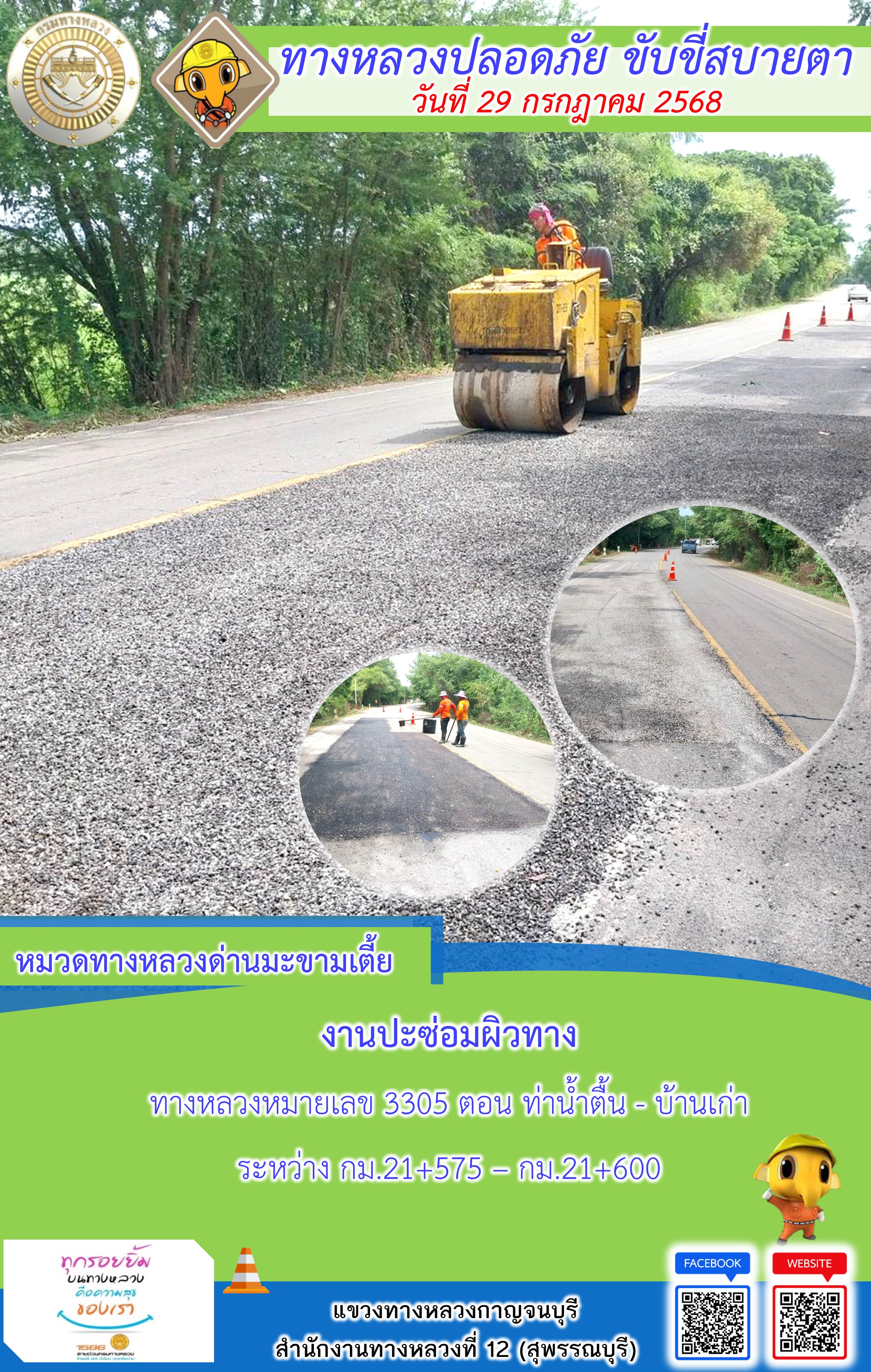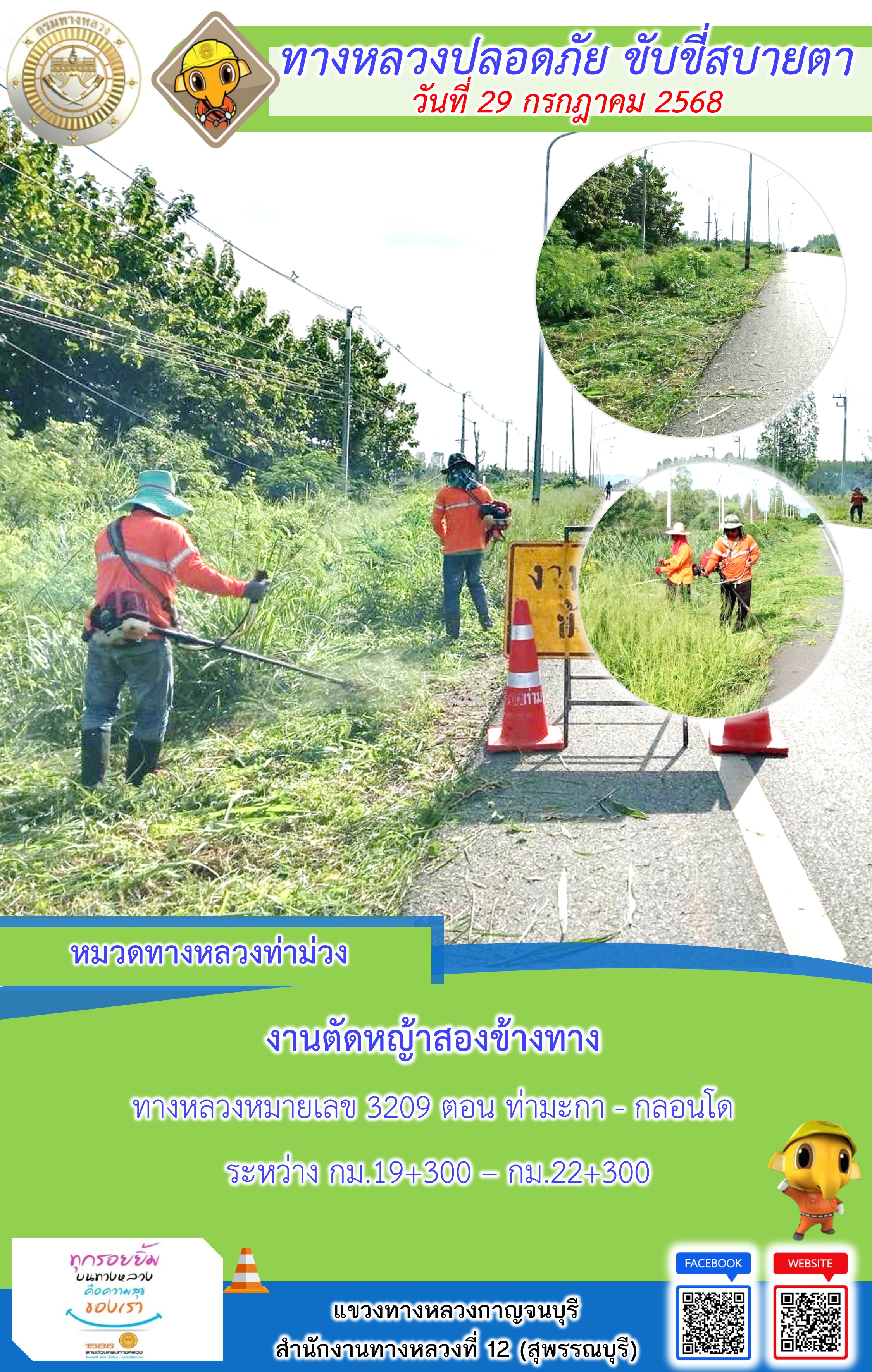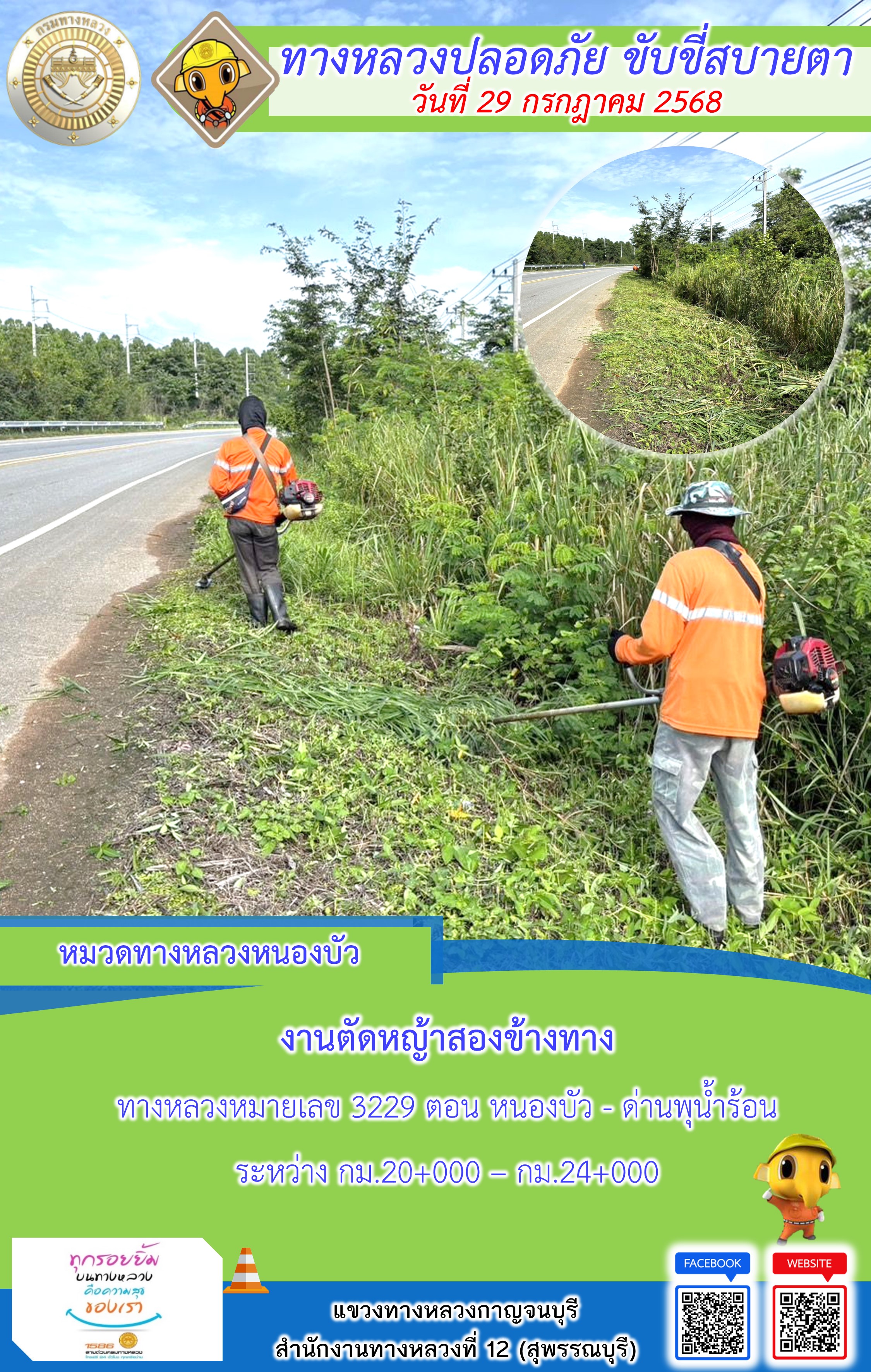 ข้อมูลภาพกิจกรรม : แขวงทางหลวงกาญจนบุรี โดยหมวดทางหลวงในสังกัด และงานอำนวยความปลอดภัยปฏิบัติงาน ประจำวันที่ 29 ก.ค. 68
