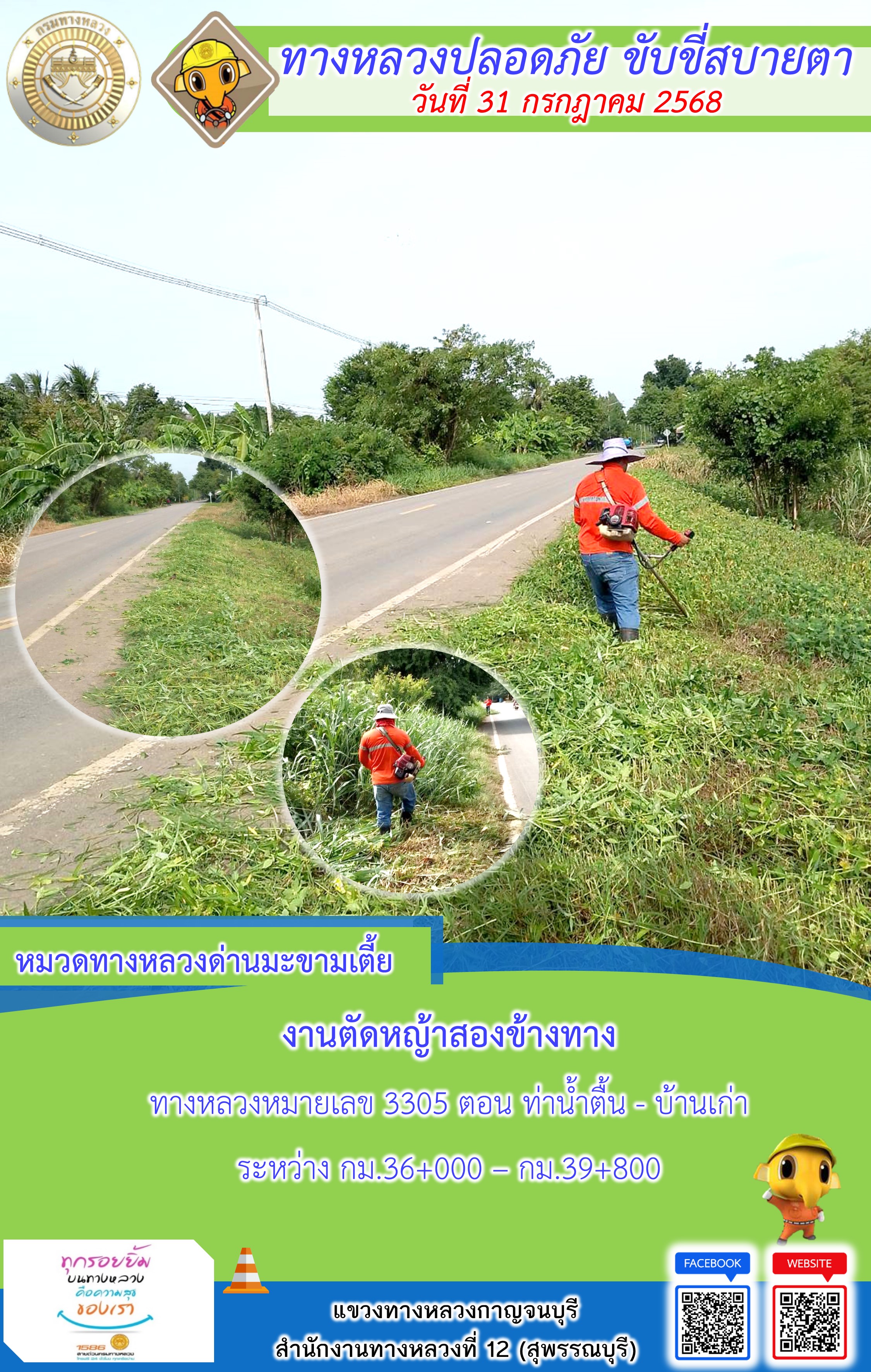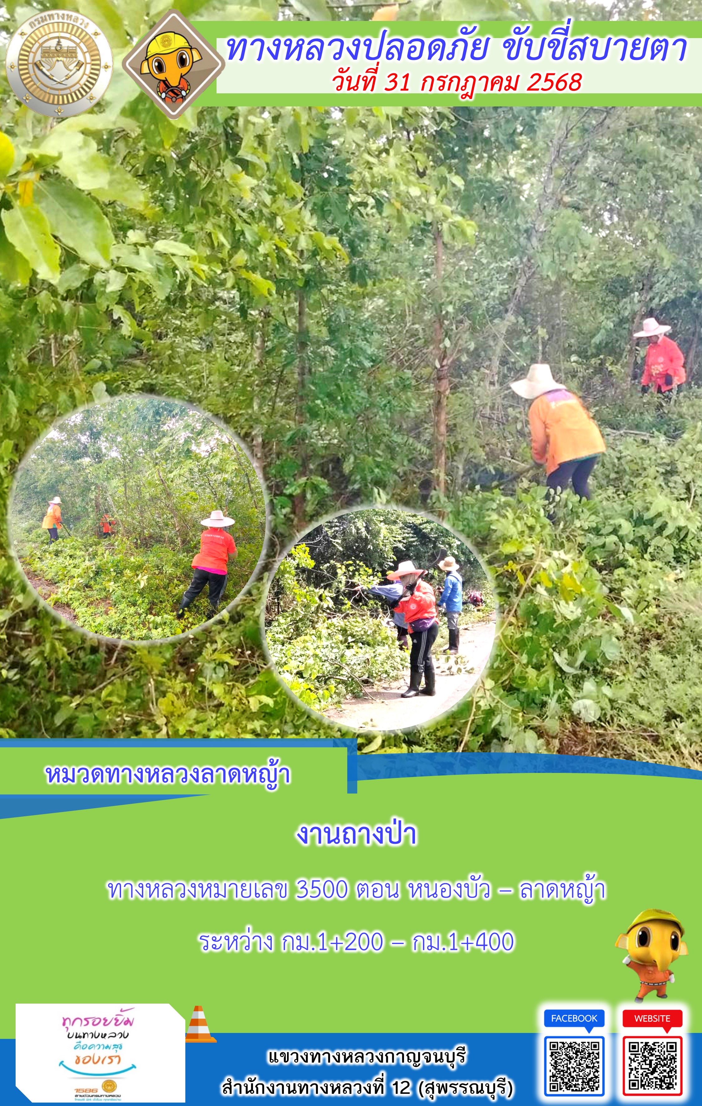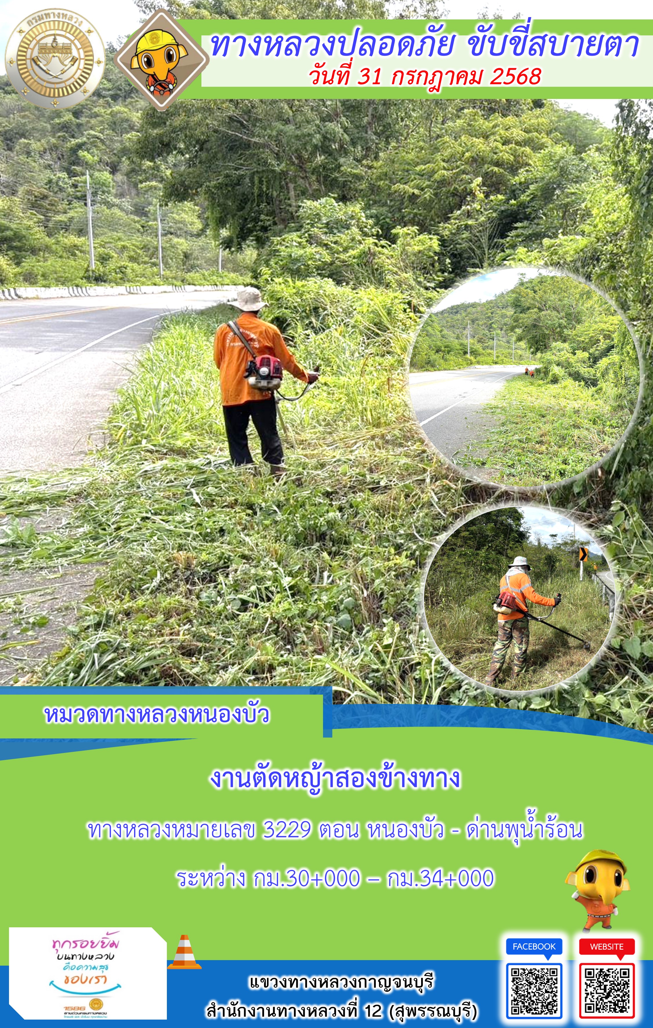 แขวงทางหลวงกาญจนบุรี โดยหมวดทางหลวงในสังกัด และงานอำนวยความปลอดภัยปฏิบัติงาน ประจำวันที่ 31 ก.ค. 68
