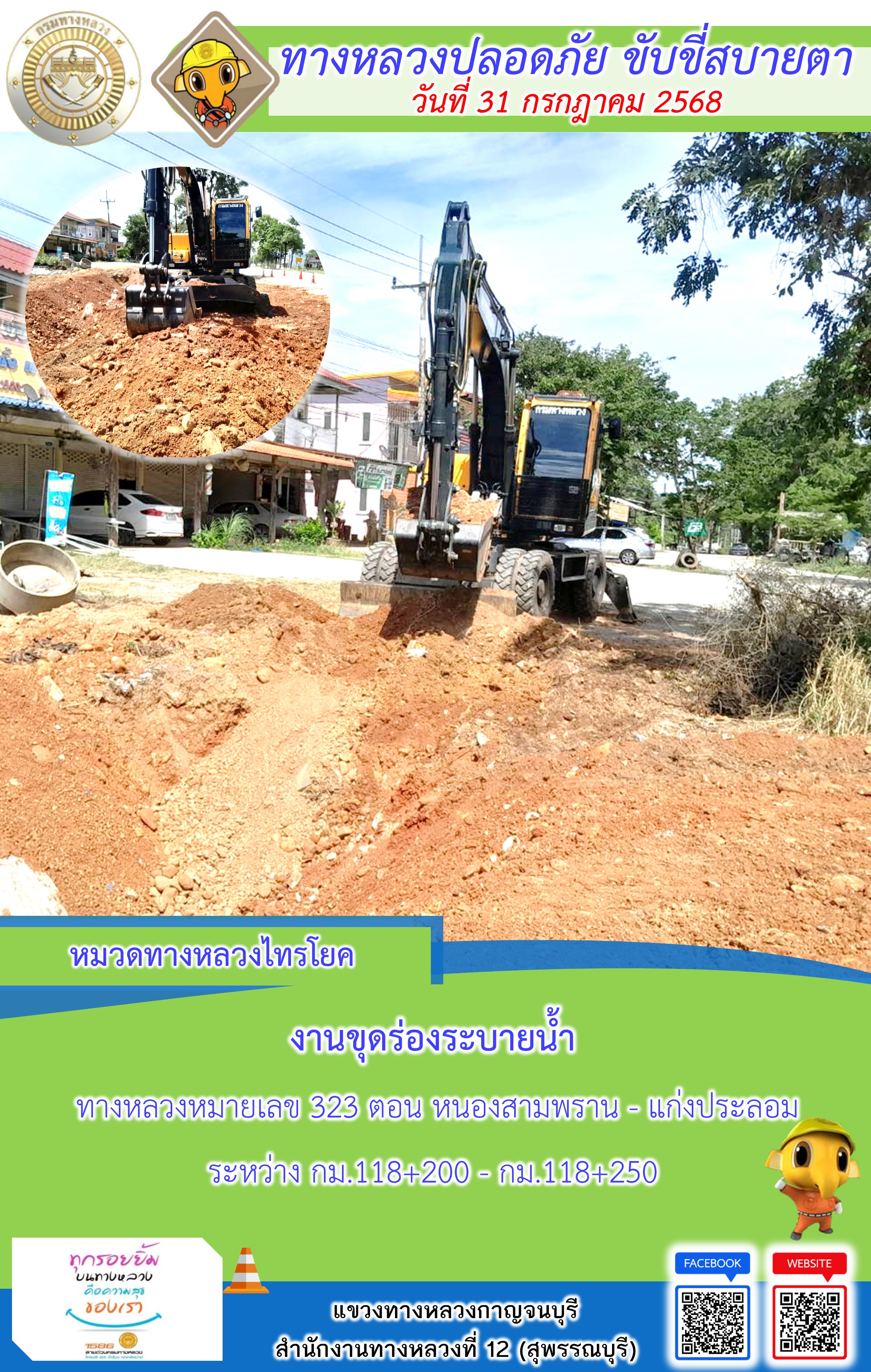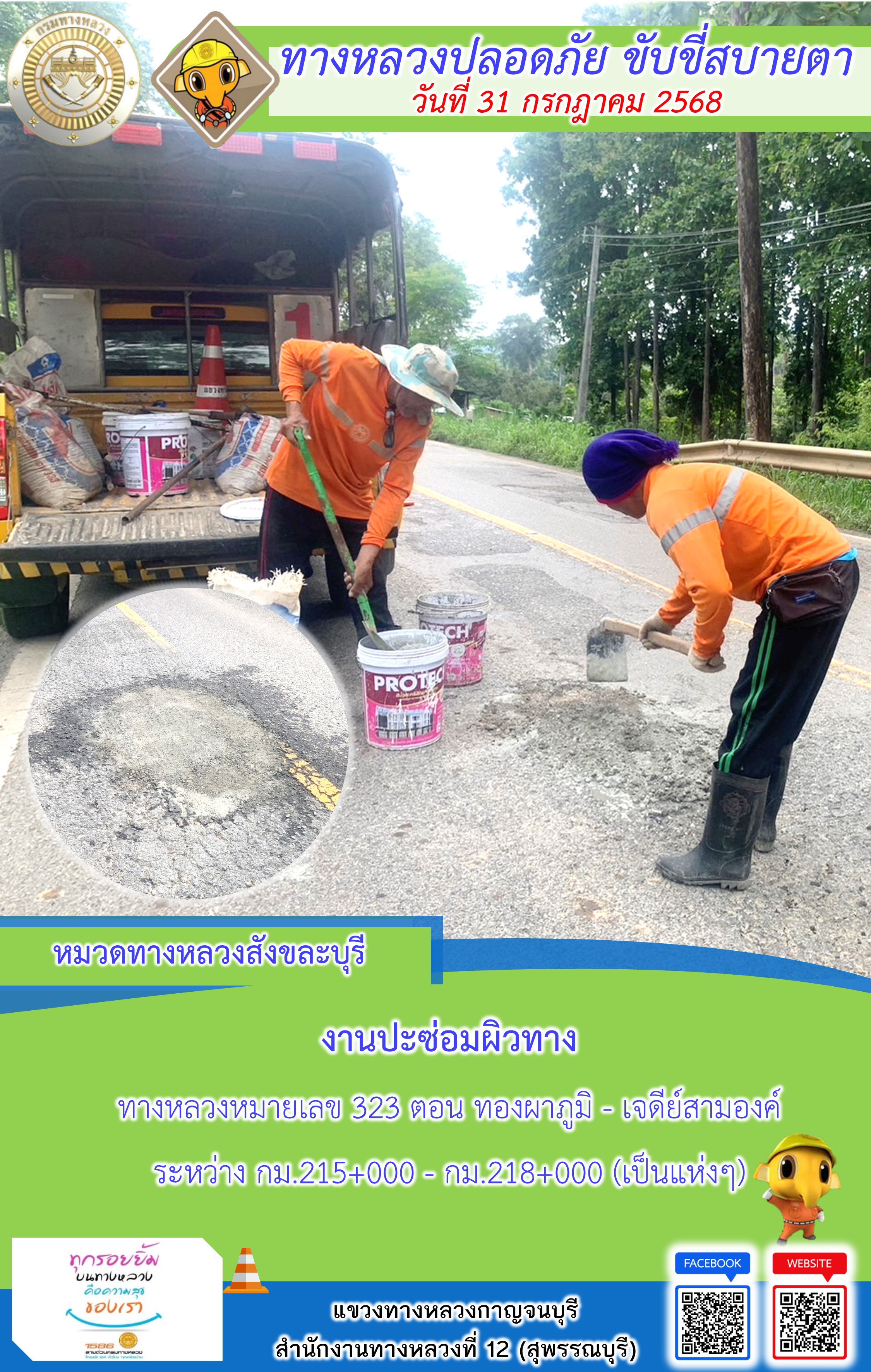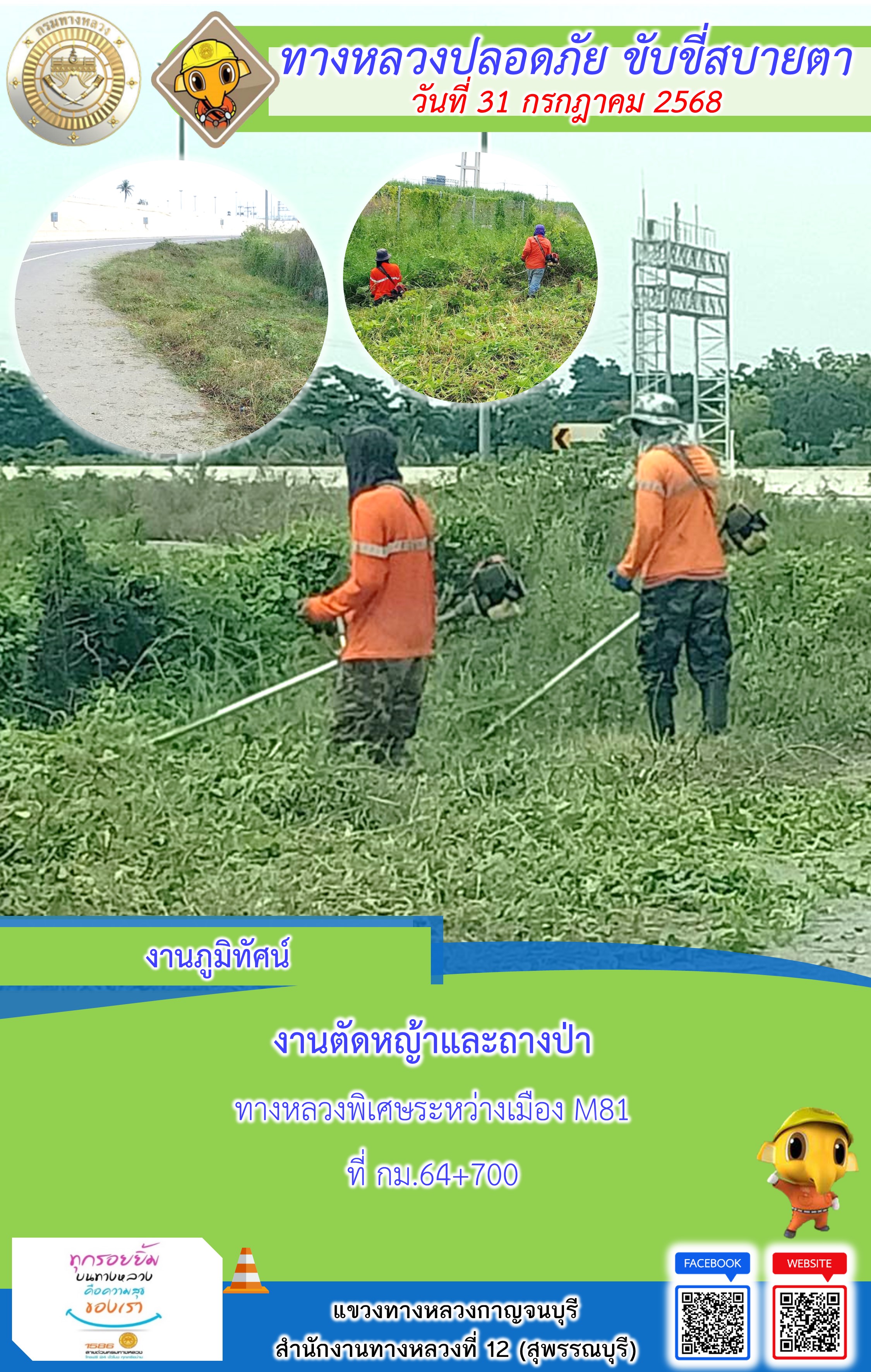 แขวงทางหลวงกาญจนบุรี โดยหมวดทางหลวงในสังกัด และงานอำนวยความปลอดภัยปฏิบัติงาน ประจำวันที่ 31 ก.ค. 68