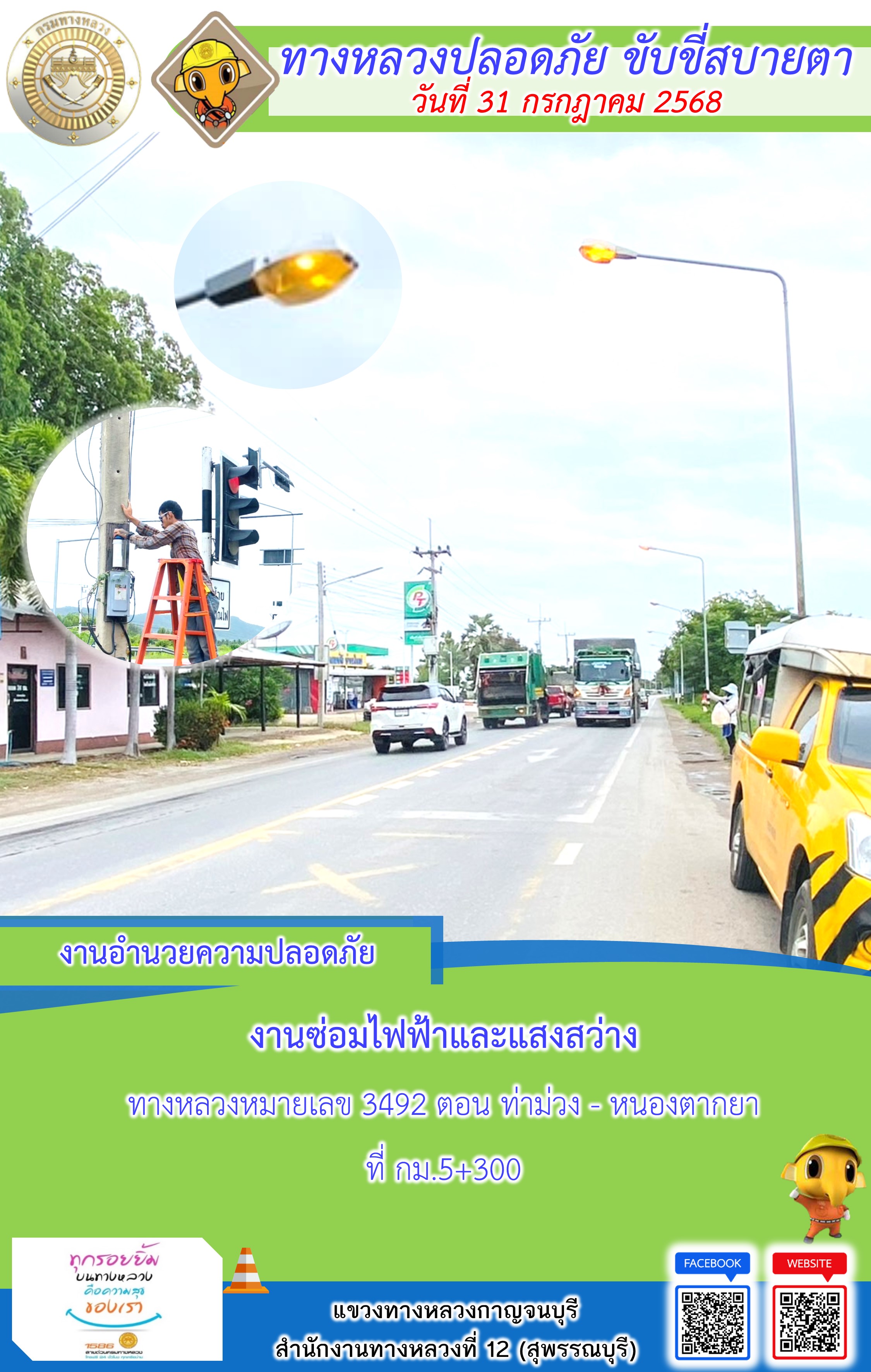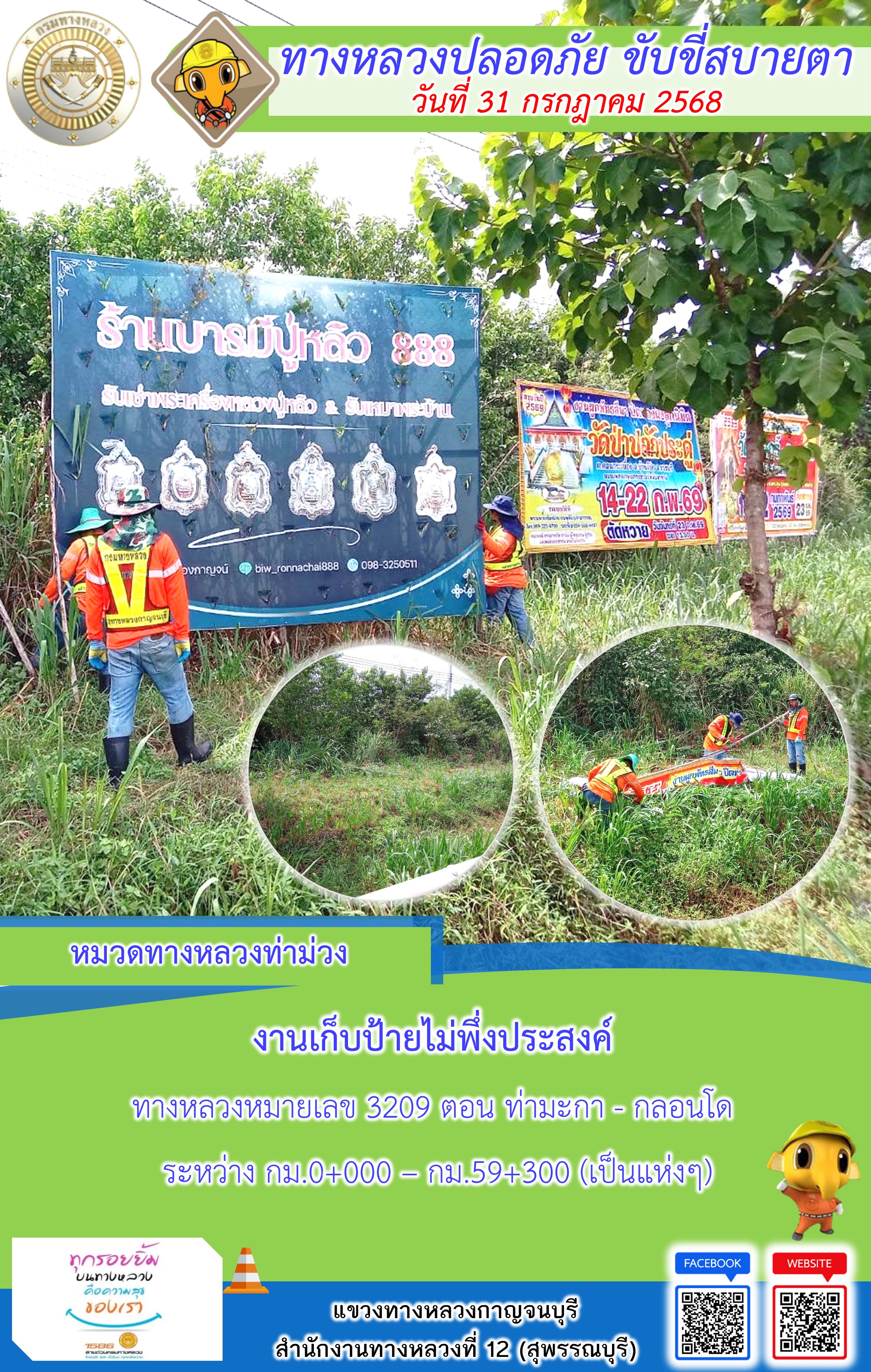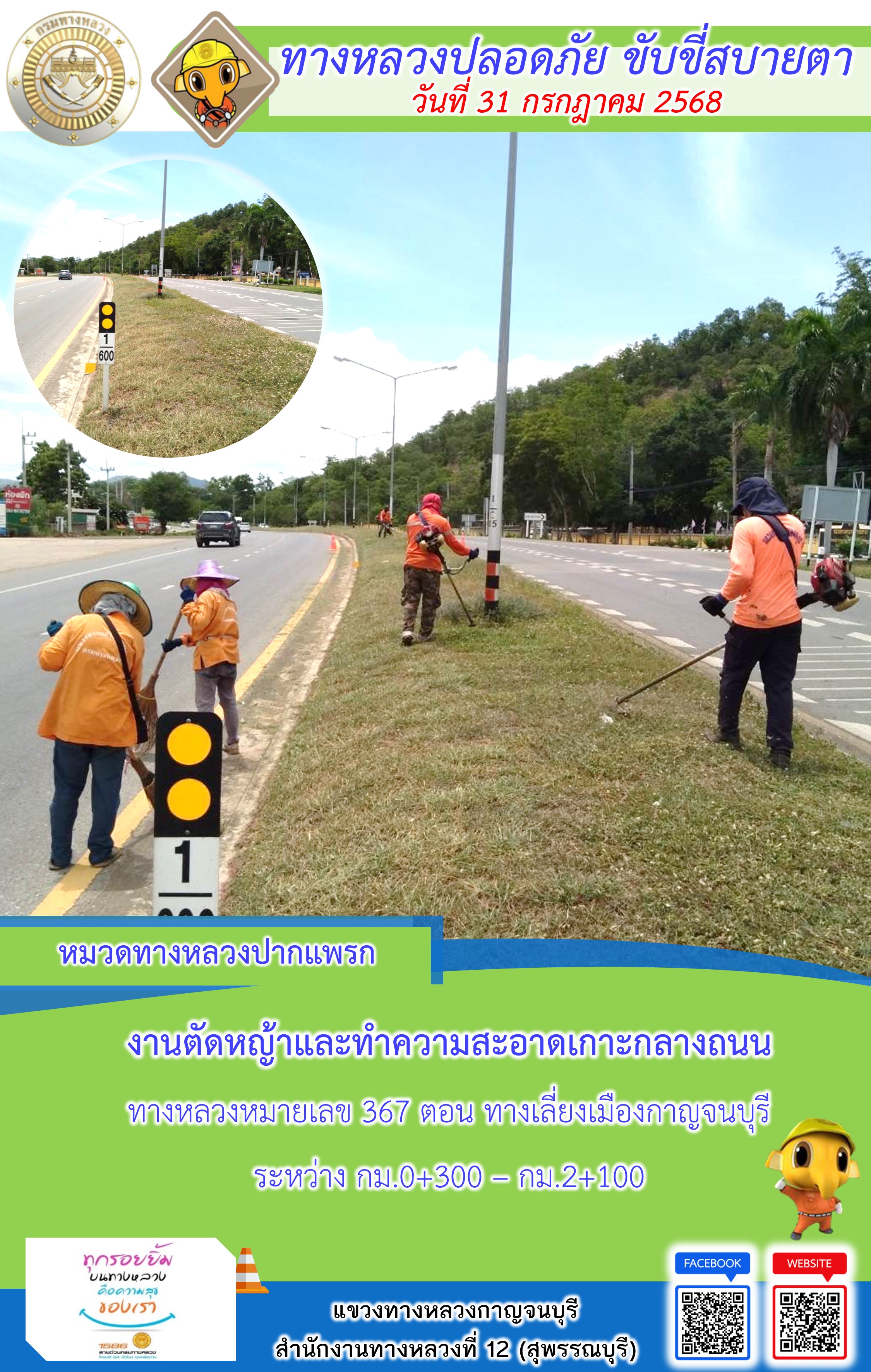 ข้อมูลภาพกิจกรรม : แขวงทางหลวงกาญจนบุรี โดยหมวดทางหลวงในสังกัด และงานอำนวยความปลอดภัยปฏิบัติงาน ประจำวันที่ 31 ก.ค. 68