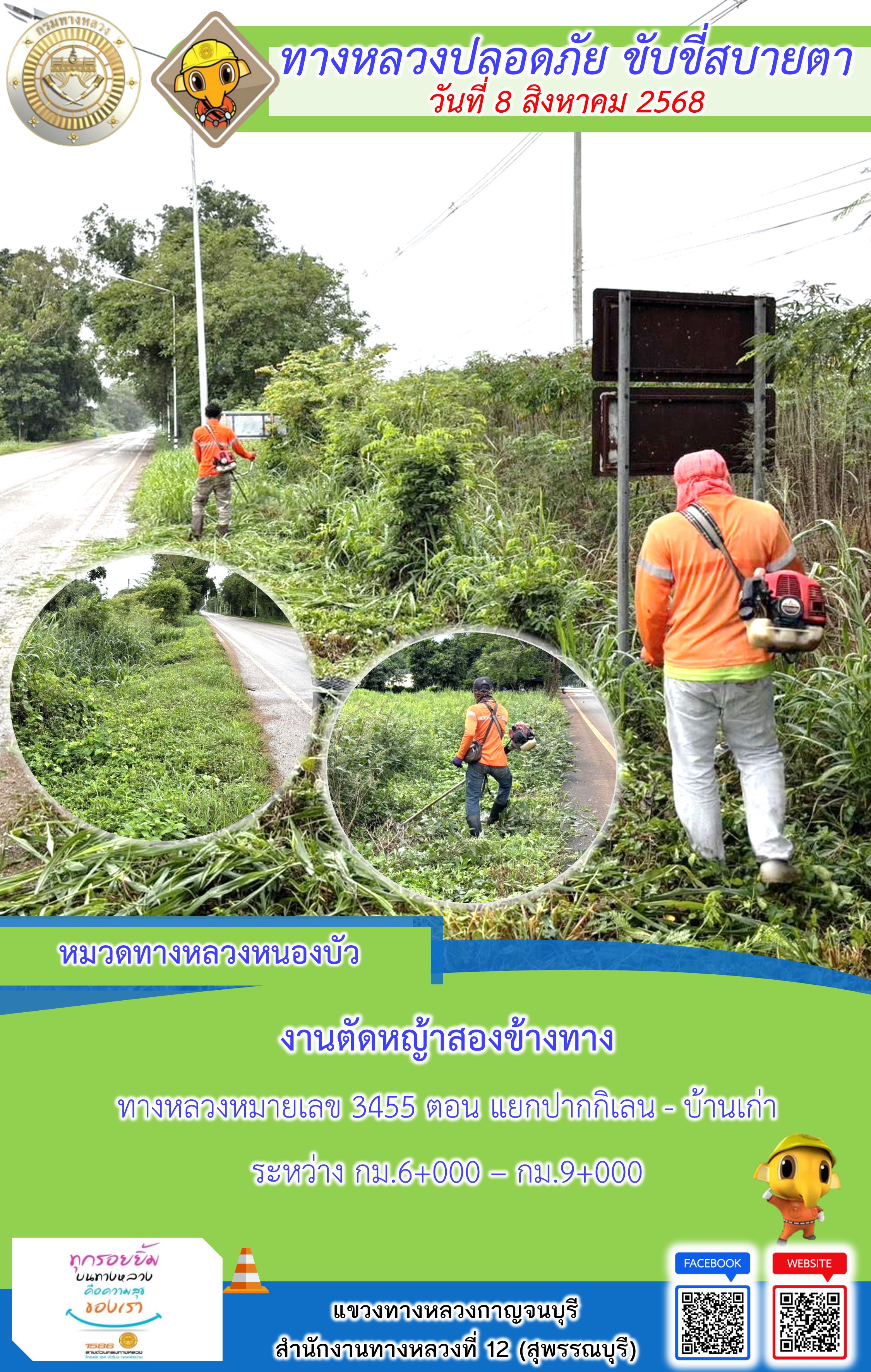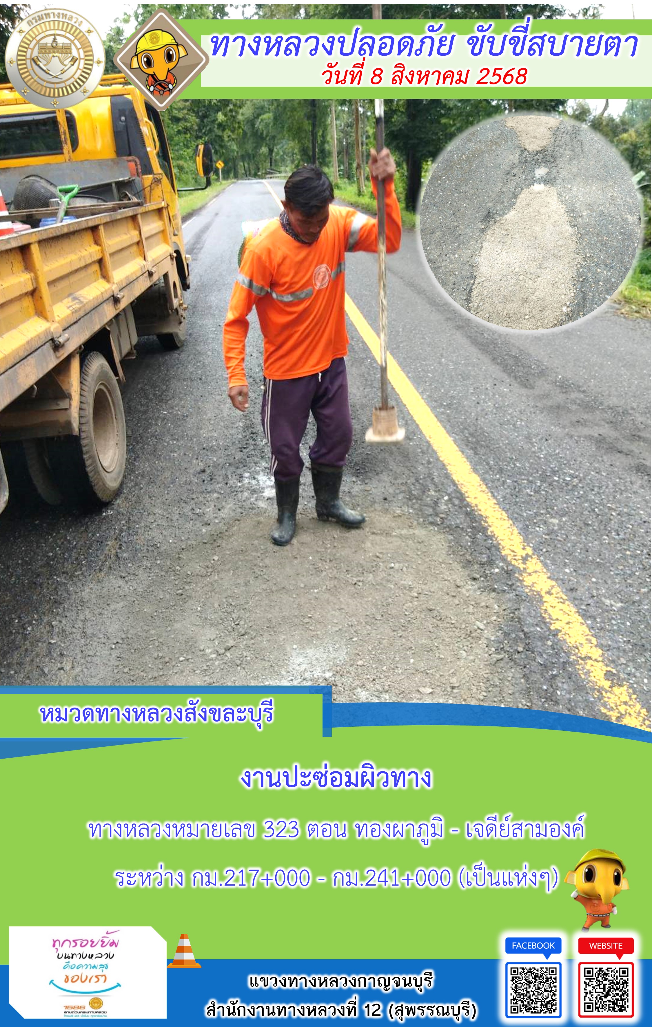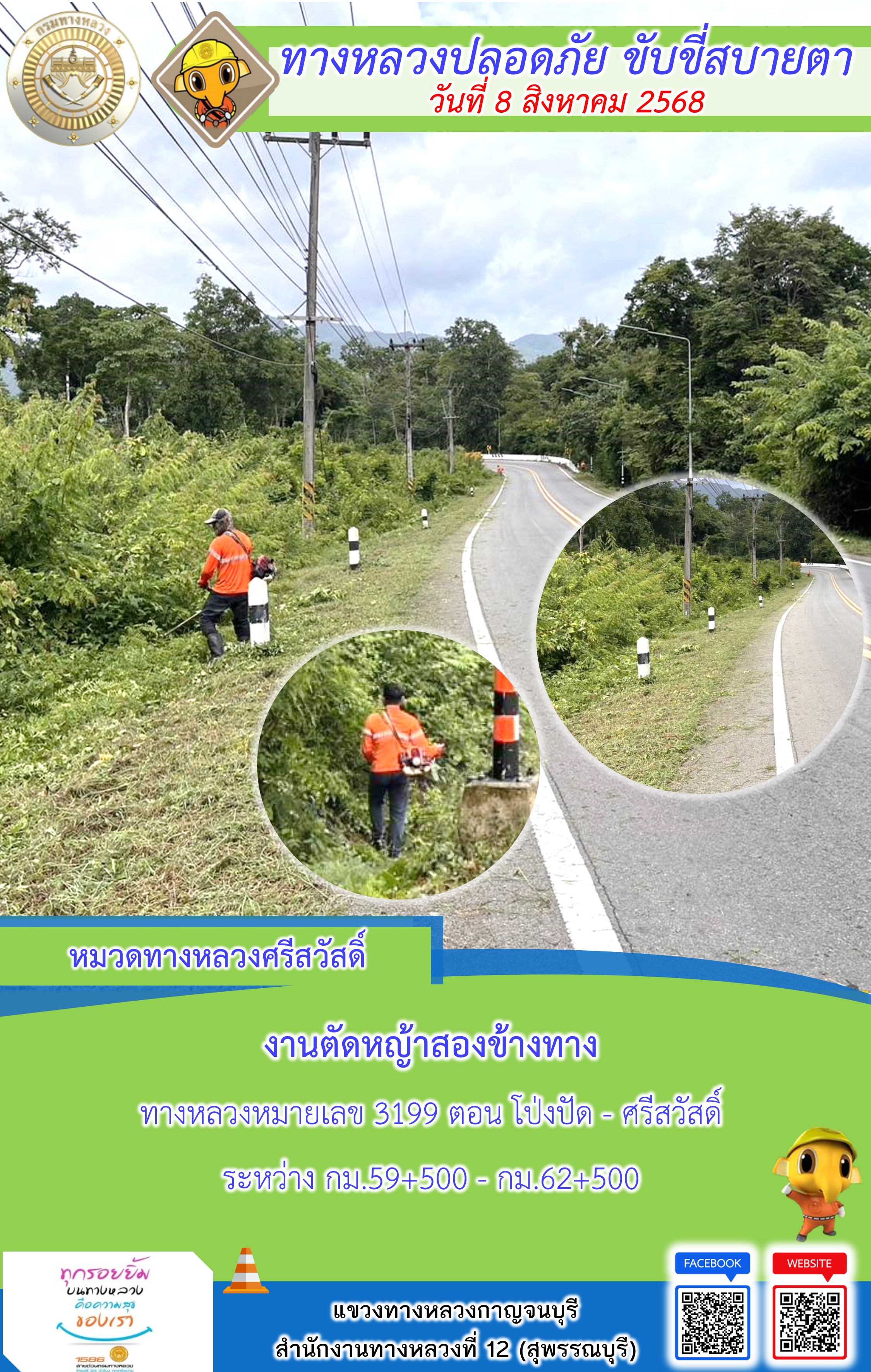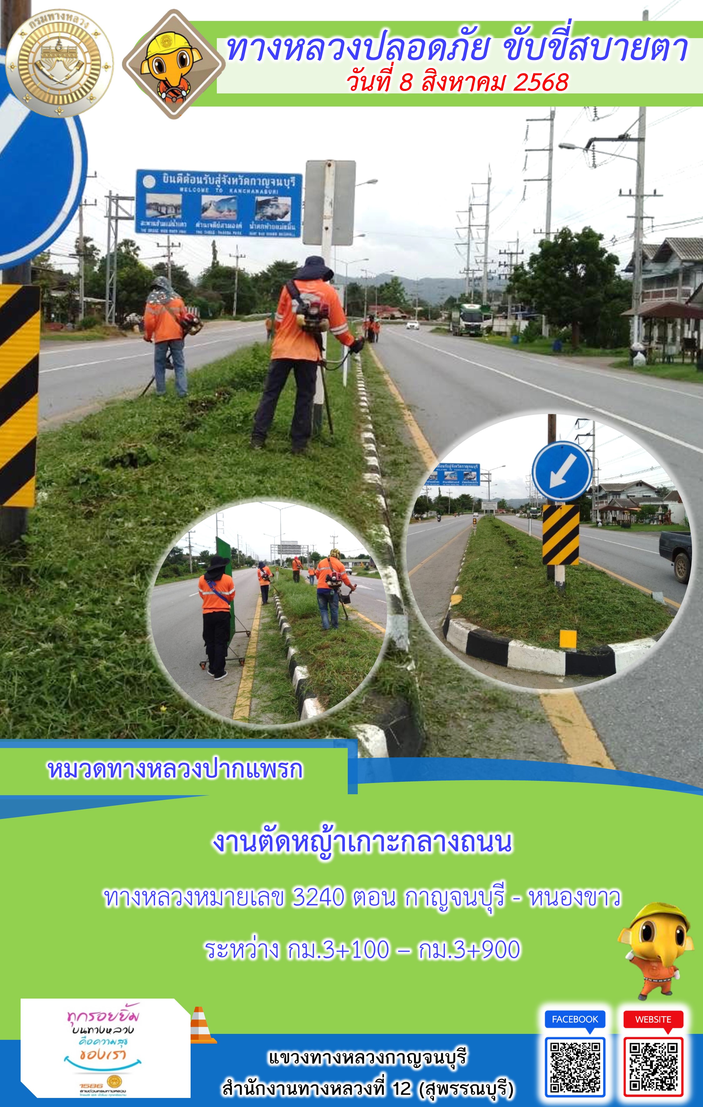 แขวงทางหลวงกาญจนบุรี โดยหมวดทางหลวงในสังกัด และงานอำนวยความปลอดภัยปฏิบัติงาน ประจำวันที่ 8 ส.ค. 68