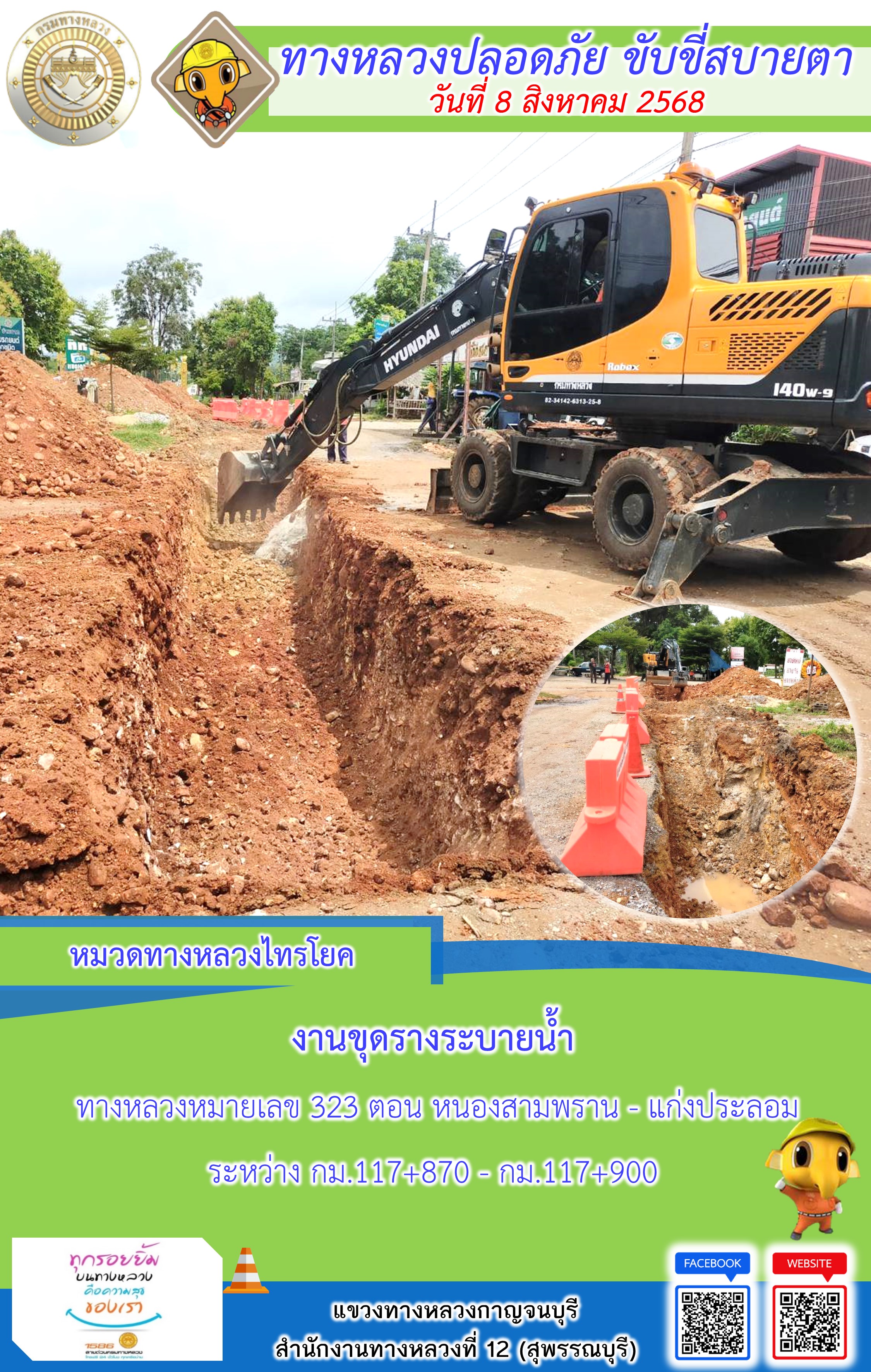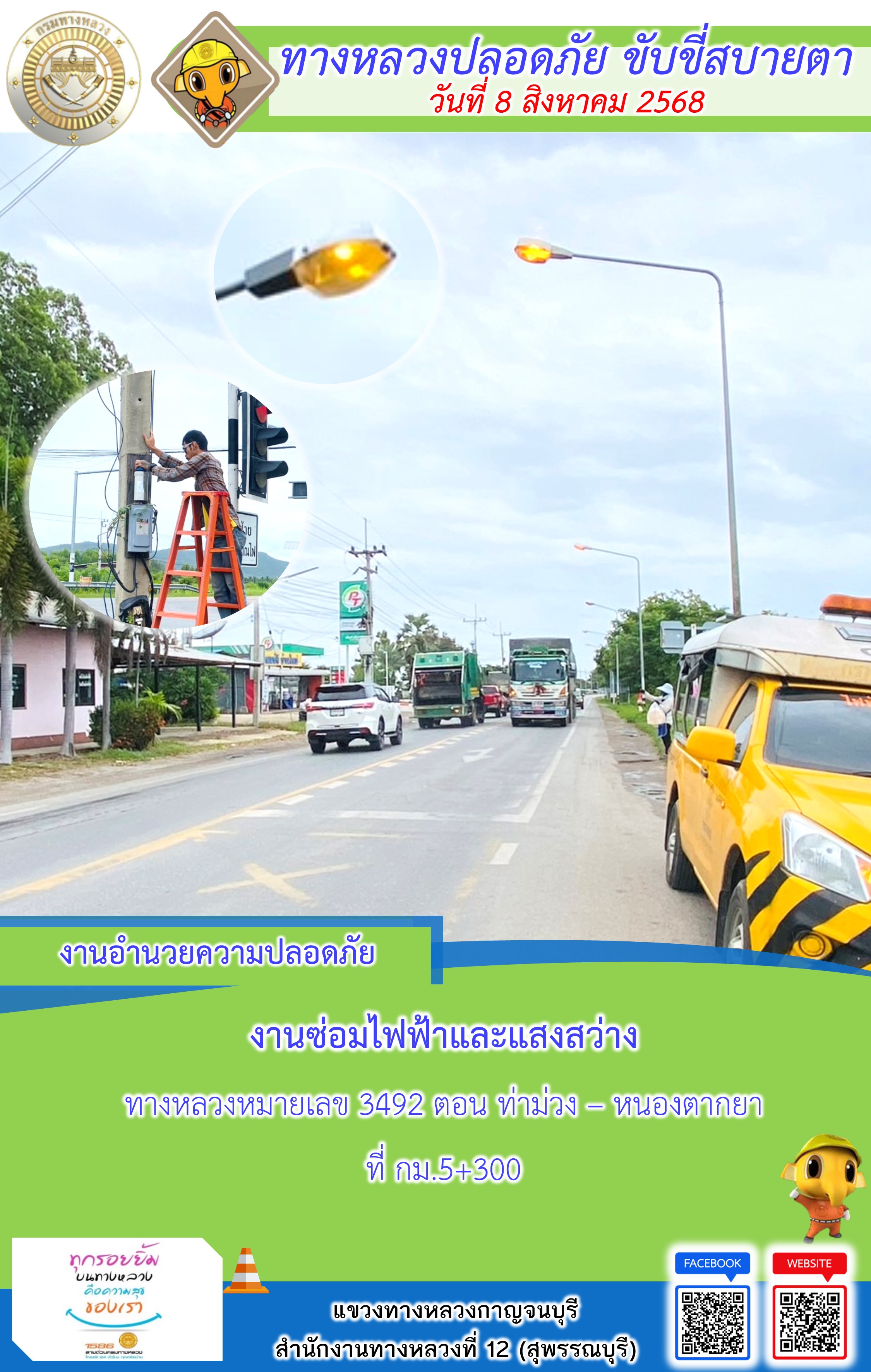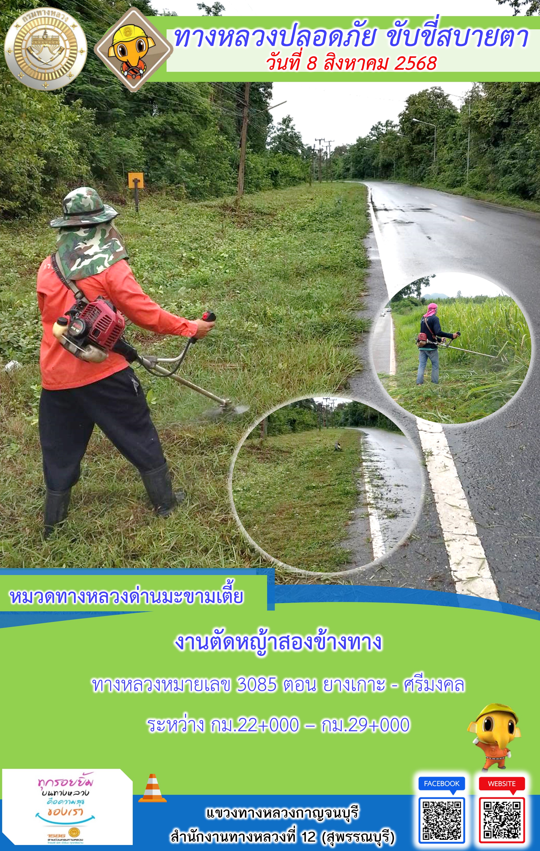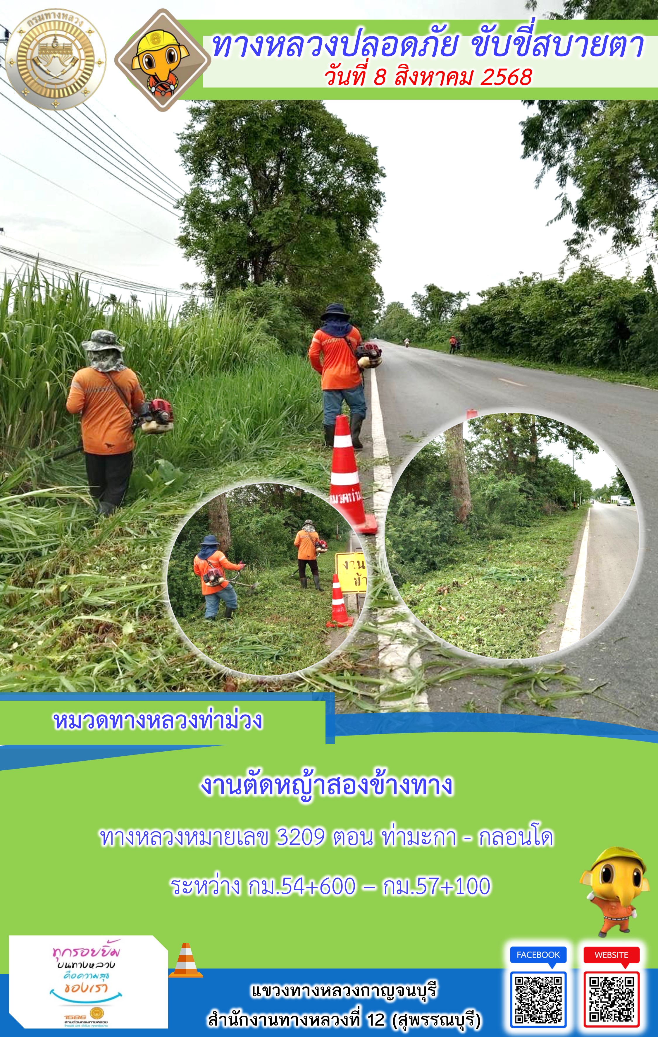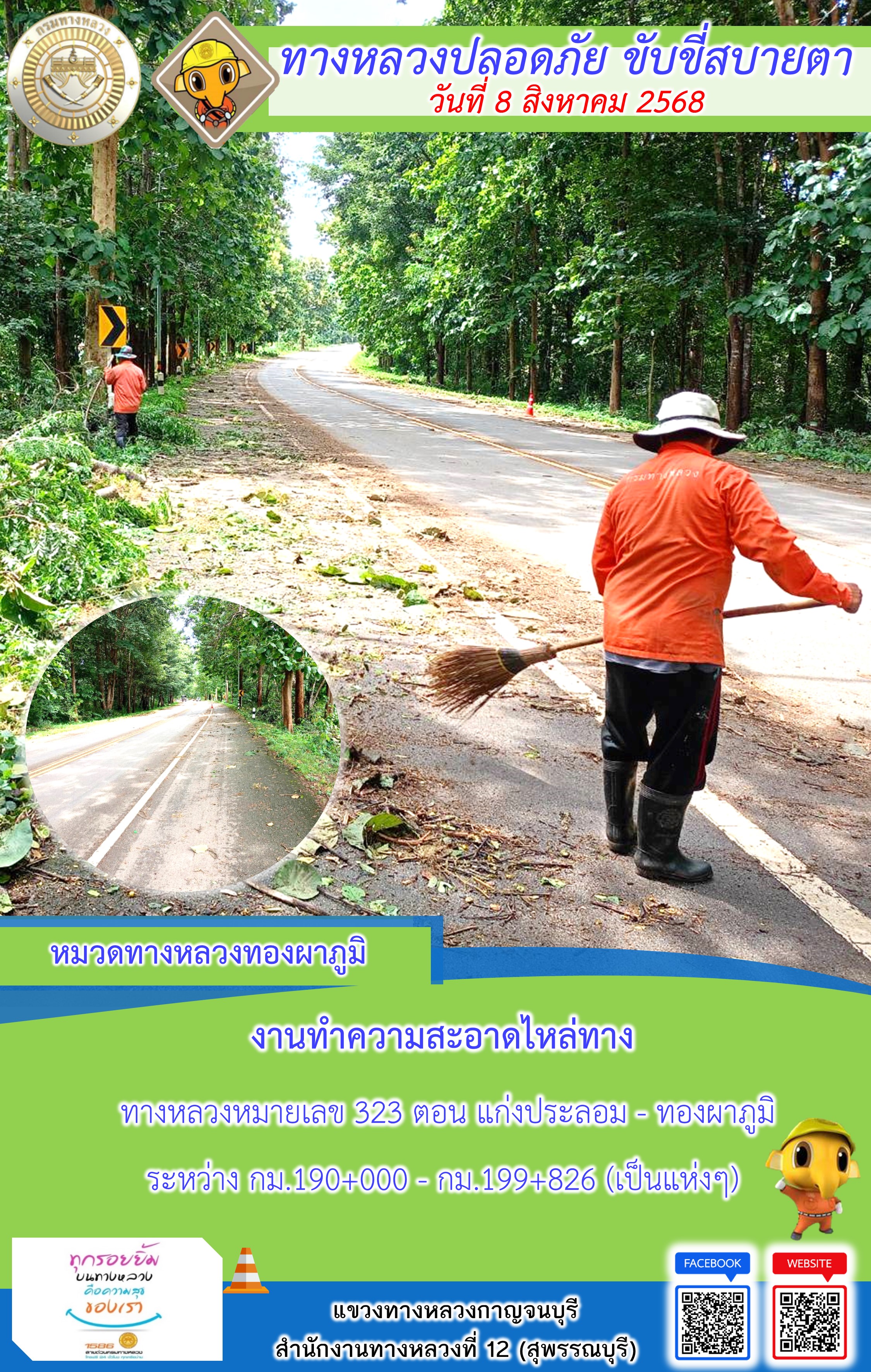 แขวงทางหลวงกาญจนบุรี โดยหมวดทางหลวงในสังกัด และงานอำนวยความปลอดภัยปฏิบัติงาน ประจำวันที่ 8 ส.ค. 68