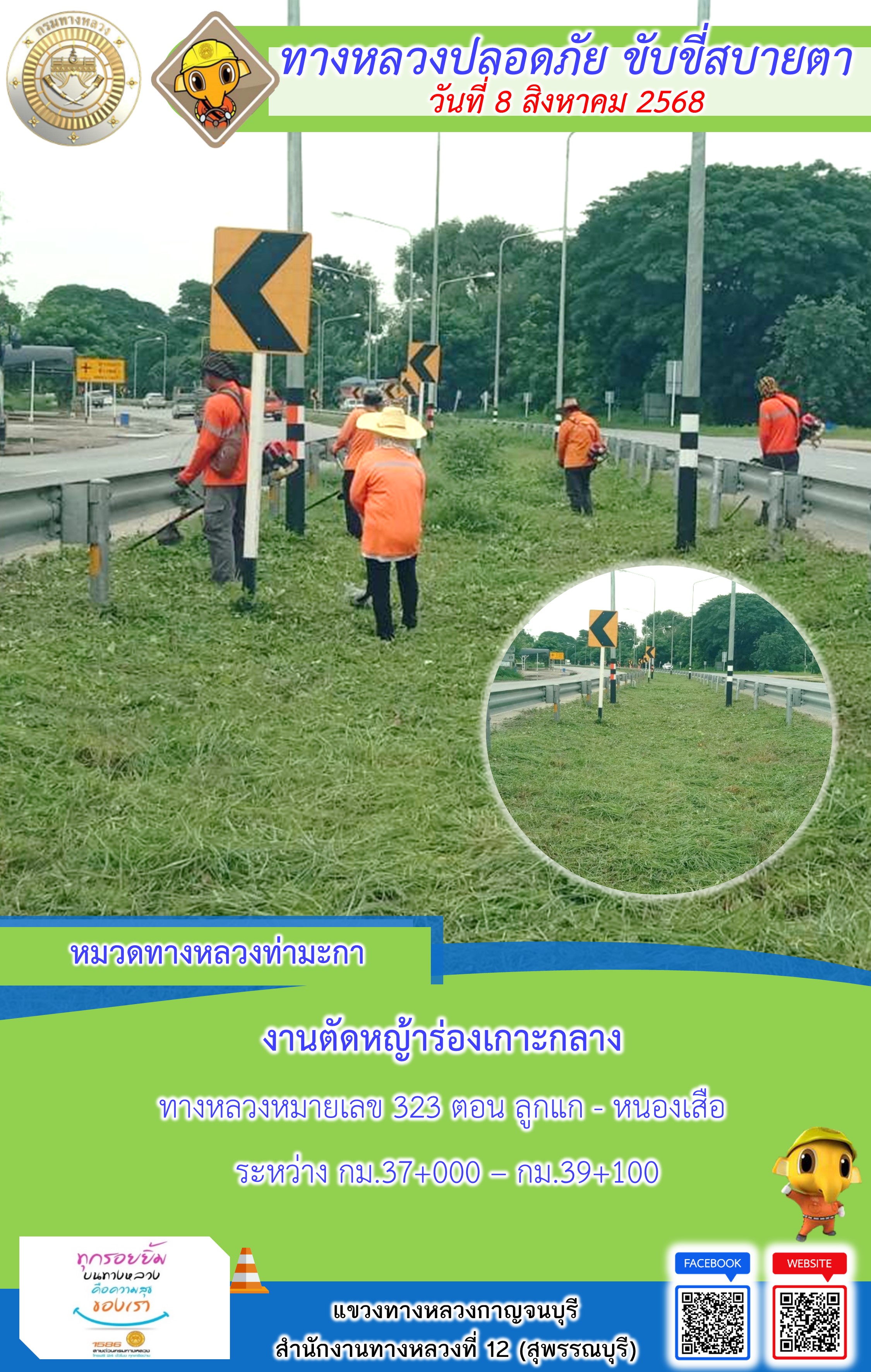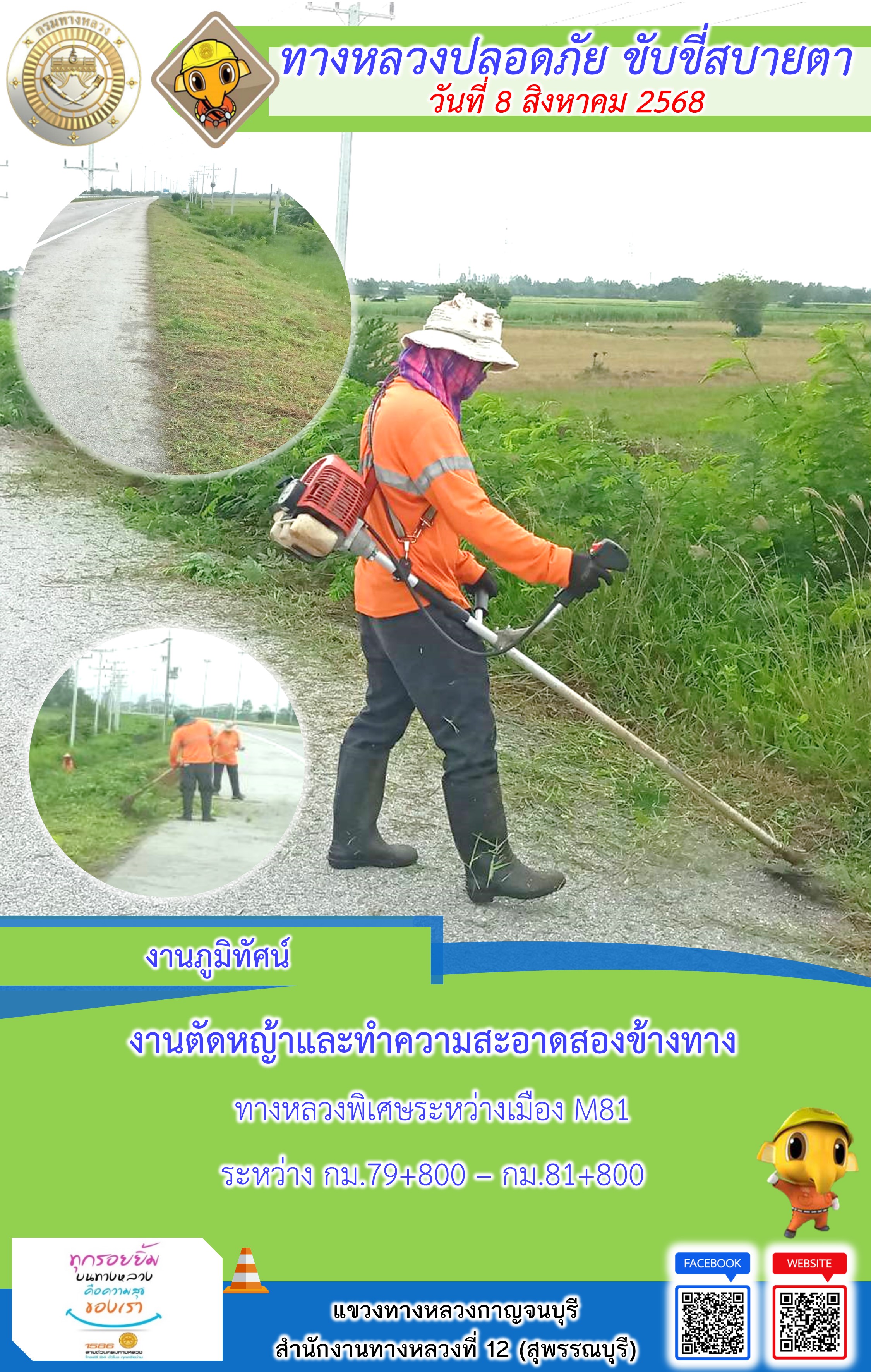 ข้อมูลภาพกิจกรรม : แขวงทางหลวงกาญจนบุรี โดยหมวดทางหลวงในสังกัด และงานอำนวยความปลอดภัยปฏิบัติงาน ประจำวันที่ 8 ส.ค. 68