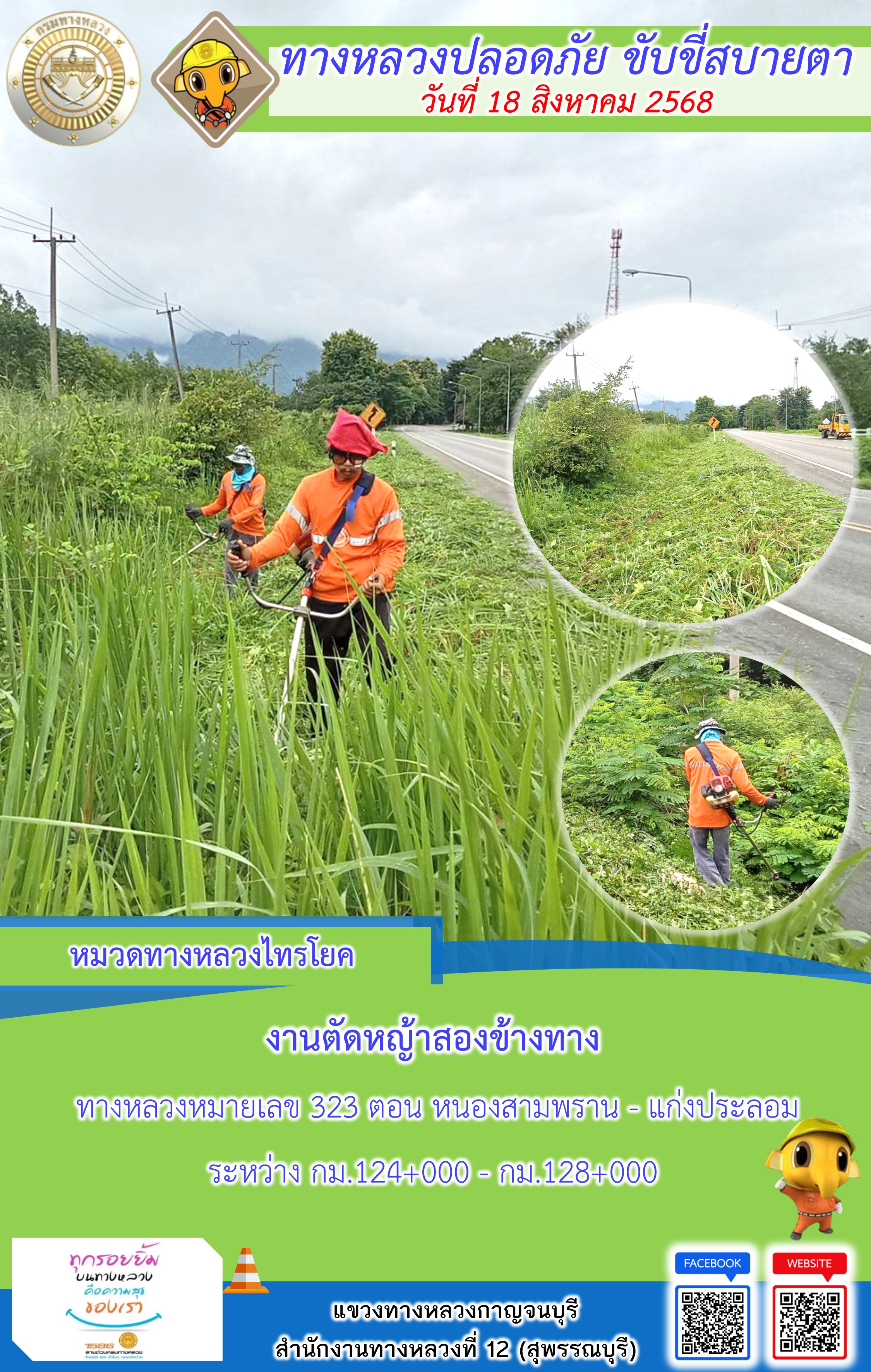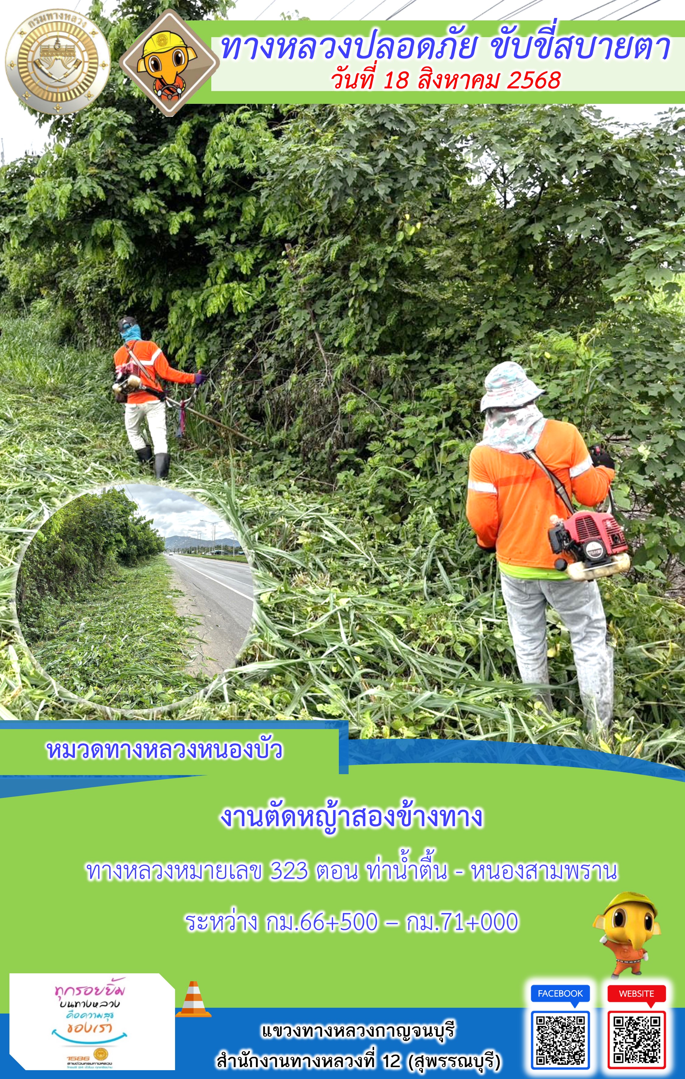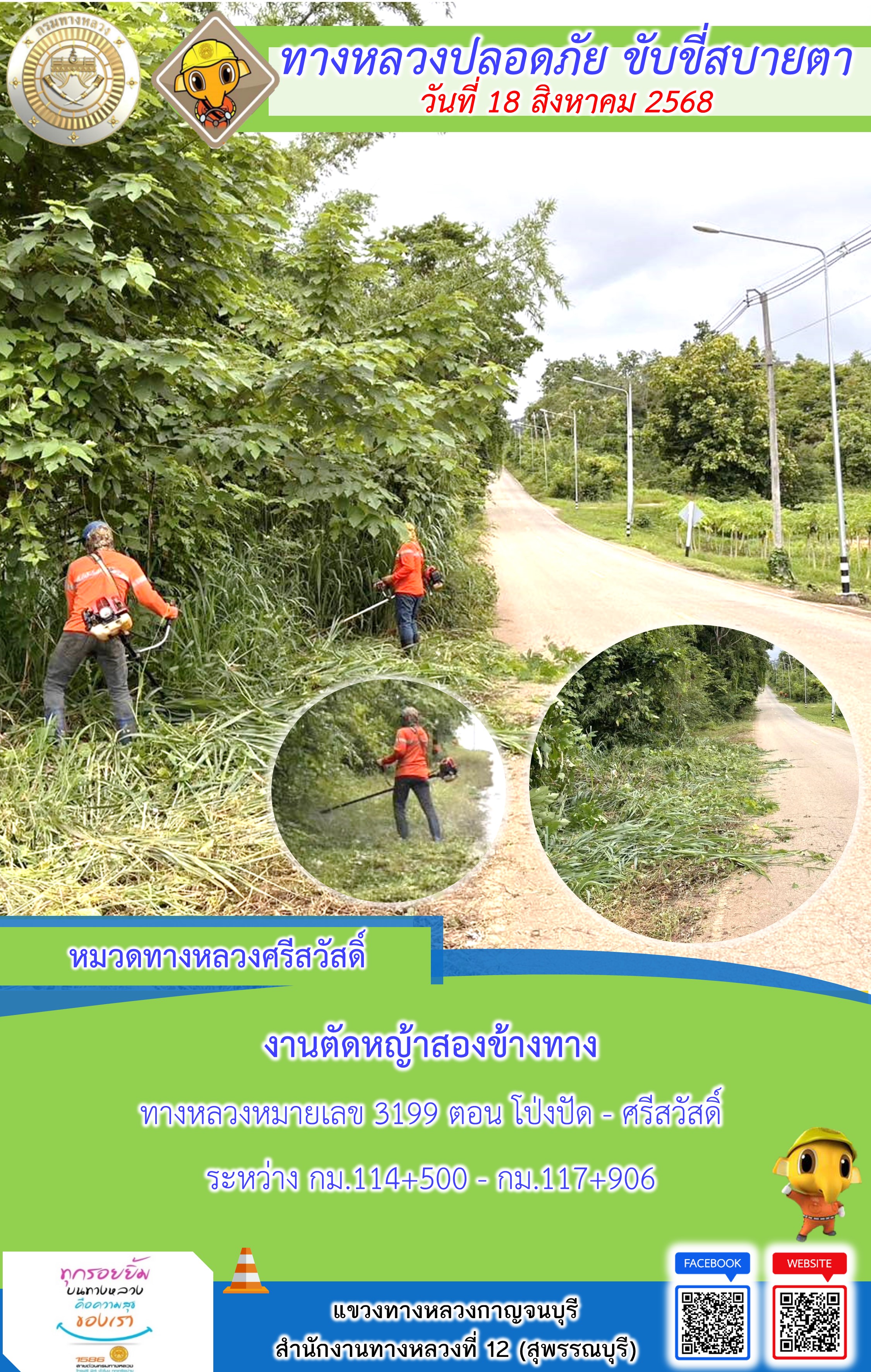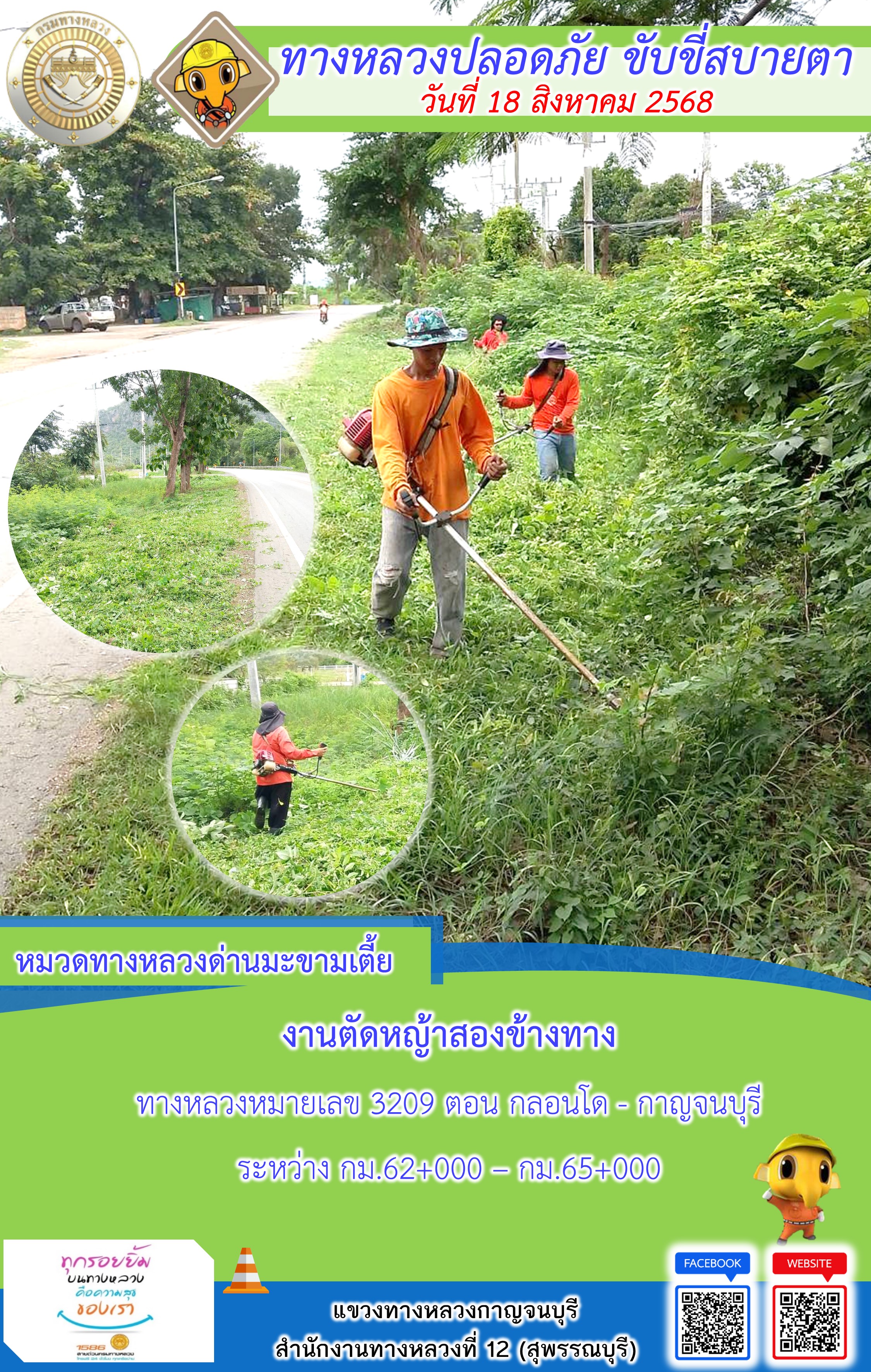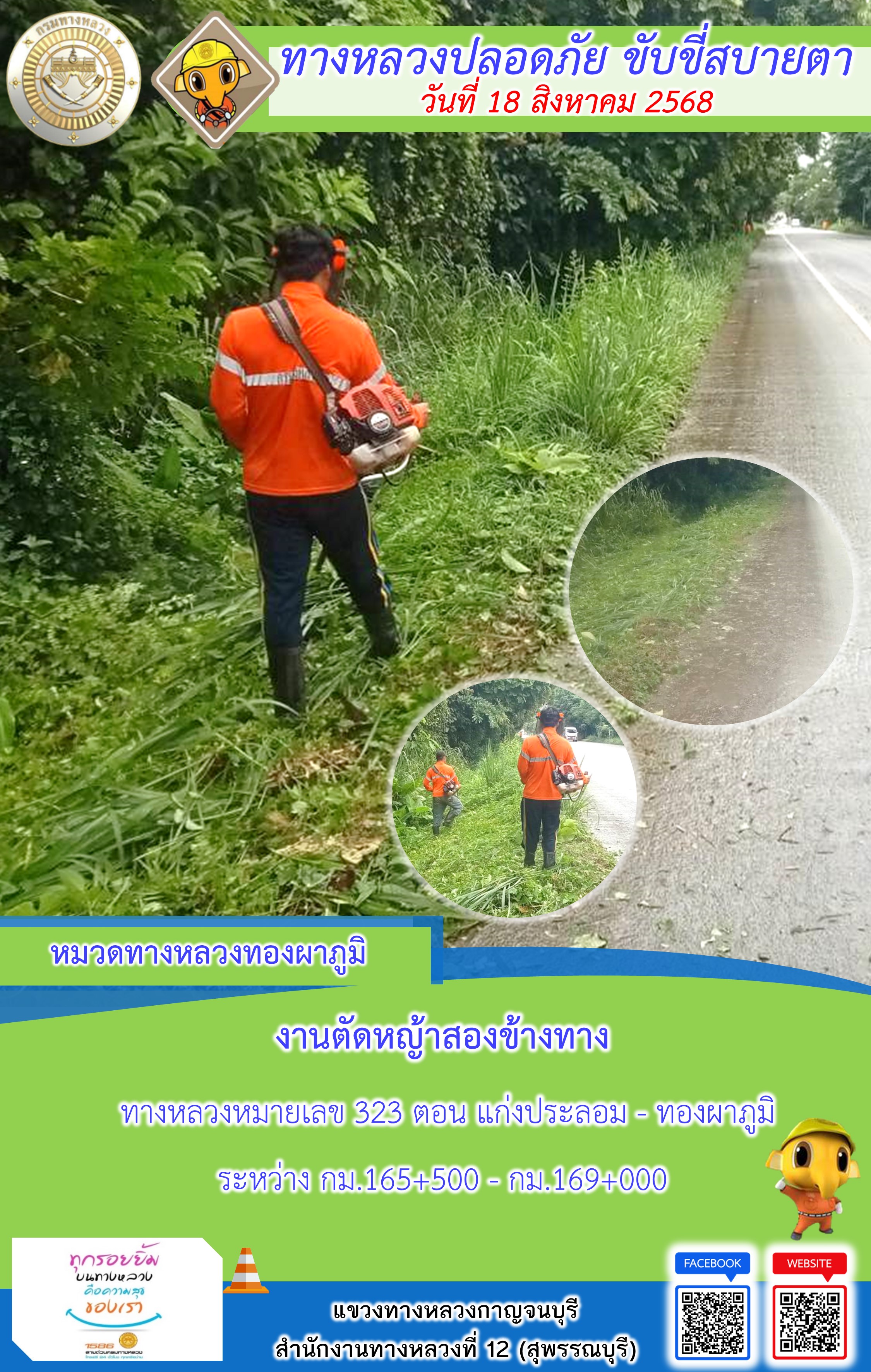 ข้อมูลภาพกิจกรรม : แขวงทางหลวงกาญจนบุรี โดยหมวดทางหลวงในสังกัด และงานอำนวยความปลอดภัยปฏิบัติงาน ประจำวันที่ 18 ส.ค. 68