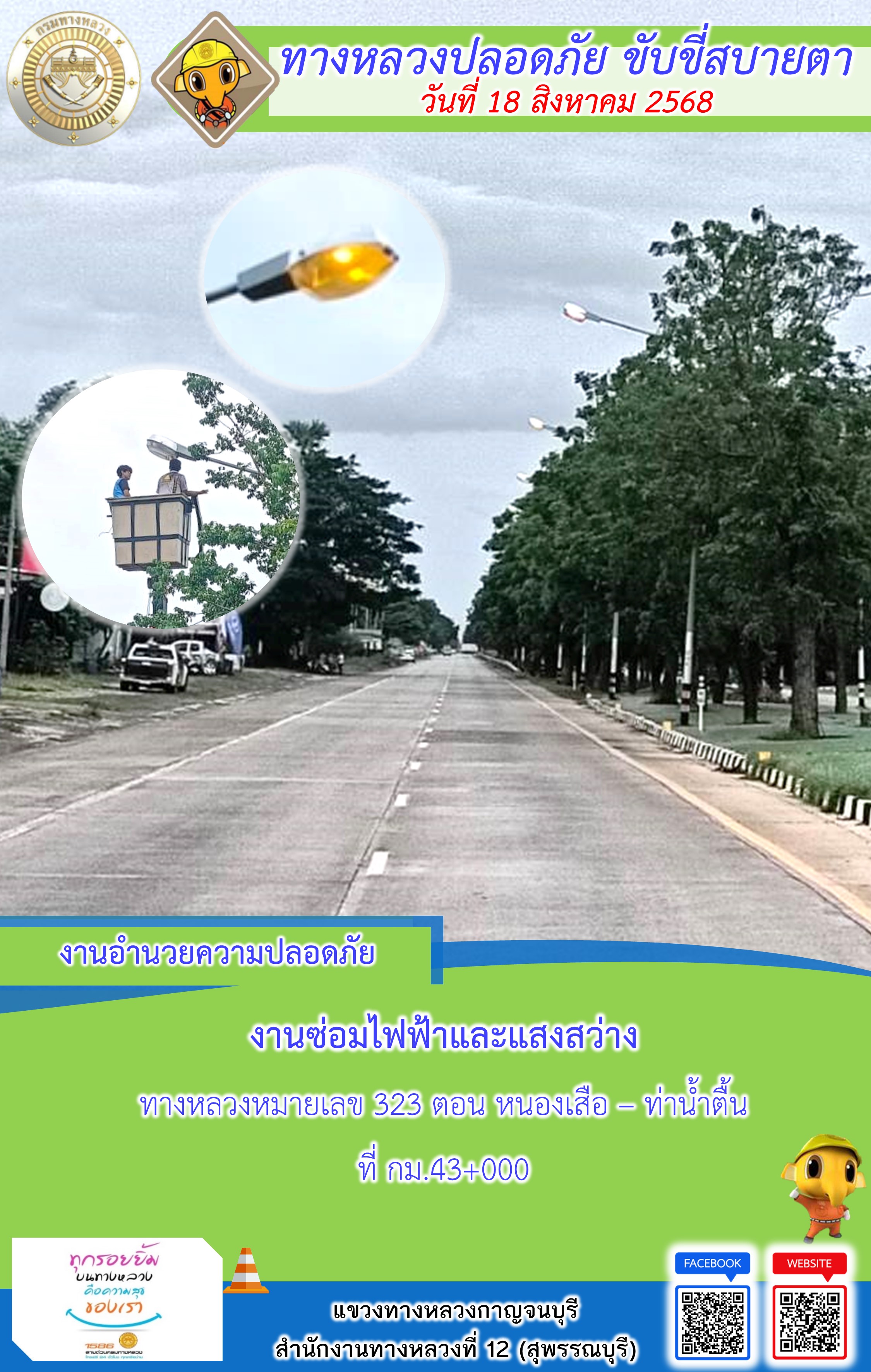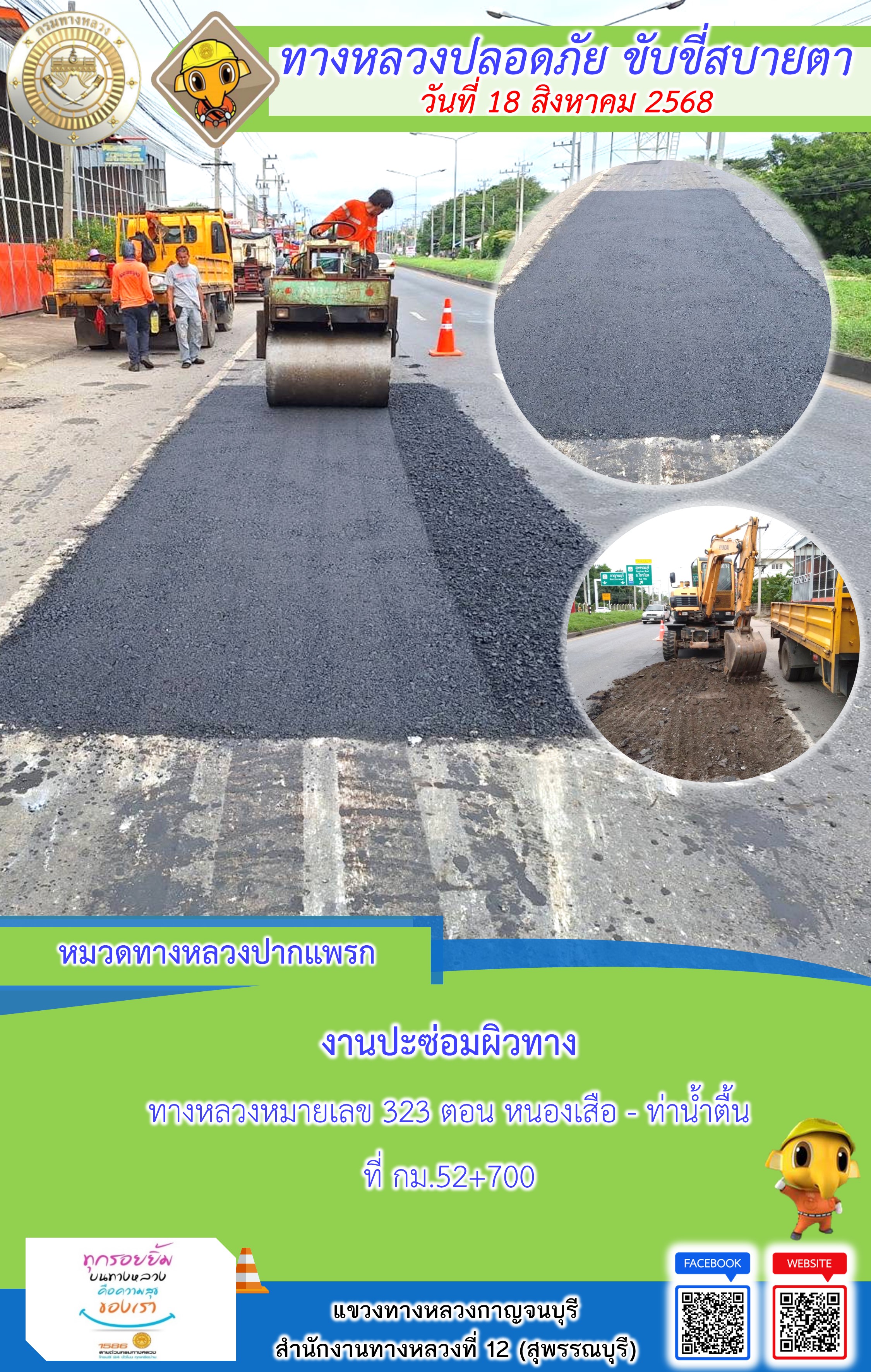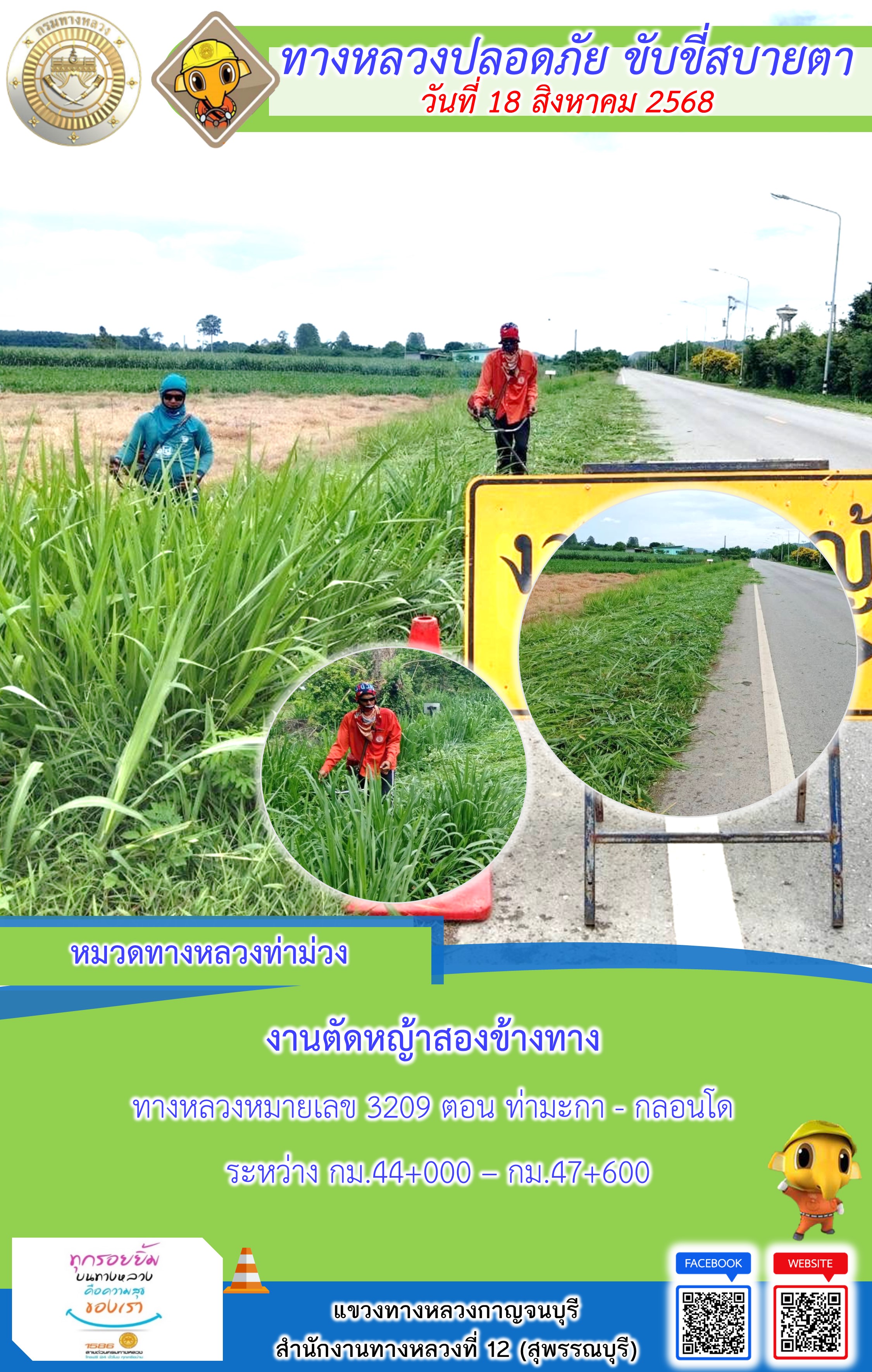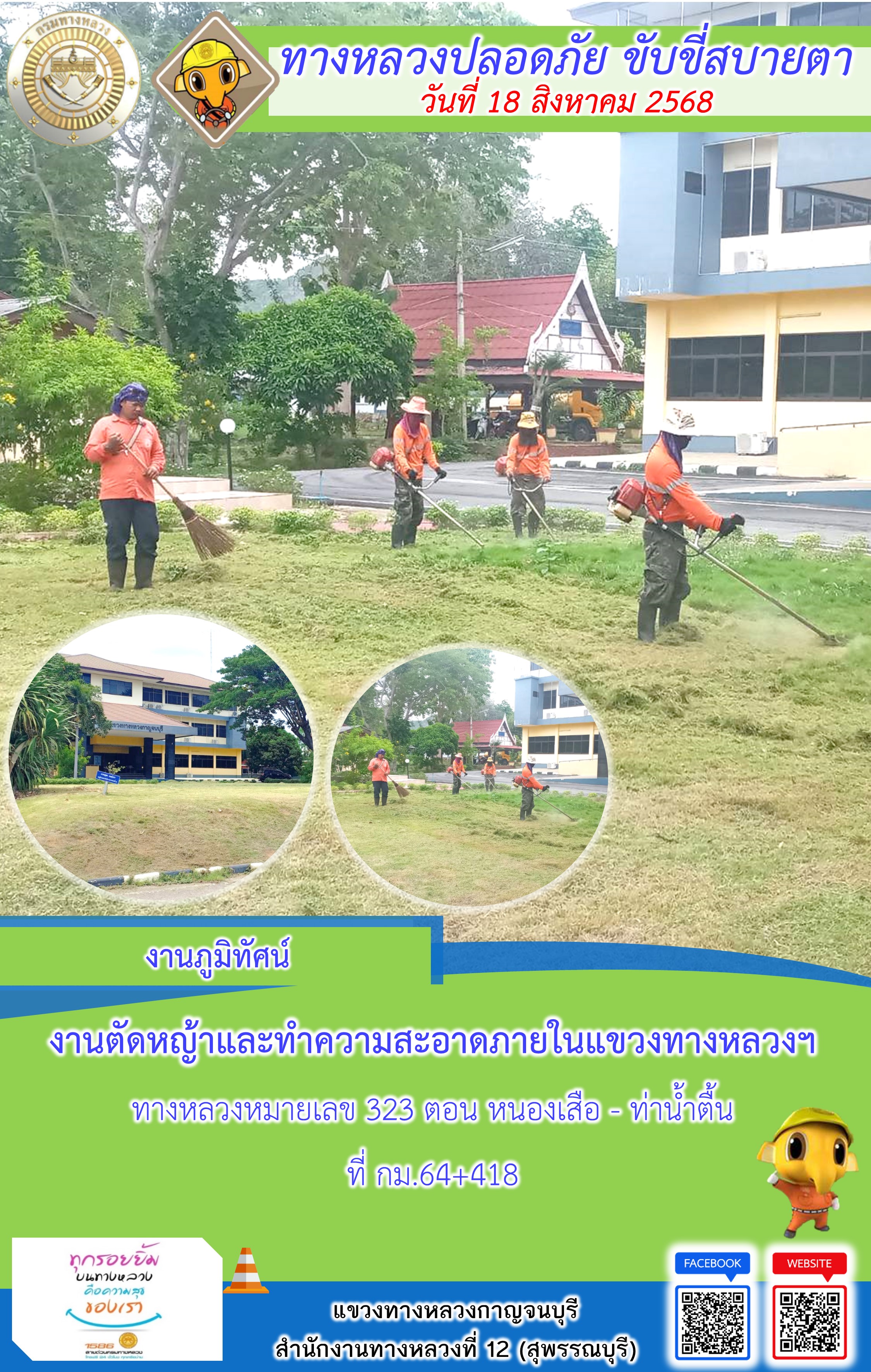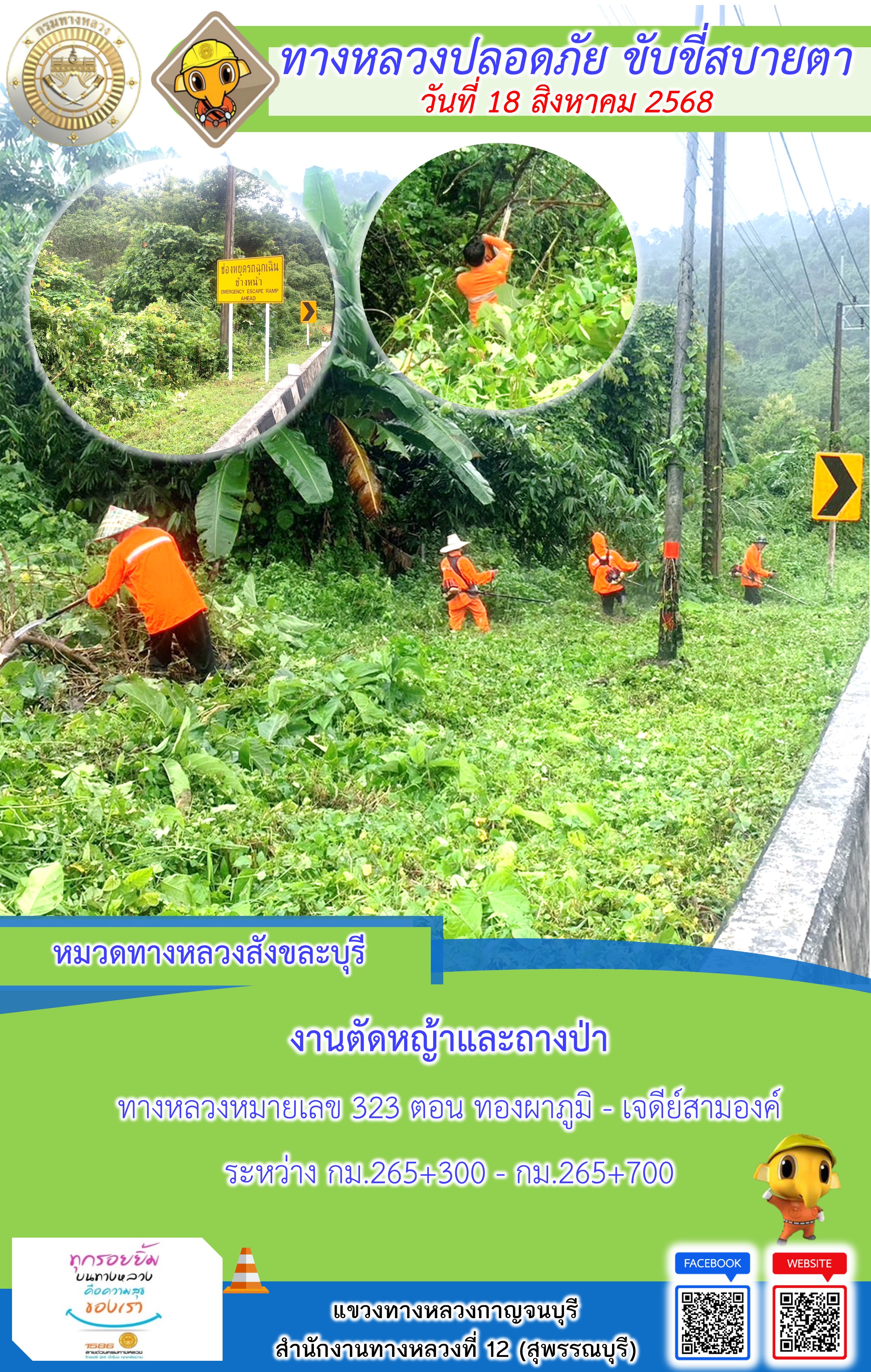 ข้อมูลภาพกิจกรรม : แขวงทางหลวงกาญจนบุรี โดยหมวดทางหลวงในสังกัด และงานอำนวยความปลอดภัยปฏิบัติงาน ประจำวันที่ 18 ส.ค. 68