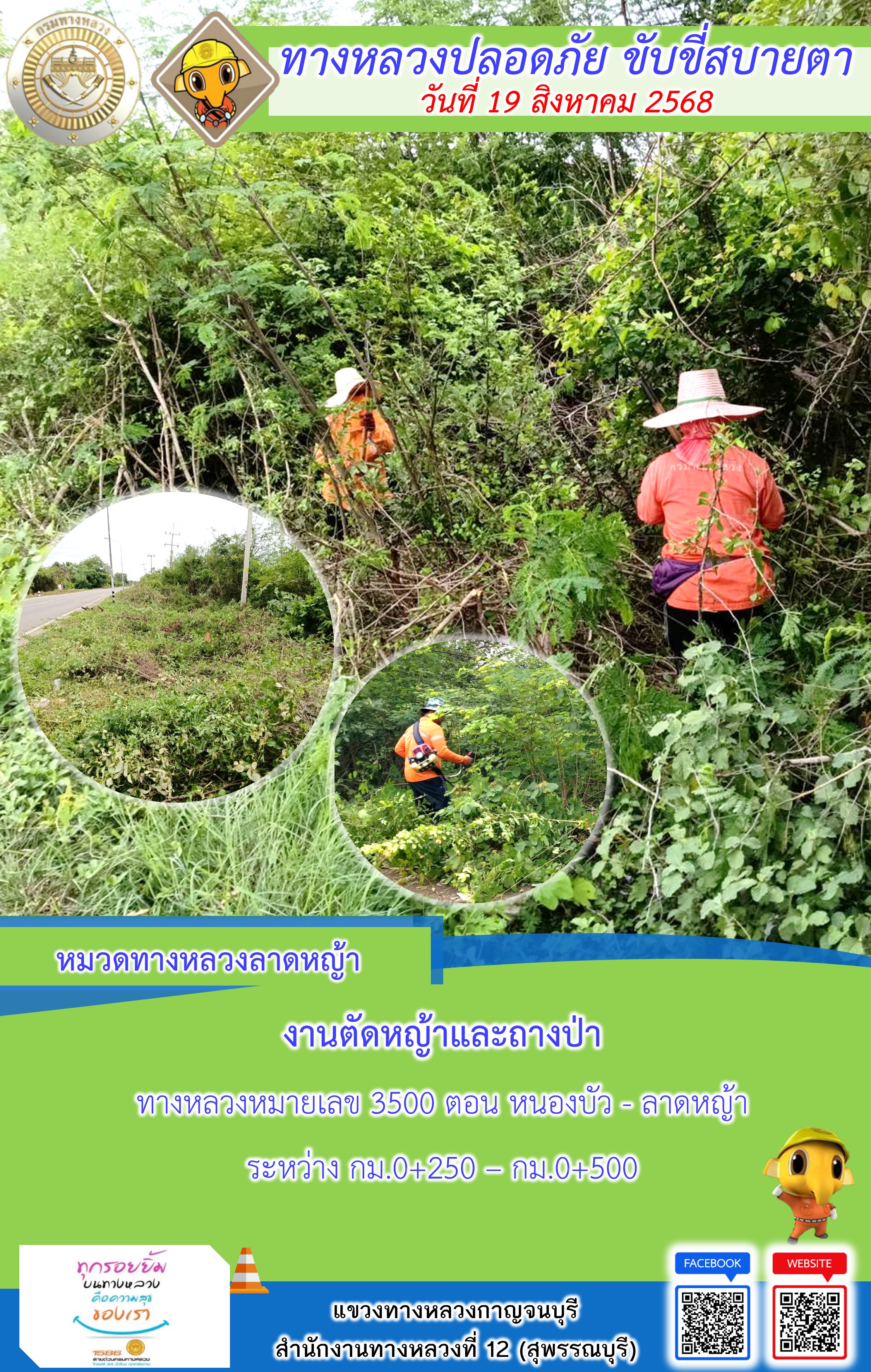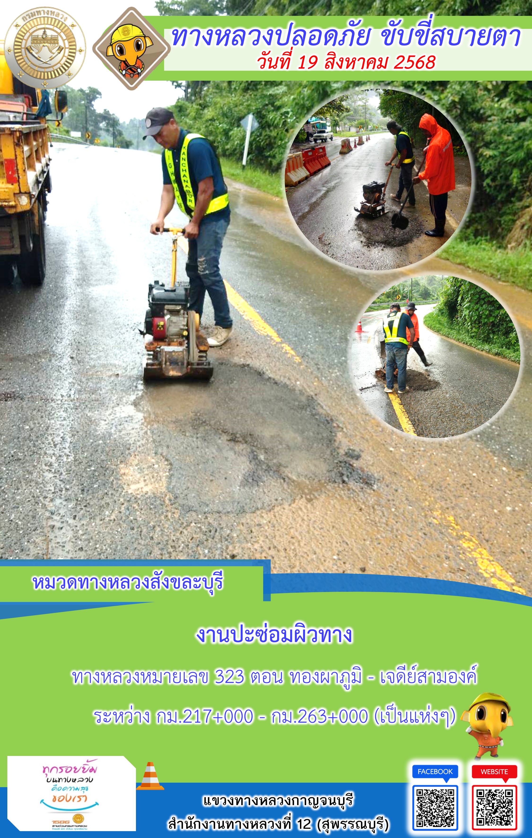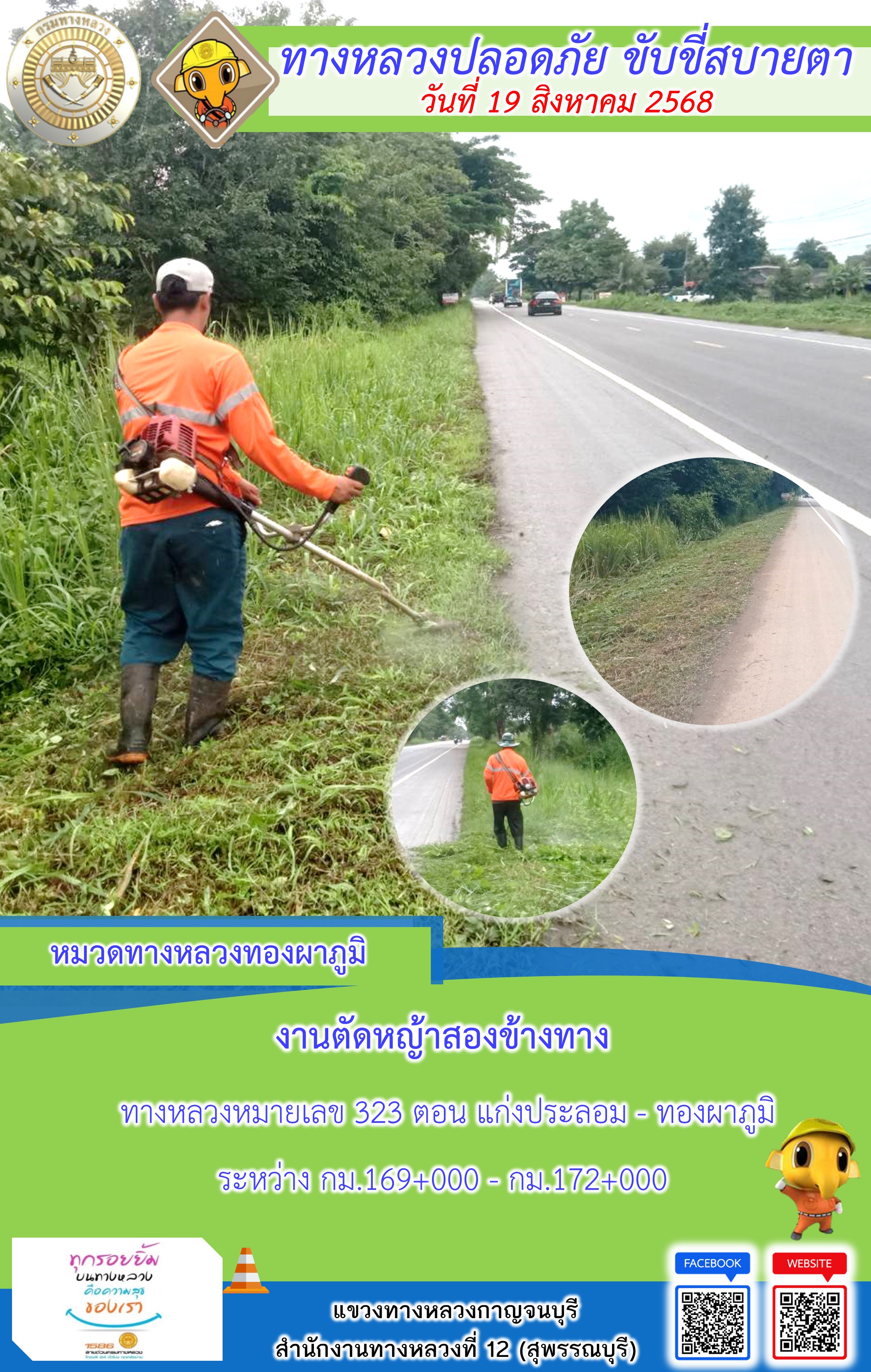 ข้อมูลภาพกิจกรรม : แขวงทางหลวงกาญจนบุรี โดยหมวดทางหลวงในสังกัด และงานอำนวยความปลอดภัยปฏิบัติงาน ประจำวันที่ 19 ส.ค. 68