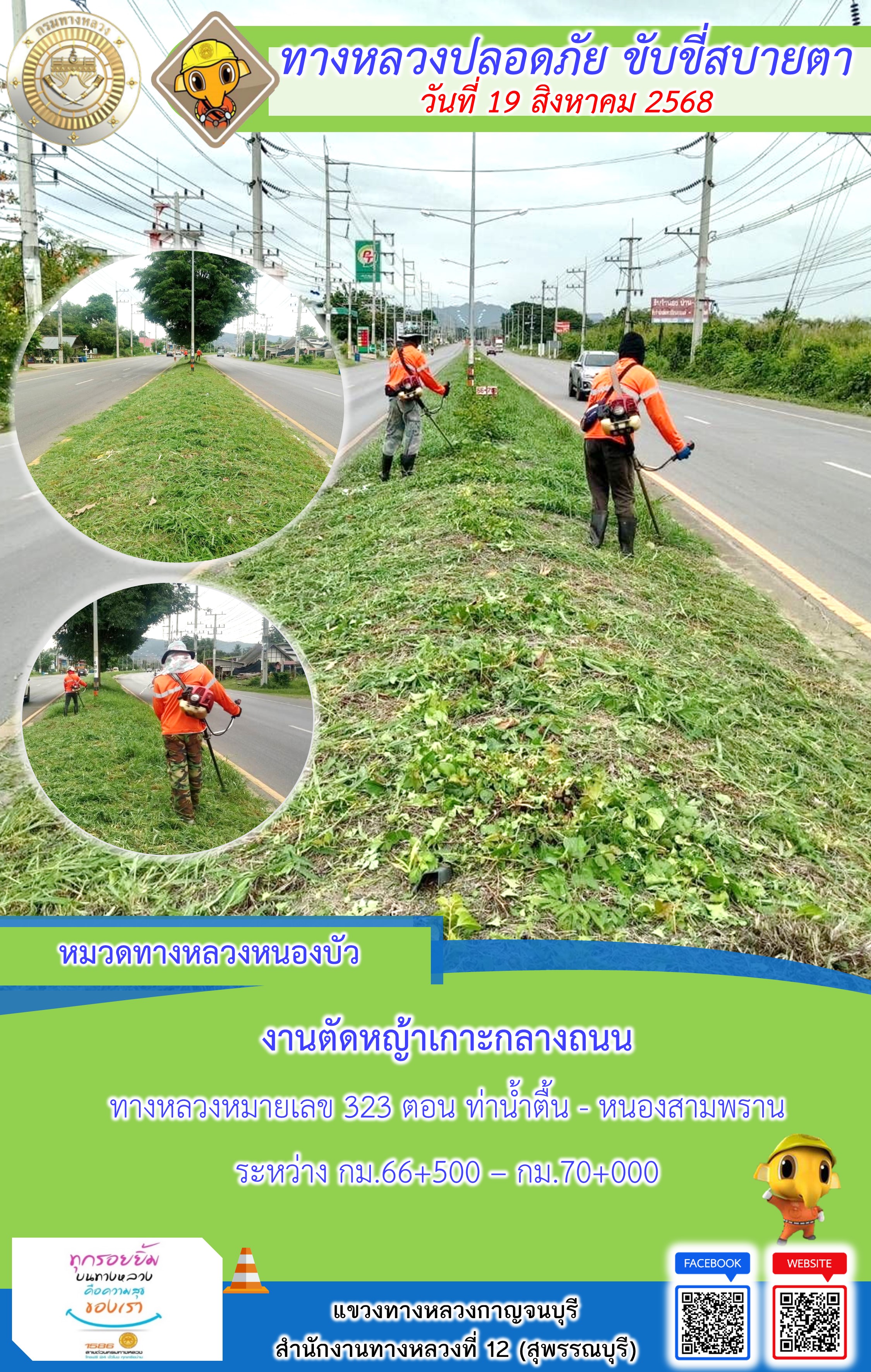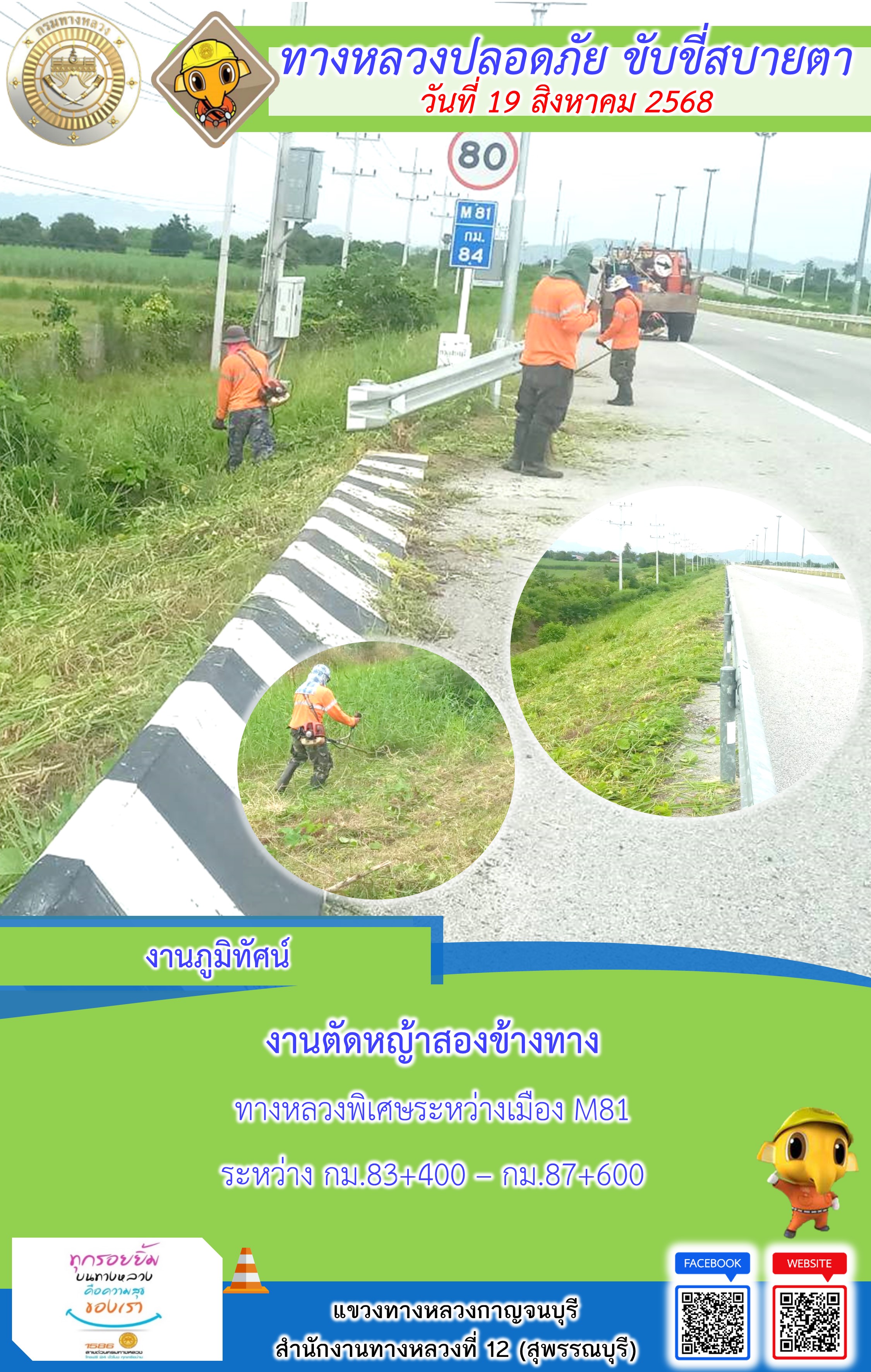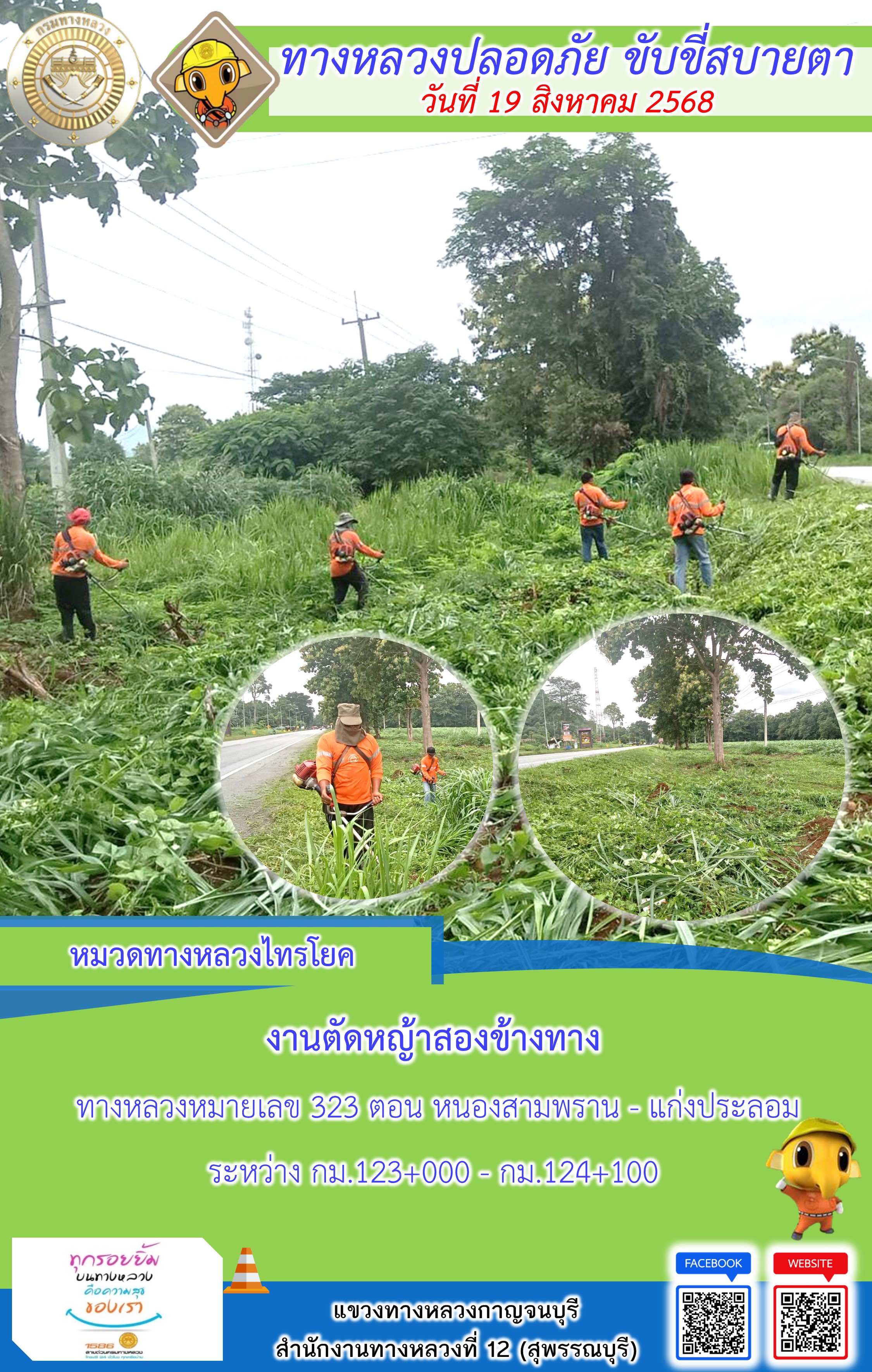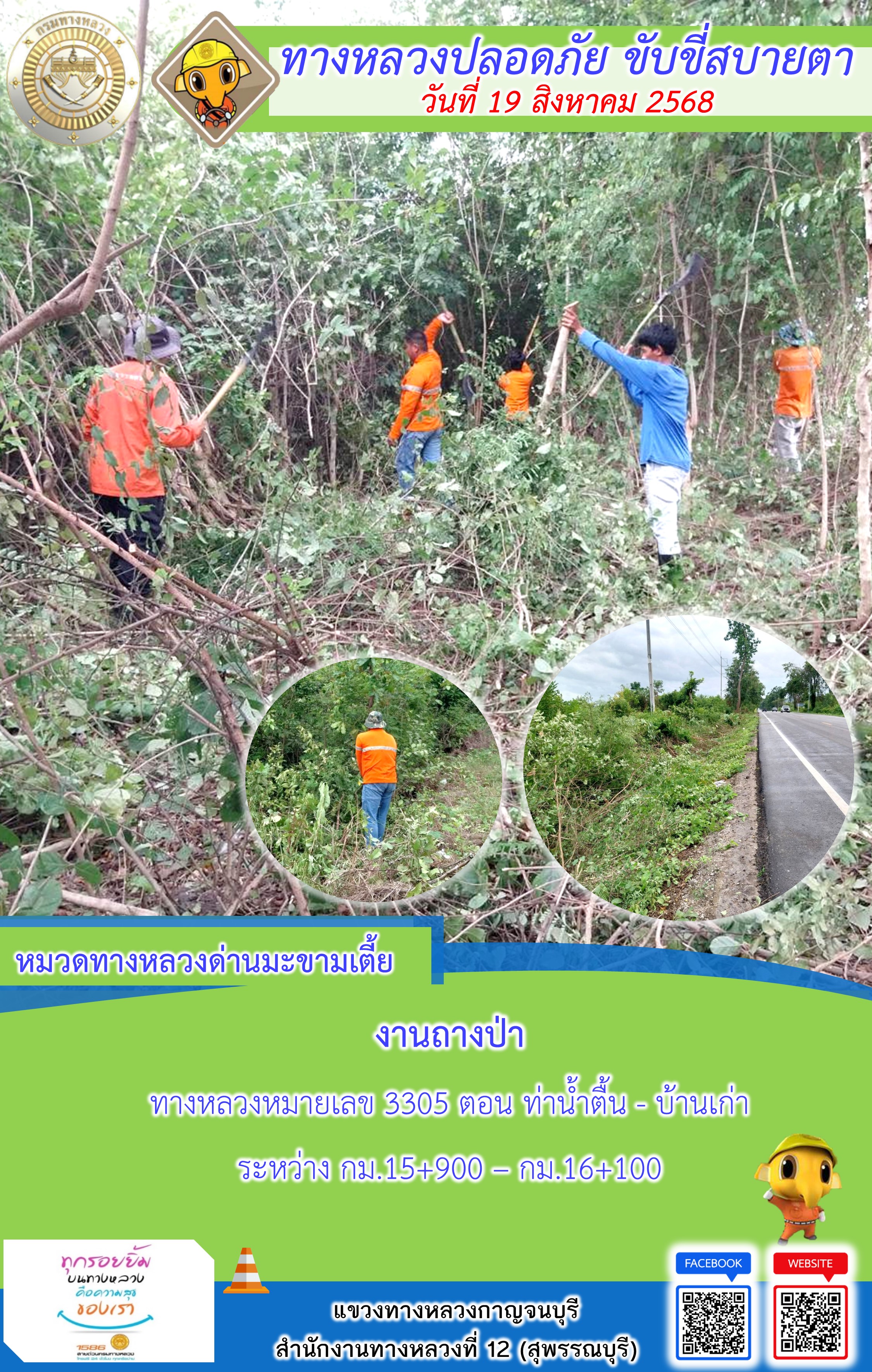 ข้อมูลภาพกิจกรรม : แขวงทางหลวงกาญจนบุรี โดยหมวดทางหลวงในสังกัด และงานอำนวยความปลอดภัยปฏิบัติงาน ประจำวันที่ 19 ส.ค. 68