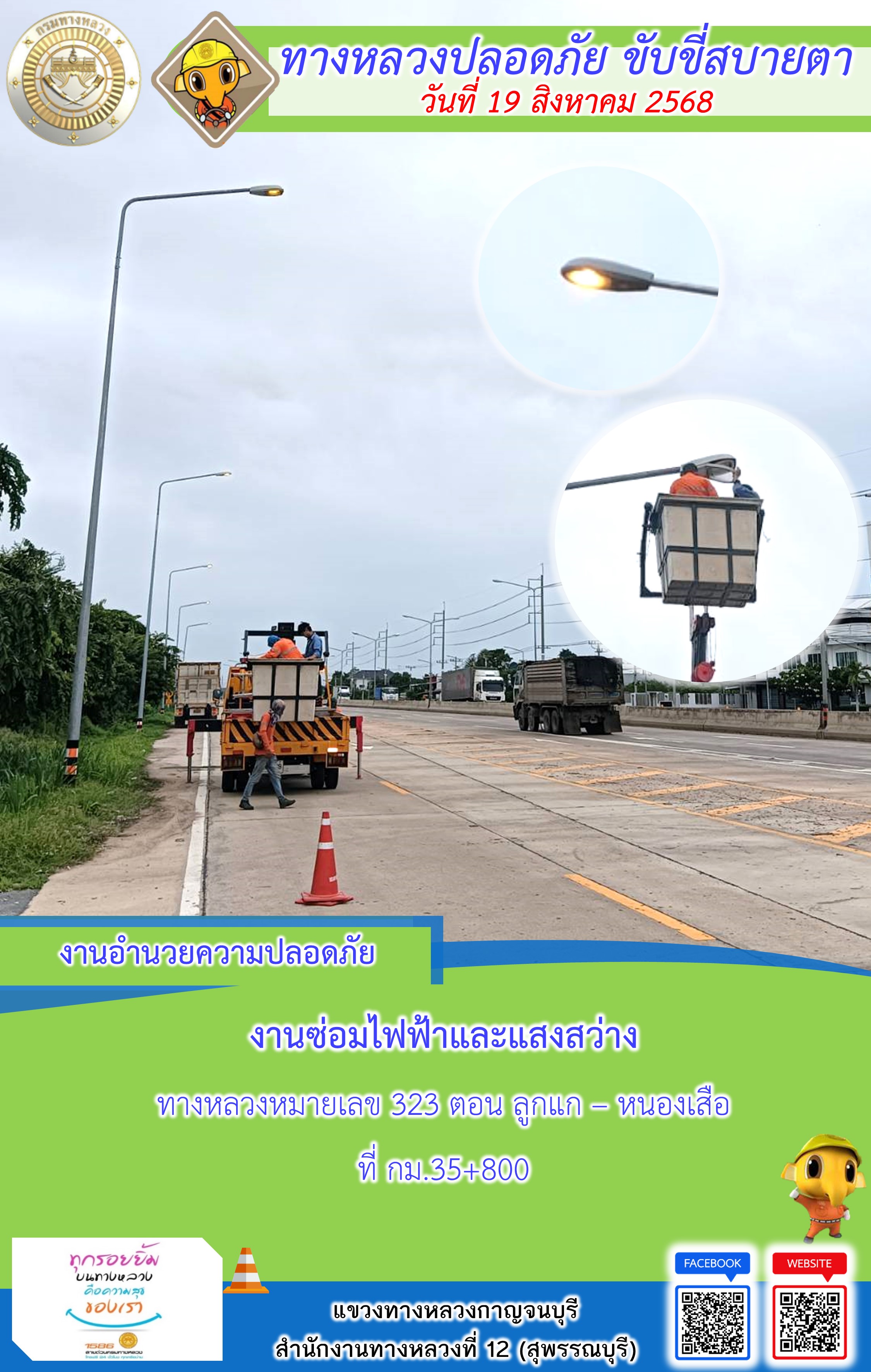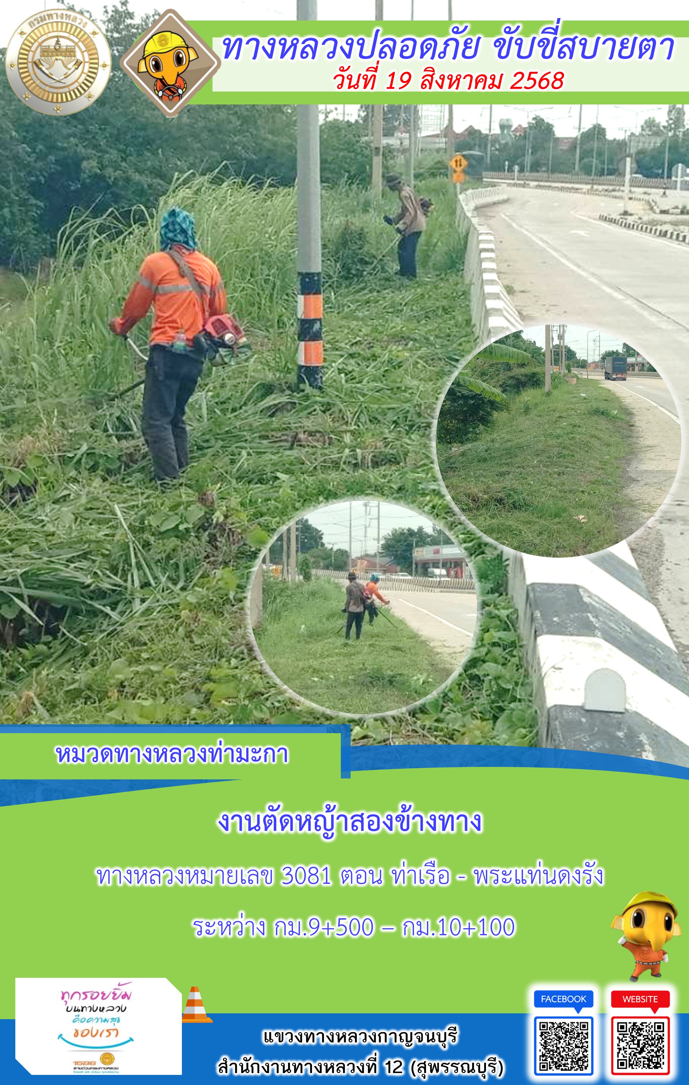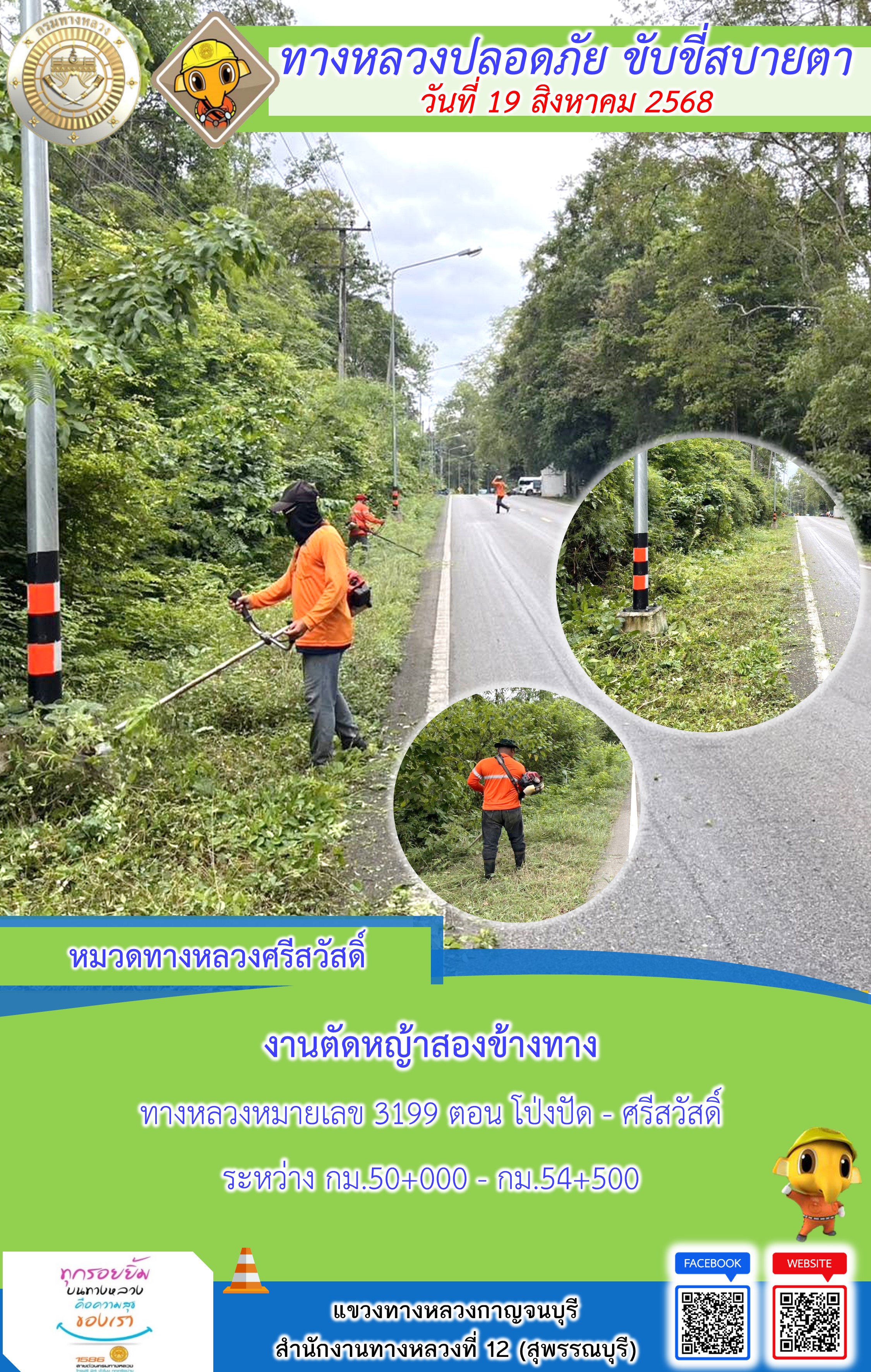 แขวงทางหลวงกาญจนบุรี โดยหมวดทางหลวงในสังกัด และงานอำนวยความปลอดภัยปฏิบัติงาน ประจำวันที่ 19 ส.ค. 68