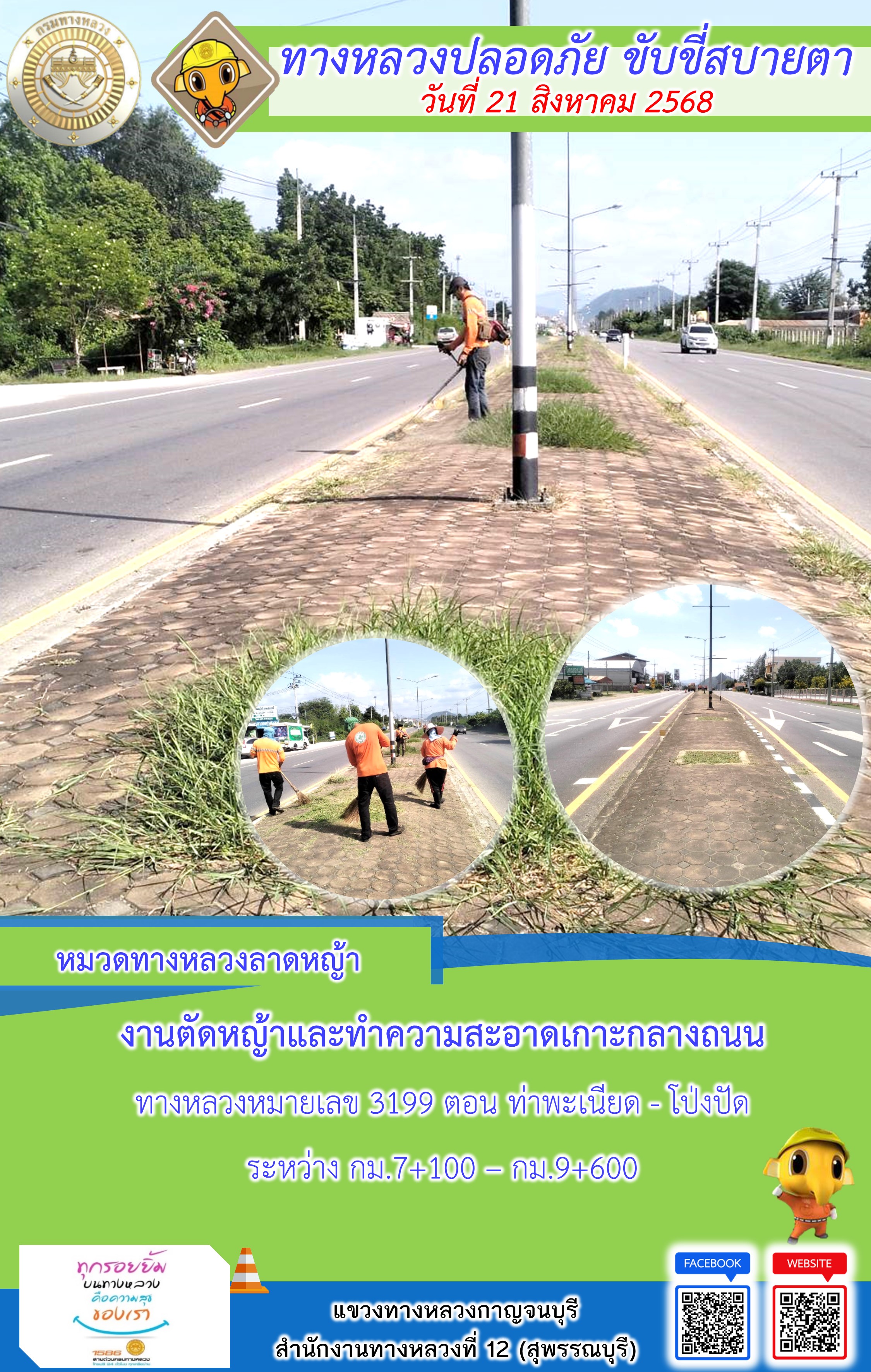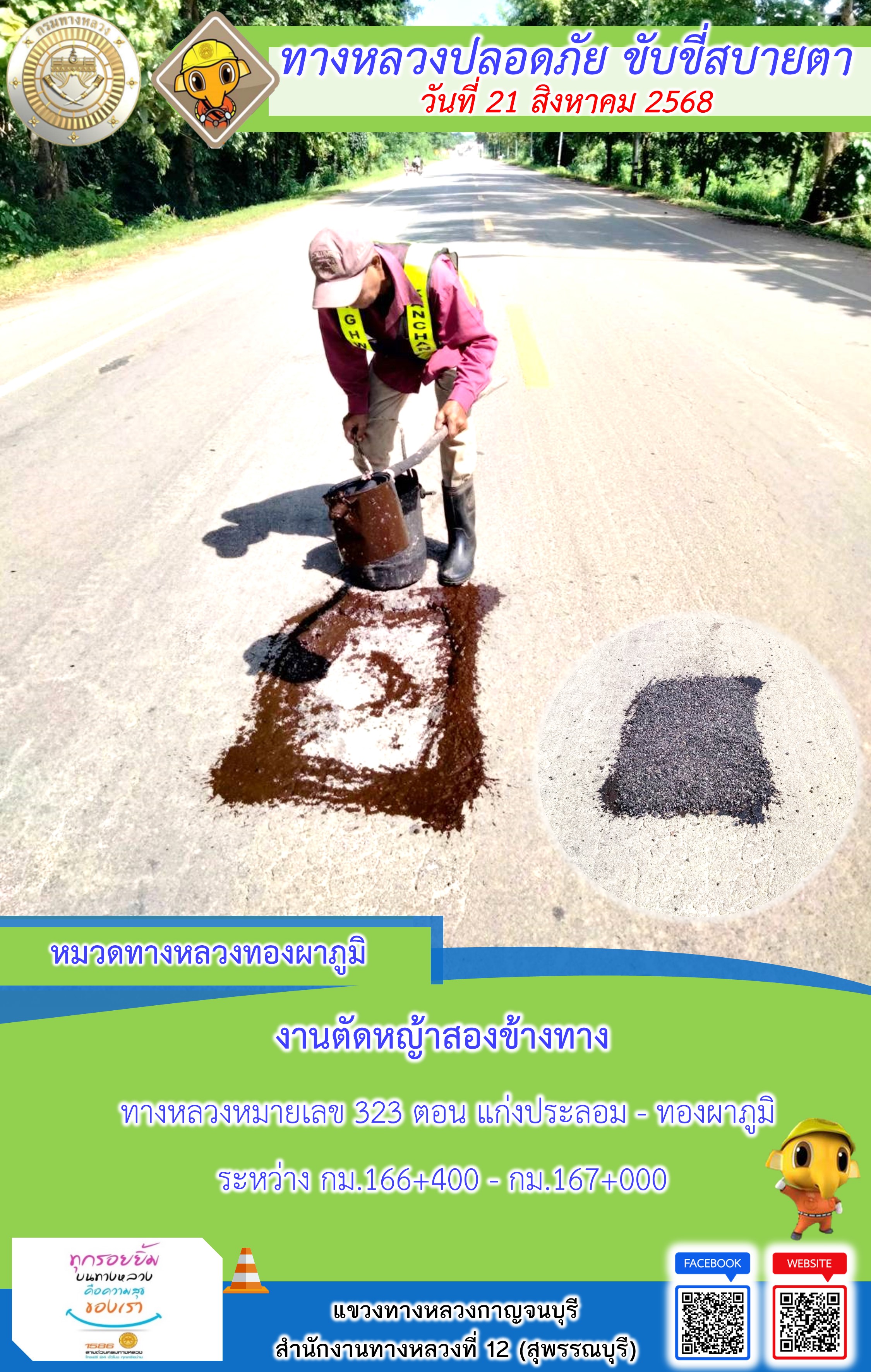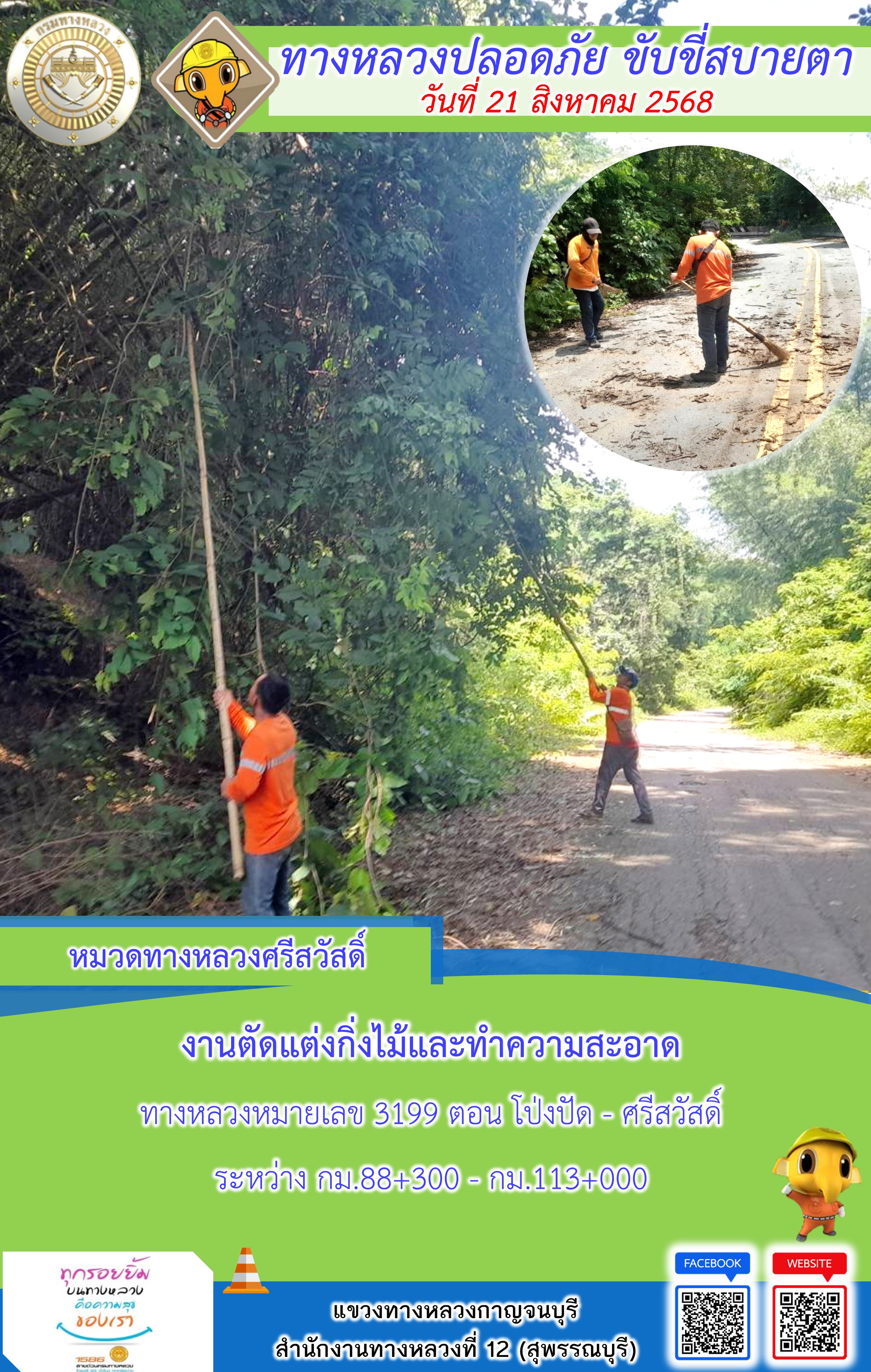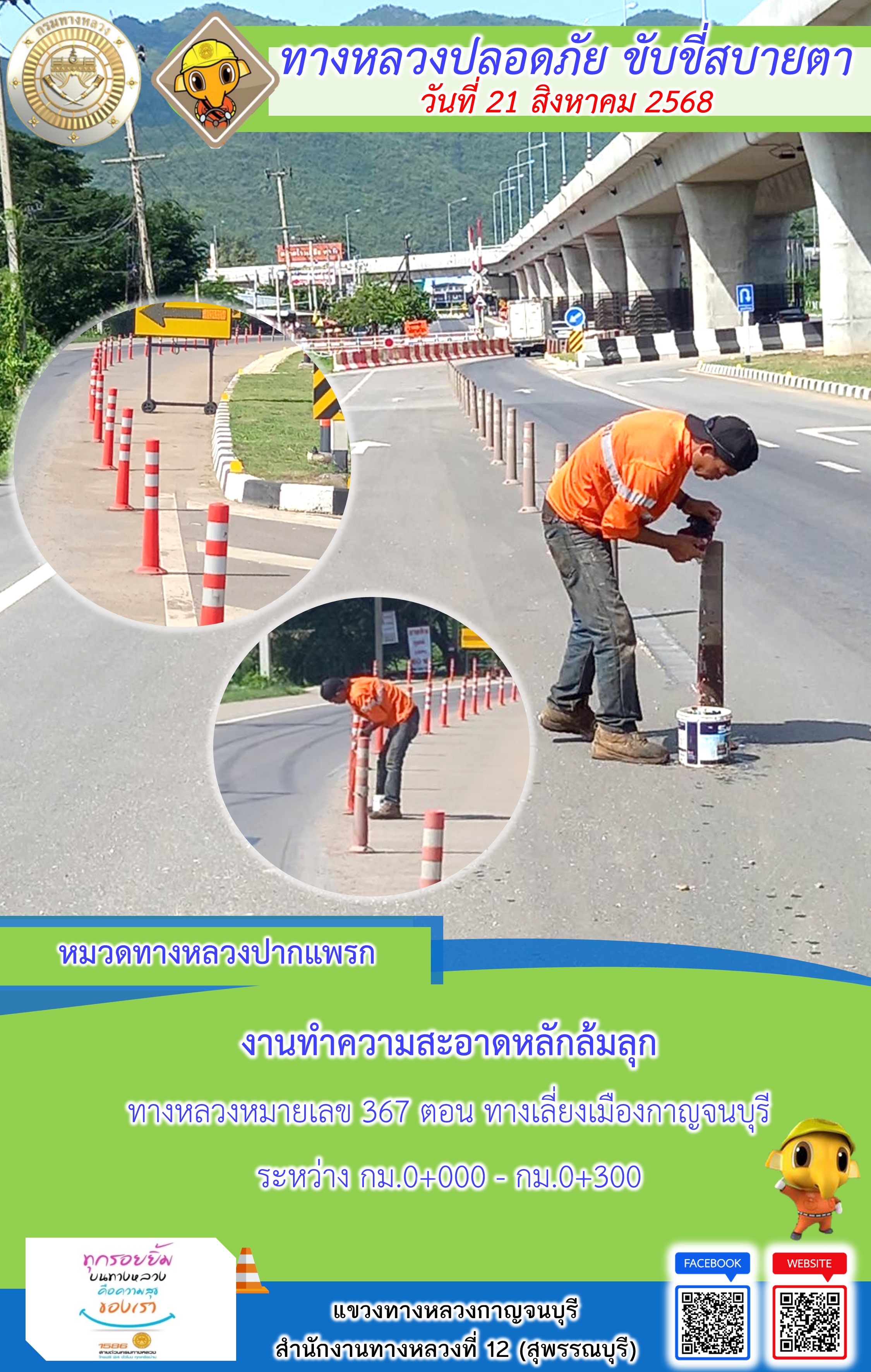 ข้อมูลภาพกิจกรรม : แขวงทางหลวงกาญจนบุรี โดยหมวดทางหลวงในสังกัด และงานอำนวยความปลอดภัยปฏิบัติงาน ประจำวันที่ 21 ส.ค. 68
