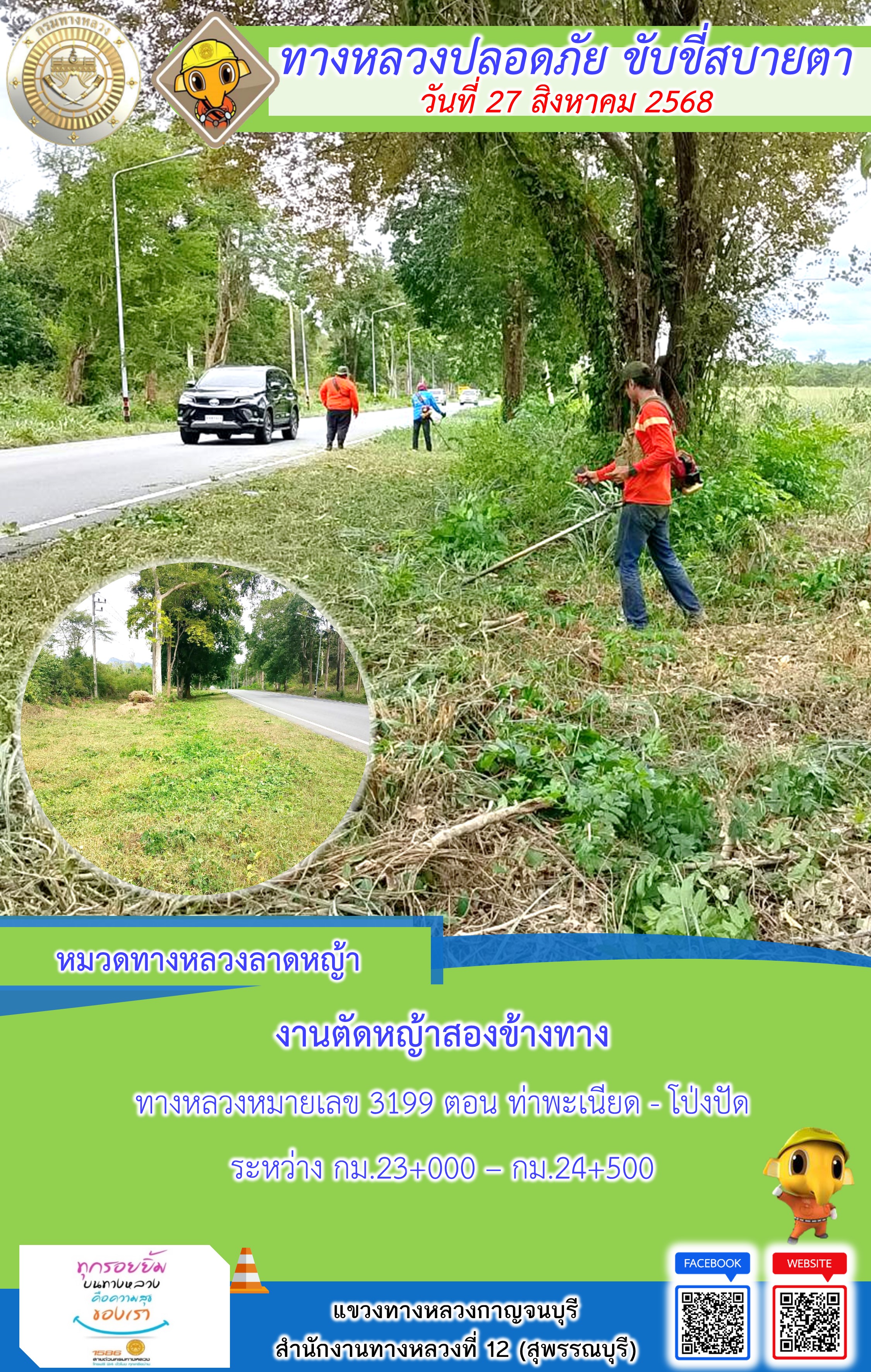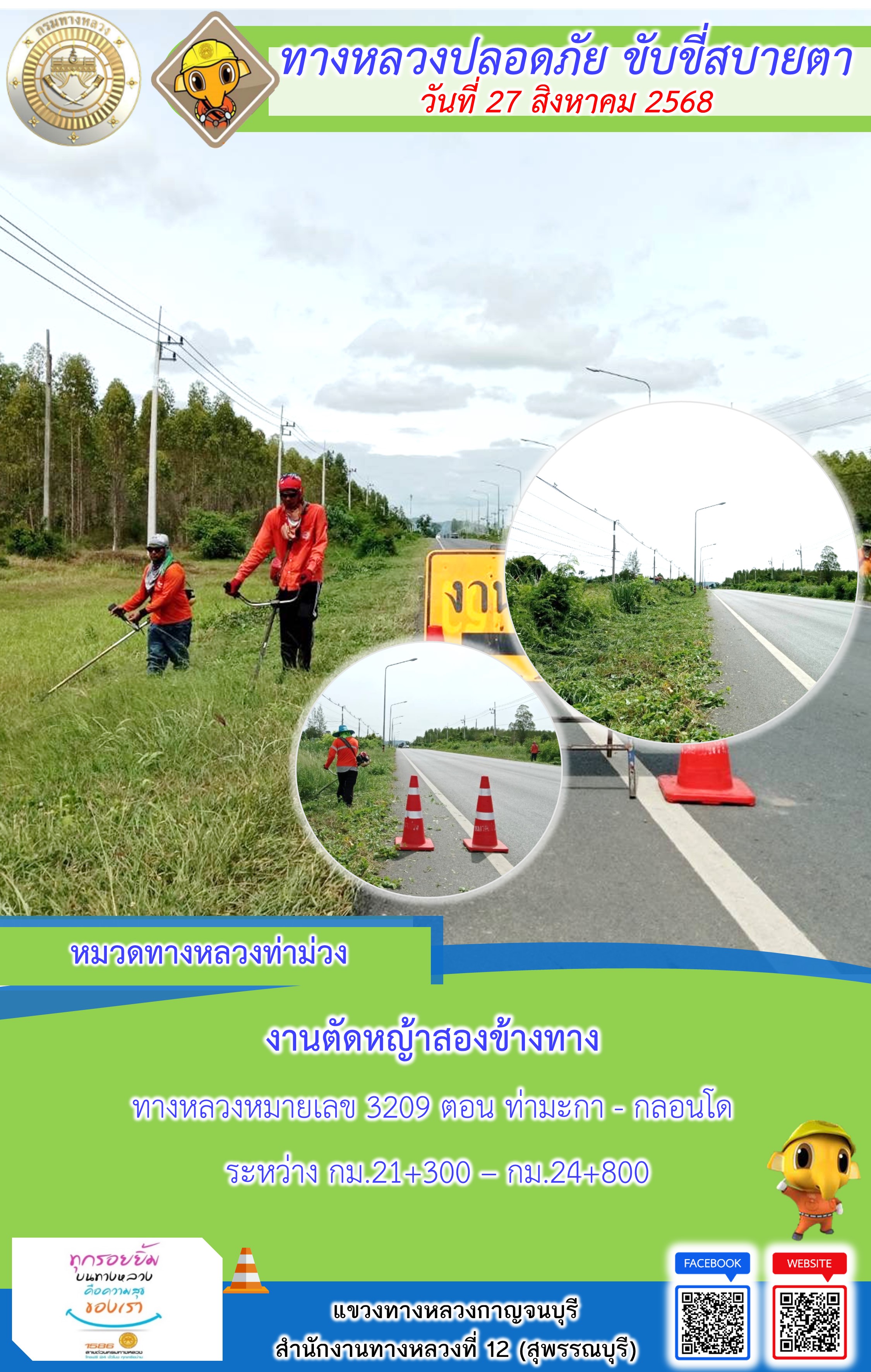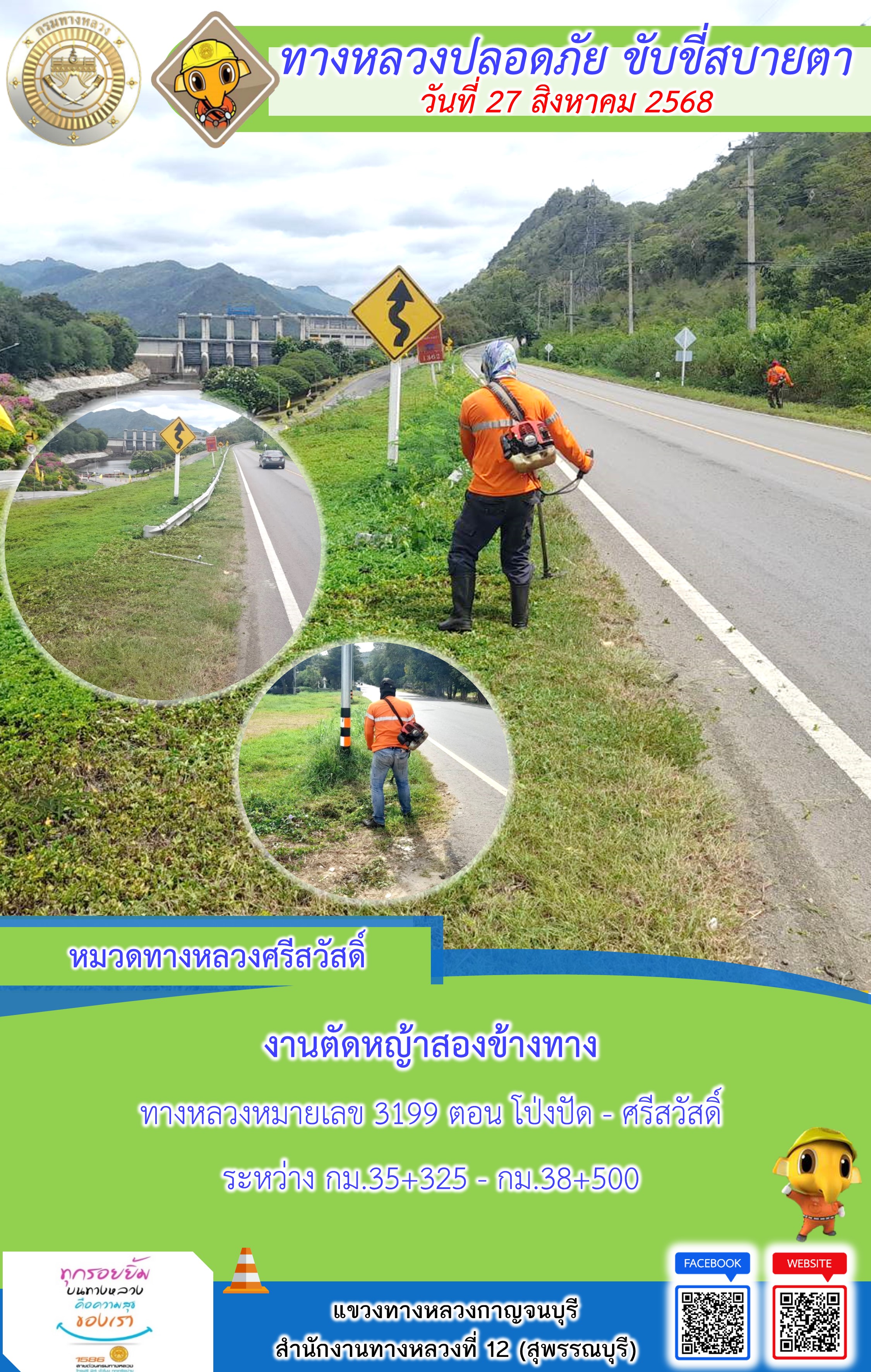 แขวงทางหลวงกาญจนบุรี โดยหมวดทางหลวงในสังกัด และงานอำนวยความปลอดภัยปฏิบัติงาน ประจำวันที่ 27 ส.ค. 68