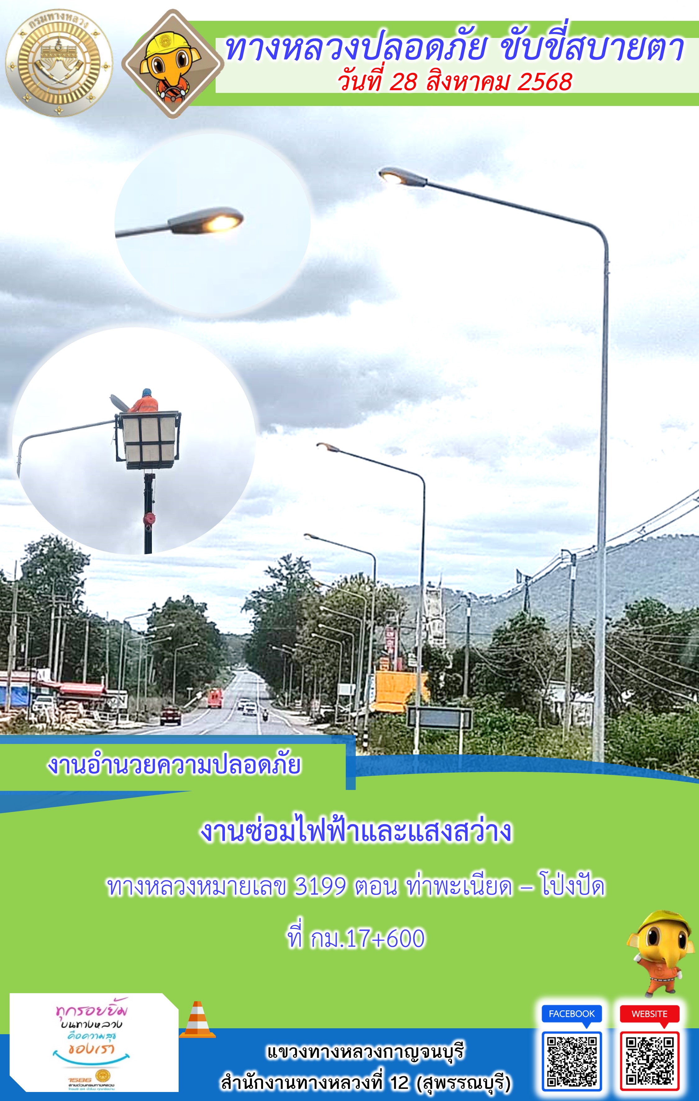 แขวงทางหลวงกาญจนบุรี โดยหมวดทางหลวงในสังกัด และงานอำนวยความปลอดภัยปฏิบัติงาน ประจำวันที่ 28 ส.ค. 68