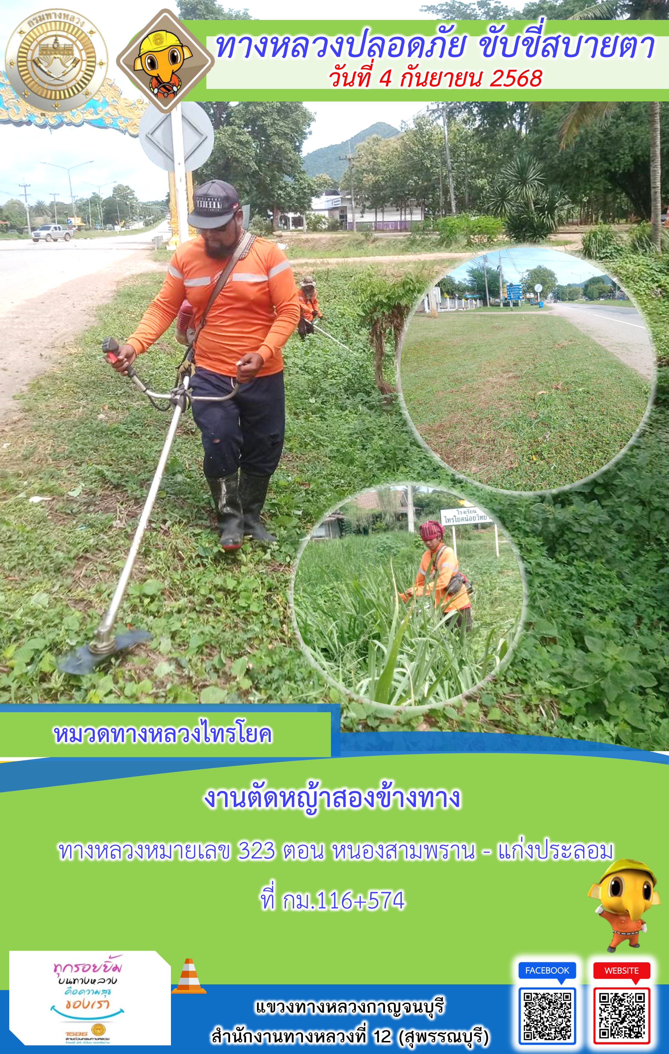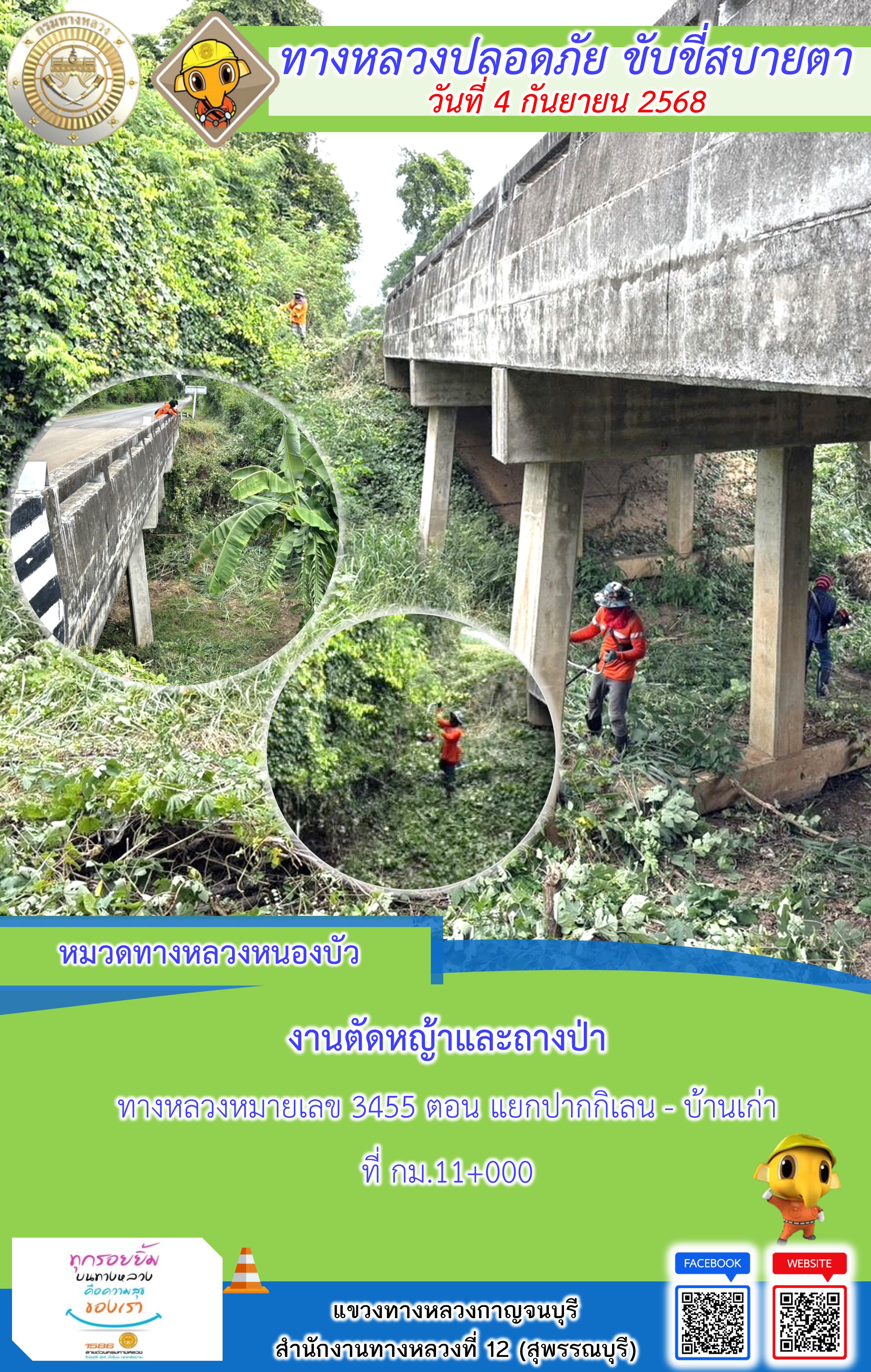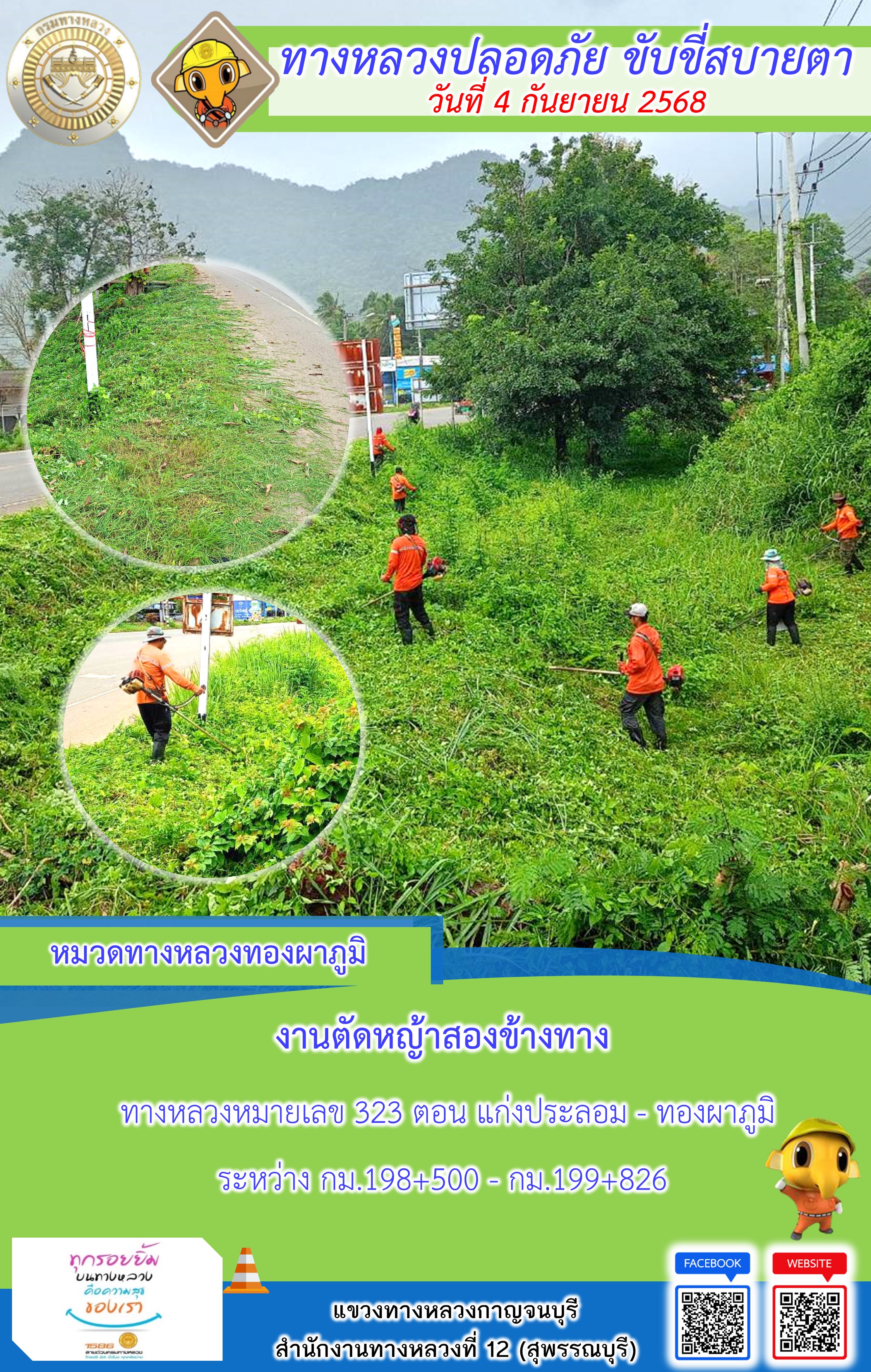 ข้อมูลภาพกิจกรรม : แขวงทางหลวงกาญจนบุรี โดยหมวดทางหลวงในสังกัด และงานอำนวยความปลอดภัยปฏิบัติงาน ประจำวันที่ 4 ก.ย. 68