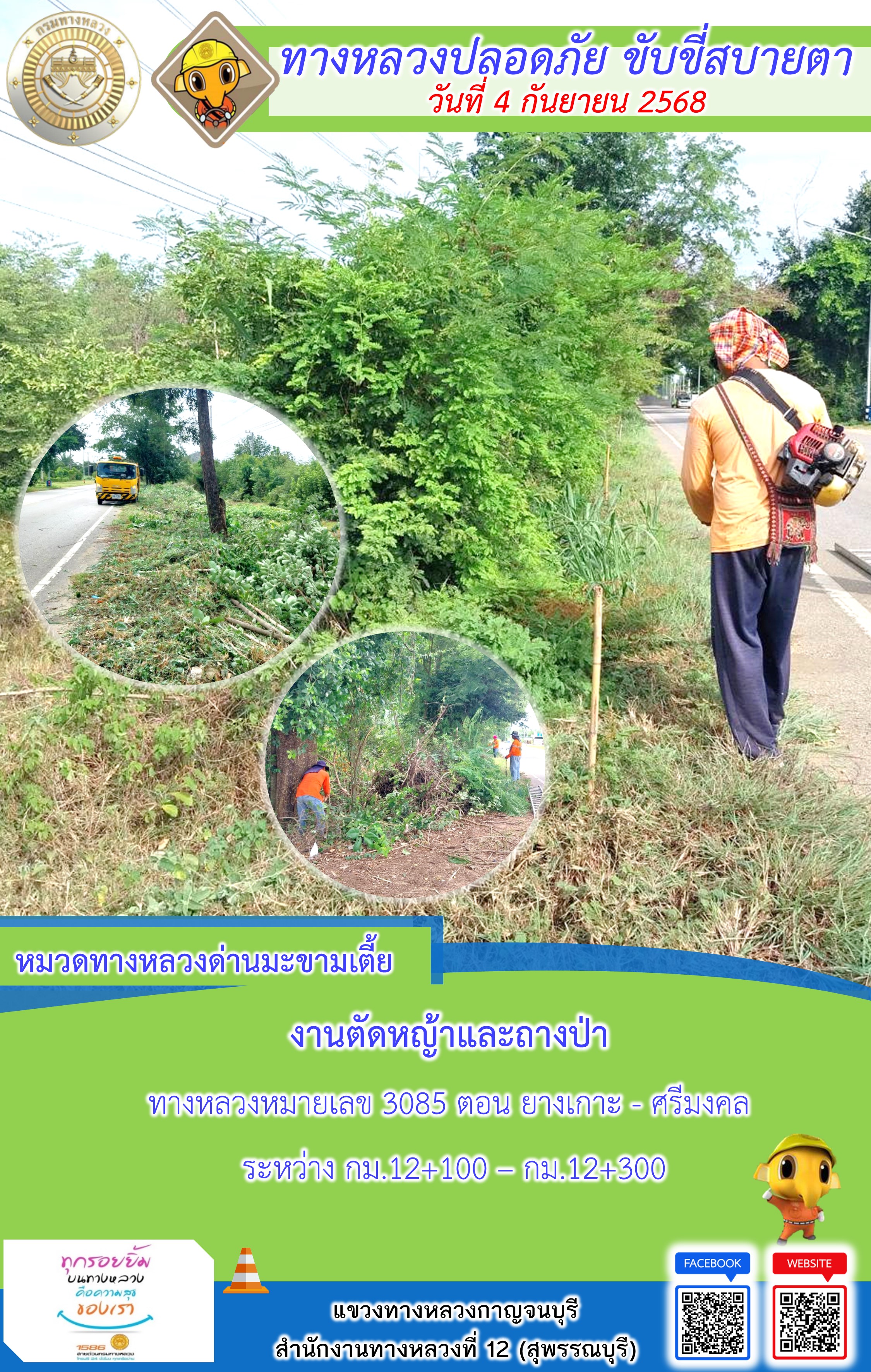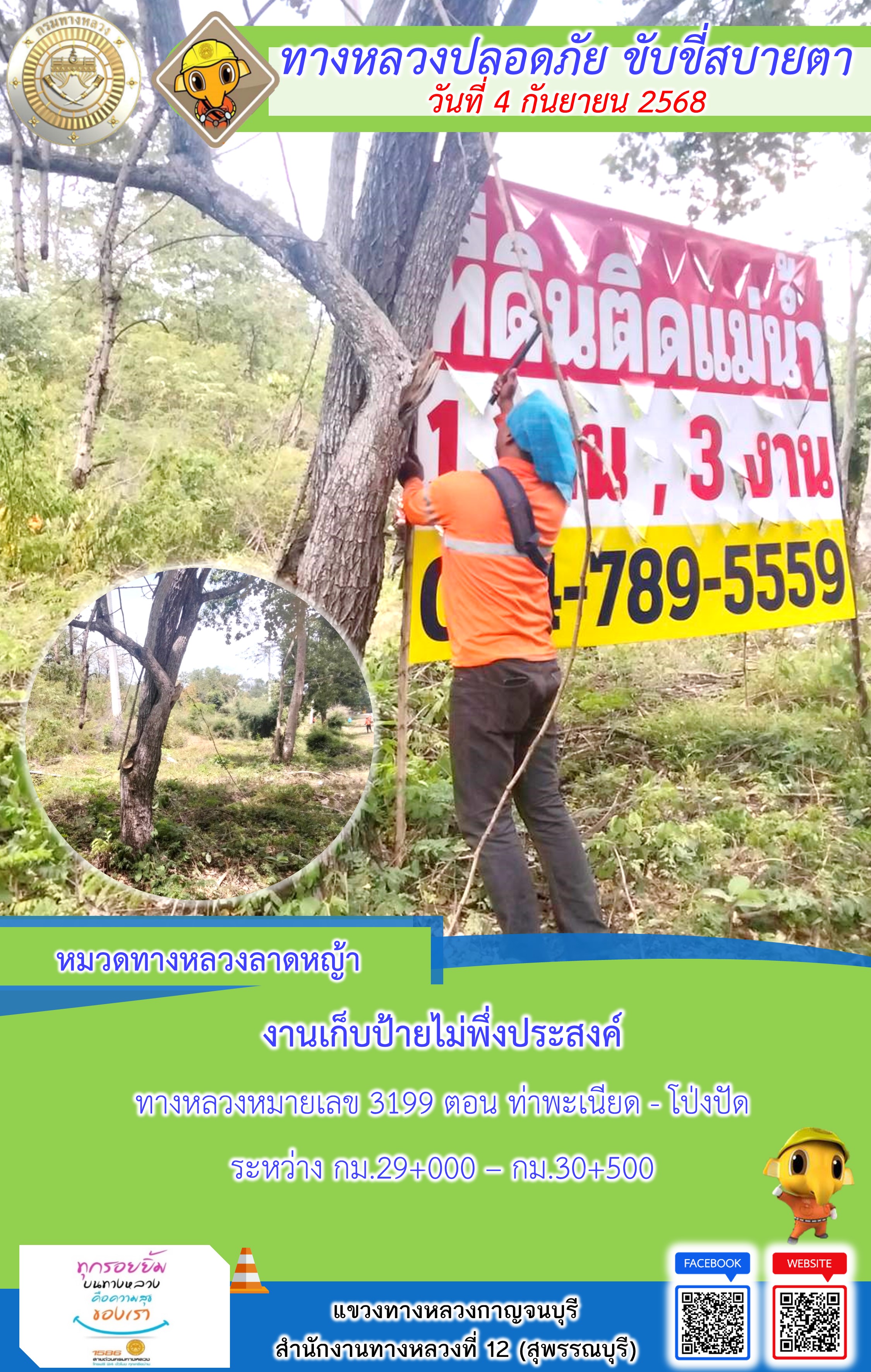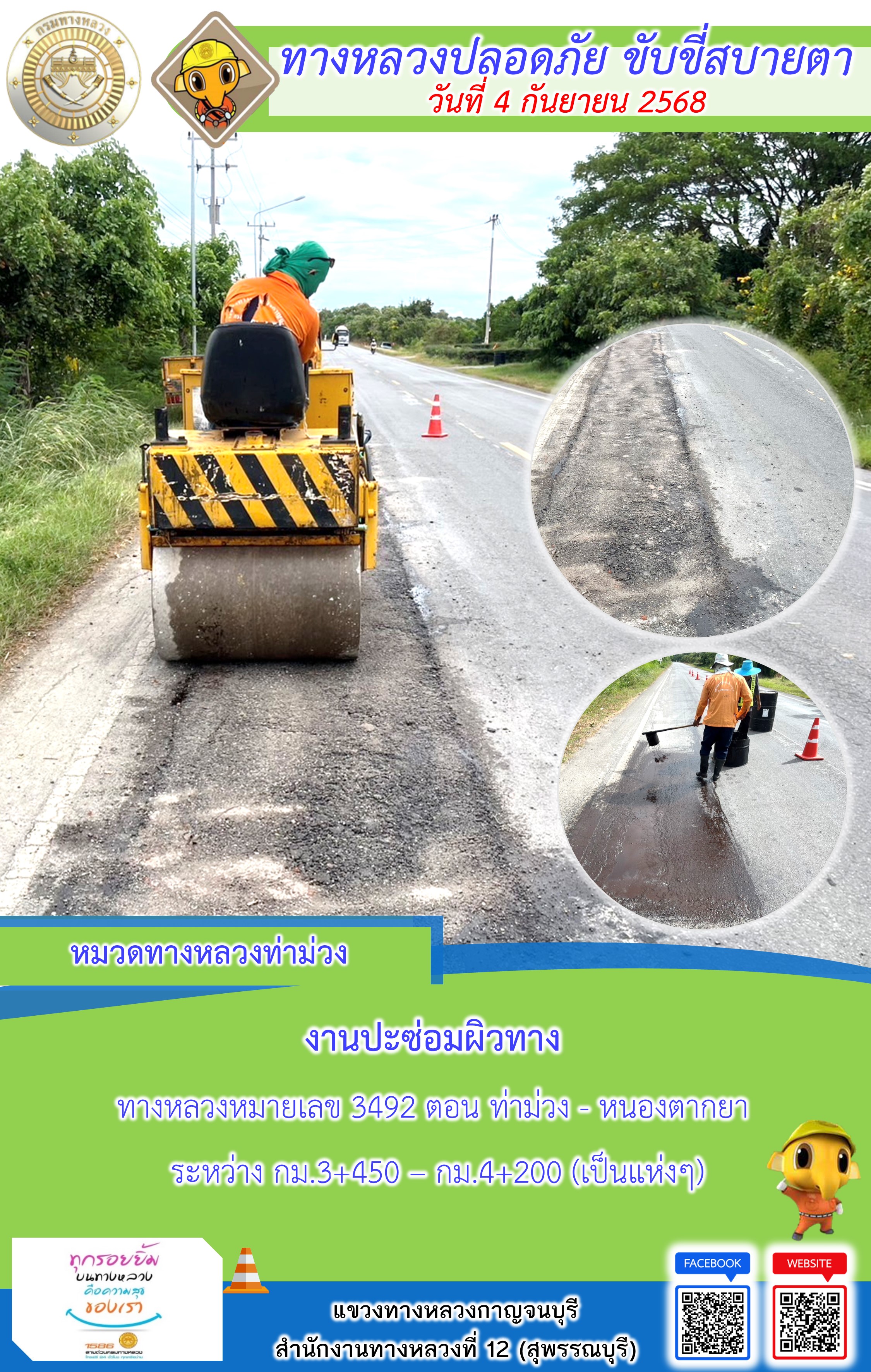 ข้อมูลภาพกิจกรรม : แขวงทางหลวงกาญจนบุรี โดยหมวดทางหลวงในสังกัด และงานอำนวยความปลอดภัยปฏิบัติงาน ประจำวันที่ 4 ก.ย. 68