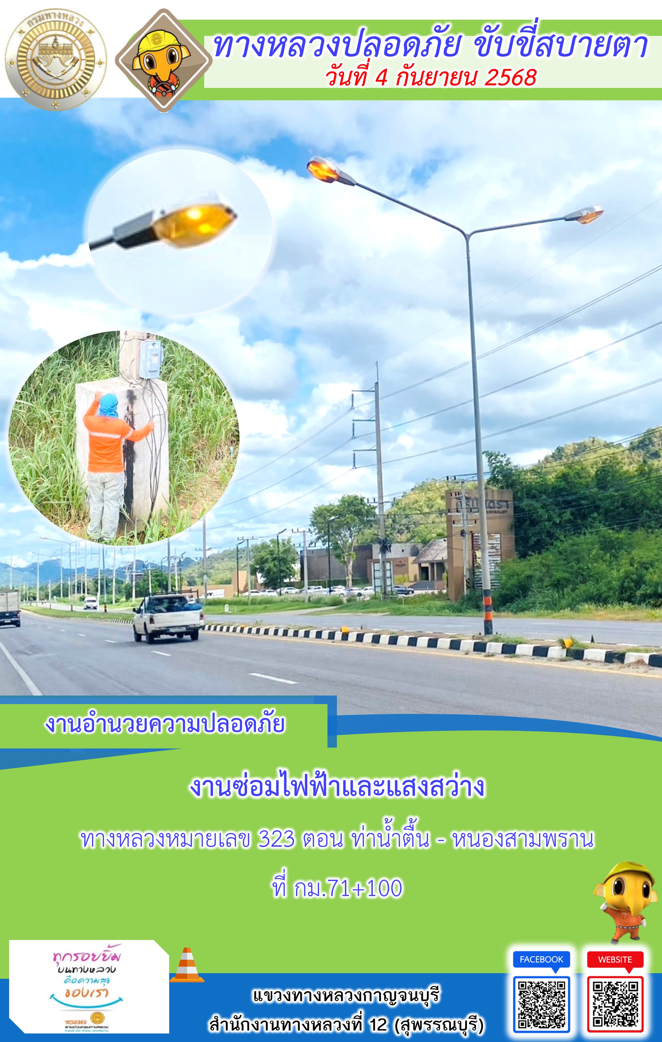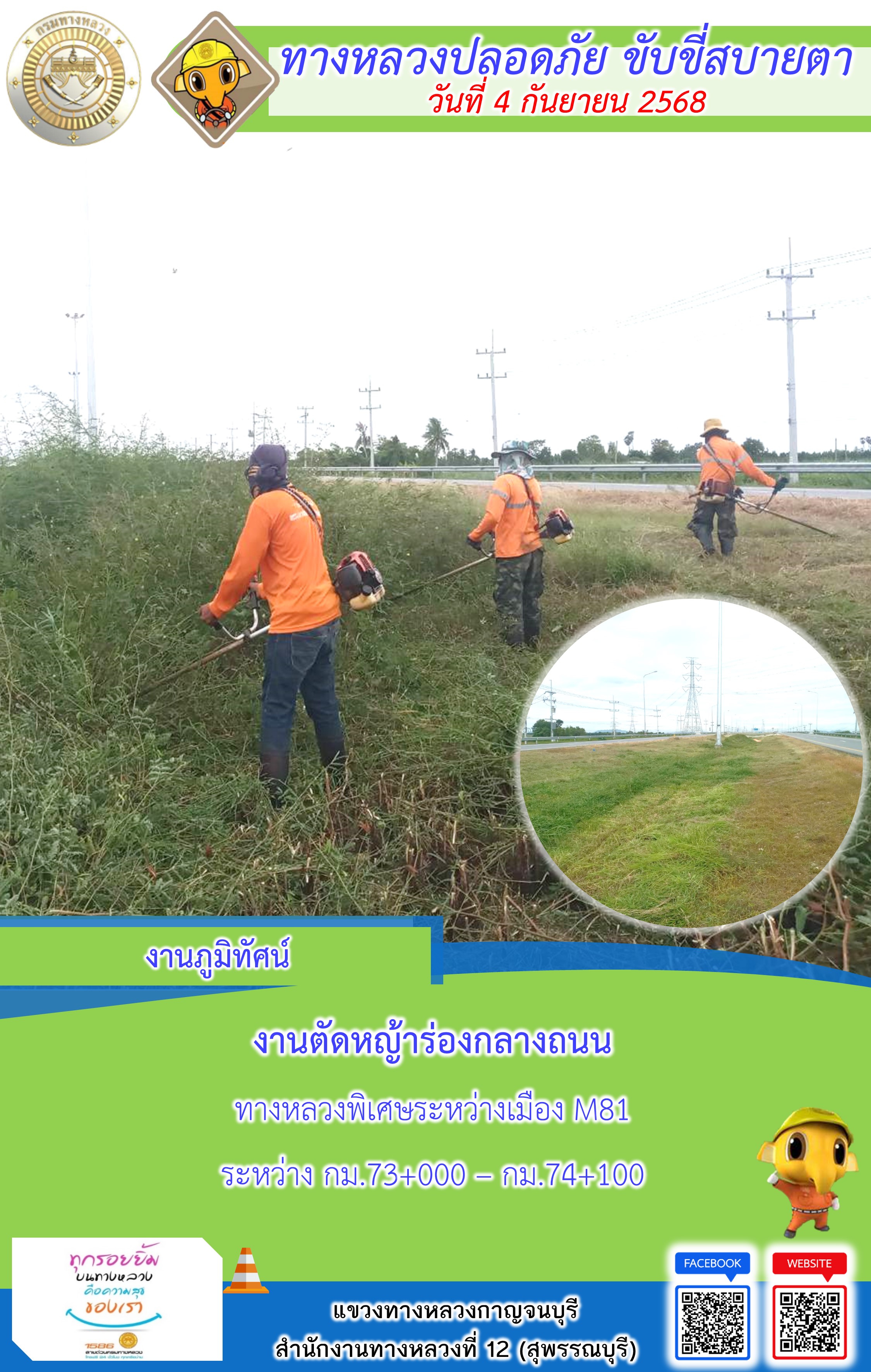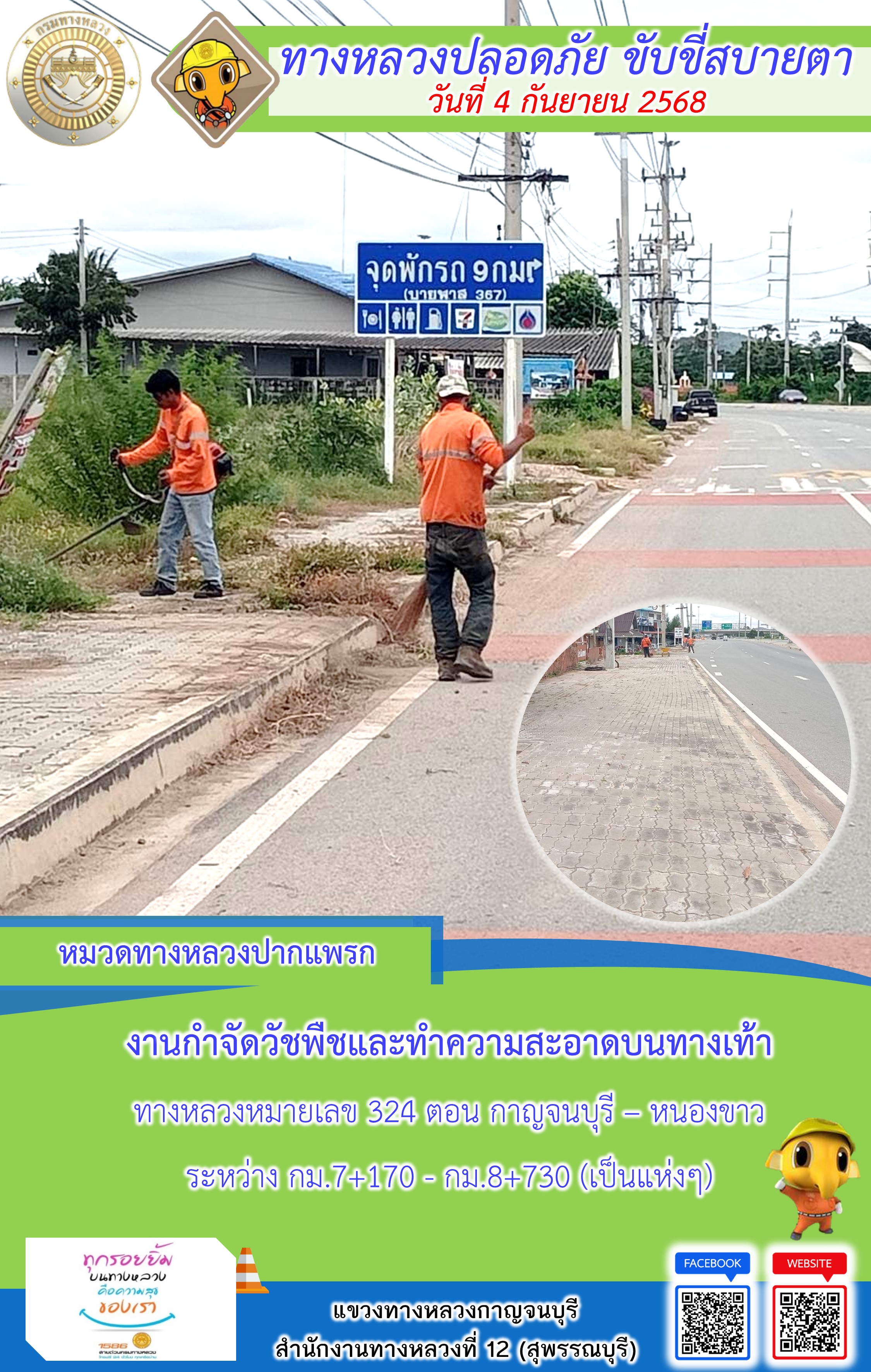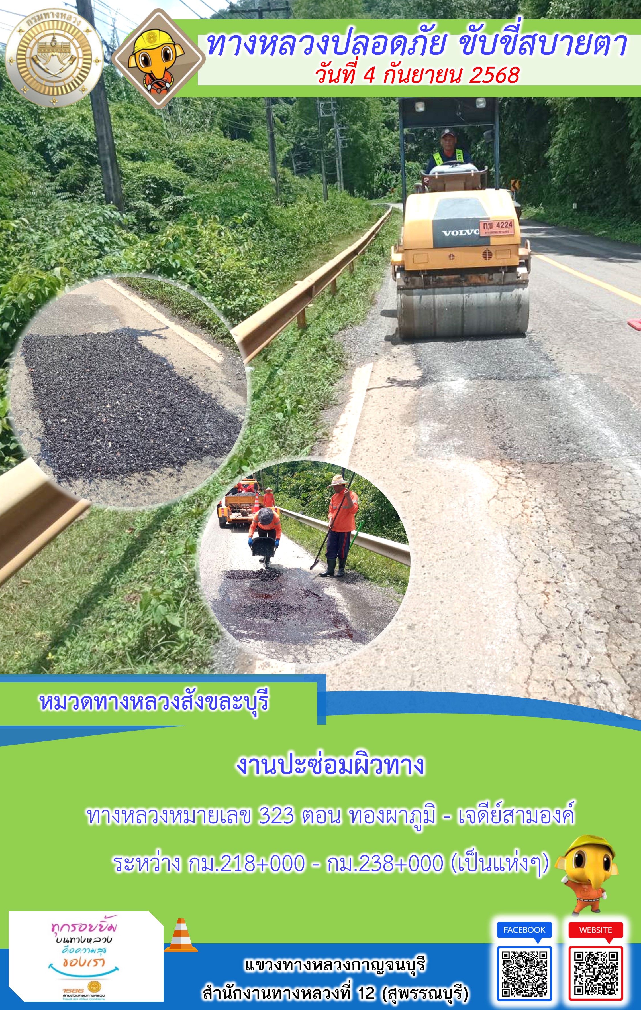แขวงทางหลวงกาญจนบุรี โดยหมวดทางหลวงในสังกัด และงานอำนวยความปลอดภัยปฏิบัติงาน ประจำวันที่ 4 ก.ย. 68