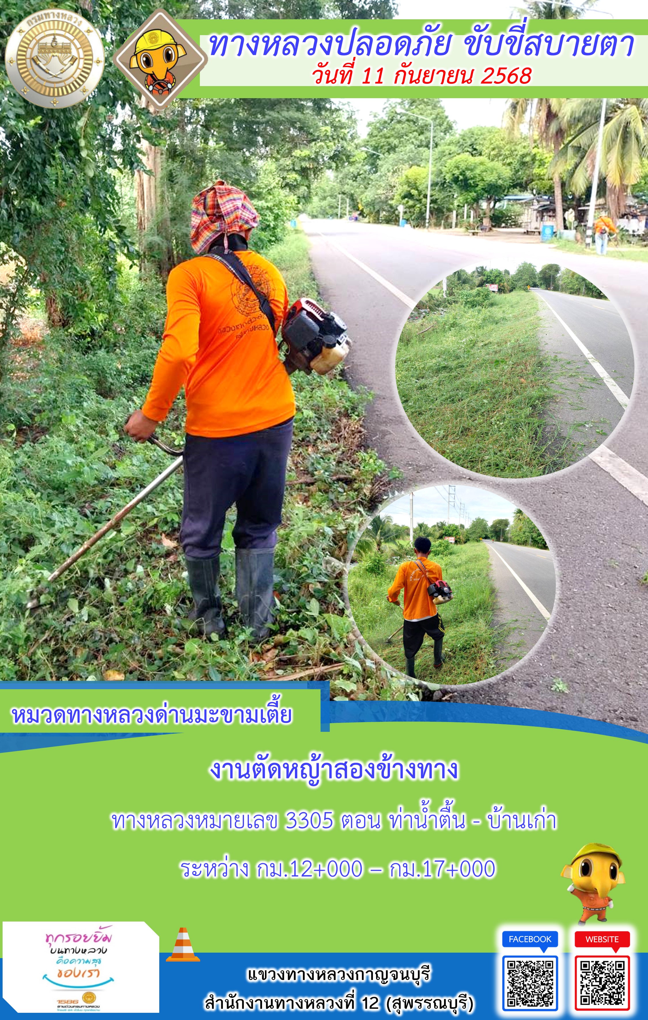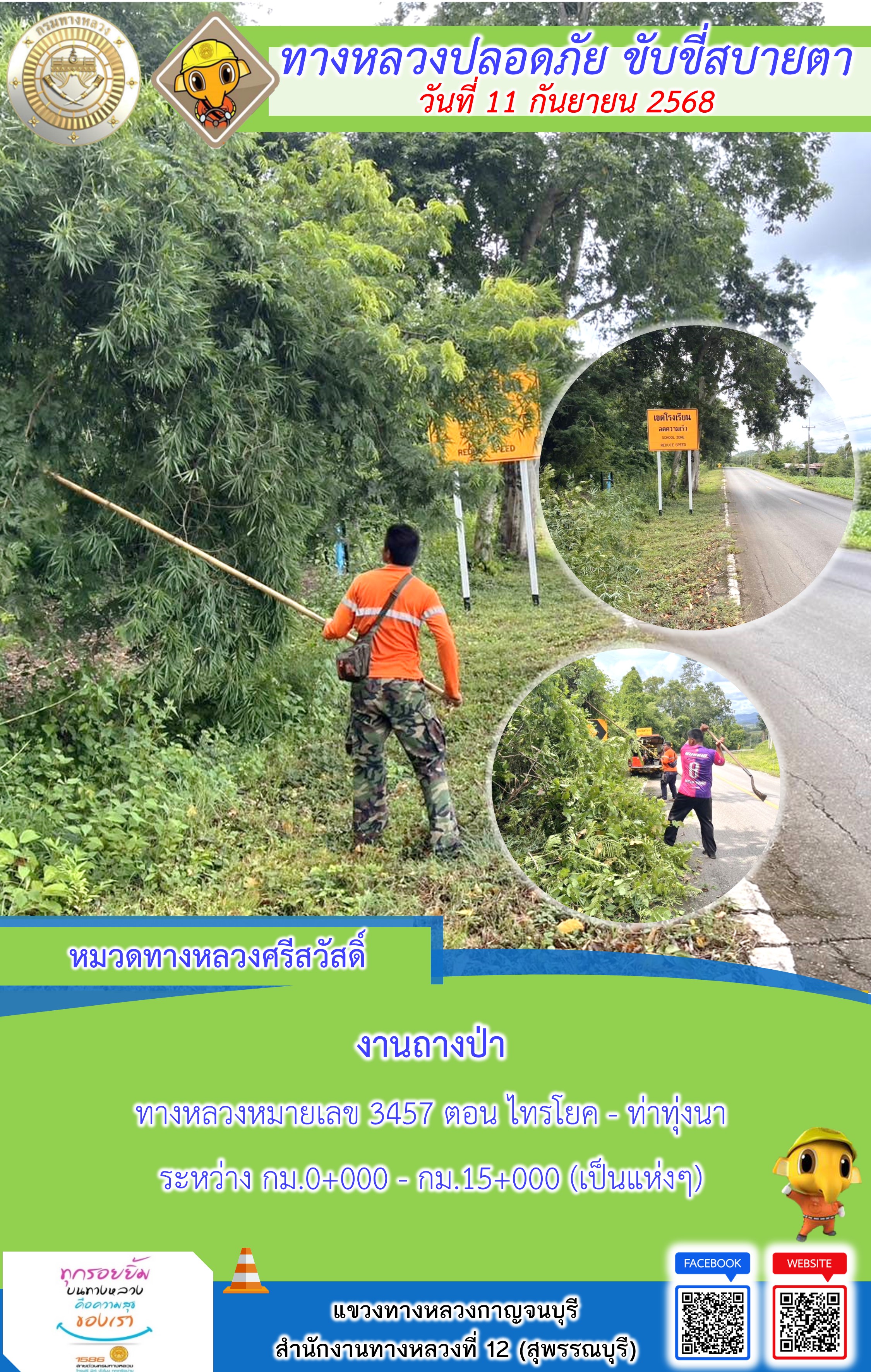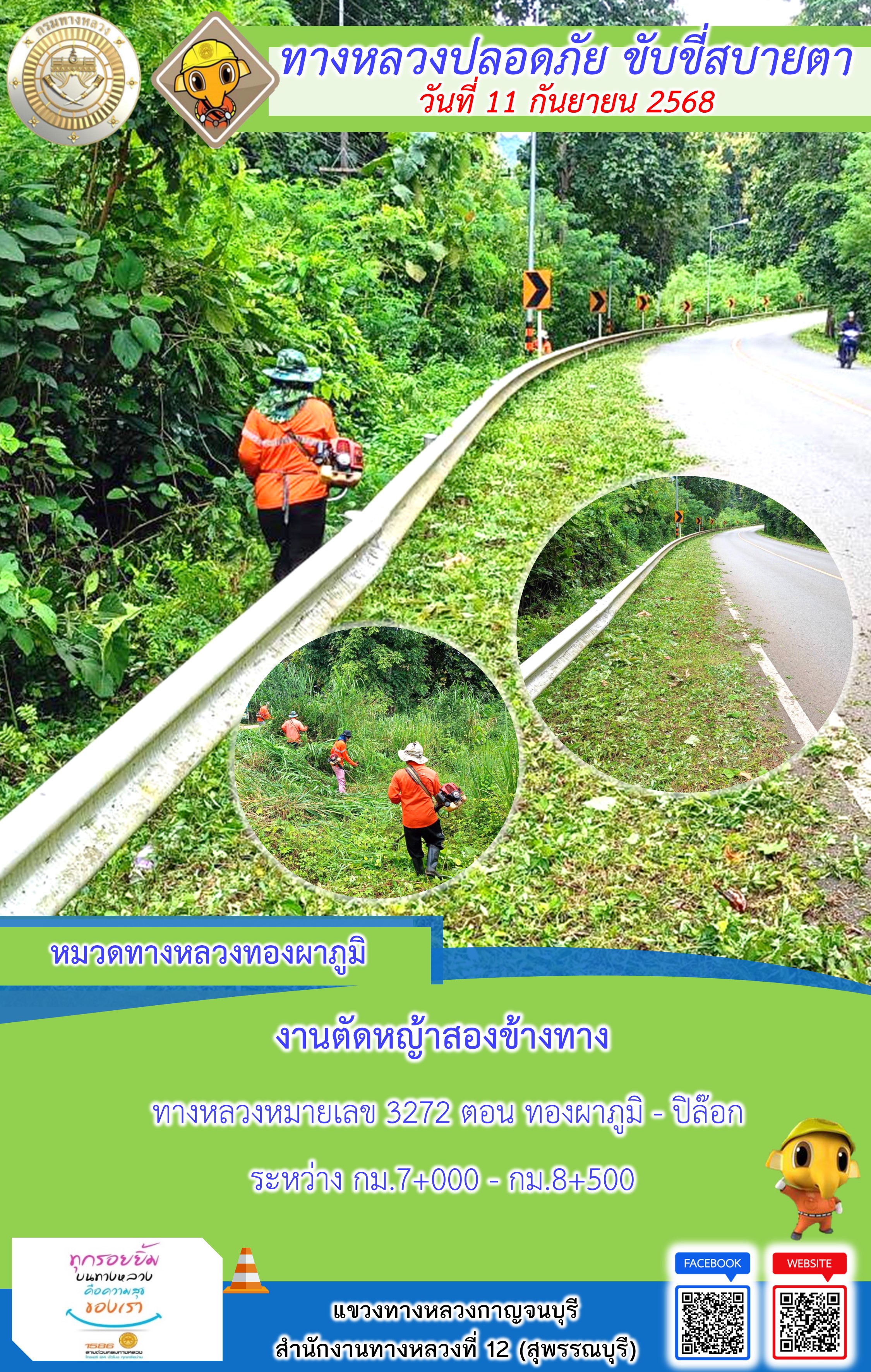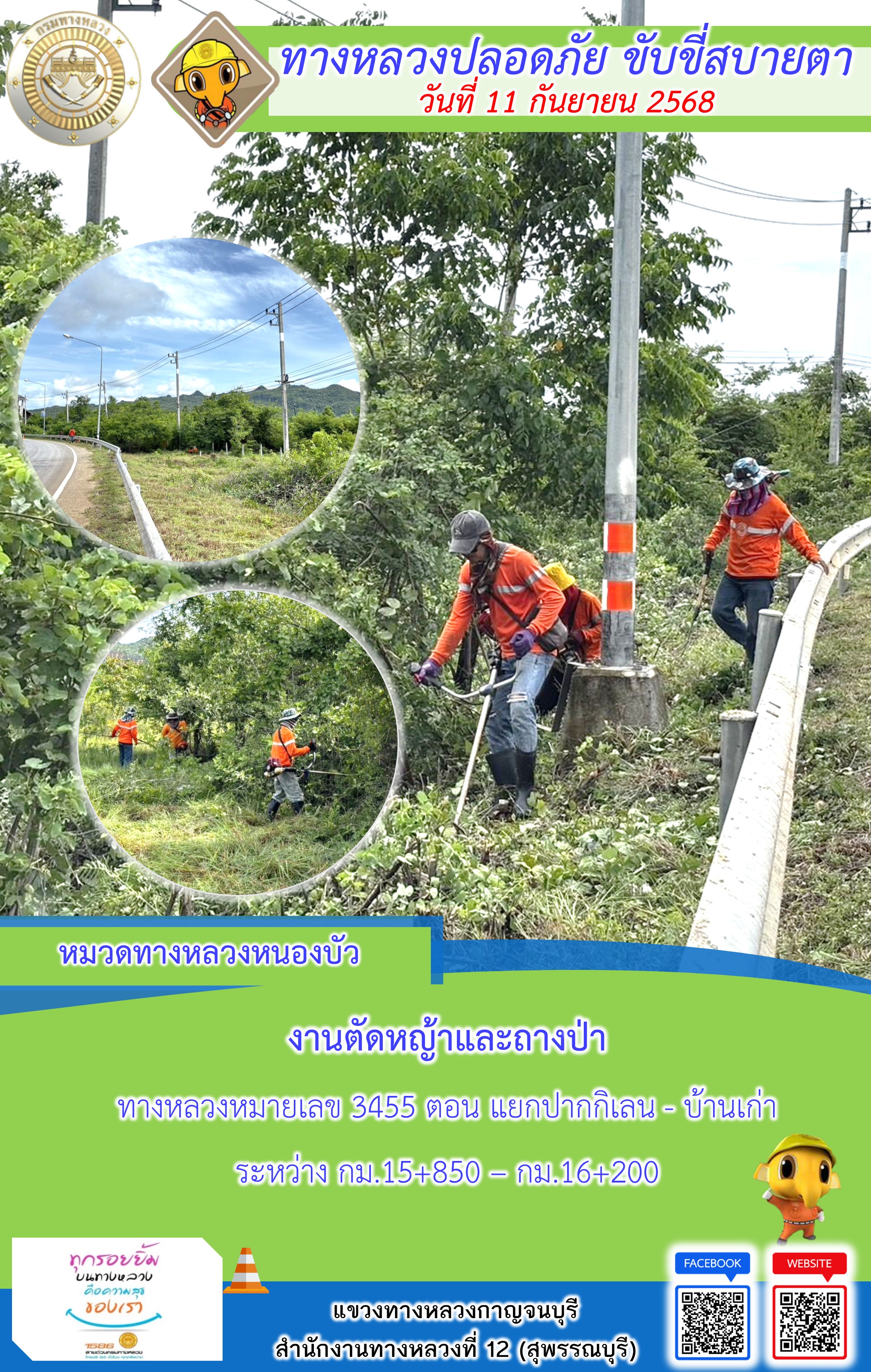 ข้อมูลภาพกิจกรรม : แขวงทางหลวงกาญจนบุรี โดยหมวดทางหลวงในสังกัด และงานอำนวยความปลอดภัยปฏิบัติงาน ประจำวันที่ 11 ก.ย. 68