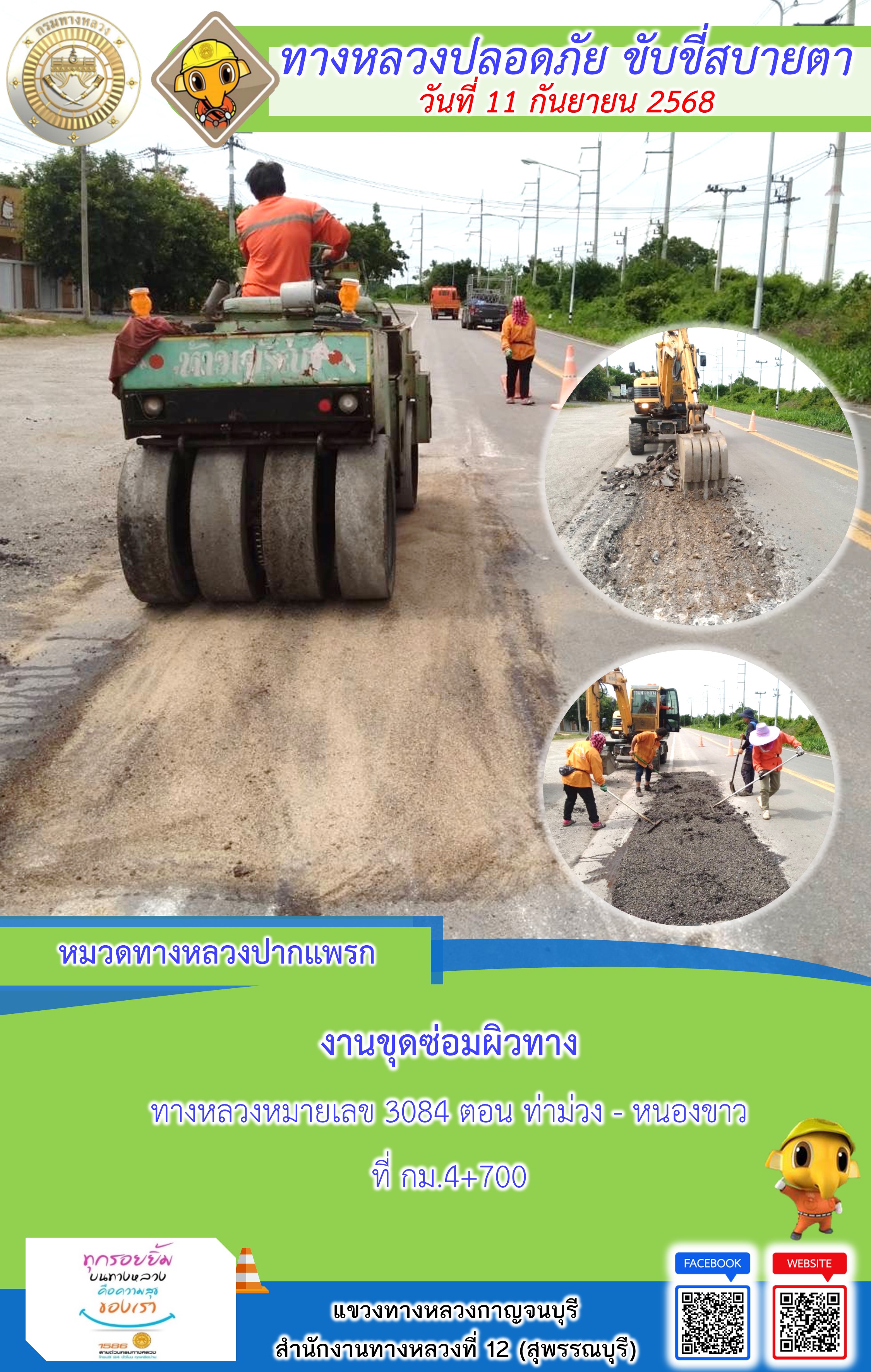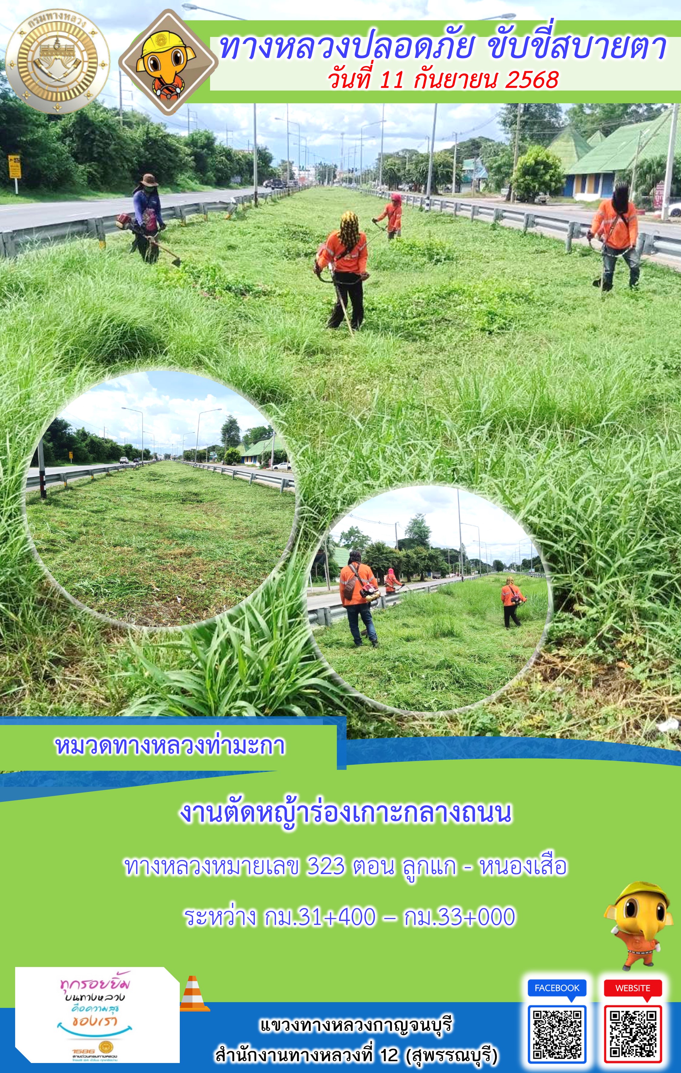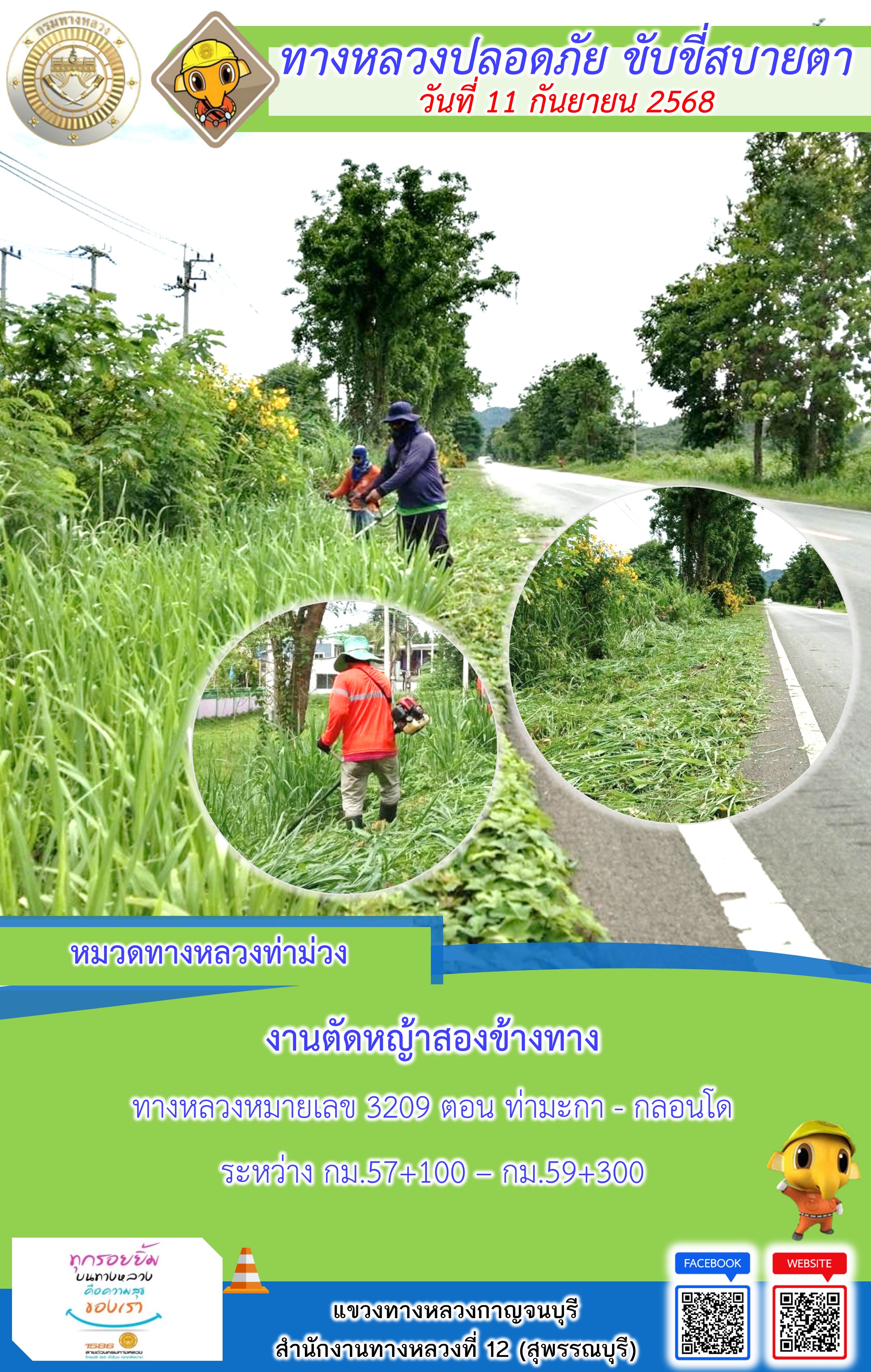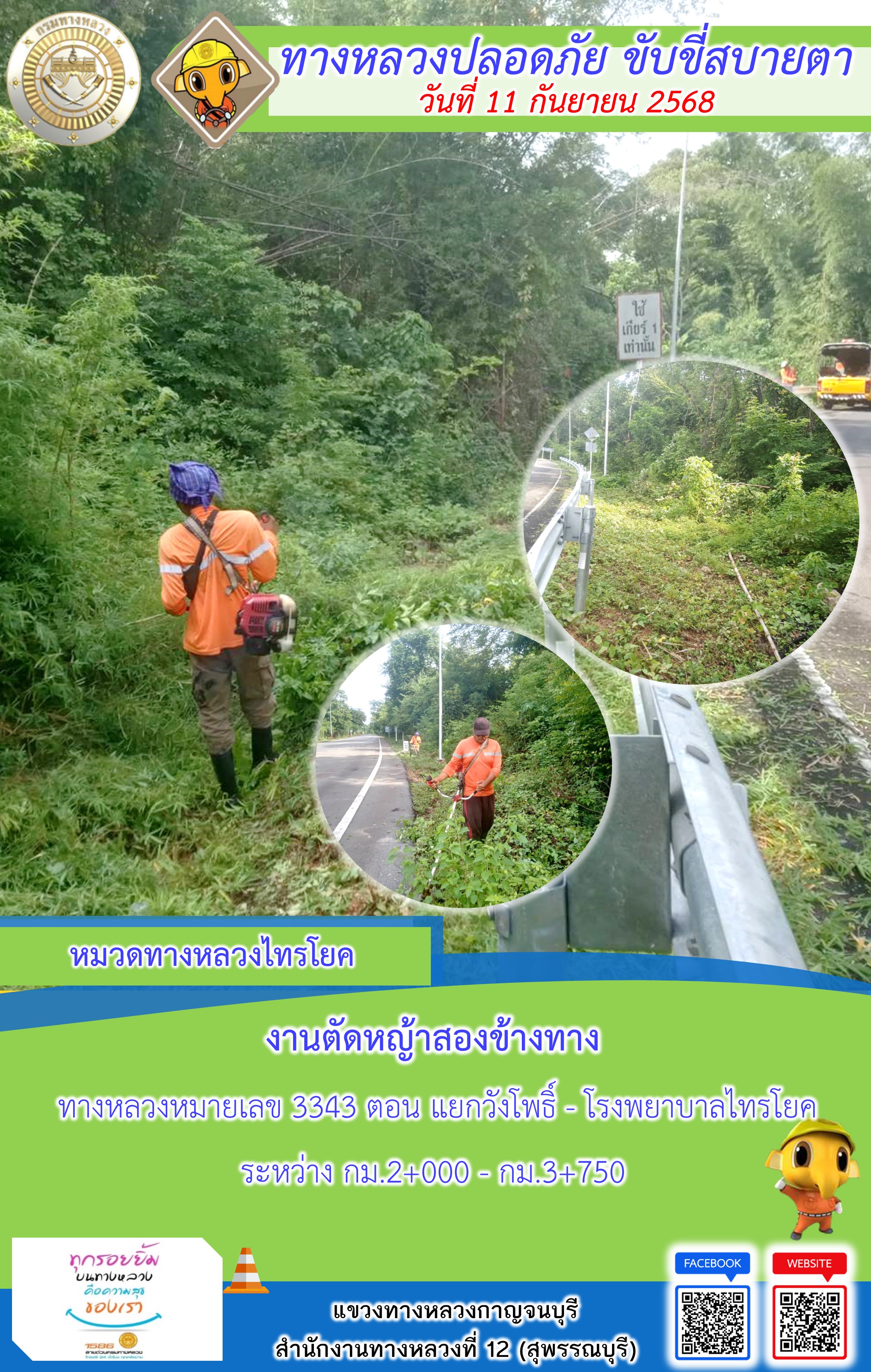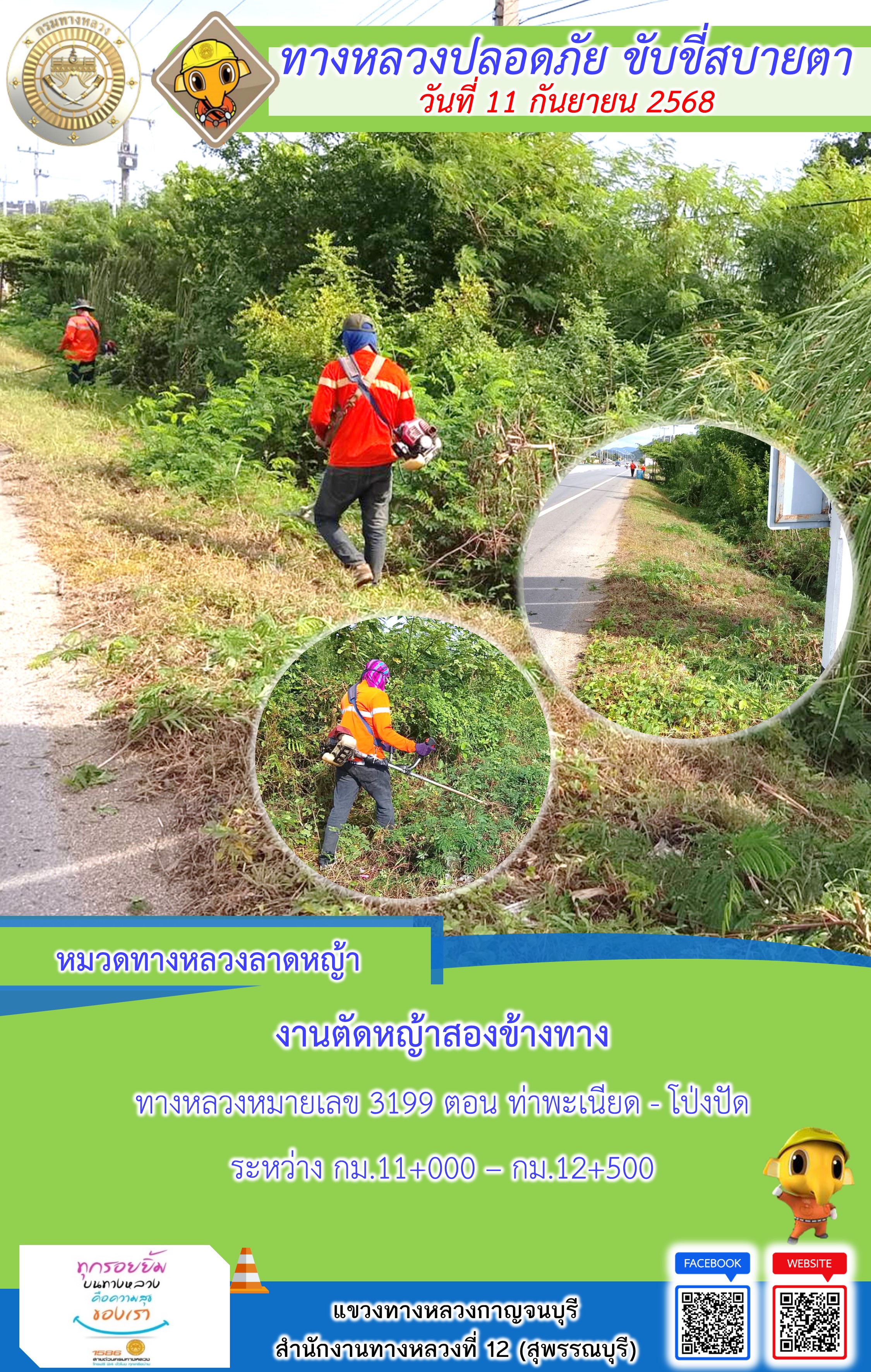 ข้อมูลภาพกิจกรรม : แขวงทางหลวงกาญจนบุรี โดยหมวดทางหลวงในสังกัด และงานอำนวยความปลอดภัยปฏิบัติงาน ประจำวันที่ 11 ก.ย. 68