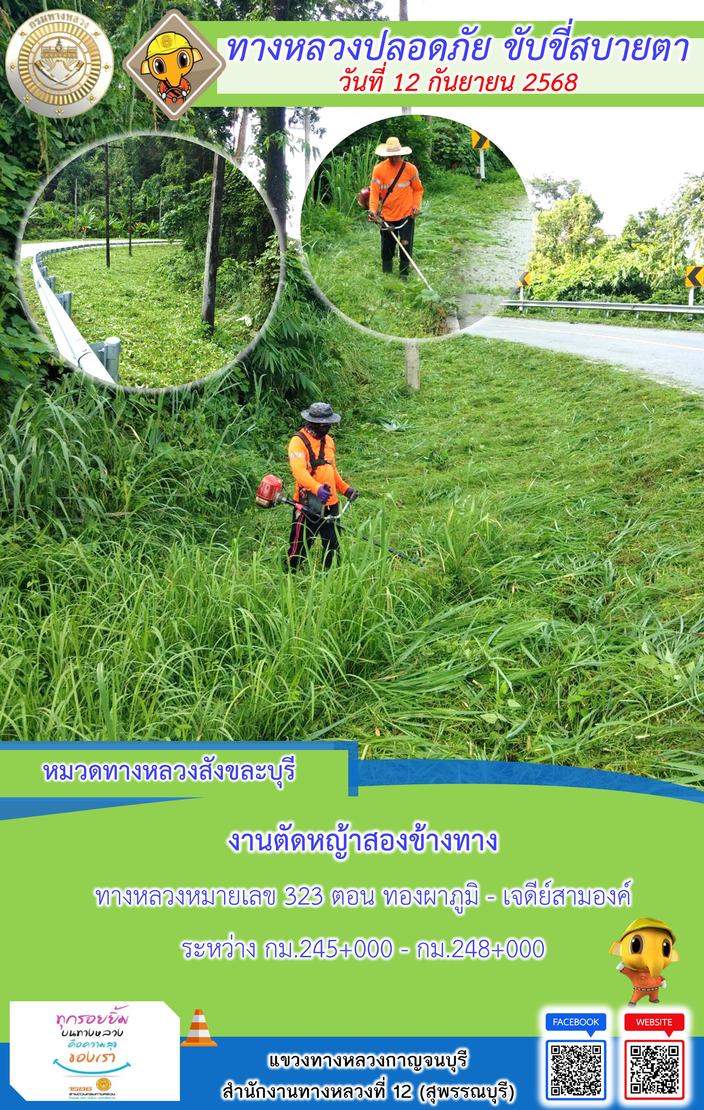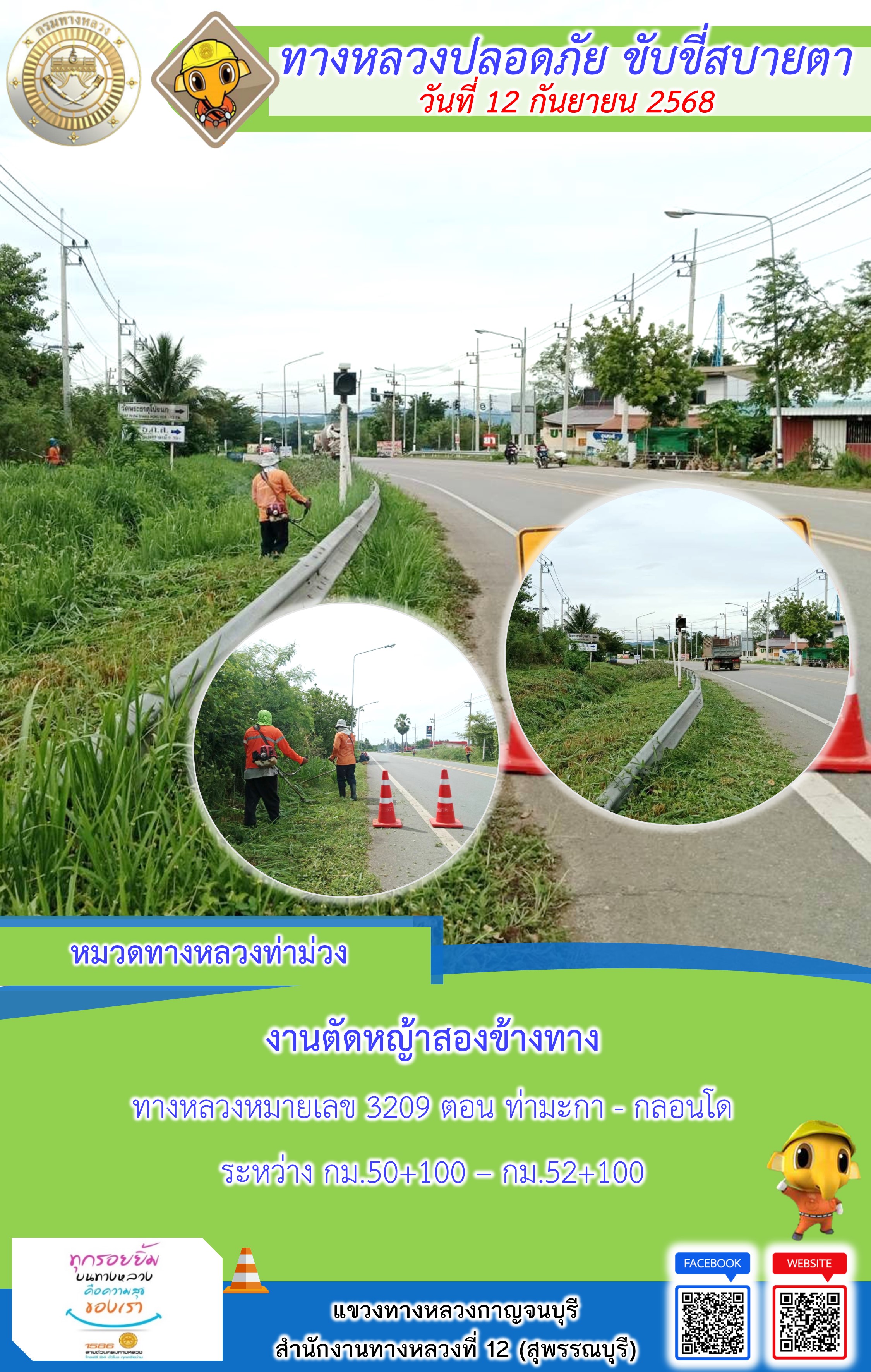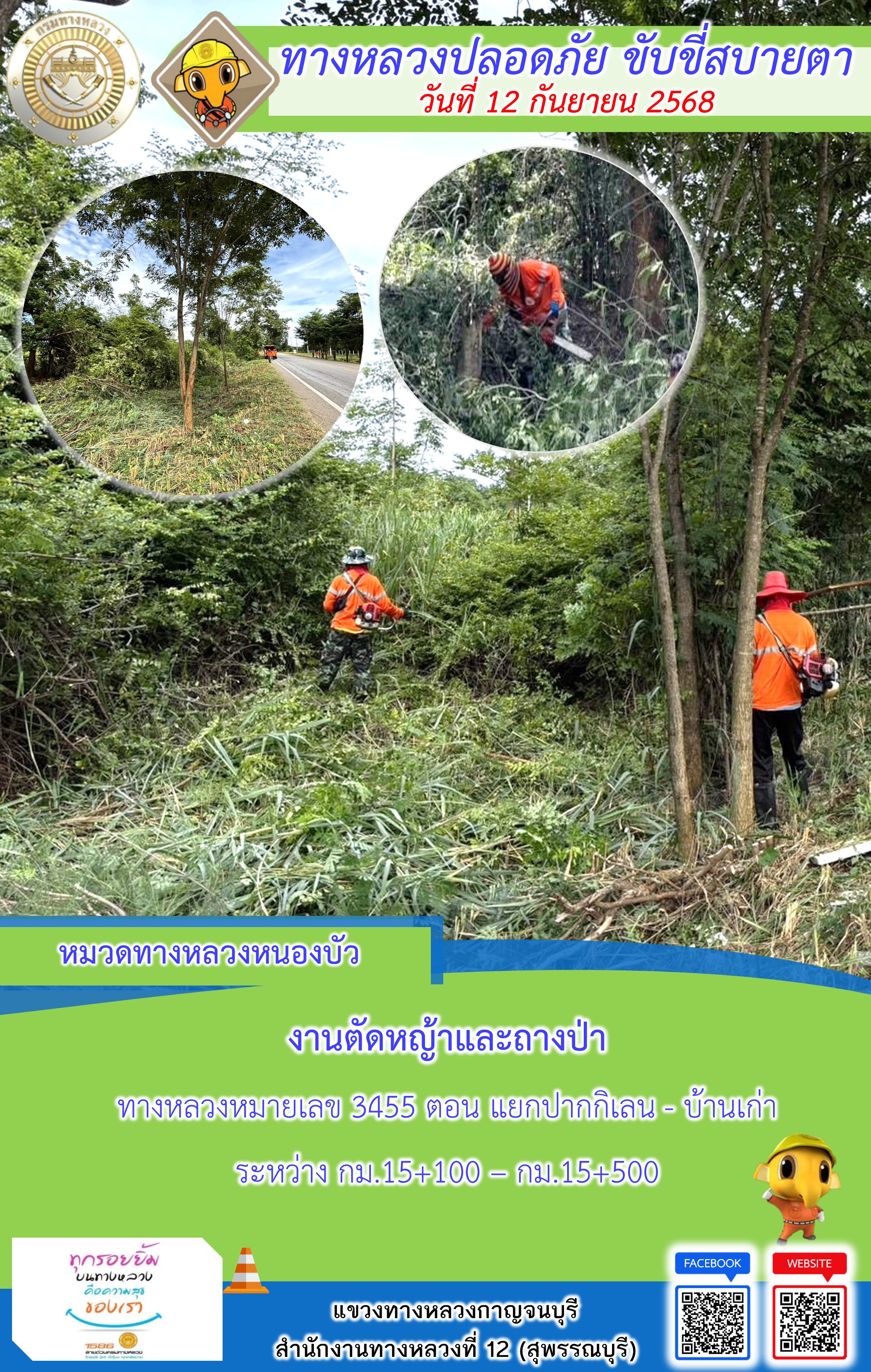 ข้อมูลภาพกิจกรรม : แขวงทางหลวงกาญจนบุรี โดยหมวดทางหลวงในสังกัด และงานอำนวยความปลอดภัยปฏิบัติงาน ประจำวันที่ 12 ก.ย. 68