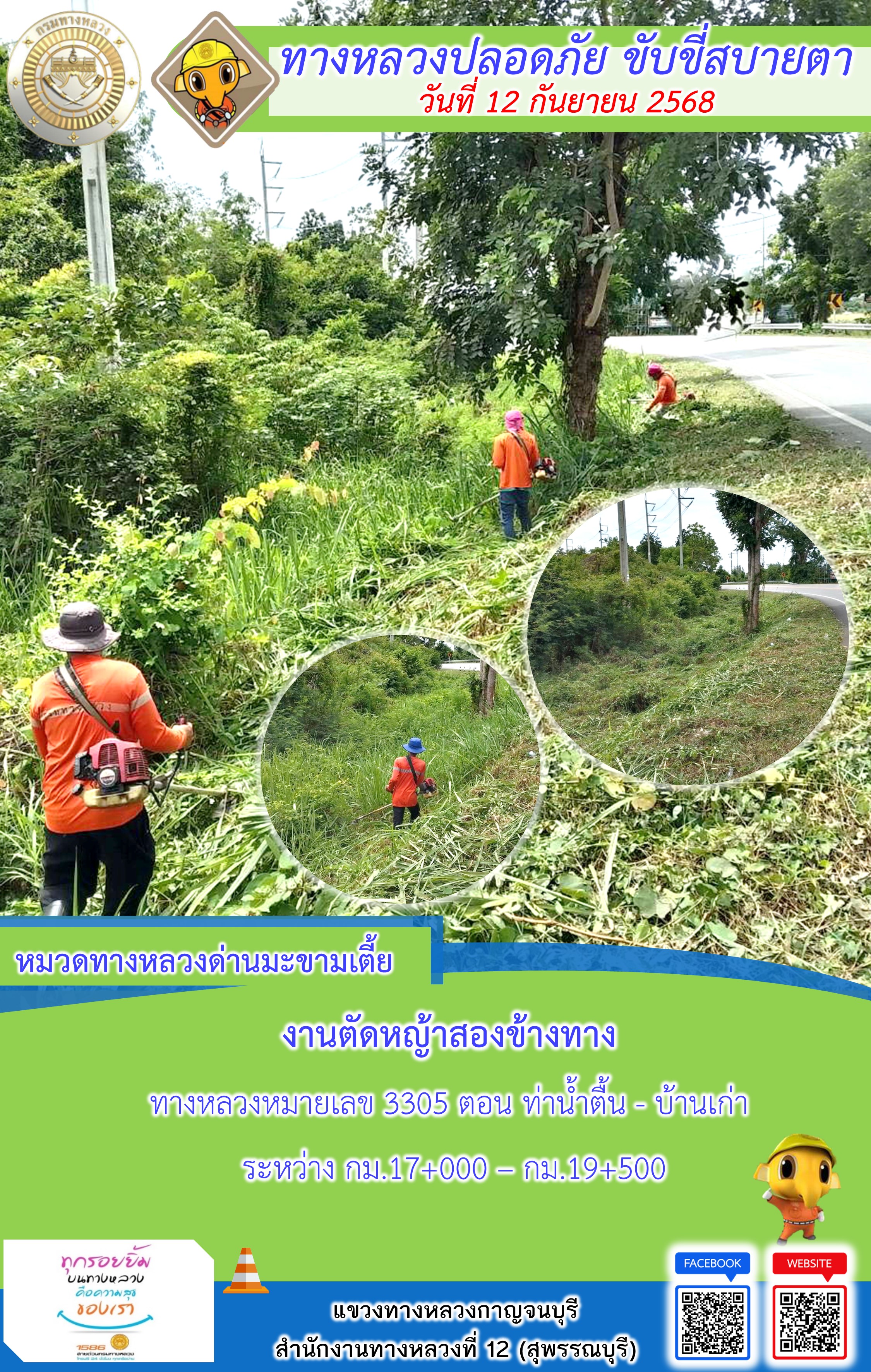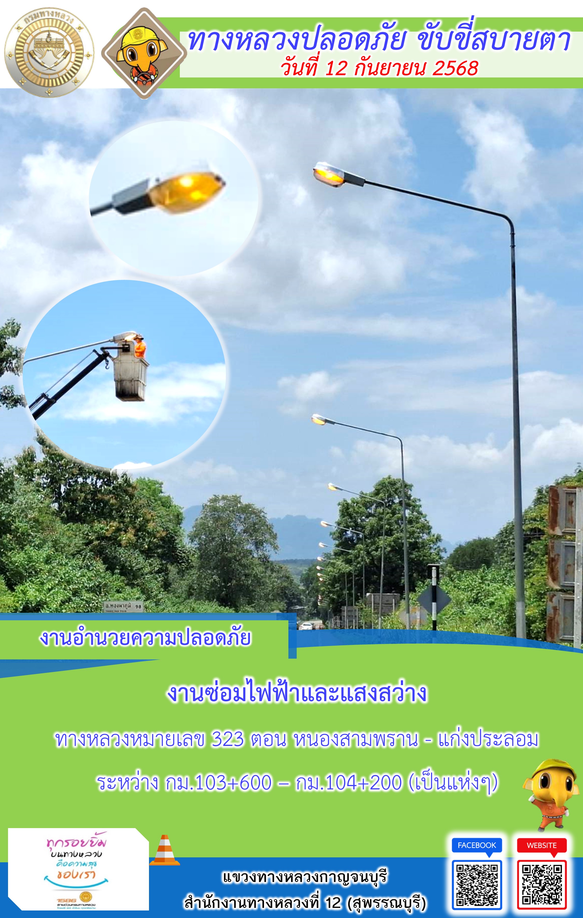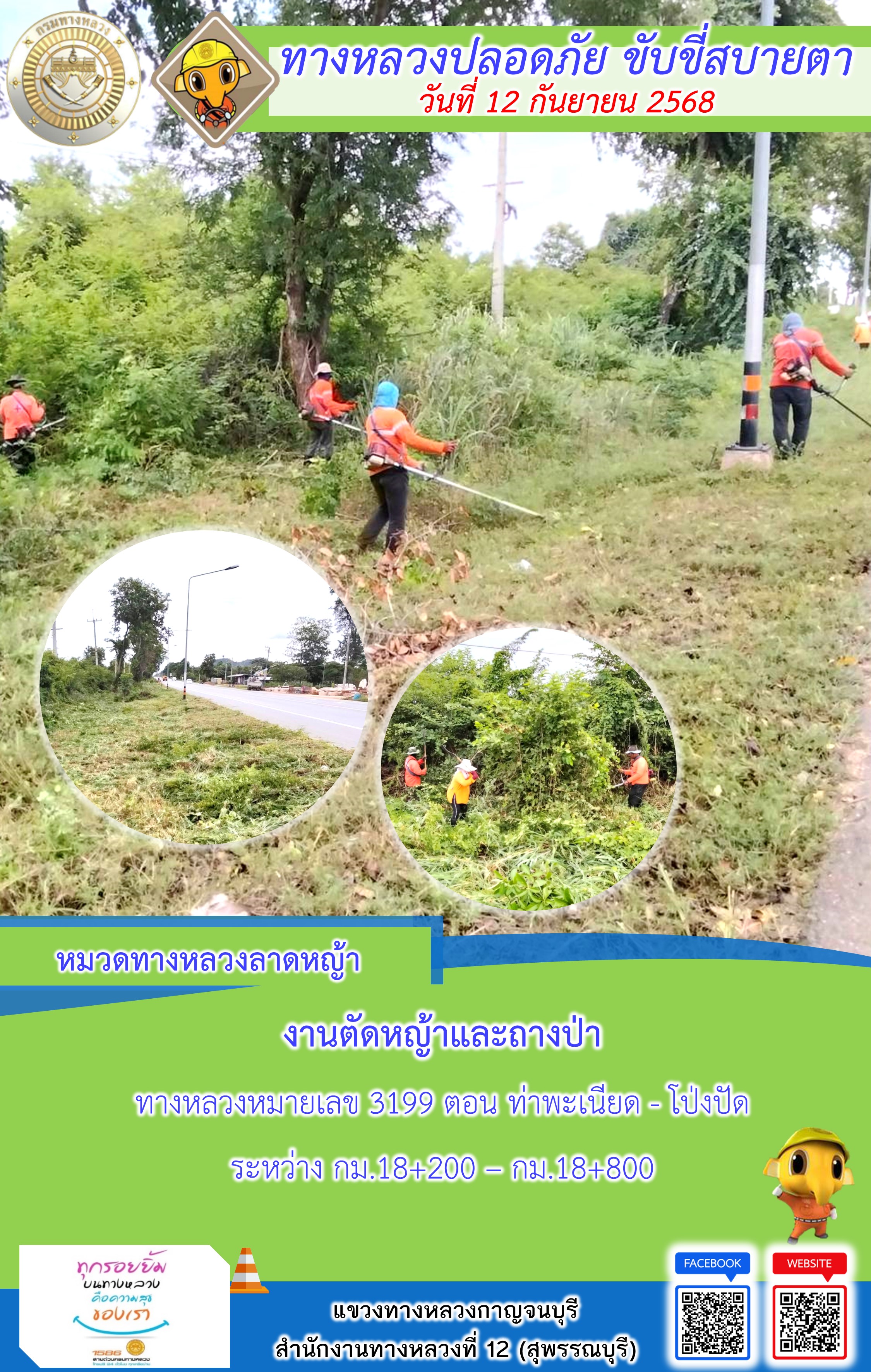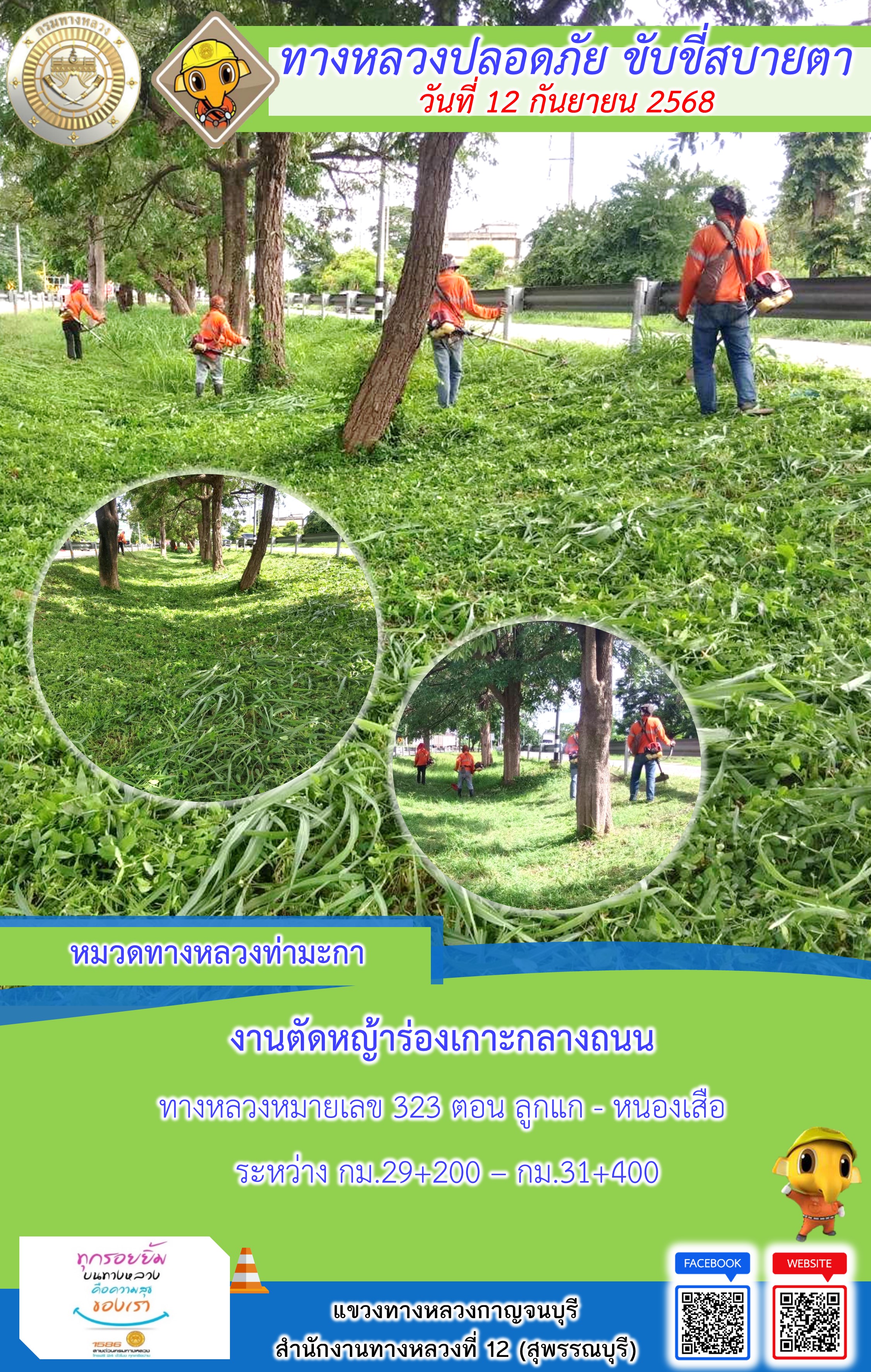 ข้อมูลภาพกิจกรรม : แขวงทางหลวงกาญจนบุรี โดยหมวดทางหลวงในสังกัด และงานอำนวยความปลอดภัยปฏิบัติงาน ประจำวันที่ 12 ก.ย. 68