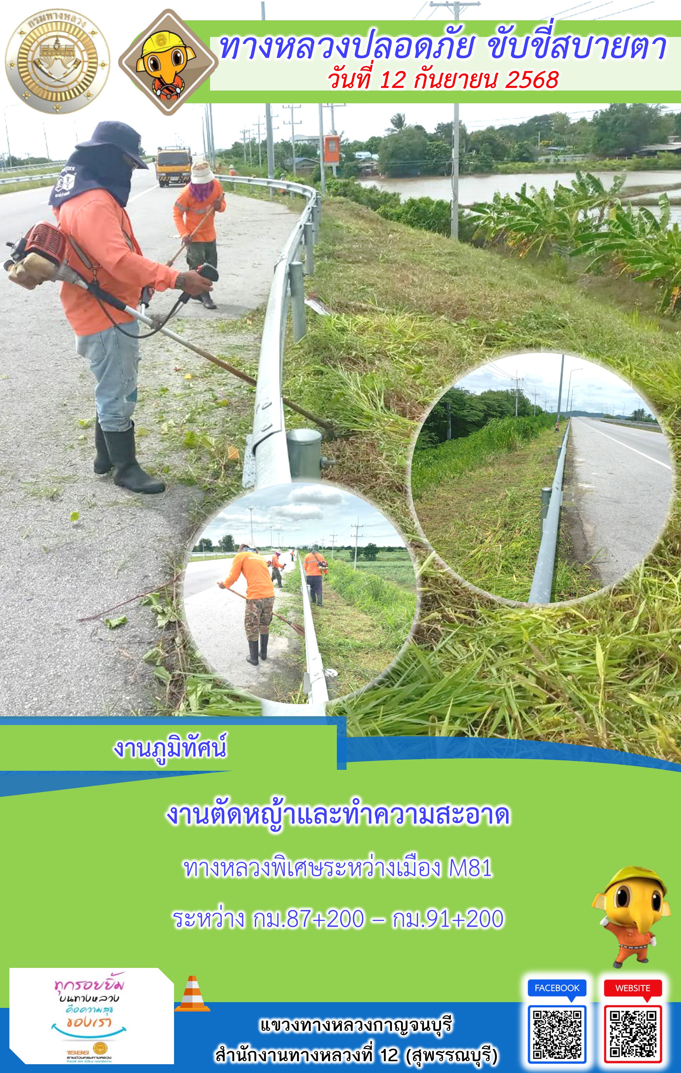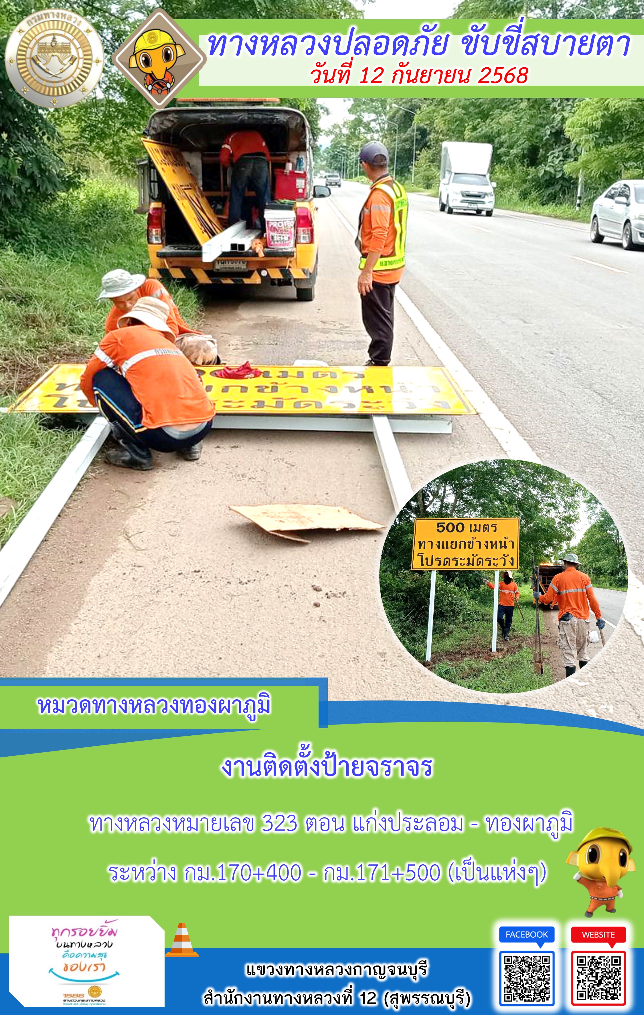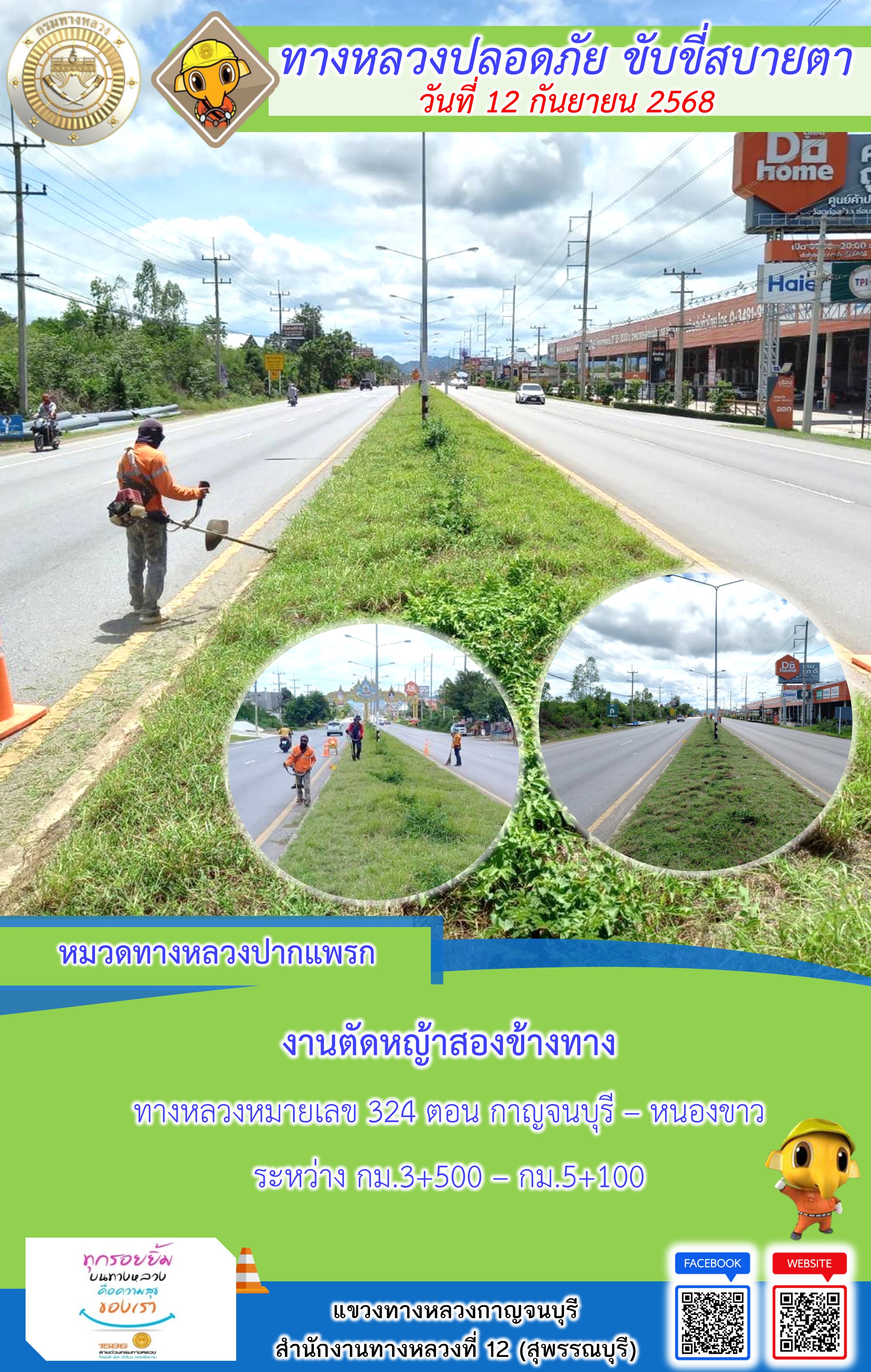แขวงทางหลวงกาญจนบุรี โดยหมวดทางหลวงในสังกัด และงานอำนวยความปลอดภัยปฏิบัติงาน ประจำวันที่ 12 ก.ย. 68