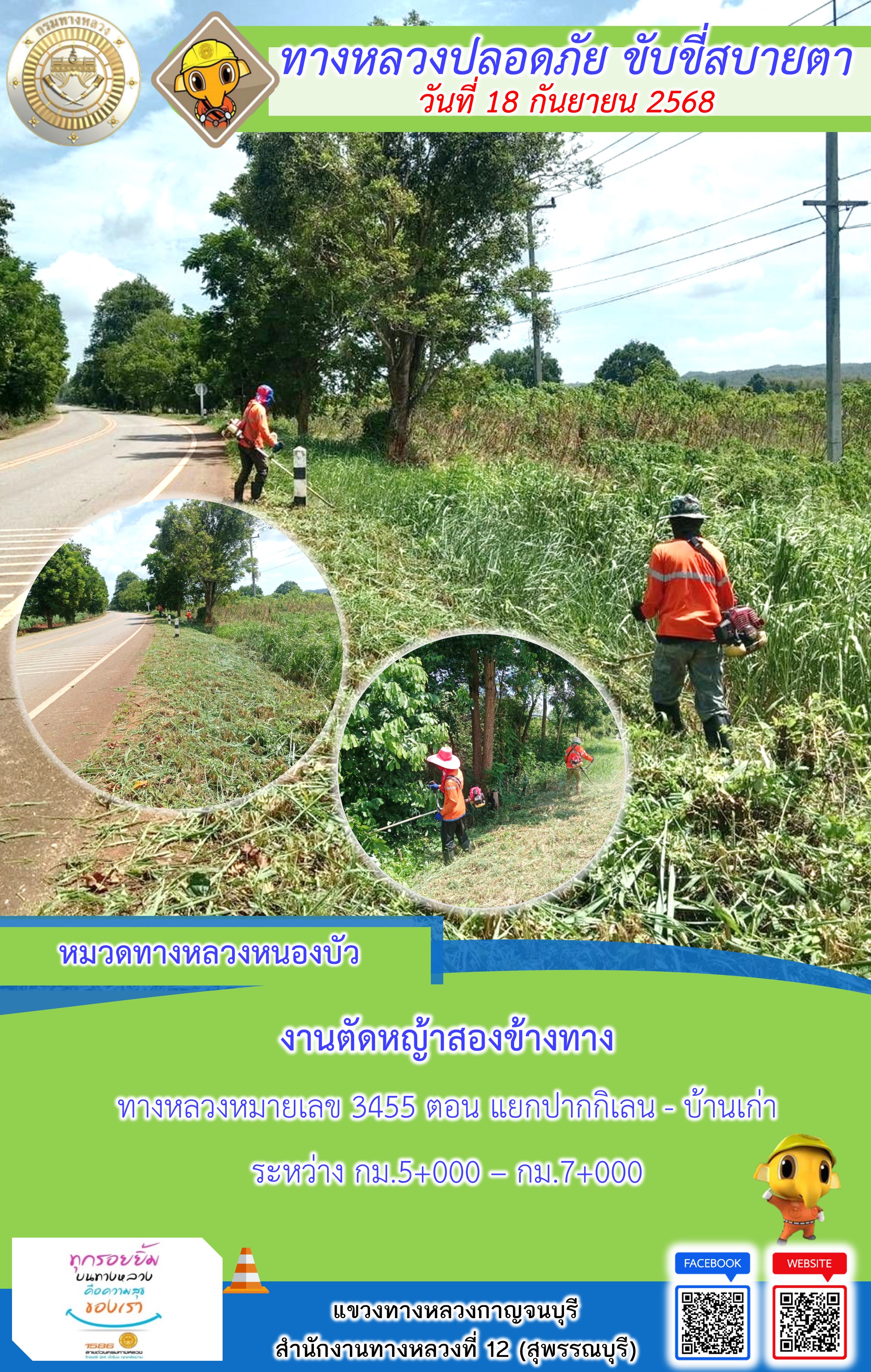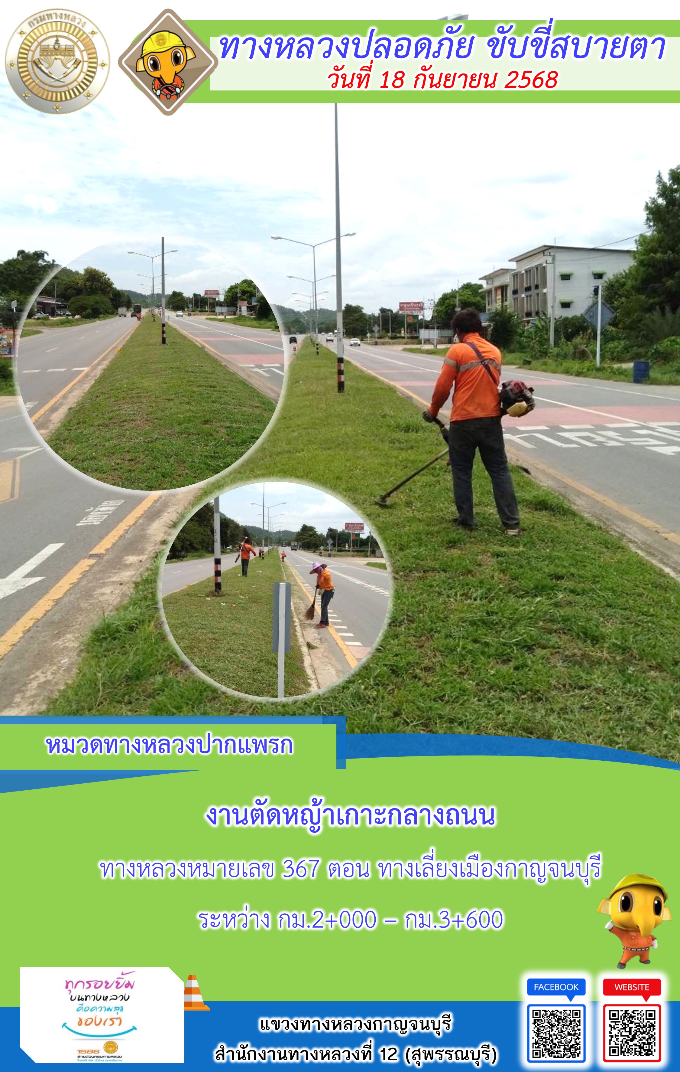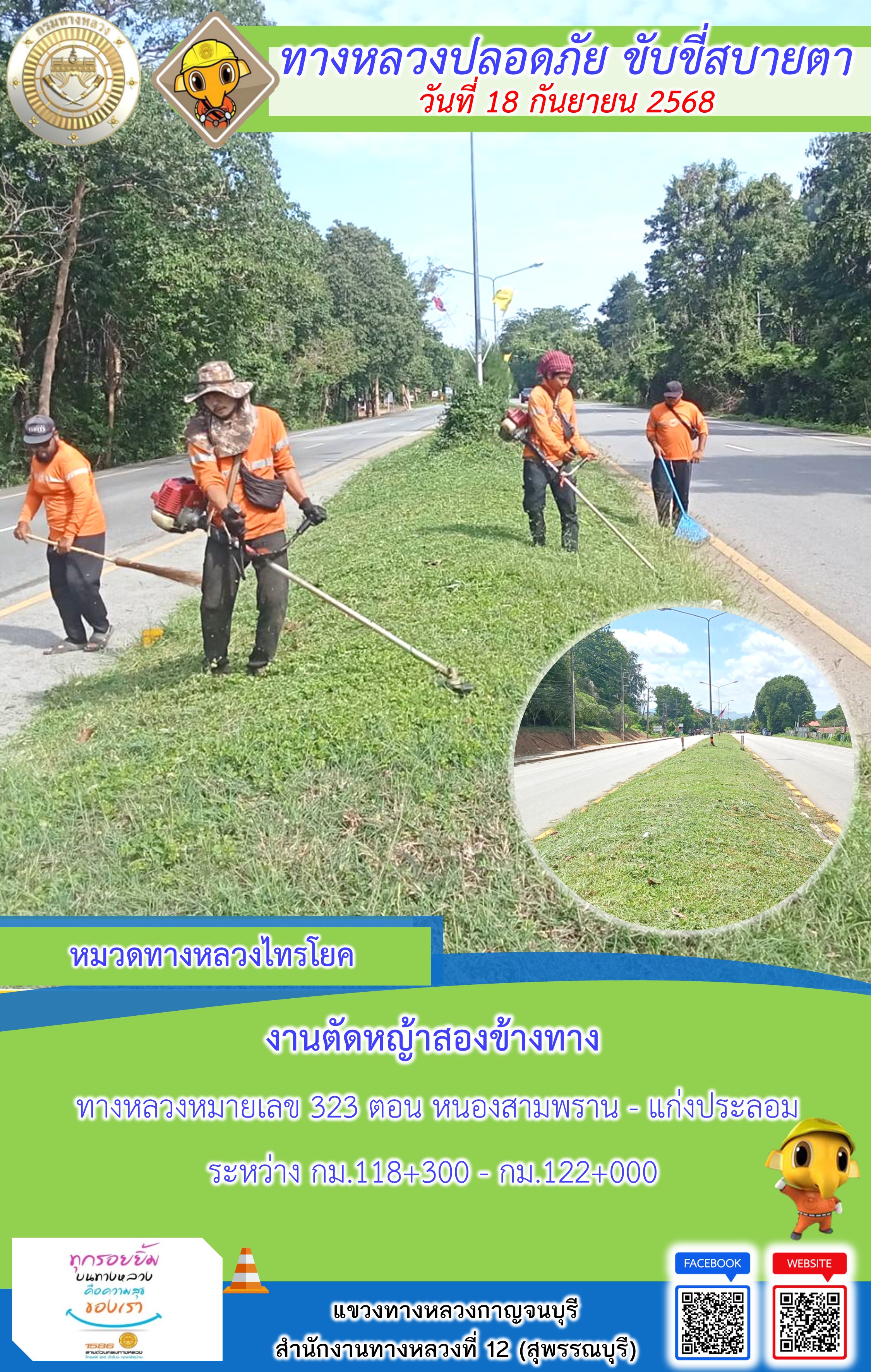 ข้อมูลภาพกิจกรรม : แขวงทางหลวงกาญจนบุรี โดยหมวดทางหลวงในสังกัด และงานอำนวยความปลอดภัยปฏิบัติงาน ประจำวันที่ 18 ก.ย. 68