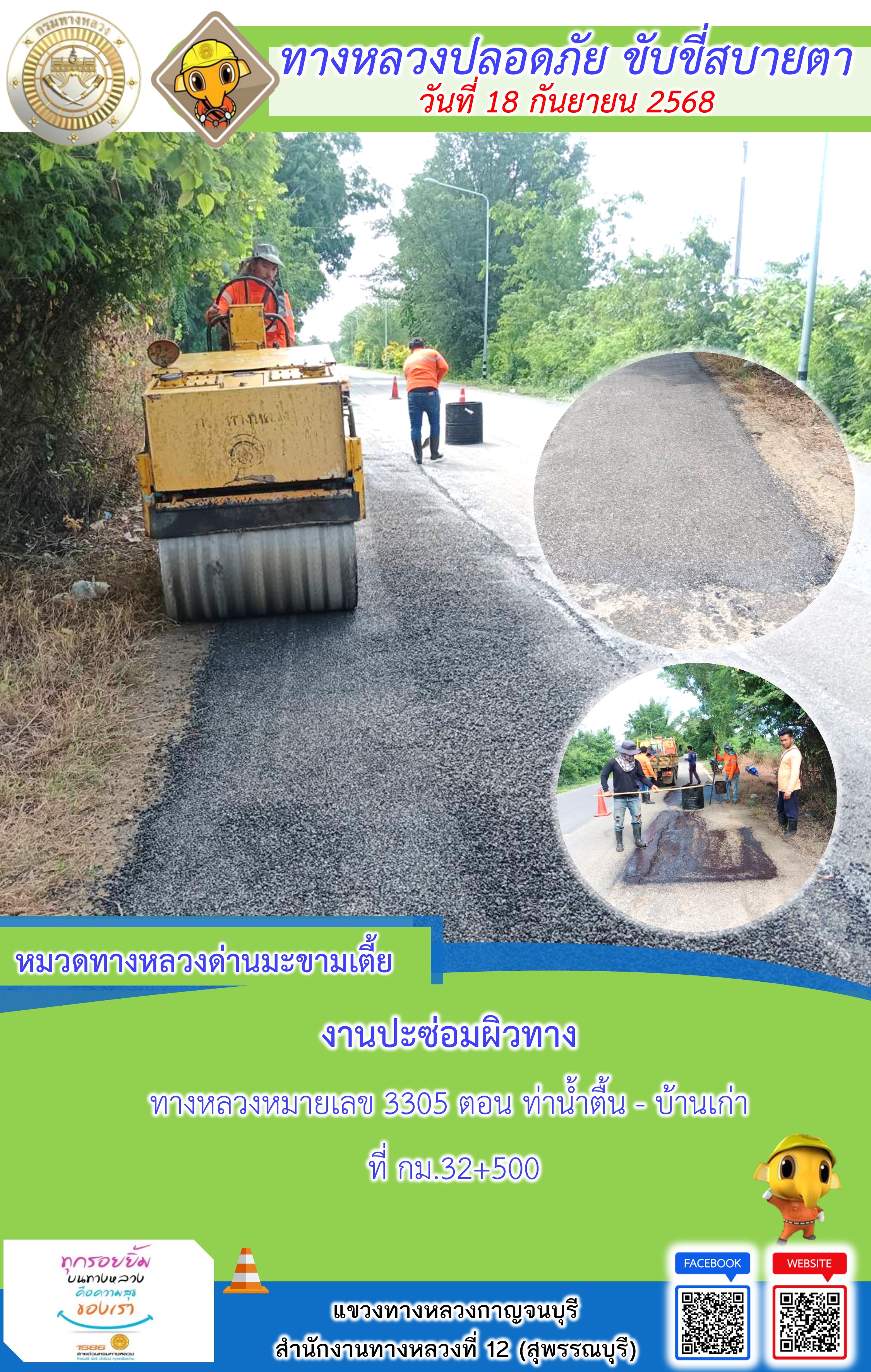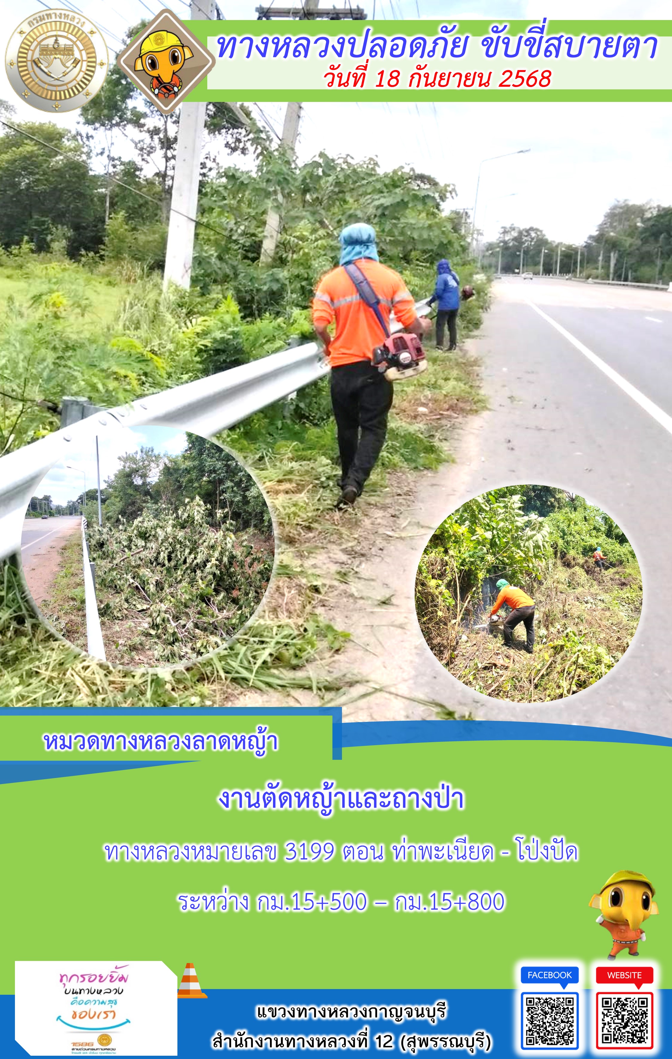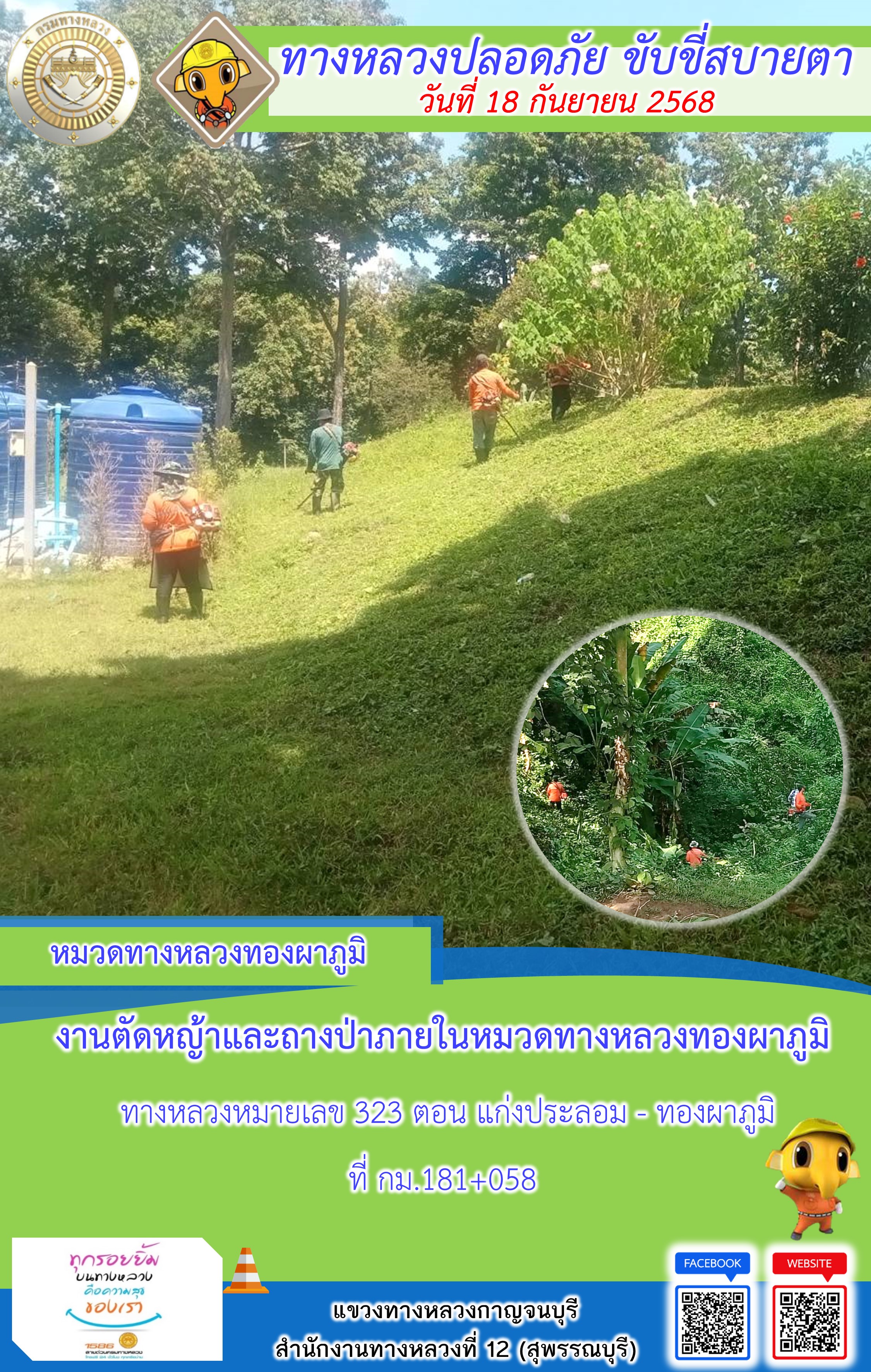 ข้อมูลภาพกิจกรรม : แขวงทางหลวงกาญจนบุรี โดยหมวดทางหลวงในสังกัด และงานอำนวยความปลอดภัยปฏิบัติงาน ประจำวันที่ 18 ก.ย. 68