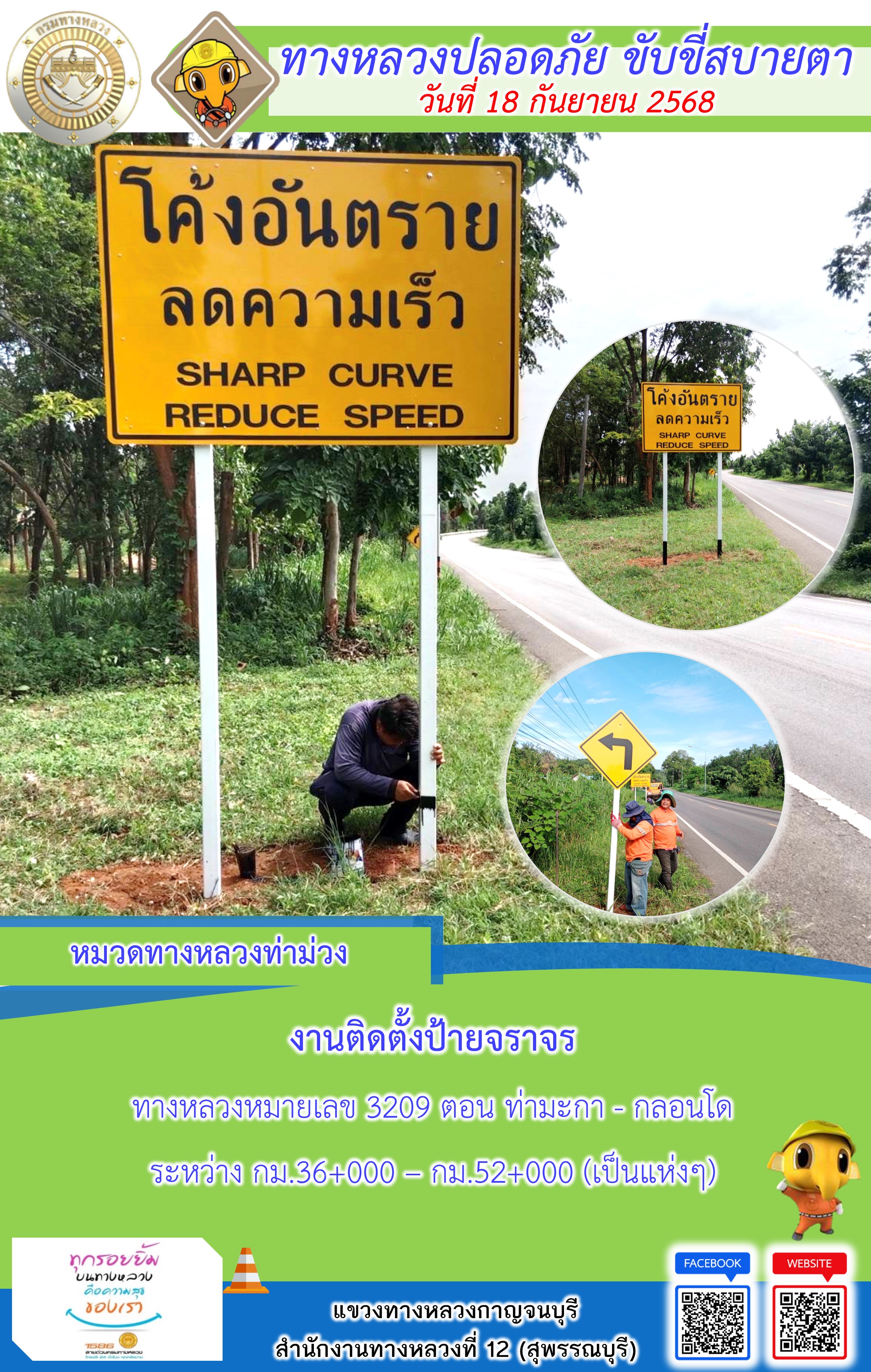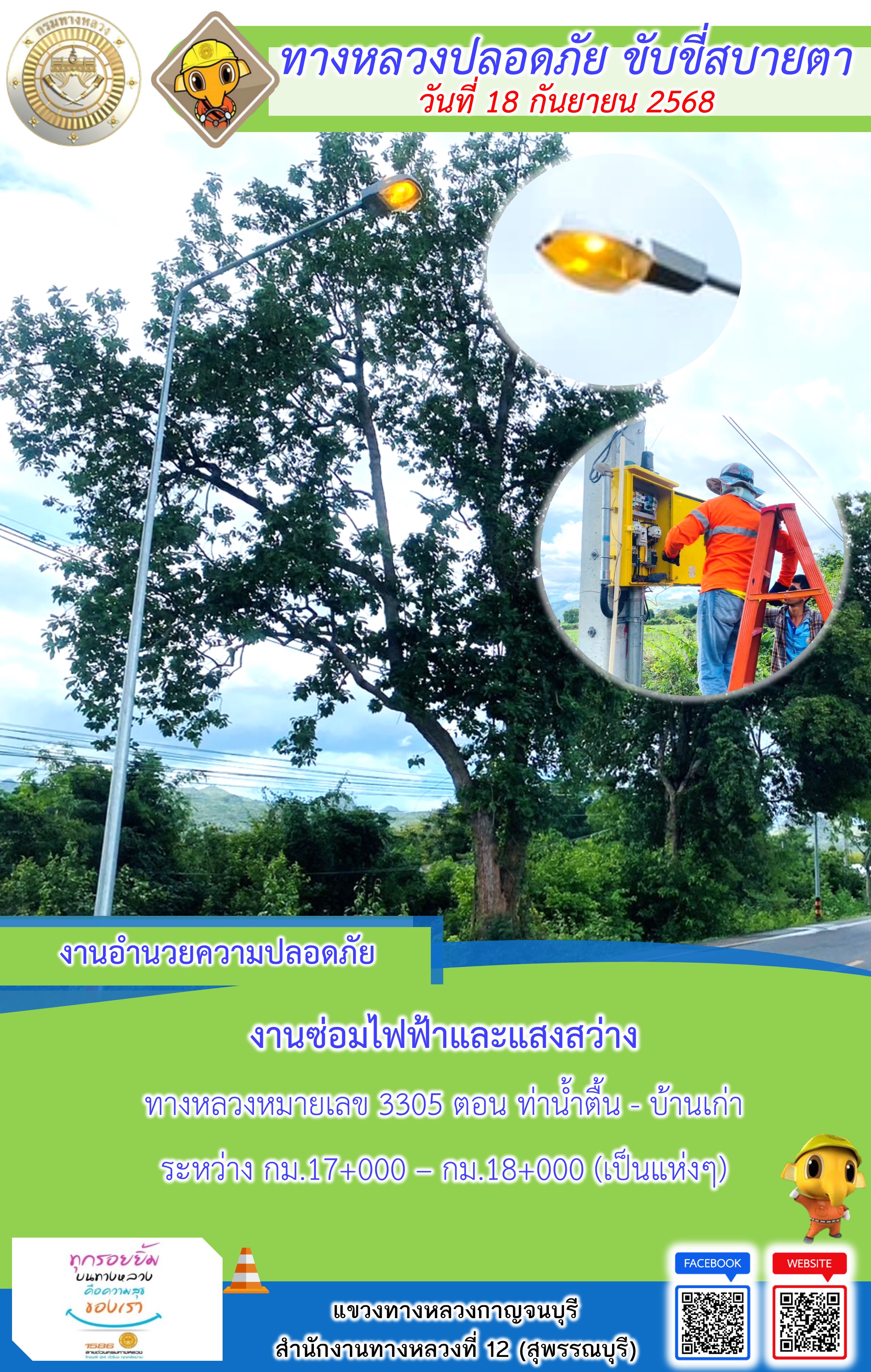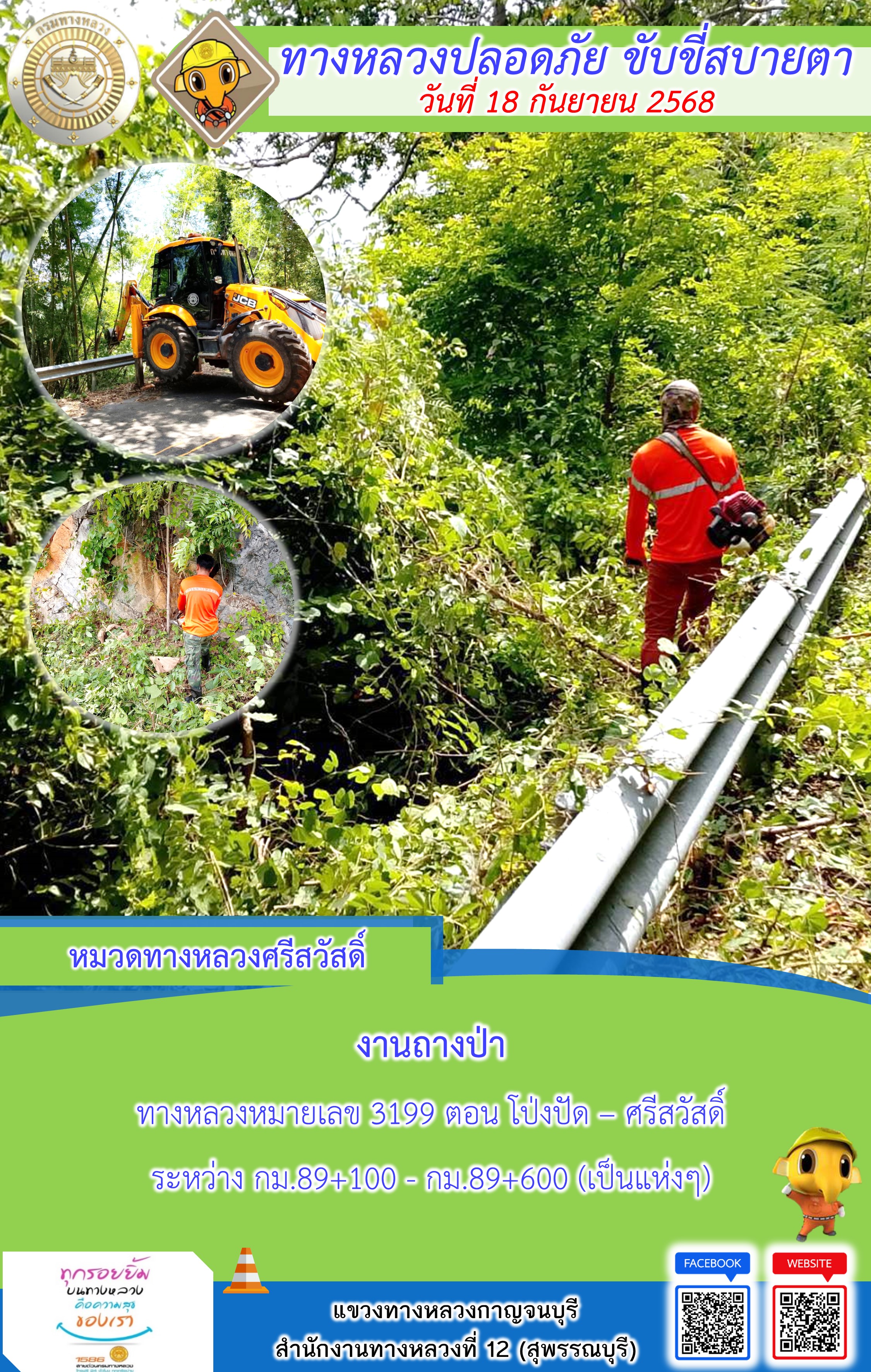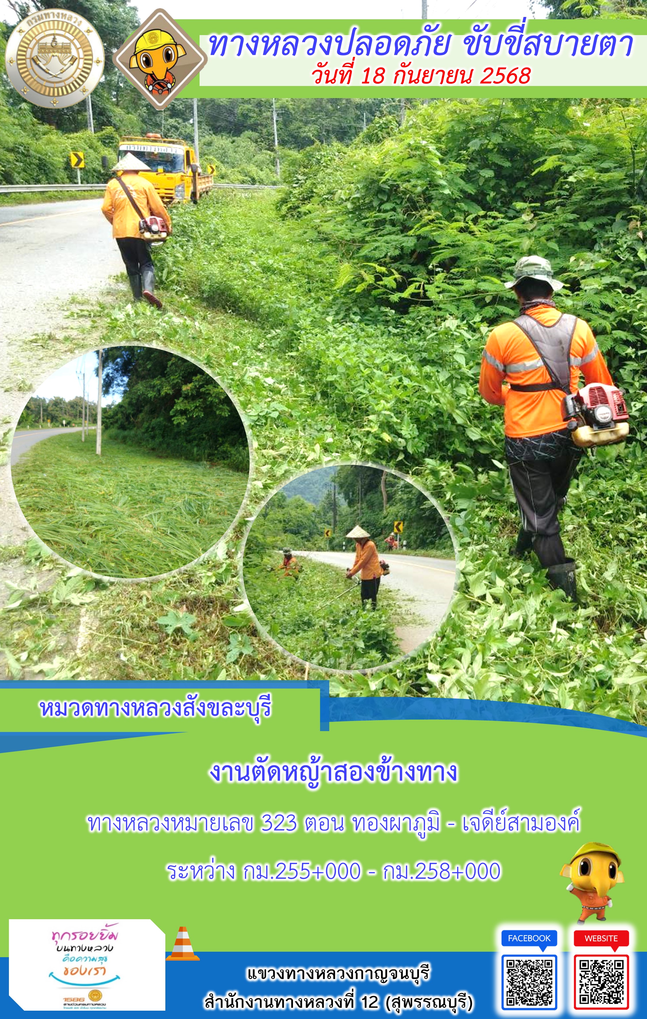 แขวงทางหลวงกาญจนบุรี โดยหมวดทางหลวงในสังกัด และงานอำนวยความปลอดภัยปฏิบัติงาน ประจำวันที่ 18 ก.ย. 68