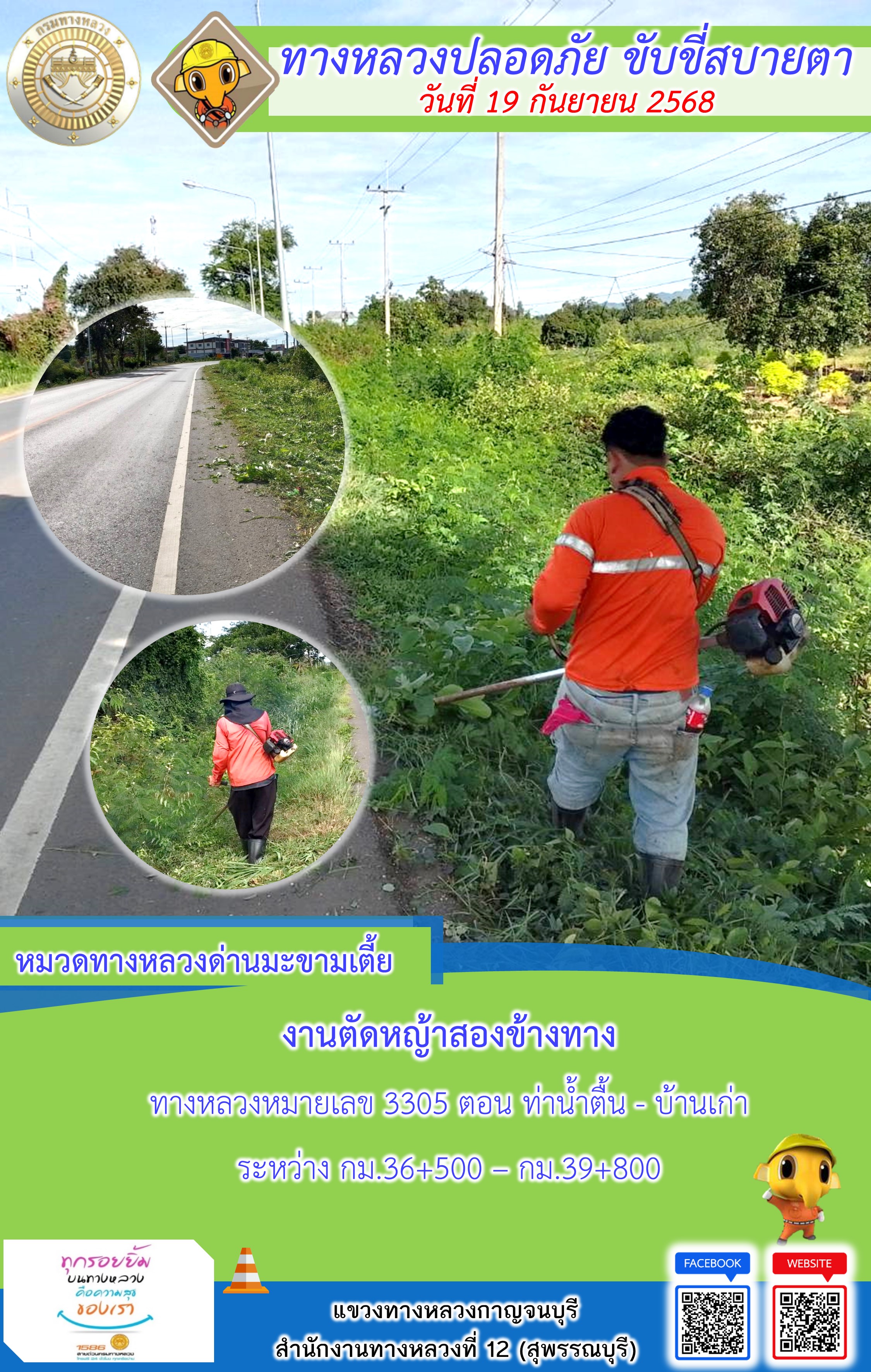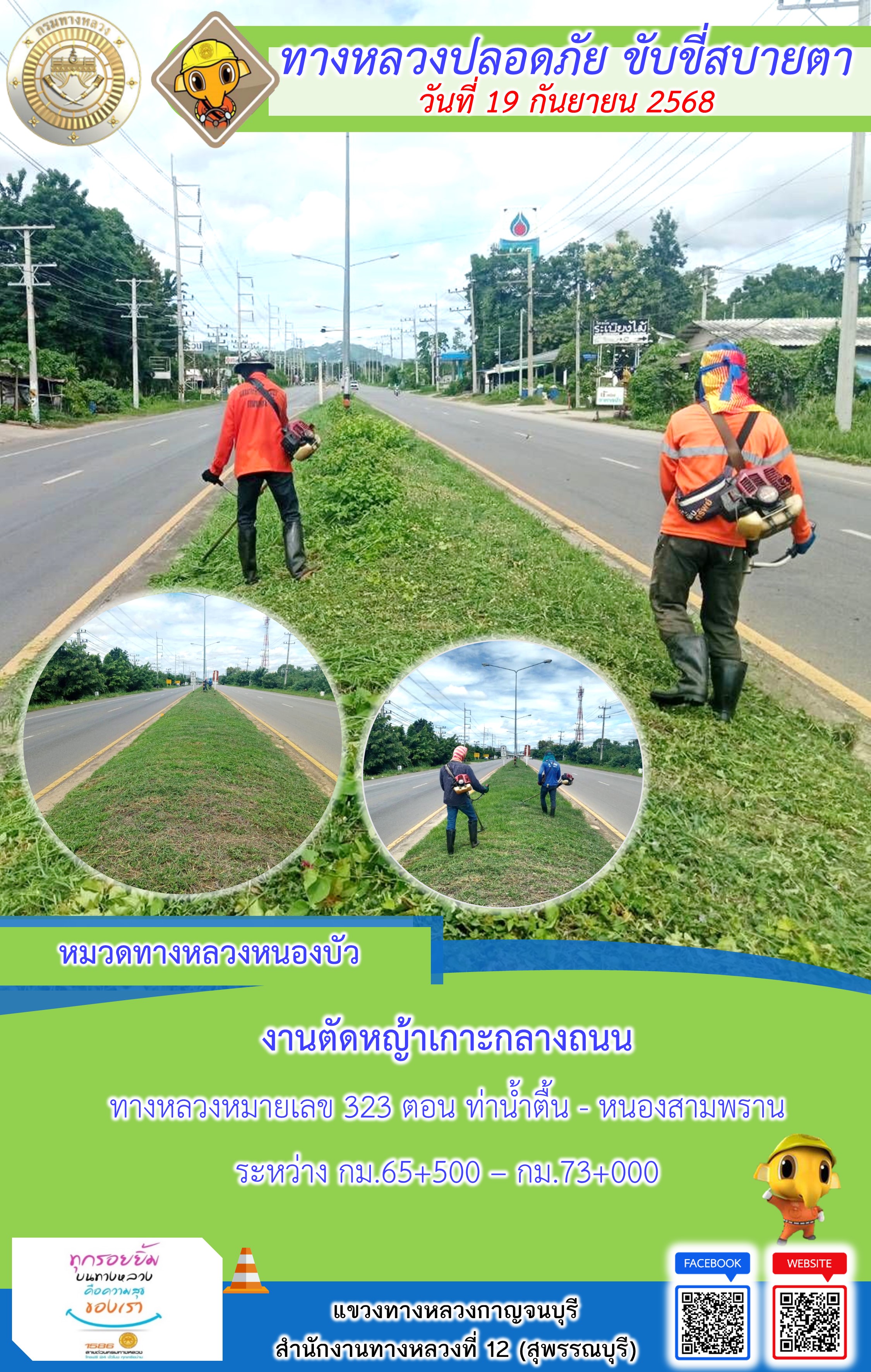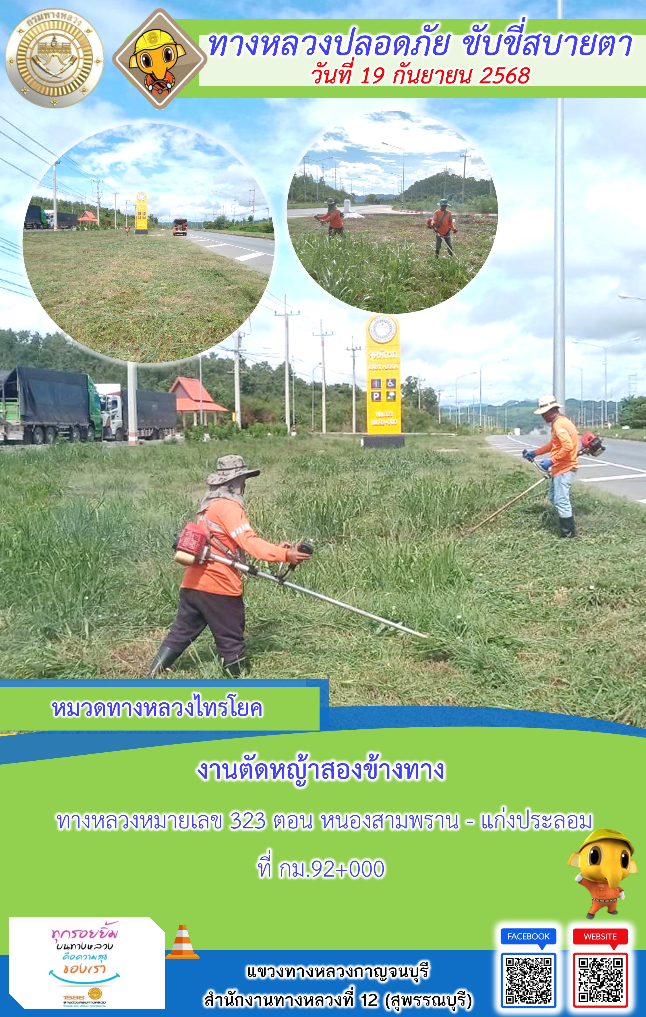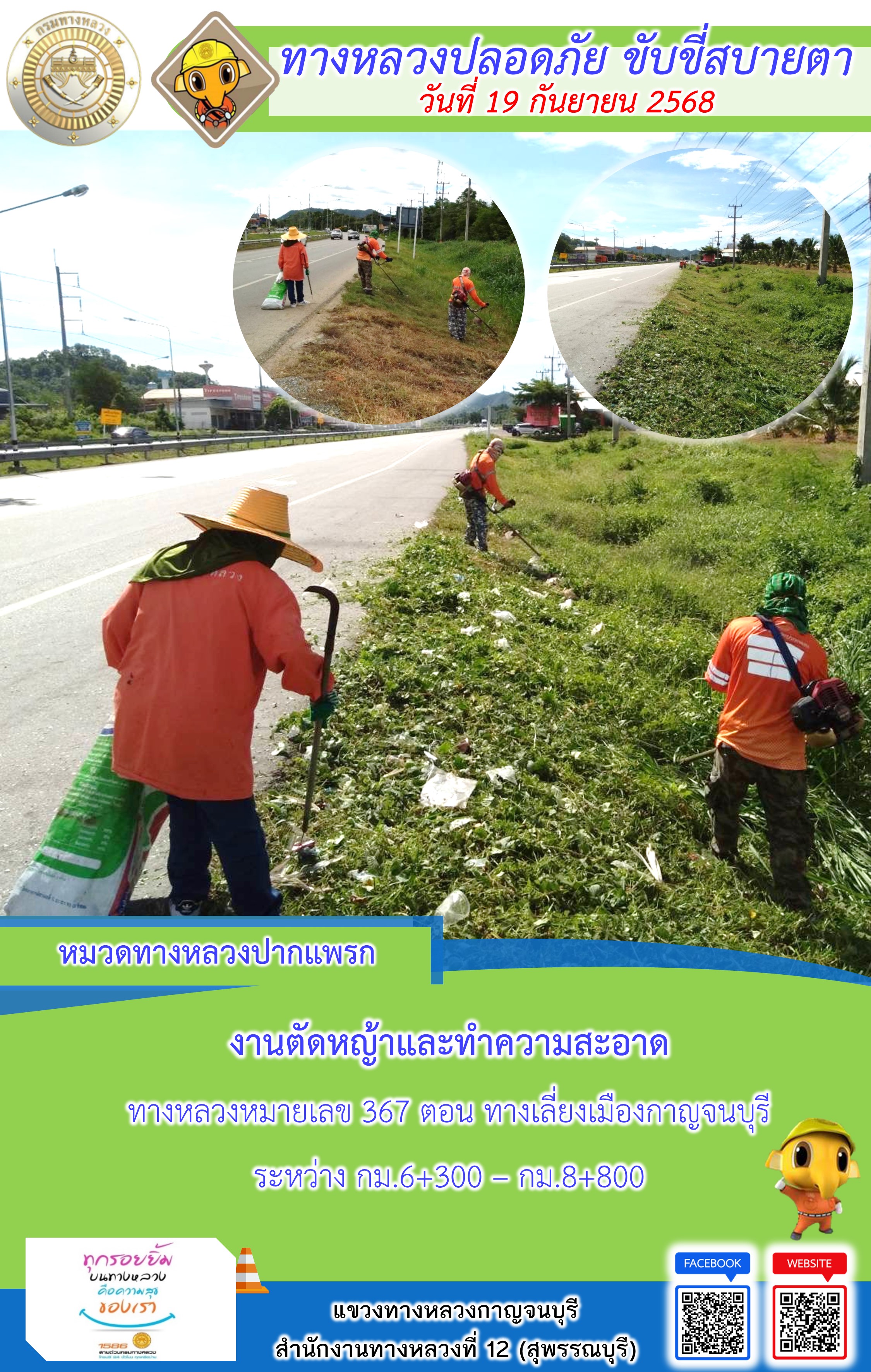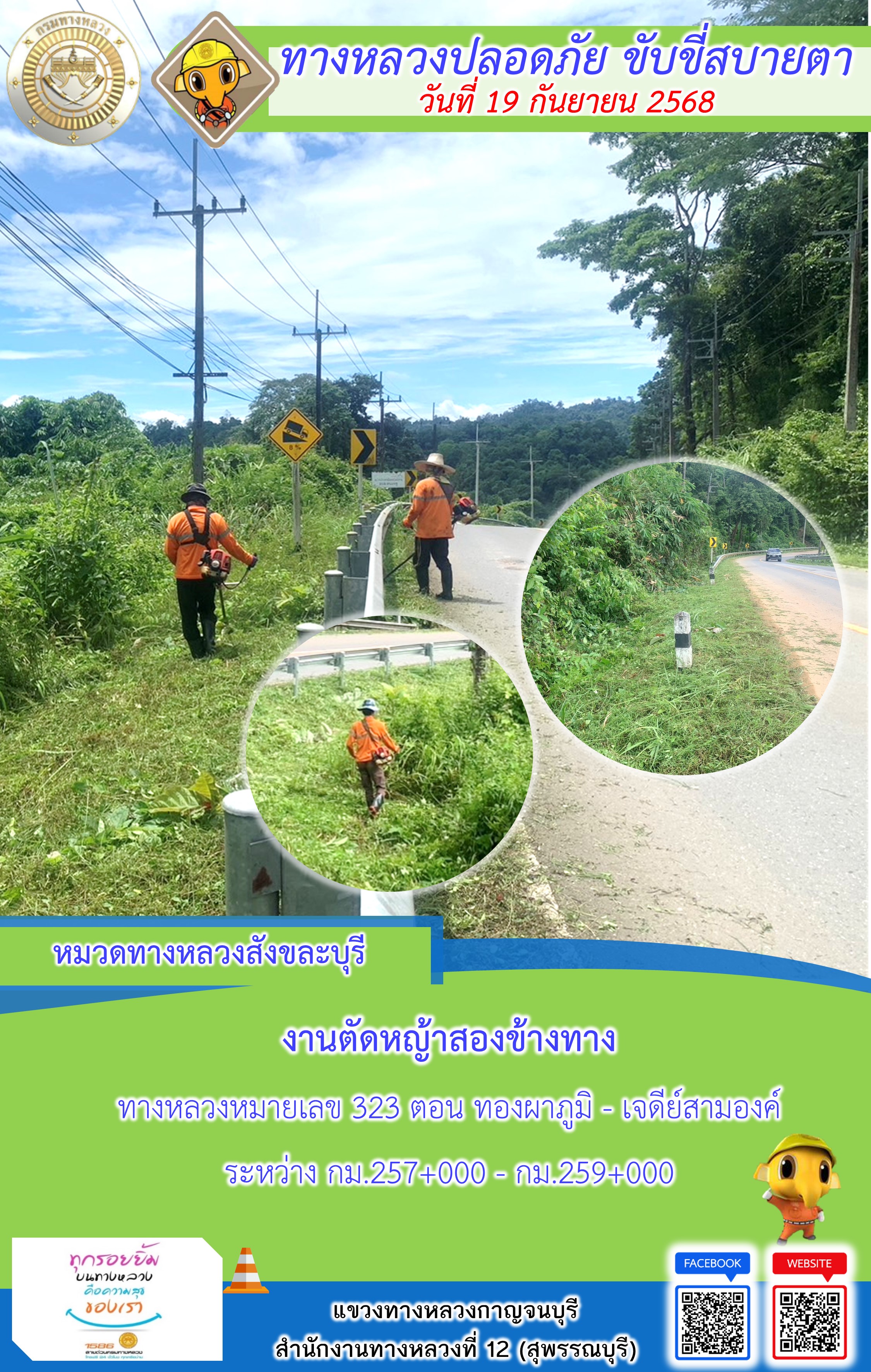 ข้อมูลภาพกิจกรรม : แขวงทางหลวงกาญจนบุรี โดยหมวดทางหลวงในสังกัด และงานอำนวยความปลอดภัยปฏิบัติงาน ประจำวันที่ 19 ก.ย. 68